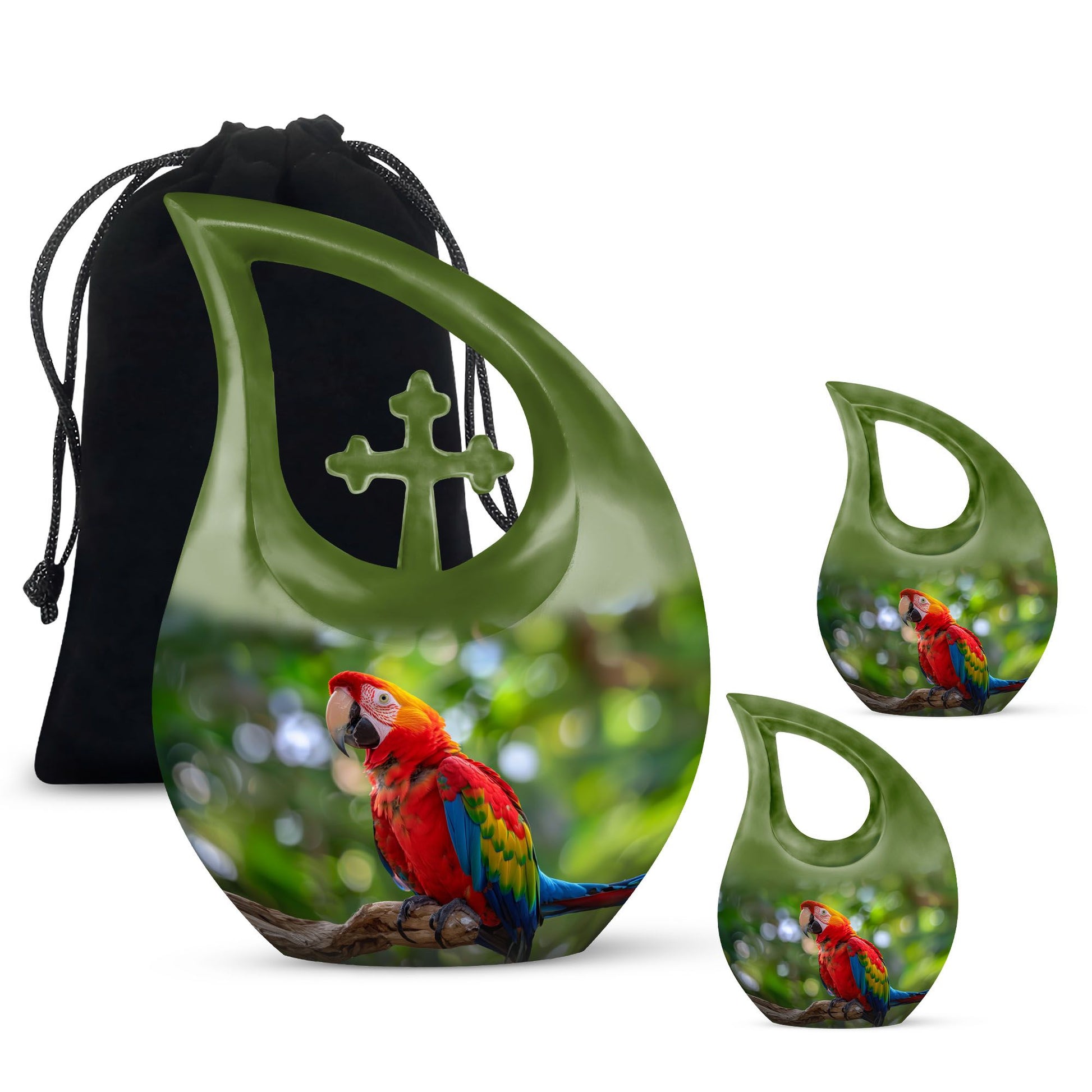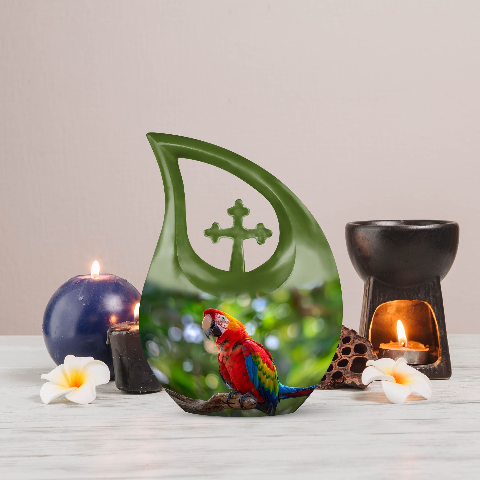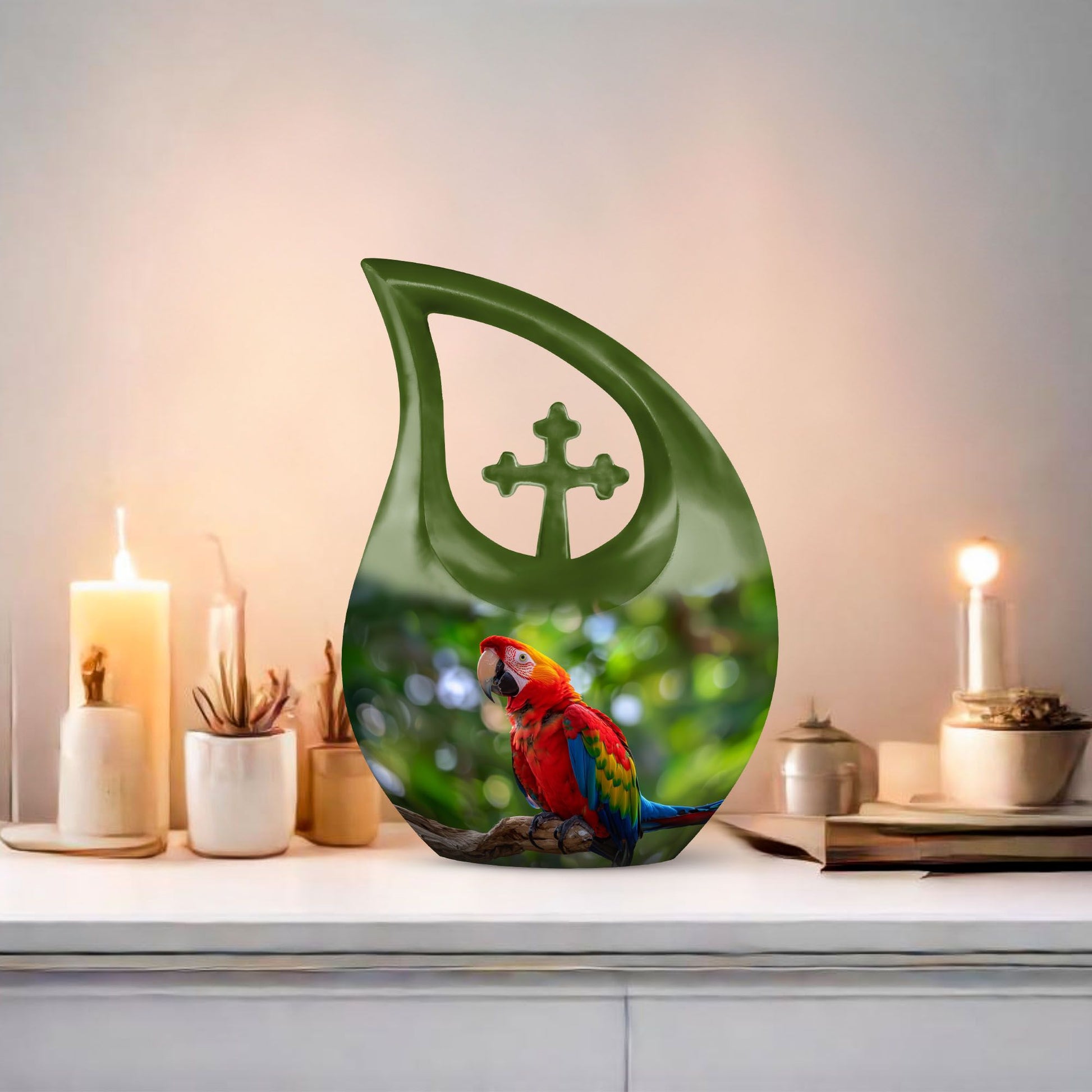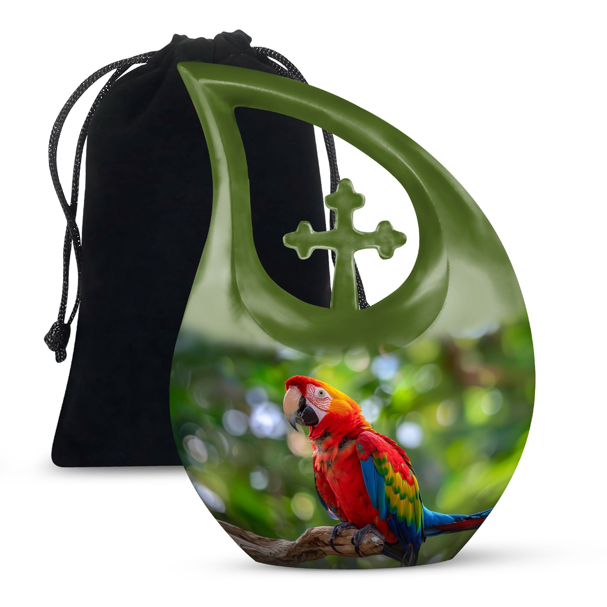 Immerse yourself in a unique remembrance ceremony with our Macaw Parrot Urn - a perfect fusion of faith, fashion, and functionality. Handcrafted with precision from premium aluminium, this enduring piece weighs 3.3 pounds and stands an impressive 10 inches tall. It offers a generous capacity of 200 cubic inches, accommodating the remains of a cherished loved one with dignity. Reflecting the 'Cross Drop' motif, our urn embodies a resonant and timeless symbolism. Included in your order is a plush velvet pouch, ideally purposed for the discrete containment of crematory ashes. For a personal touch, we also offer the option to engrave names onto the urn, turning this resting place into a tangible testament of love and memories. This larger version of our urn is a part of our ceremonial supplies collection, offering a unique way to remember those who enriched our lives. Search terms: Memorial urns, Cool Urns, Keepsake Memory Box, Cremation Boxes For Adults, Metal Urns For Ashes.