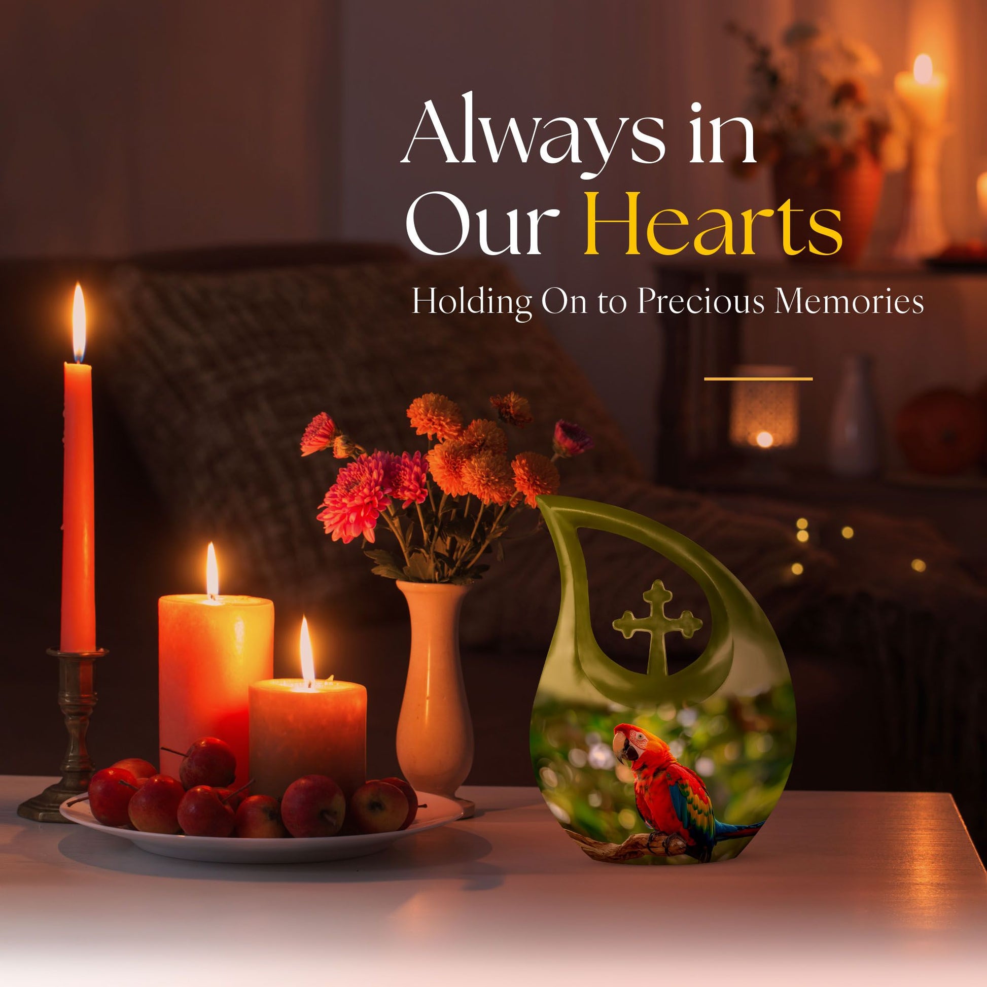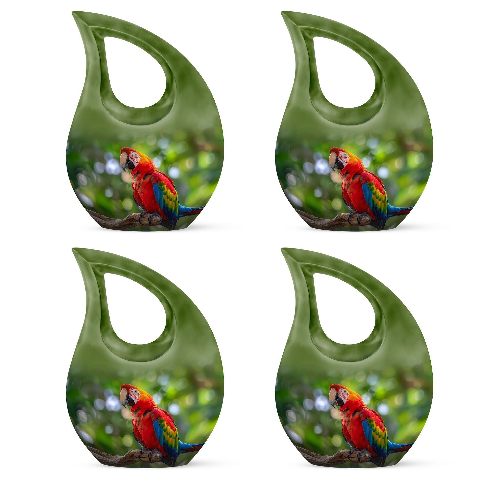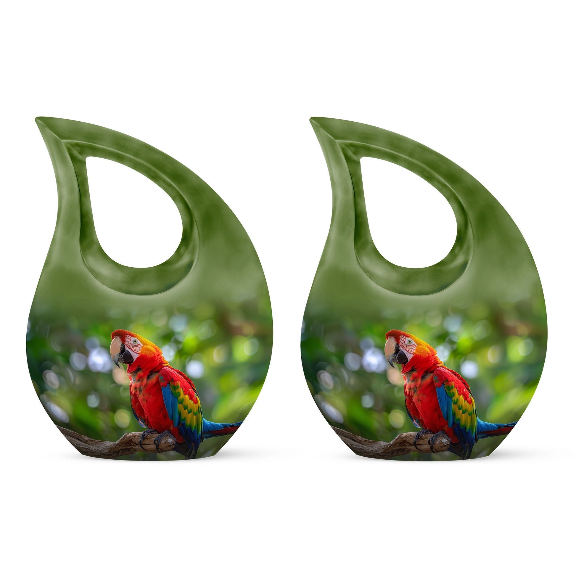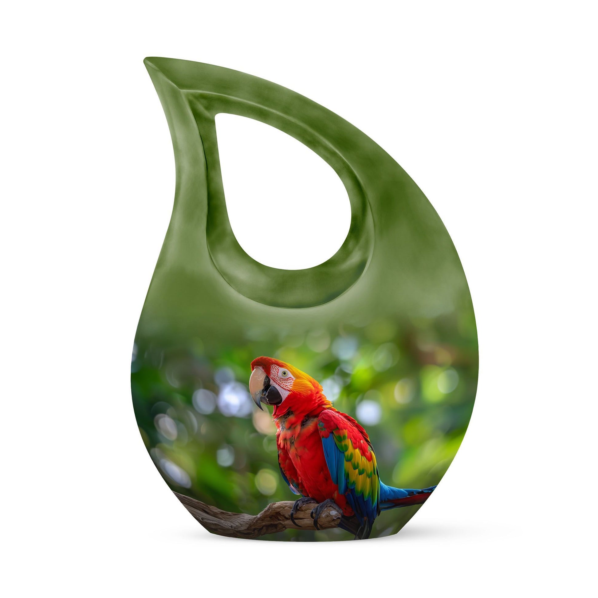 Immerse yourself in a unique remembrance ceremony with our Macaw Parrot Urn - a perfect fusion of faith, fashion, and functionality. Handcrafted with precision from premium aluminium, this enduring piece weighs 3.3 pounds and stands an impressive 10 inches tall. It offers a generous capacity of 200 cubic inches, accommodating the remains of a cherished loved one with dignity. Reflecting the 'Cross Drop' motif, our urn embodies a resonant and timeless symbolism. Included in your order is a plush velvet pouch, ideally purposed for the discrete containment of crematory ashes. For a personal touch, we also offer the option to engrave names onto the urn, turning this resting place into a tangible testament of love and memories. This larger version of our urn is a part of our ceremonial supplies collection, offering a unique way to remember those who enriched our lives. Search terms: Memorial urns, Cool Urns, Keepsake Memory Box, Cremation Boxes For Adults, Metal Urns For Ashes.