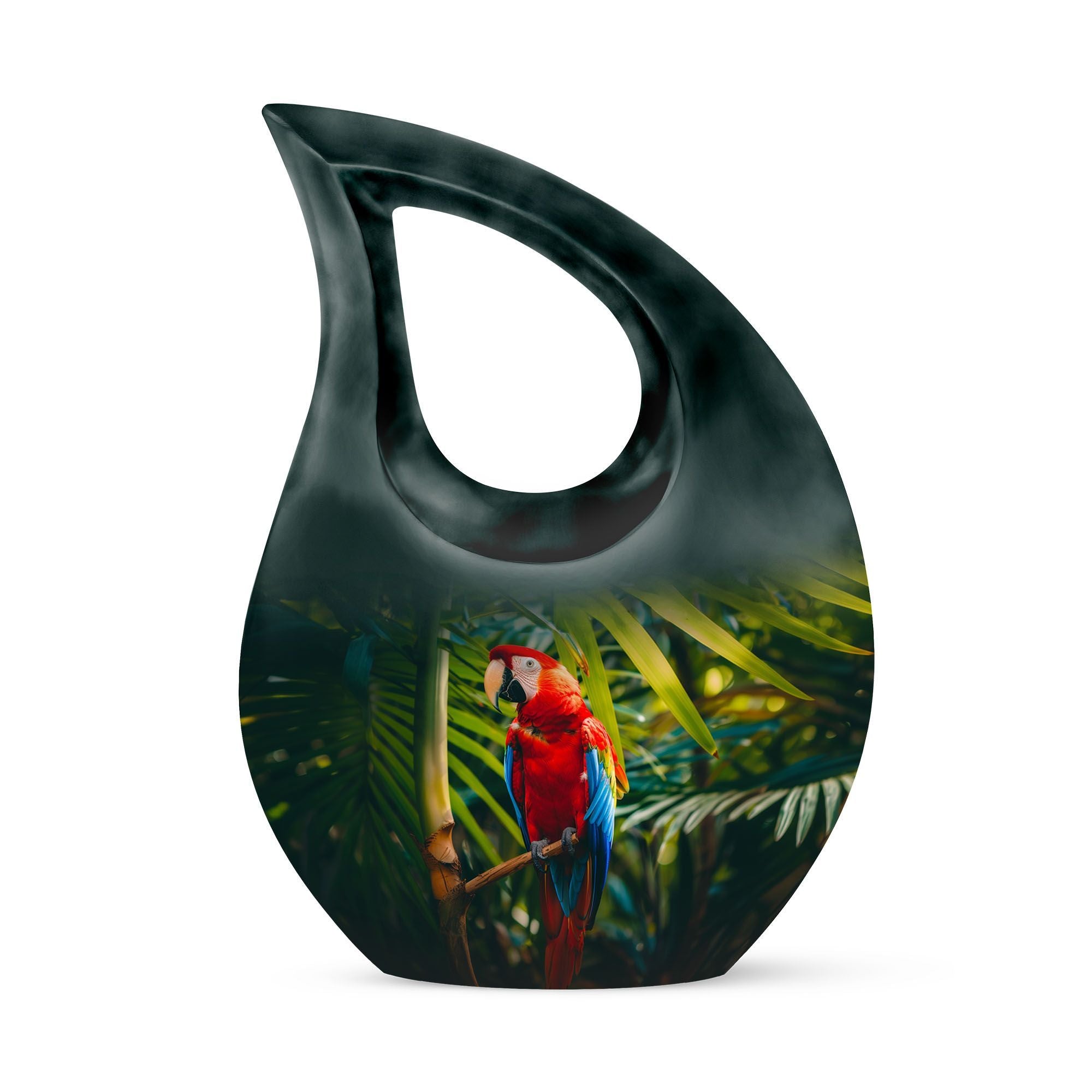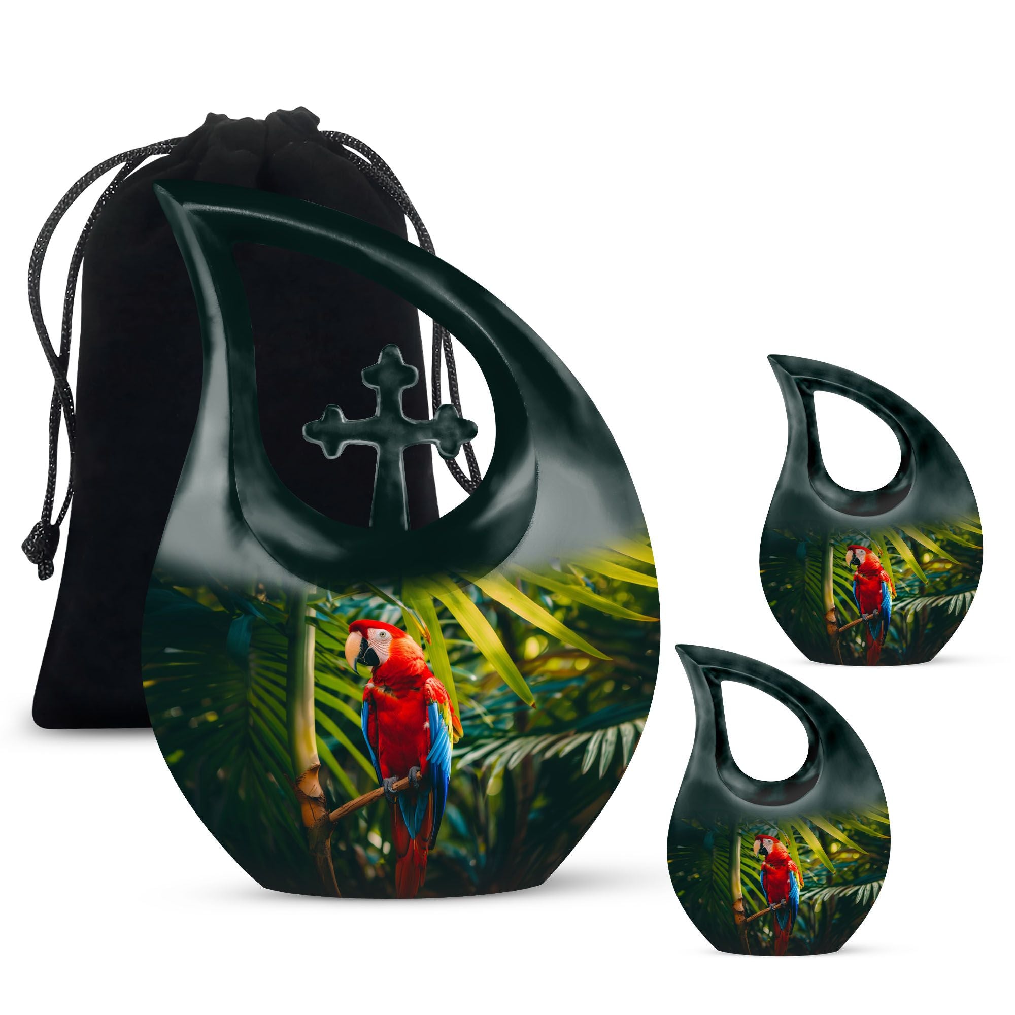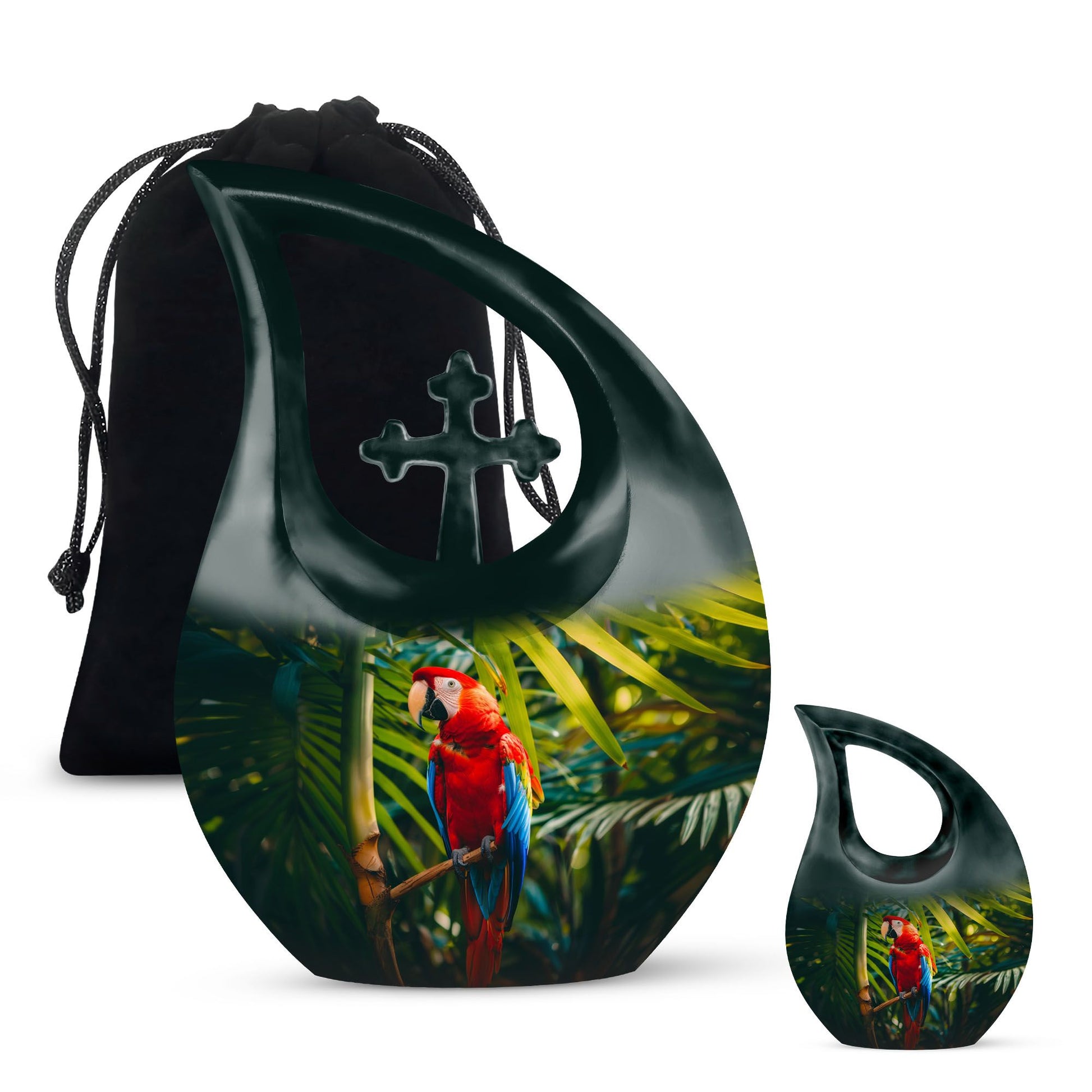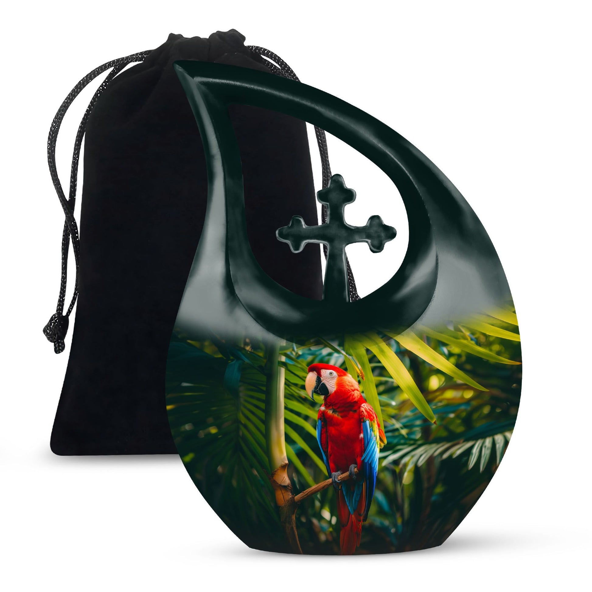 Cherish the memories of your loved one with our Macaw Parrot Urn – a unique nod to spiritual strength and freedom. Crafted from robust aluminium, this 10-inch large urn manages to beautifully blend traditional memorial motifs with an unexpected twist – the intriguing yet respectful 'Cross Drop' theme. This monumental piece comes in a timely size of 10 inches and weighs 3.3 pounds, boasting a substantial capacity of 200 cubic inches, enough to respectfully embody the ashes of your beloved. The urn comes with a velvet pouch for dignified containment of the ashes. Our urn allows for personalization, offering you the chance to engrave your loved one's names for an enduring reminder of their presence. Ideal for seniors and adults seeking 'Custom Urns For Human Ashes', 'Extra Large Cremation Urns', or 'Urn Vaults For Sale'. Its ‘Keepsake for ashes for a man’ attribute also makes it suitable for those seeking 'Urns for Men’s Ashes'.