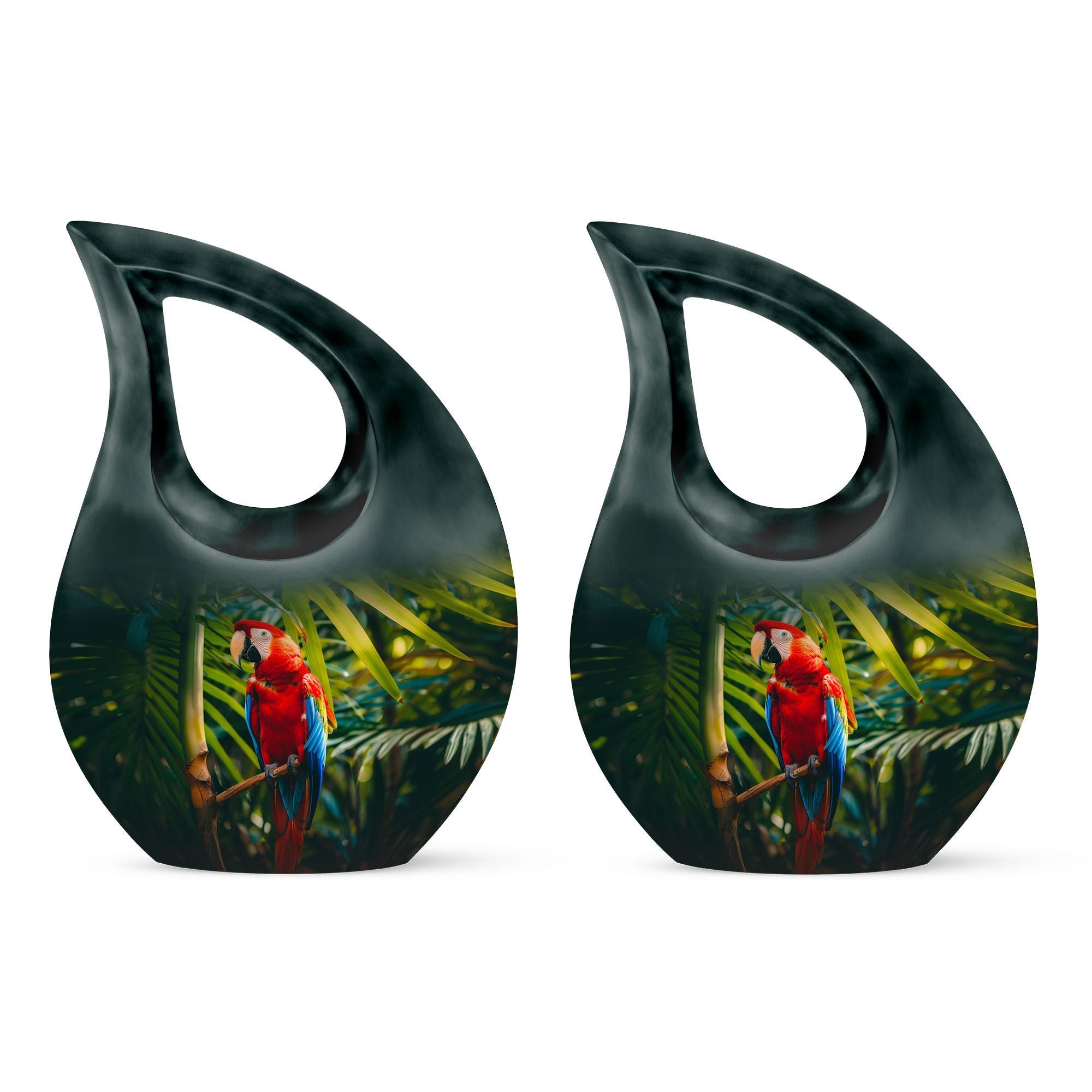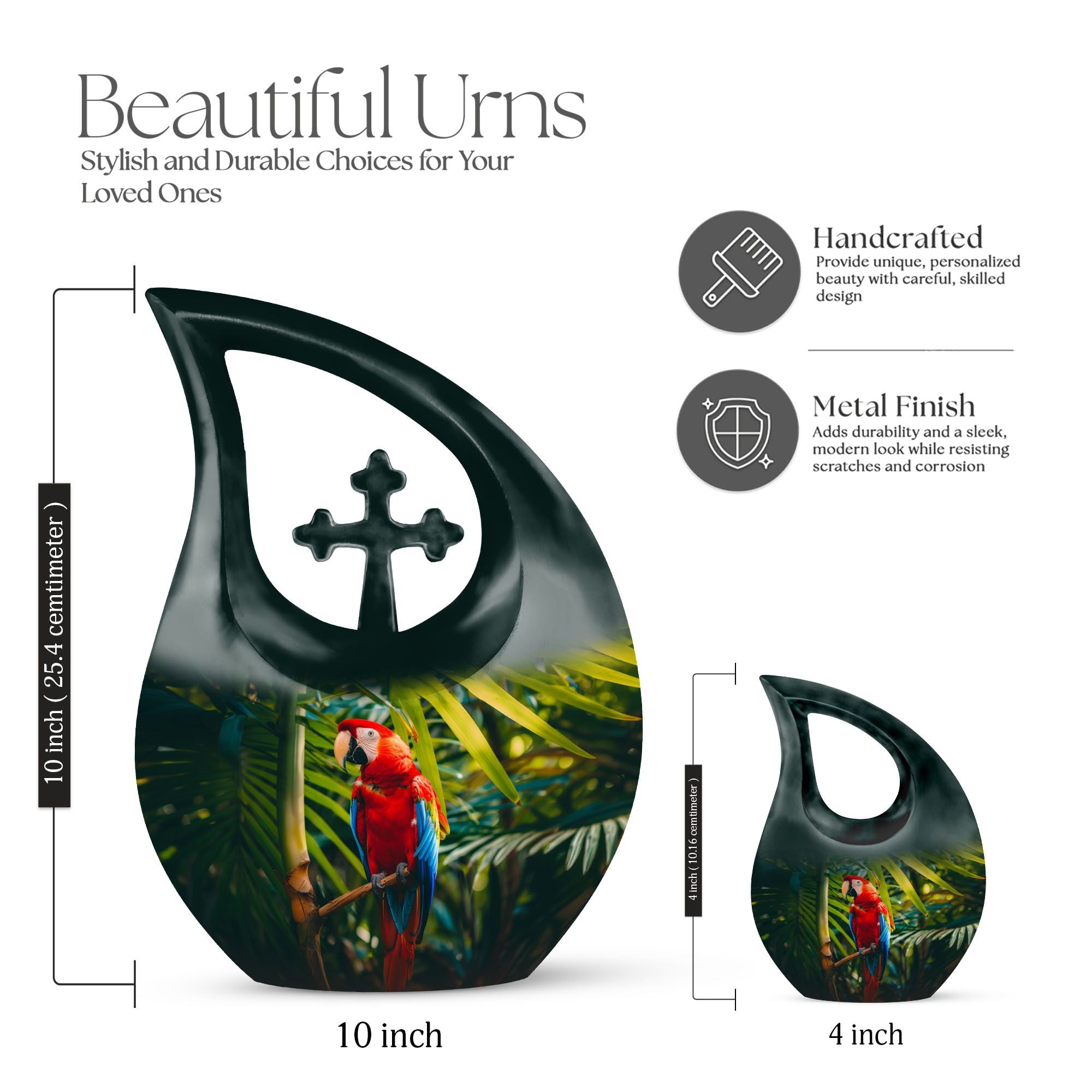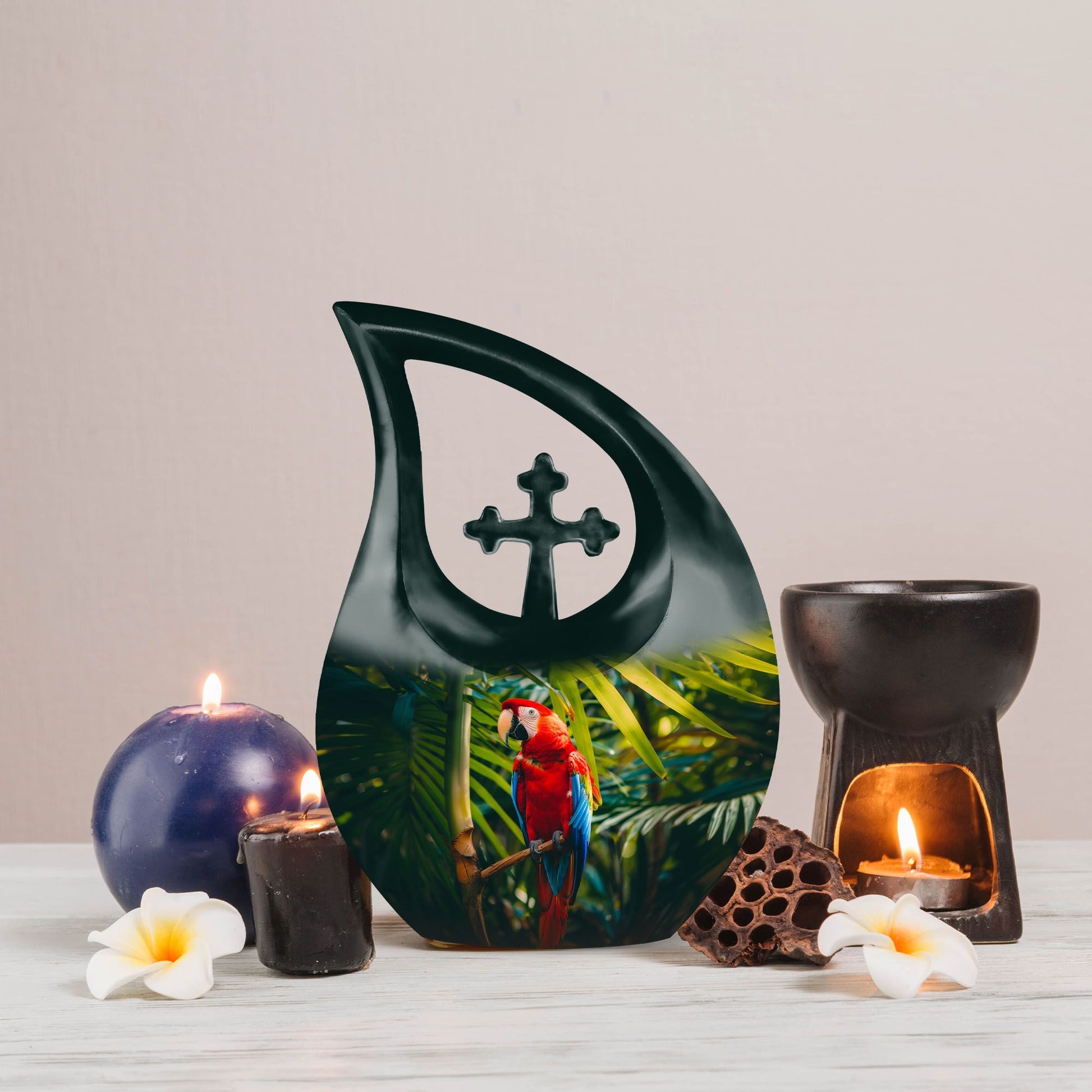 Cherish the memories of your loved one with our Macaw Parrot Urn – a unique nod to spiritual strength and freedom. Crafted from robust aluminium, this 10-inch large urn manages to beautifully blend traditional memorial motifs with an unexpected twist – the intriguing yet respectful 'Cross Drop' theme. This monumental piece comes in a timely size of 10 inches and weighs 3.3 pounds, boasting a substantial capacity of 200 cubic inches, enough to respectfully embody the ashes of your beloved. The urn comes with a velvet pouch for dignified containment of the ashes. Our urn allows for personalization, offering you the chance to engrave your loved one's names for an enduring reminder of their presence. Ideal for seniors and adults seeking 'Custom Urns For Human Ashes', 'Extra Large Cremation Urns', or 'Urn Vaults For Sale'. Its ‘Keepsake for ashes for a man’ attribute also makes it suitable for those seeking 'Urns for Men’s Ashes'.