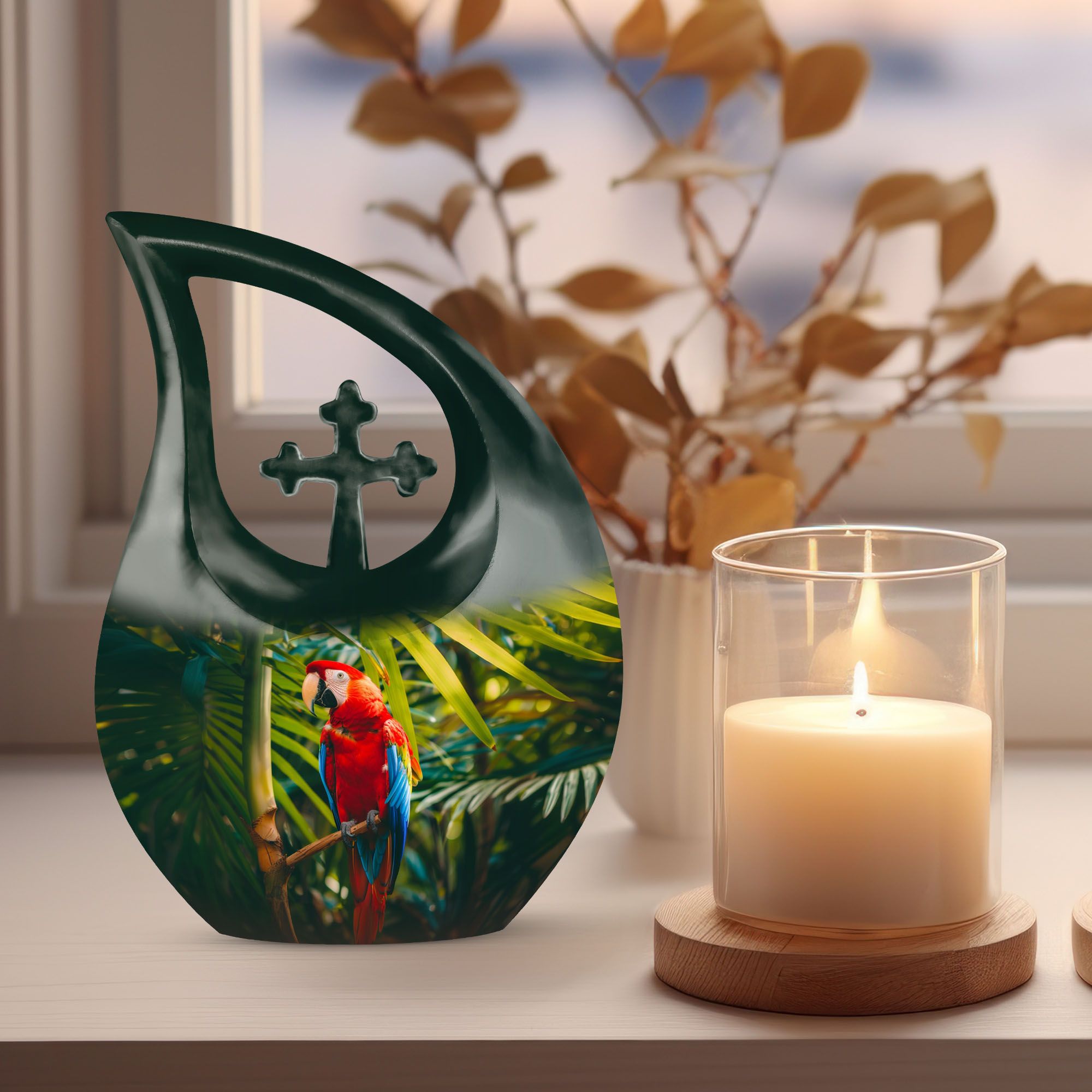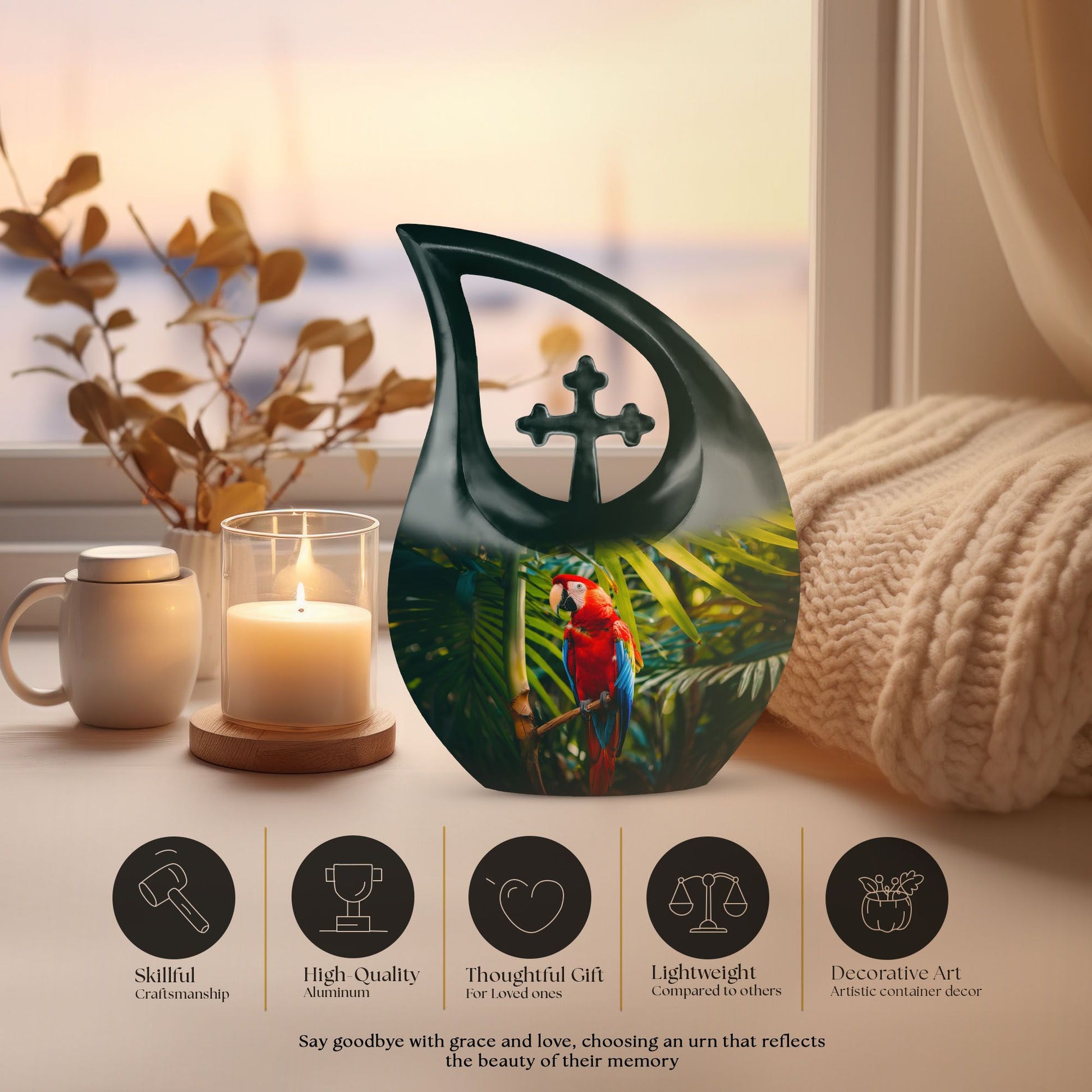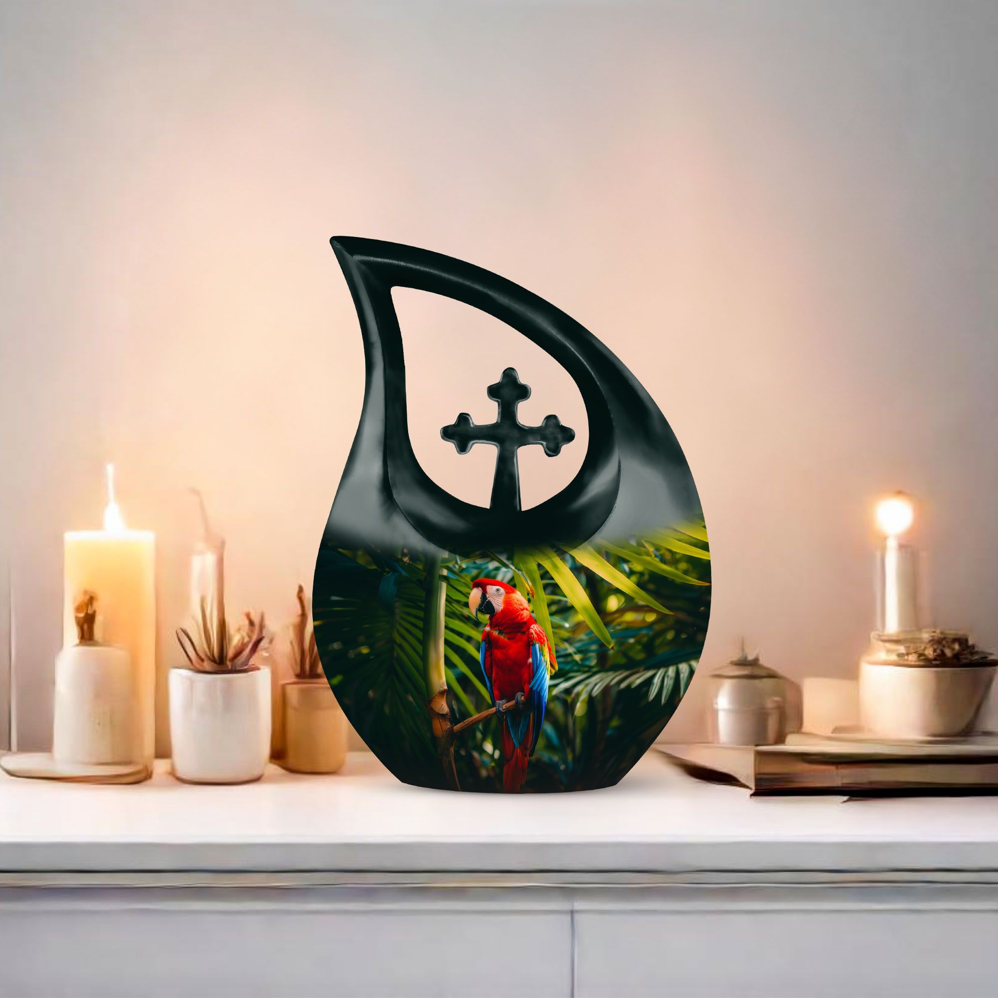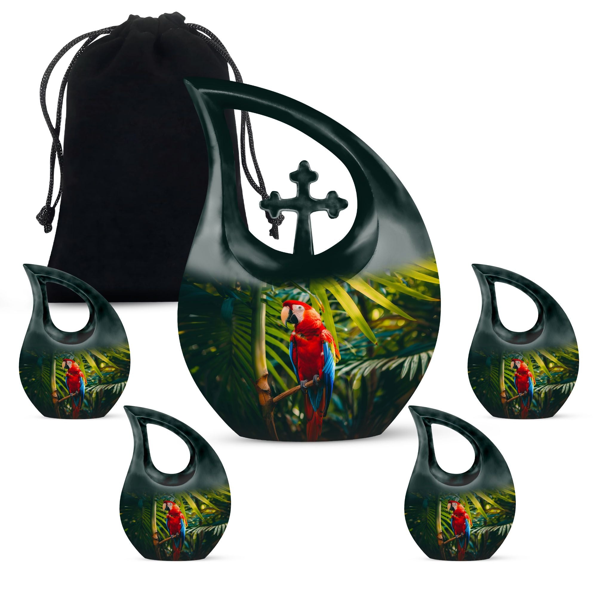 Cherish the memories of your loved one with our Macaw Parrot Urn – a unique nod to spiritual strength and freedom. Crafted from robust aluminium, this 10-inch large urn manages to beautifully blend traditional memorial motifs with an unexpected twist – the intriguing yet respectful 'Cross Drop' theme. This monumental piece comes in a timely size of 10 inches and weighs 3.3 pounds, boasting a substantial capacity of 200 cubic inches, enough to respectfully embody the ashes of your beloved. The urn comes with a velvet pouch for dignified containment of the ashes. Our urn allows for personalization, offering you the chance to engrave your loved one's names for an enduring reminder of their presence. Ideal for seniors and adults seeking 'Custom Urns For Human Ashes', 'Extra Large Cremation Urns', or 'Urn Vaults For Sale'. Its ‘Keepsake for ashes for a man’ attribute also makes it suitable for those seeking 'Urns for Men’s Ashes'.