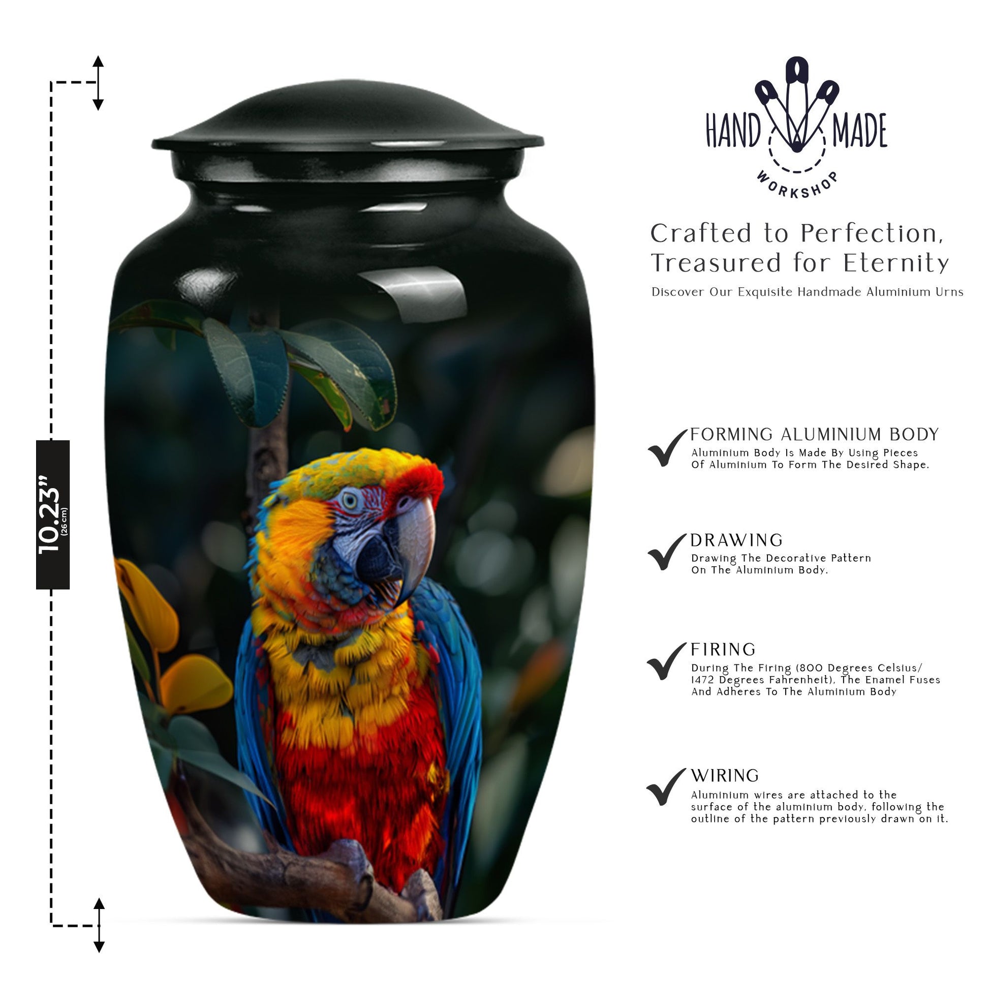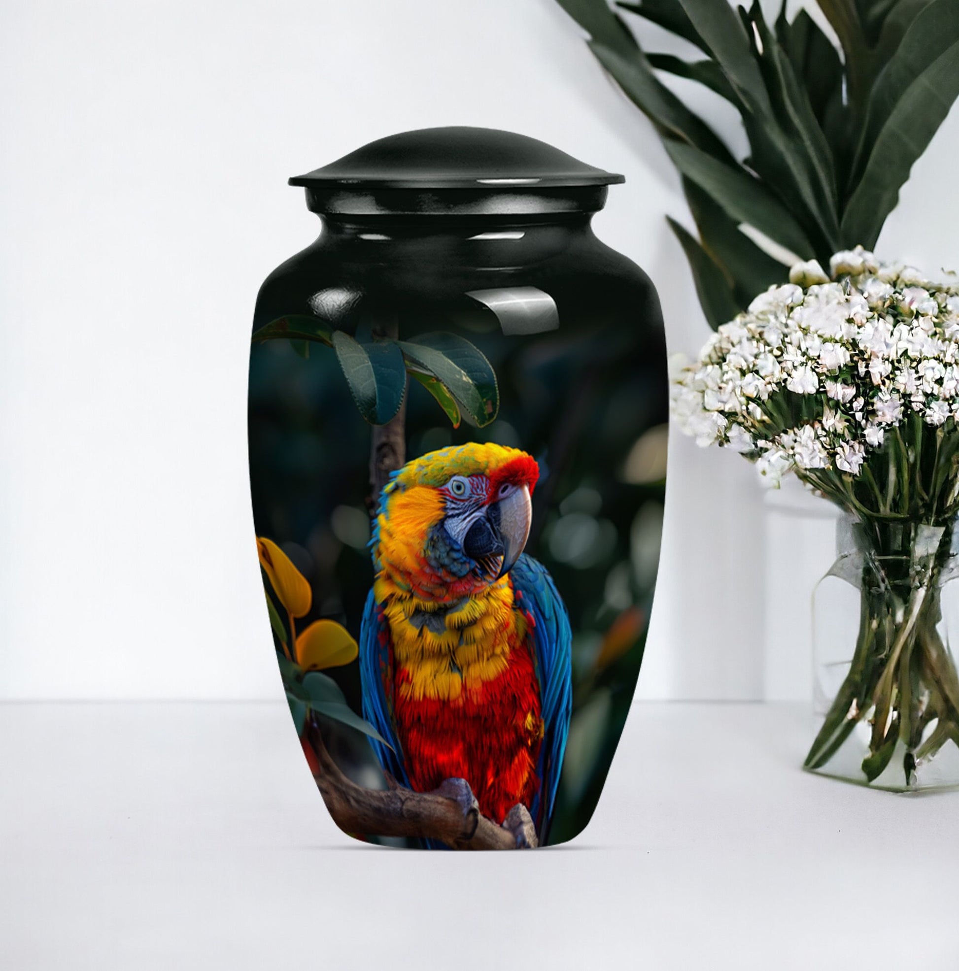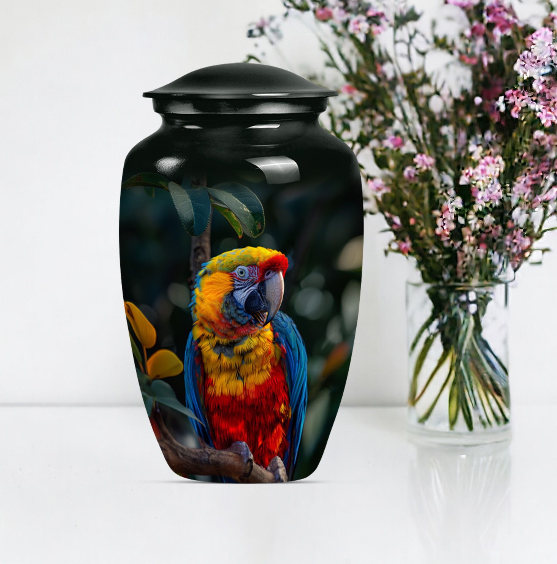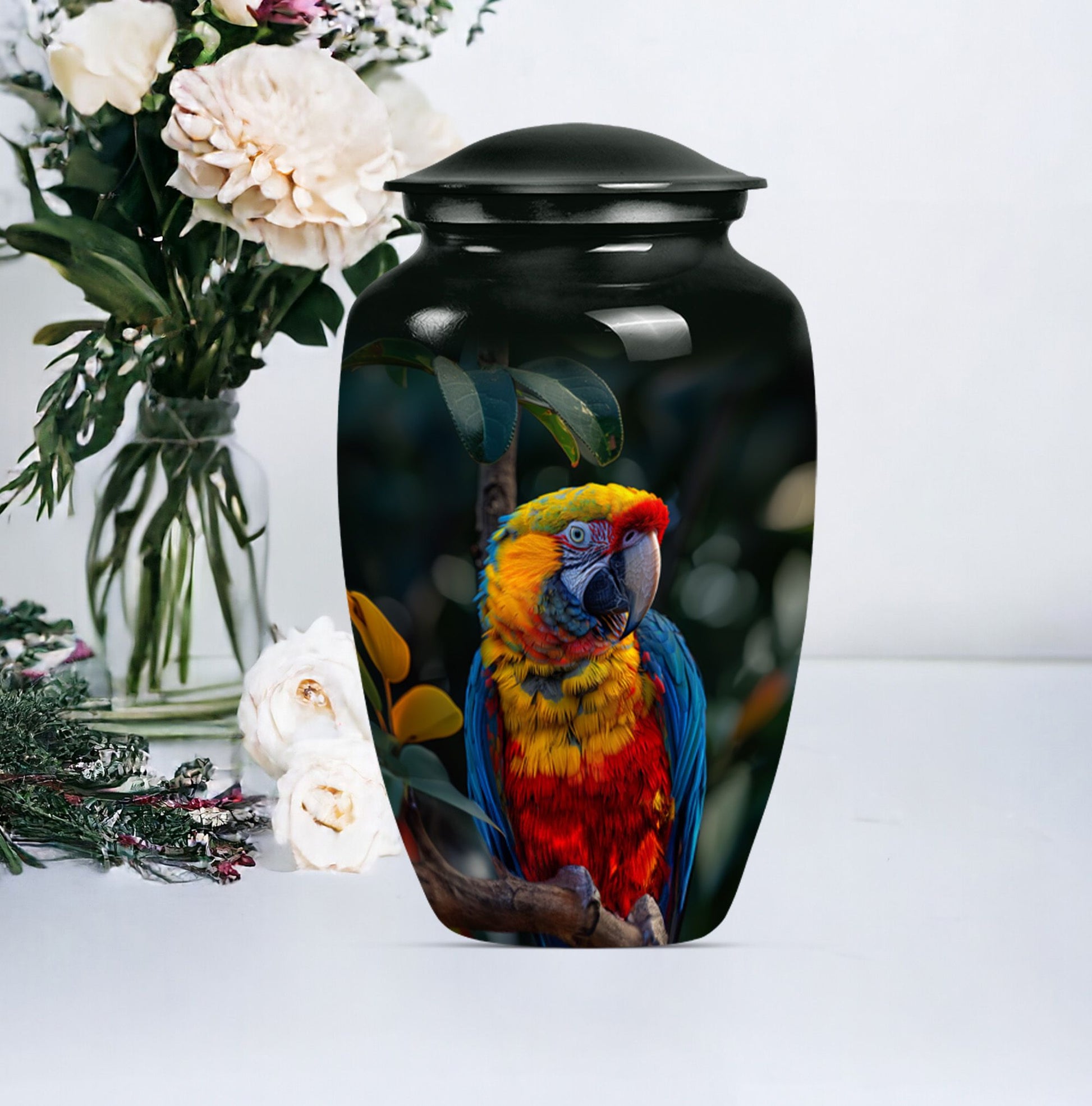 Our Macaw Parrot Urn stands as a tastefully crafted tribute, honoring your loved one's unforgettable legacy. This beautifully built large urn measures 10 inches in height and has a considerable volume of 200 cubic inches. Capable of accommodating ashes of an adult female, its substantial capacity makes it one of our most reliable memorial urns in the category. Expertly crafted using aluminium, this urn is not only aesthetically pleasing but durable, boasting a weight of 3.3 pounds. The unique Wolf Howling theme offers a sense of serenity and solemnity, chosen carefully to reflect the spirit of your dear departed one. To further personalize this irreplaceable memorial touchstone, we offer engraved names customization options. We also understand the delicate nature of this possession, and so this cremation urn is accompanied by a velvet pouch for secure containment of ashes. A symbol of eternal love and respect, this urn is a distinctive blend of sentimentality and style for your commemoration rituals. Uncommonly searched keywords, such as cremation medium urns for human ashes, human ash adult, shape boxes for gifts, and funeral cremation urns, are used to describe this product.