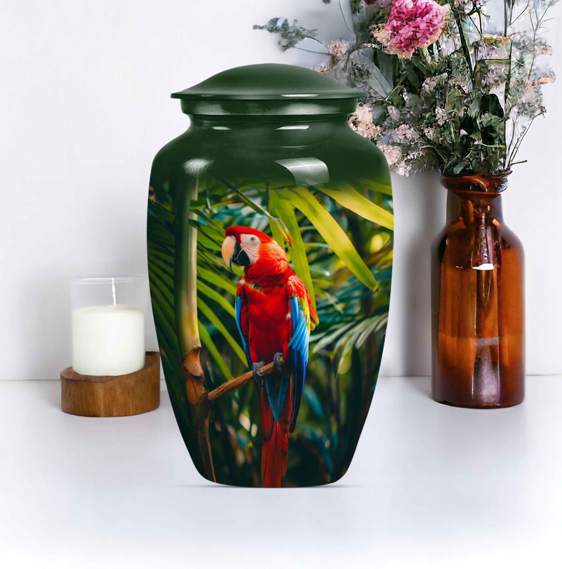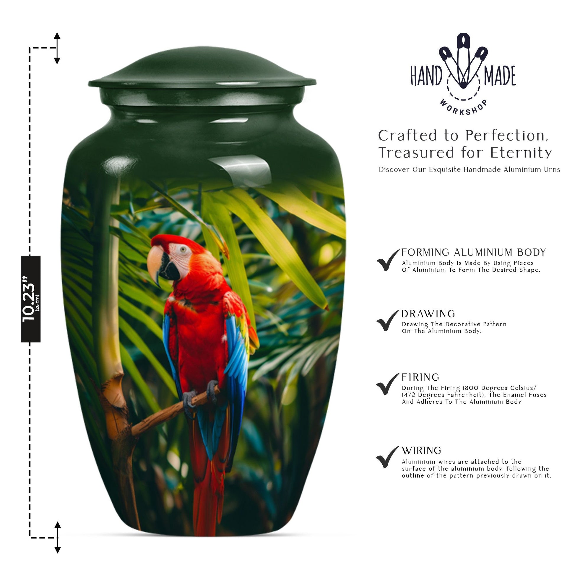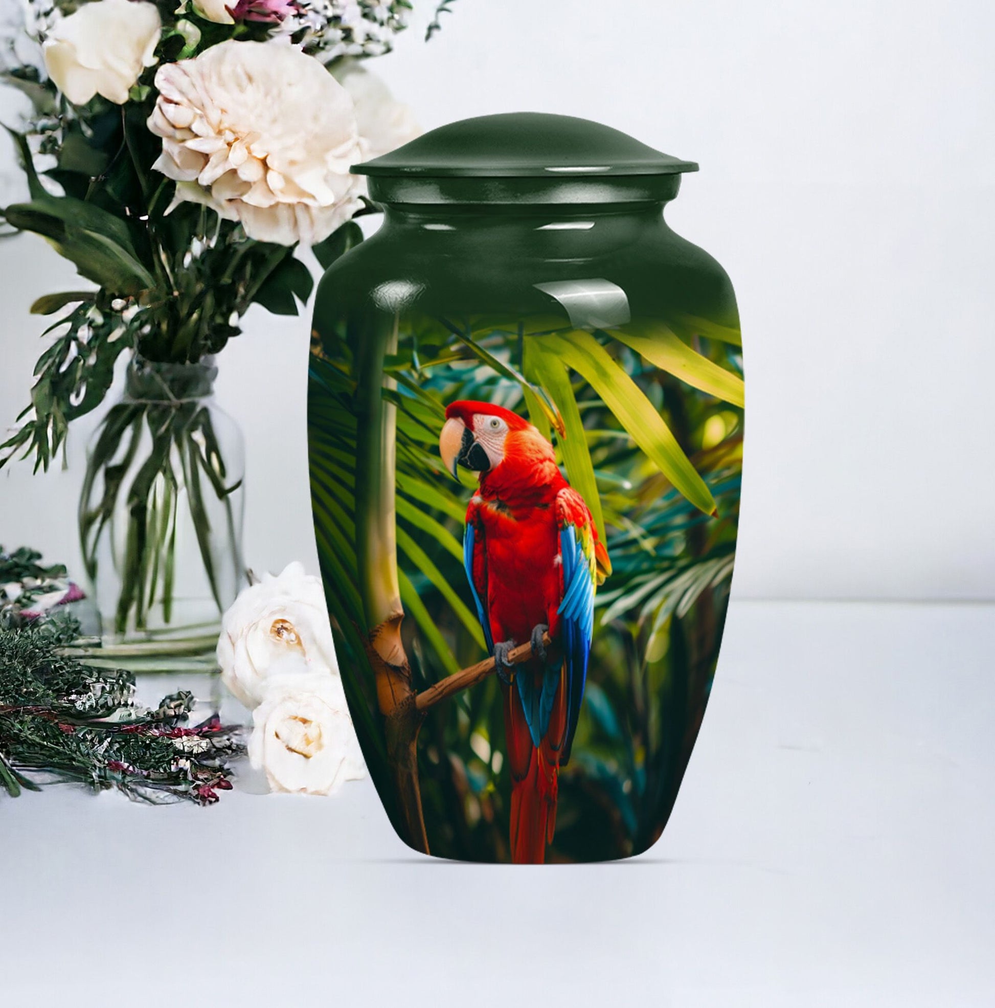 Render your loved one the ultimate homage with our unique 'Macaw Parrot Urn', an exquisitely crafted burial urn for cremation ashes. Made with superior aluminium material, this elegantly designed cremation urn is apt for preserving the precious ashes within its 200 cubic inches capacity. It weighs a modest 3.3 pounds and stands tall at 10 inches, reflecting a sense of dignity and solemnity. Our urn is themed with a 'Wolf Howling' aspect, invoking an air of spirituality and tranquility. Further, it furnishes a 'velvet pouch' for considerate containment of the ashes. As an additional feature, we offer customization options. You have the unique privilege to personalize this burial urn with engraved names, lending it a profound intimacy and significance. This Large Urn is especially apt for adult human ashes. Note that this Macaw Parrot Urn is a must-have among cremation urns for burial. Invest in this remembrance piece and let the legacy of your loved one glow in the sanctity it deserves.