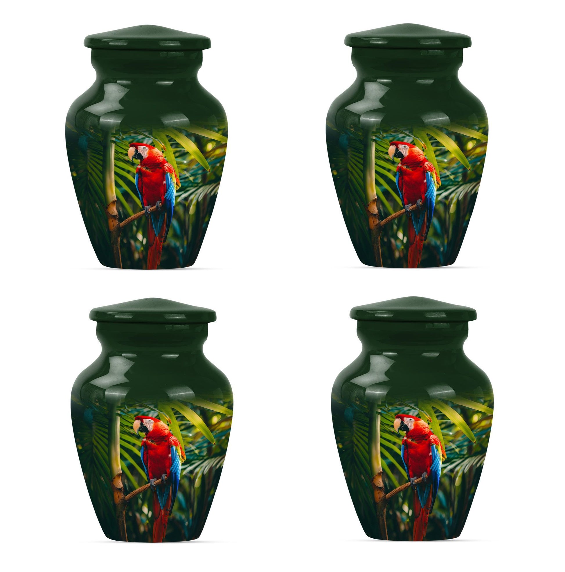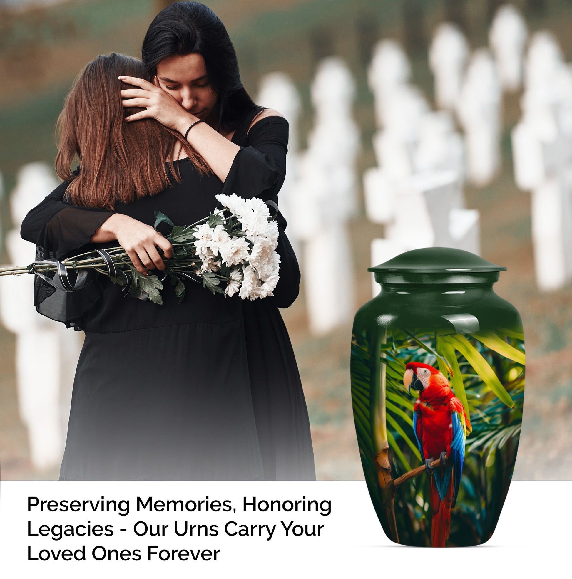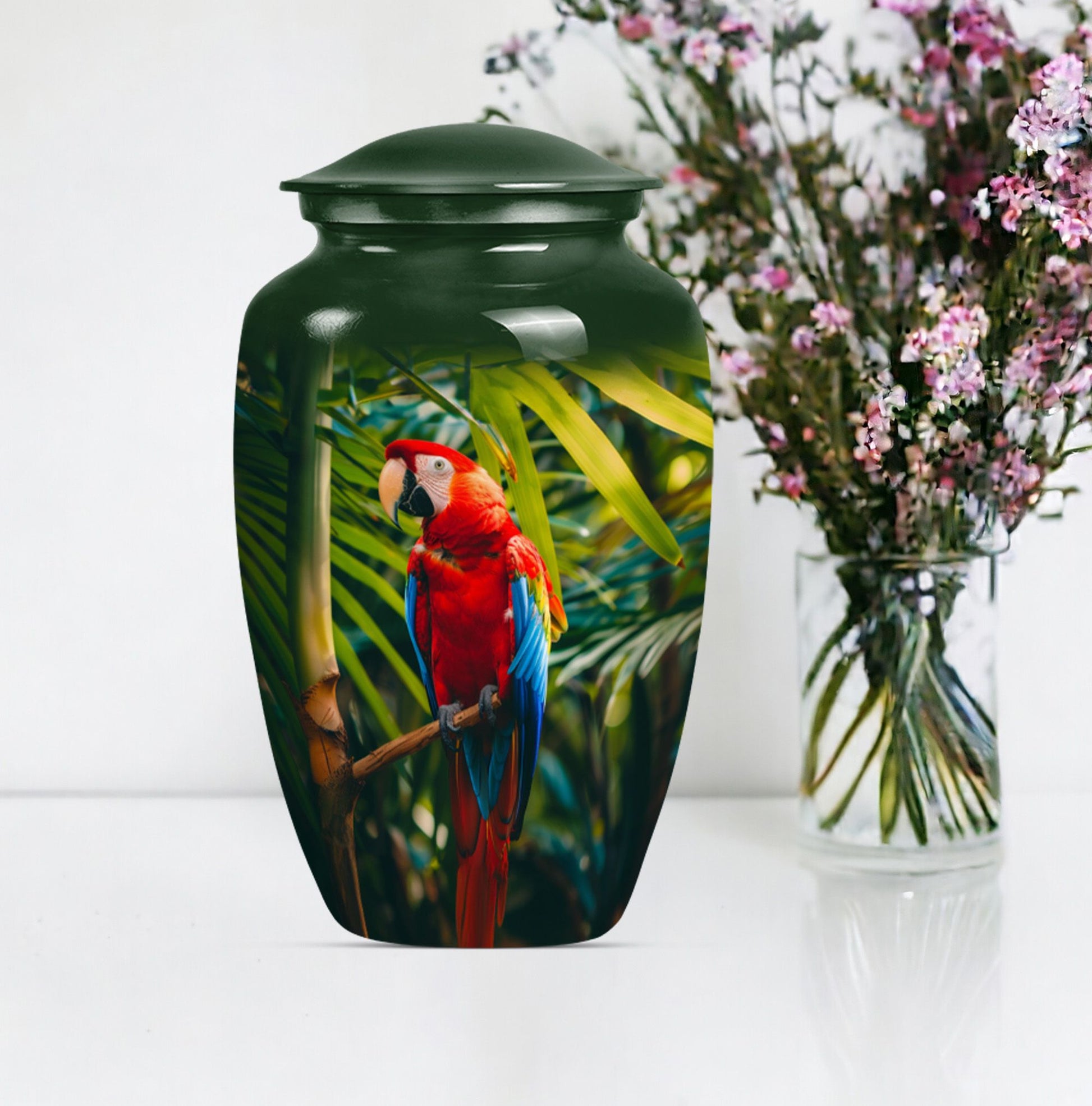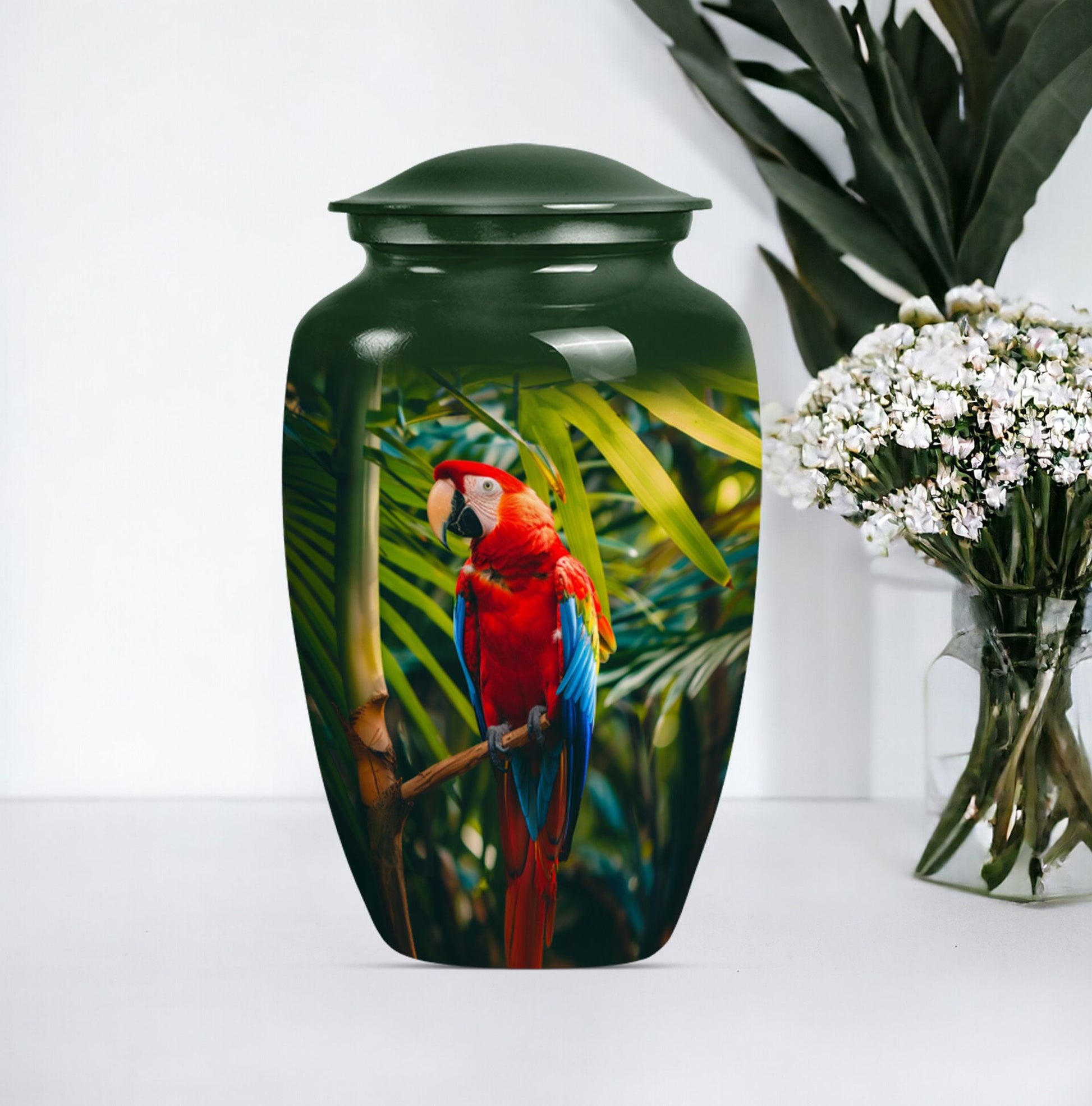 Render your loved one the ultimate homage with our unique 'Macaw Parrot Urn', an exquisitely crafted burial urn for cremation ashes. Made with superior aluminium material, this elegantly designed cremation urn is apt for preserving the precious ashes within its 200 cubic inches capacity. It weighs a modest 3.3 pounds and stands tall at 10 inches, reflecting a sense of dignity and solemnity. Our urn is themed with a 'Wolf Howling' aspect, invoking an air of spirituality and tranquility. Further, it furnishes a 'velvet pouch' for considerate containment of the ashes. As an additional feature, we offer customization options. You have the unique privilege to personalize this burial urn with engraved names, lending it a profound intimacy and significance. This Large Urn is especially apt for adult human ashes. Note that this Macaw Parrot Urn is a must-have among cremation urns for burial. Invest in this remembrance piece and let the legacy of your loved one glow in the sanctity it deserves.