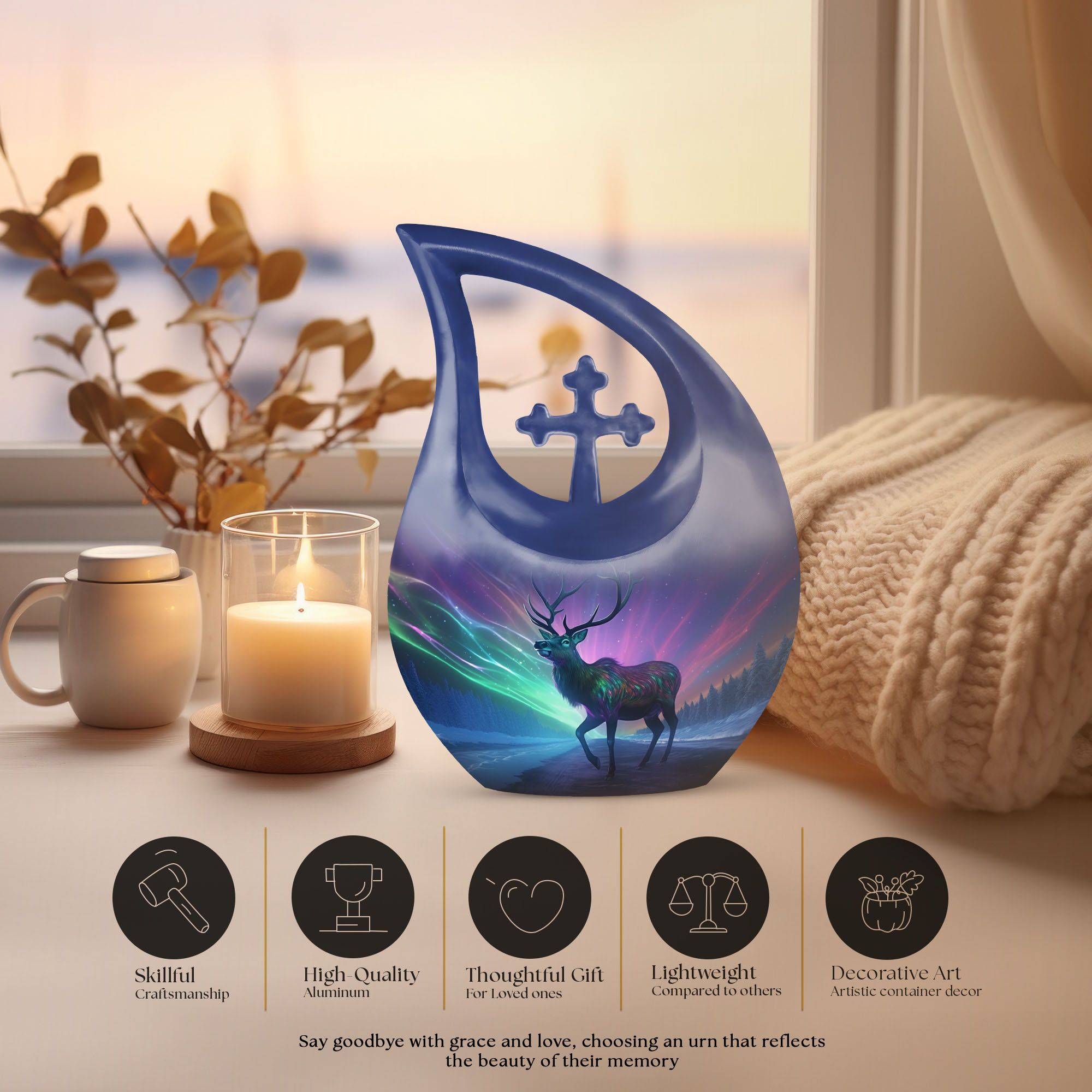 The Majestic Deer Urn combines elegant design with expert craftsmanship. Made from high-quality aluminium, it features a secure screw-top lid and a majestic deer motif that symbolizes grace and remembrance. This large urn is ideal as a cremation urn for men, cremation urn for women, or a burial urn, blending style and practicality for memorial use. Its timeless design ensures it serves as a respectful tribute in any home or memorial space.