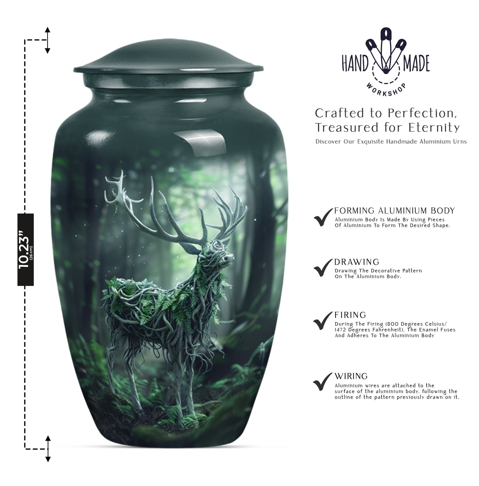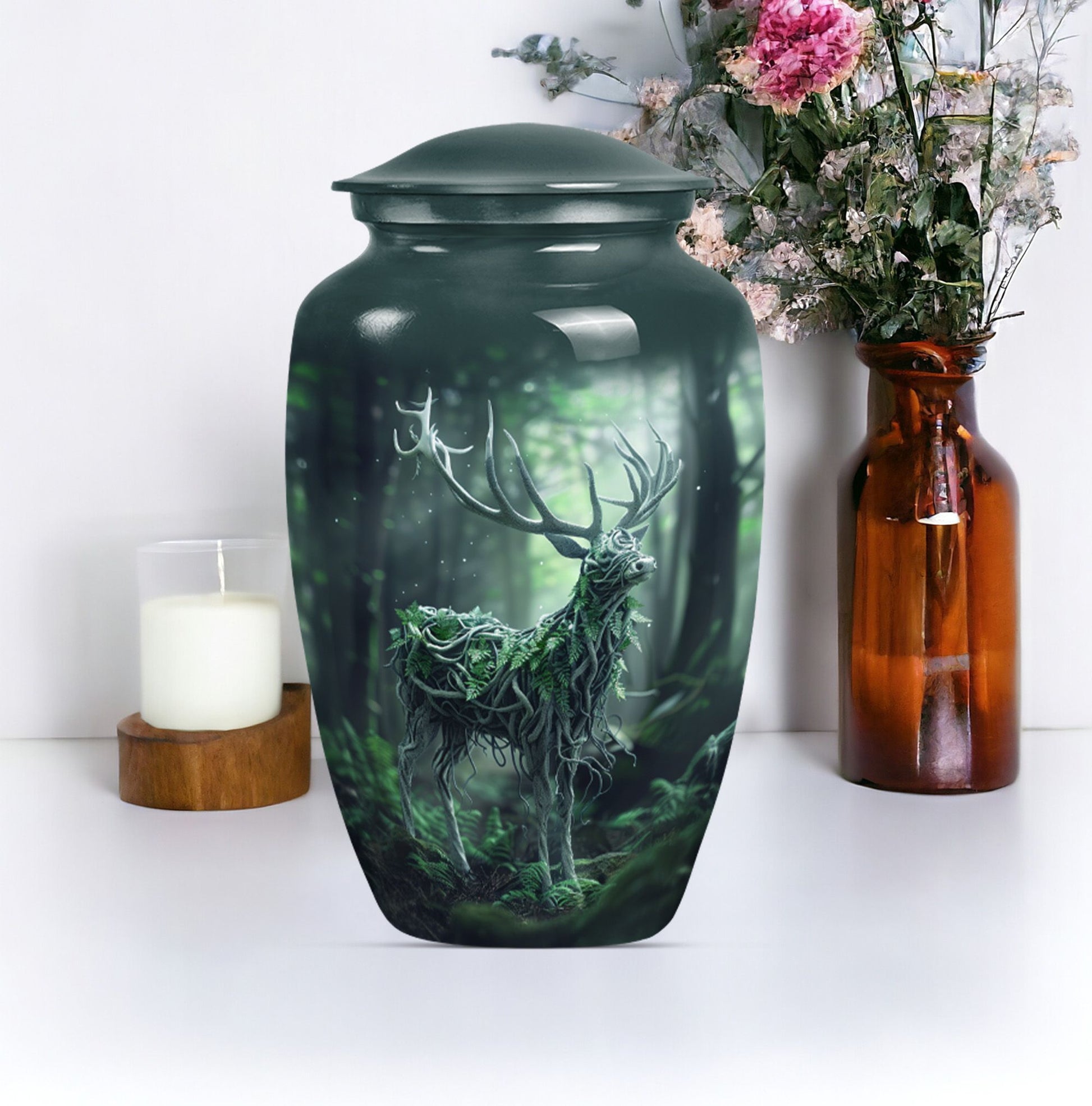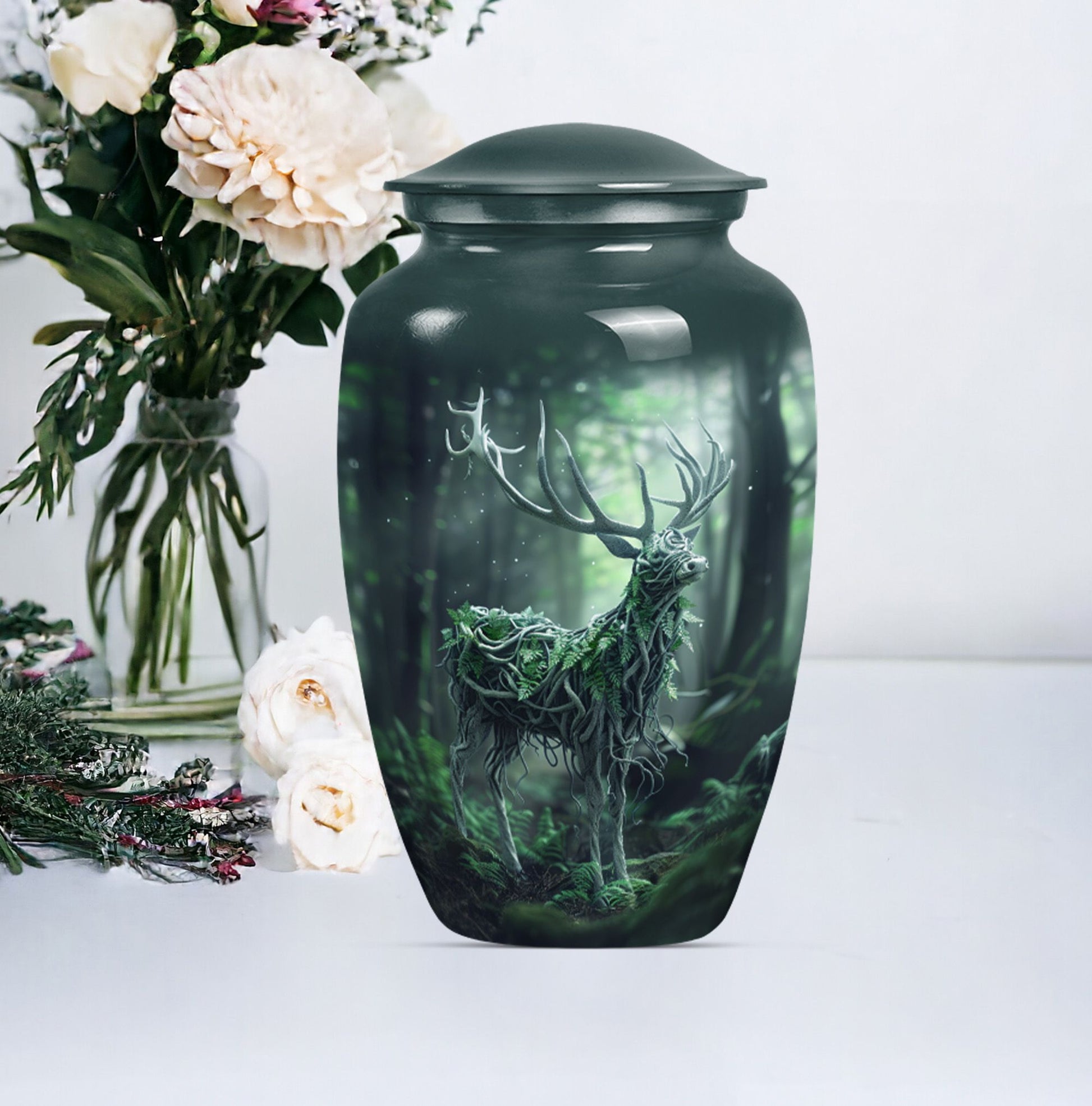 Preserve the memory of your loved ones with our elegant Deer Urn -- a beautifully crafted, dignified solution for cremains. It stands at a noble height of 10 inches and weighs a solid 3.3 pounds, illustrating its sturdiness and resilience. Our funeral urn for ashes adult possesses a capacity generous enough to hold up to 200 cubic inches of cremains. It's made from premium quality aluminium, ensuring it lasts for generations. The urn features a captivating design with a Wolf Howling theme, reflecting a sense of tranquility and freedom. This large urn serves as a perfect reminder of your beloved male dad or any man who held a special place in your heart. We respectfully provide a soft velvet pouch for tasteful containment and preservation of the ashes. Added personalization allows for engraving names, making the memorial even more exclusive. As an enchanting centerpiece in your home, this deer urn keeps the spirit of your dear ones eternally close.