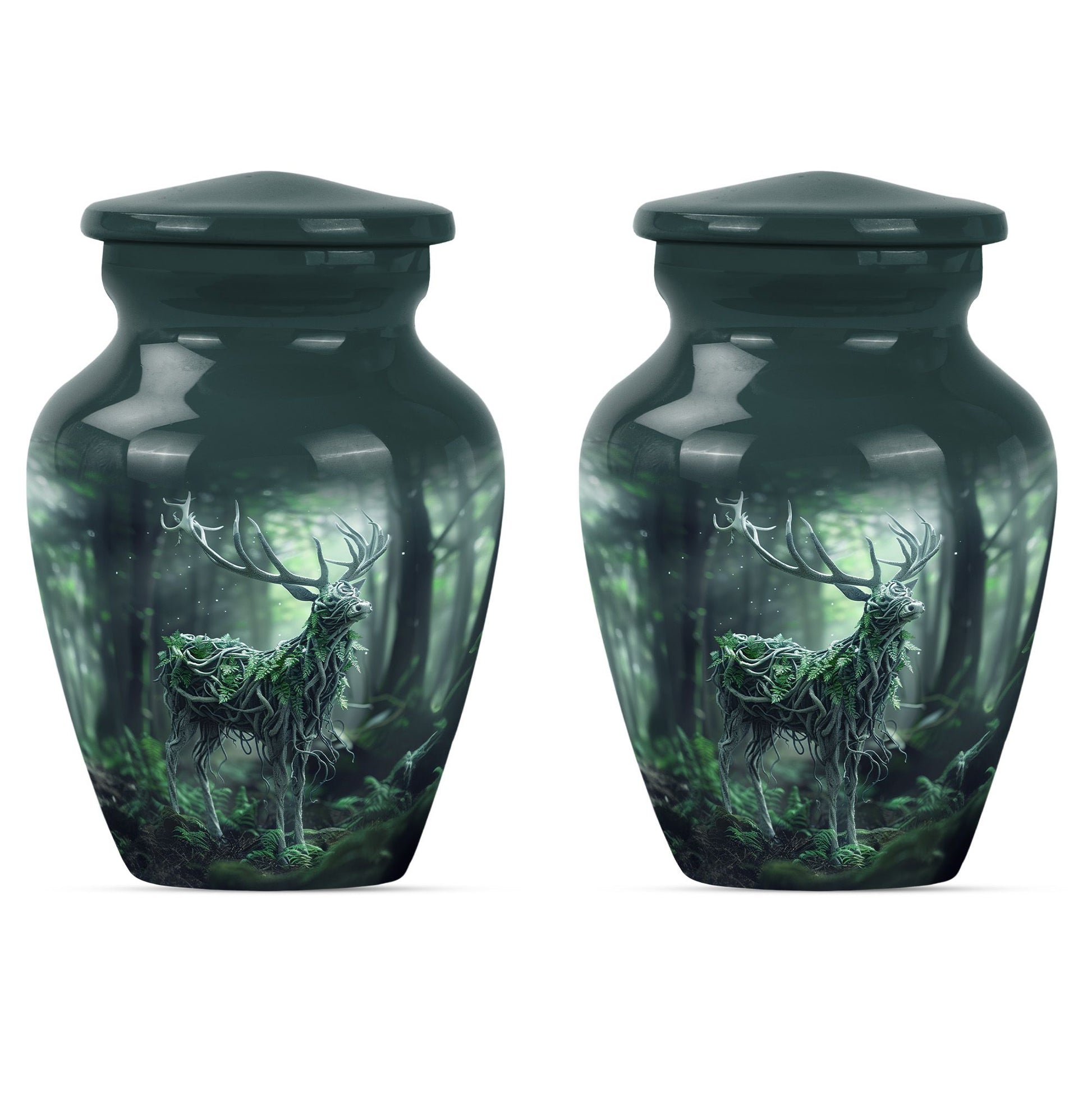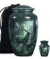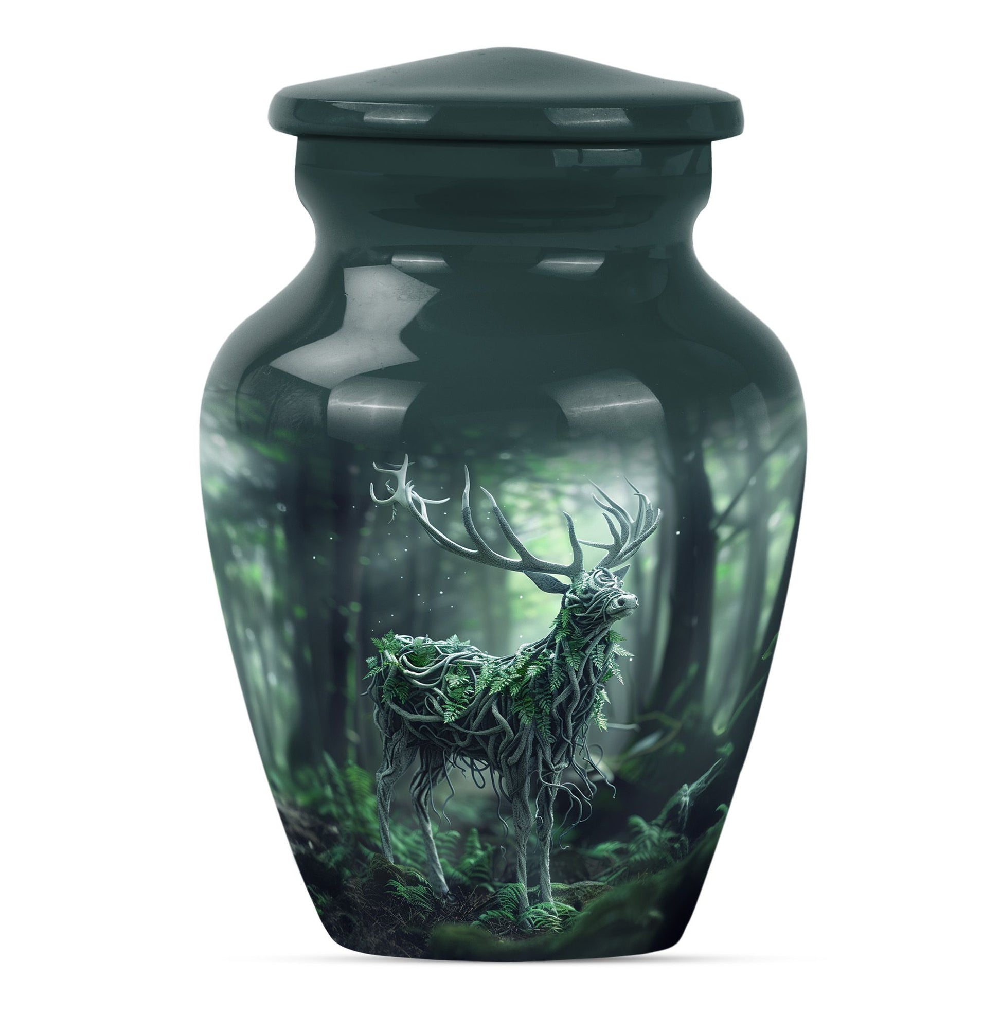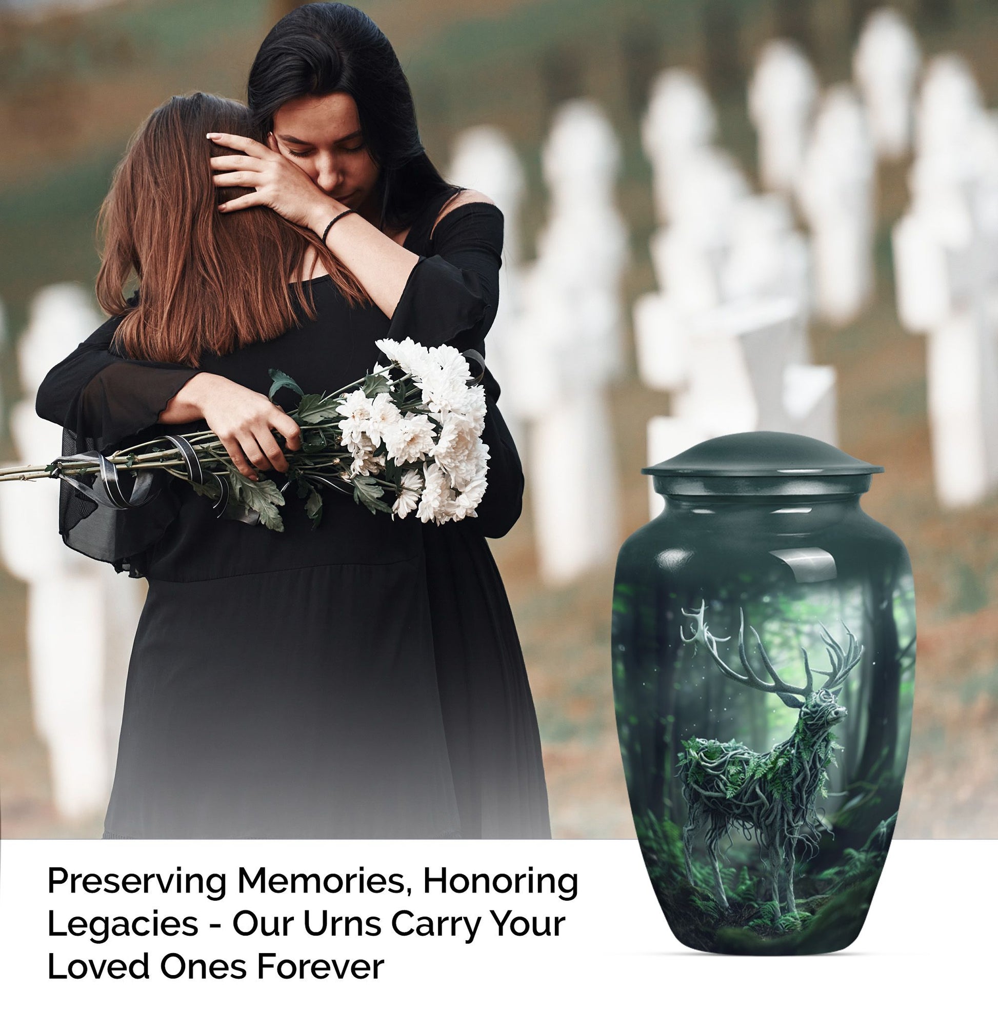 Preserve the memory of your loved ones with our elegant Deer Urn -- a beautifully crafted, dignified solution for cremains. It stands at a noble height of 10 inches and weighs a solid 3.3 pounds, illustrating its sturdiness and resilience. Our funeral urn for ashes adult possesses a capacity generous enough to hold up to 200 cubic inches of cremains. It's made from premium quality aluminium, ensuring it lasts for generations. The urn features a captivating design with a Wolf Howling theme, reflecting a sense of tranquility and freedom. This large urn serves as a perfect reminder of your beloved male dad or any man who held a special place in your heart. We respectfully provide a soft velvet pouch for tasteful containment and preservation of the ashes. Added personalization allows for engraving names, making the memorial even more exclusive. As an enchanting centerpiece in your home, this deer urn keeps the spirit of your dear ones eternally close.