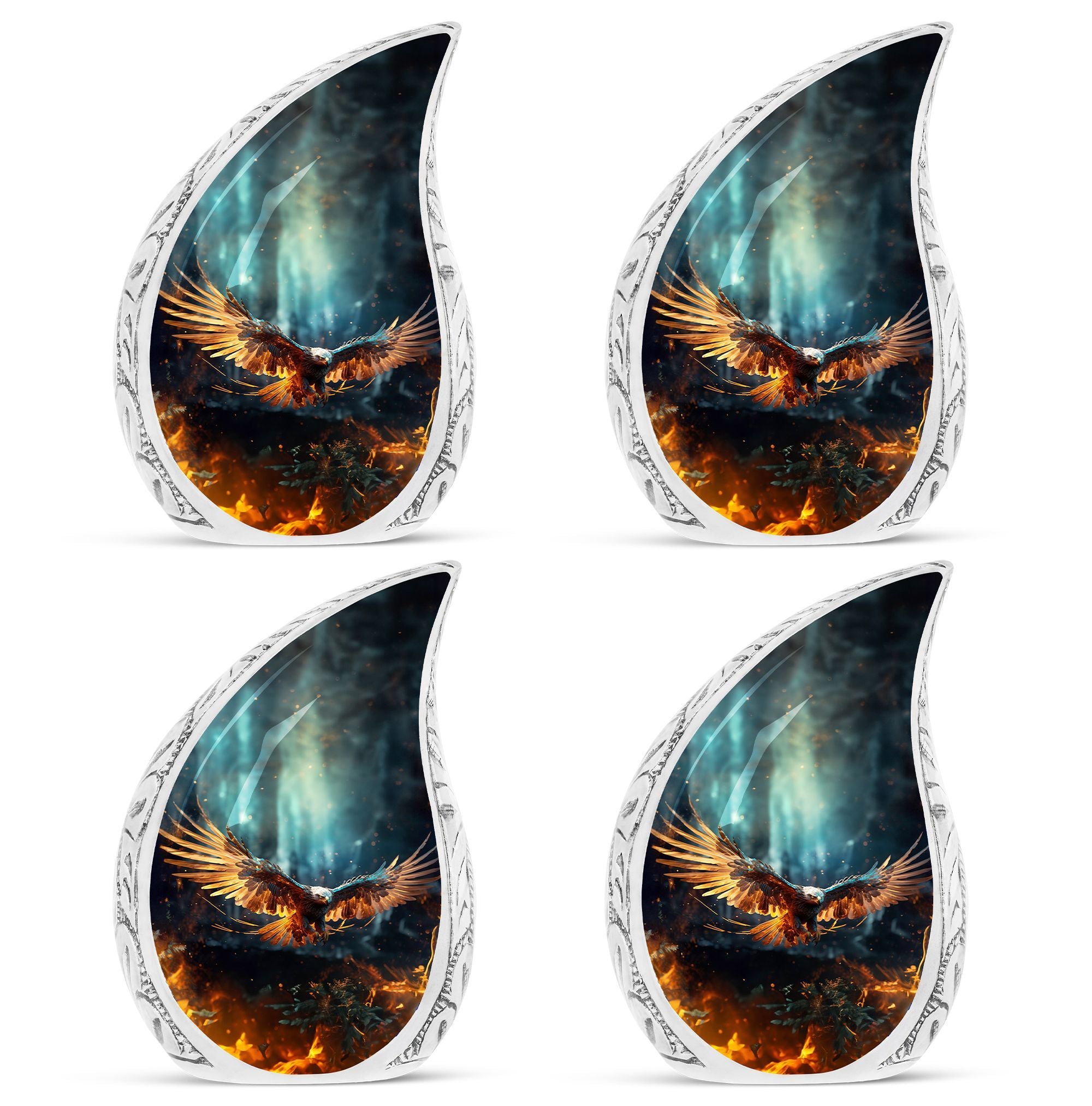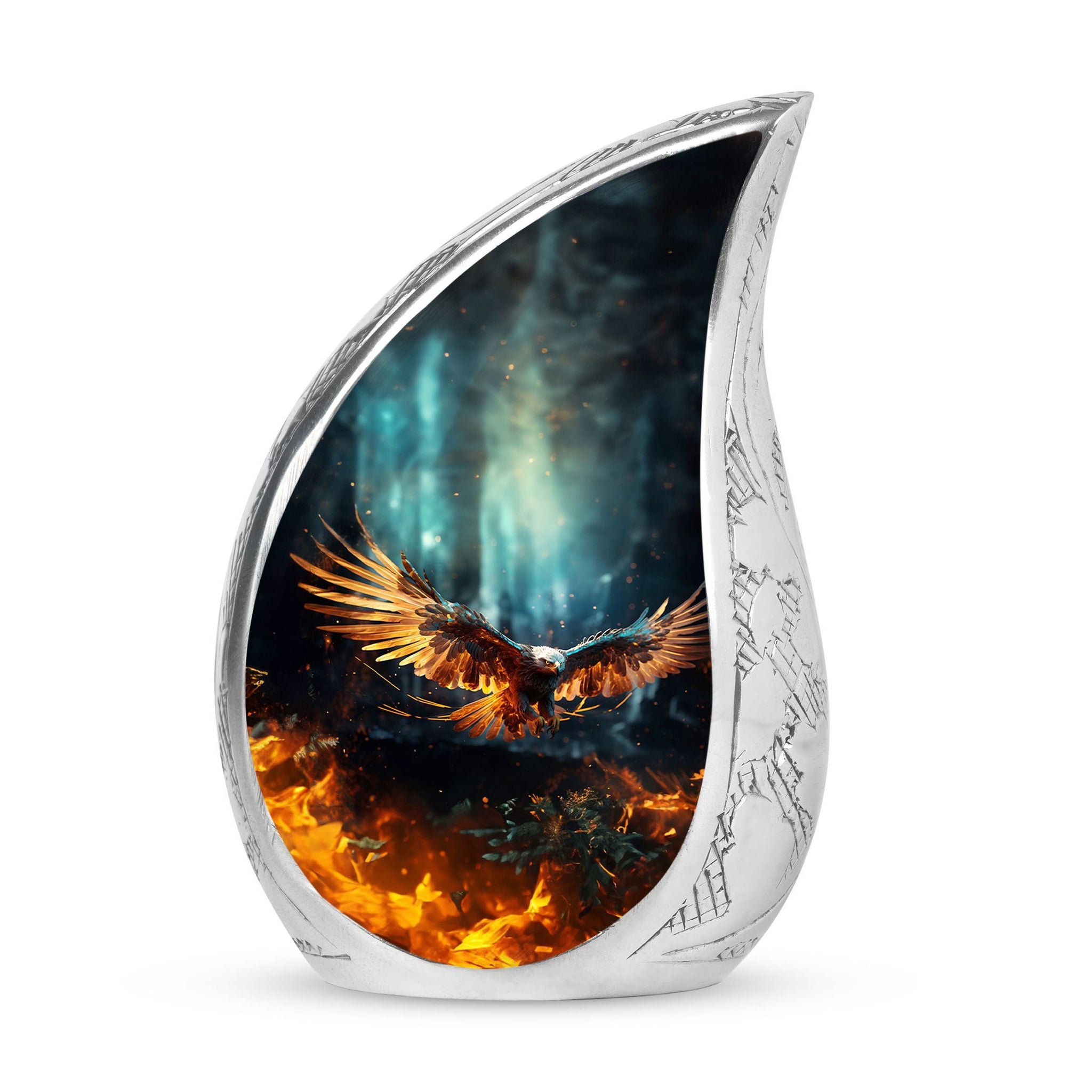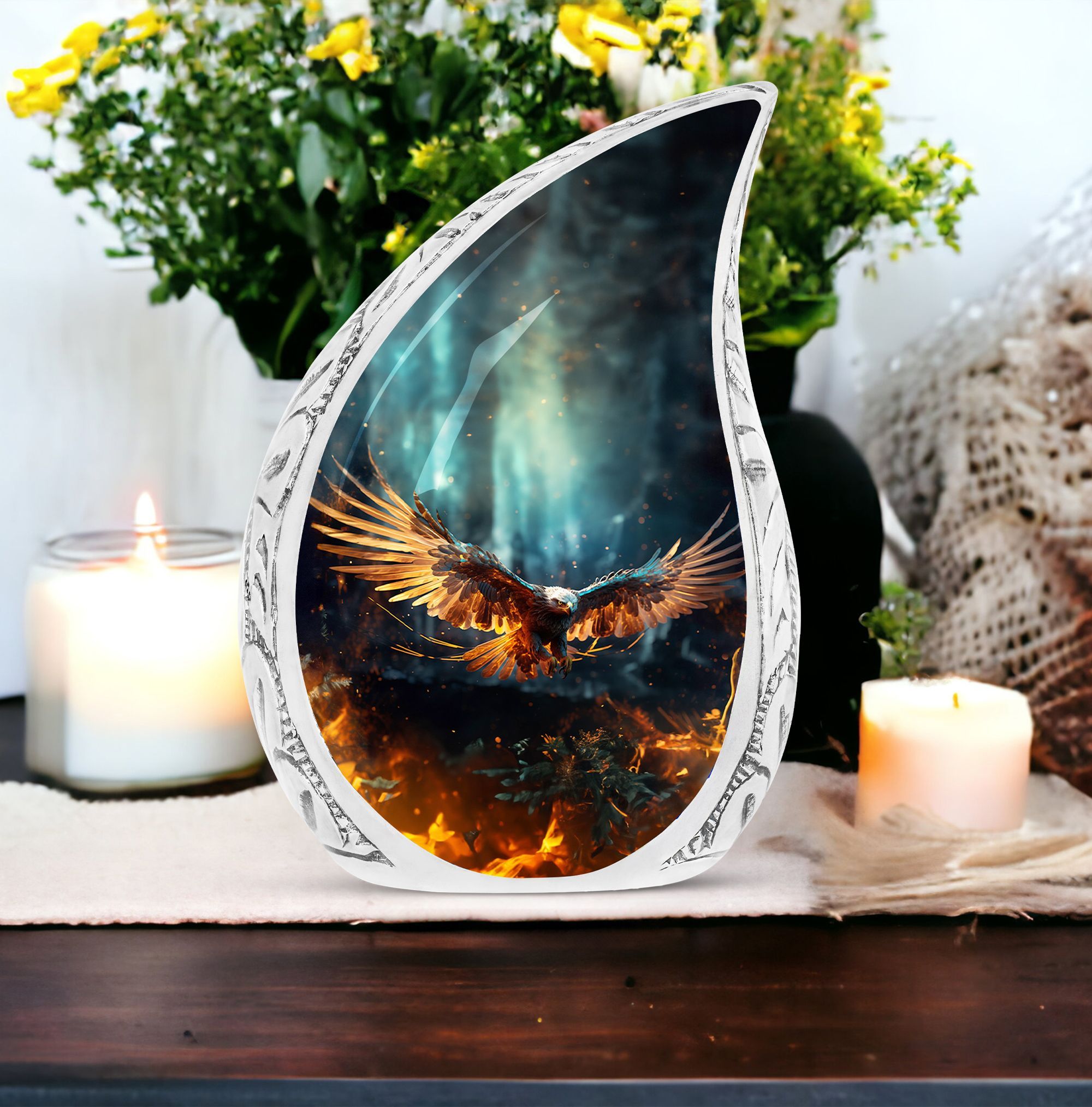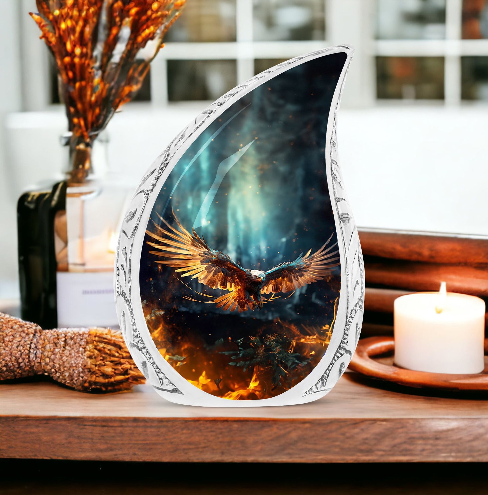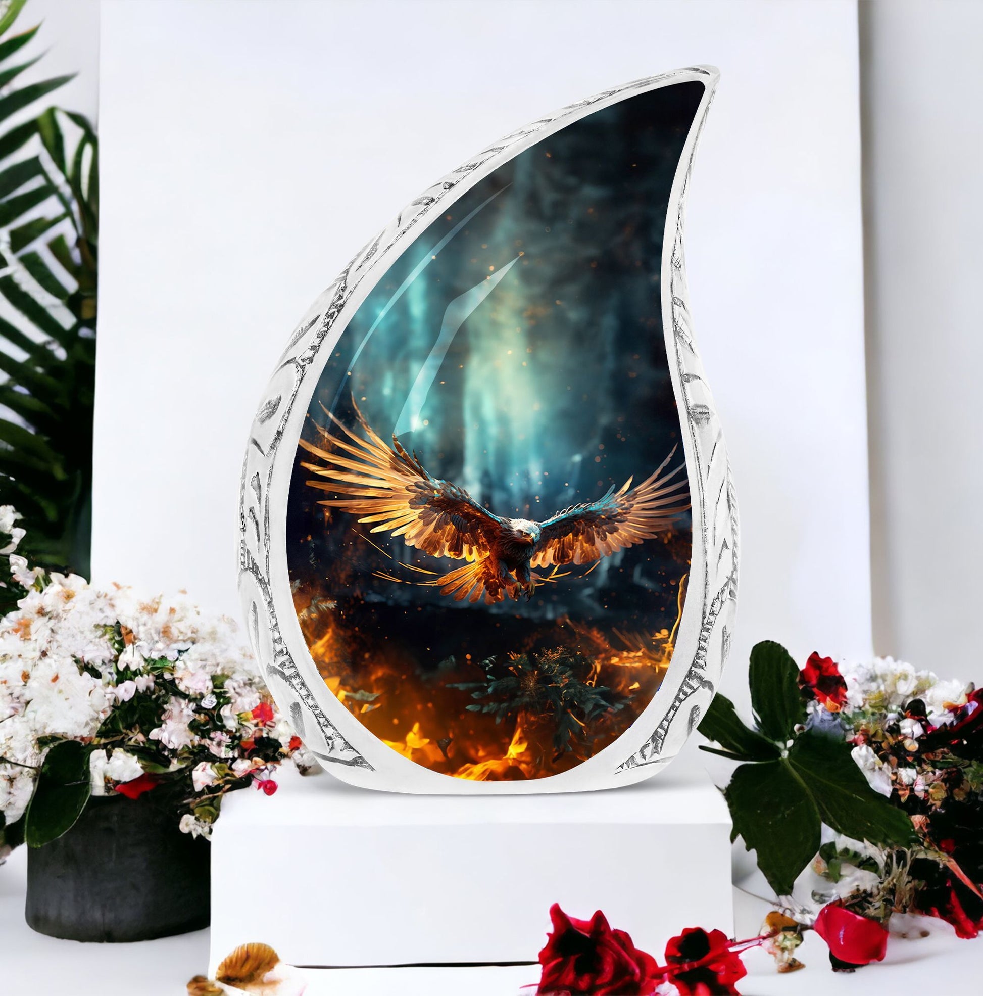 Experience the solemn beauty of our Large Eagle Urns for Human Ashes. This coveted urn is manufactured from sturdy and durable Aluminium, promising years of remembrance. Offering a capacity of 200 cubic inches, it's perfectly tailored to encapsulate a significant portion of your cherished one's cremation ashes. Each urn measures a commanding 10 inches in height and weighs 3.3 pounds, symbolizing the enduring solidity of your fond recollections. Plus, you get a luxurious velvet pouch for containment of ashes, adding an elegant touch to your memorial ceremony. Personalize this urn with engraved names to keep the memory of your loved one closer to you. Its Classic Urn style offers a timeless appeal that never goes out of fashion.