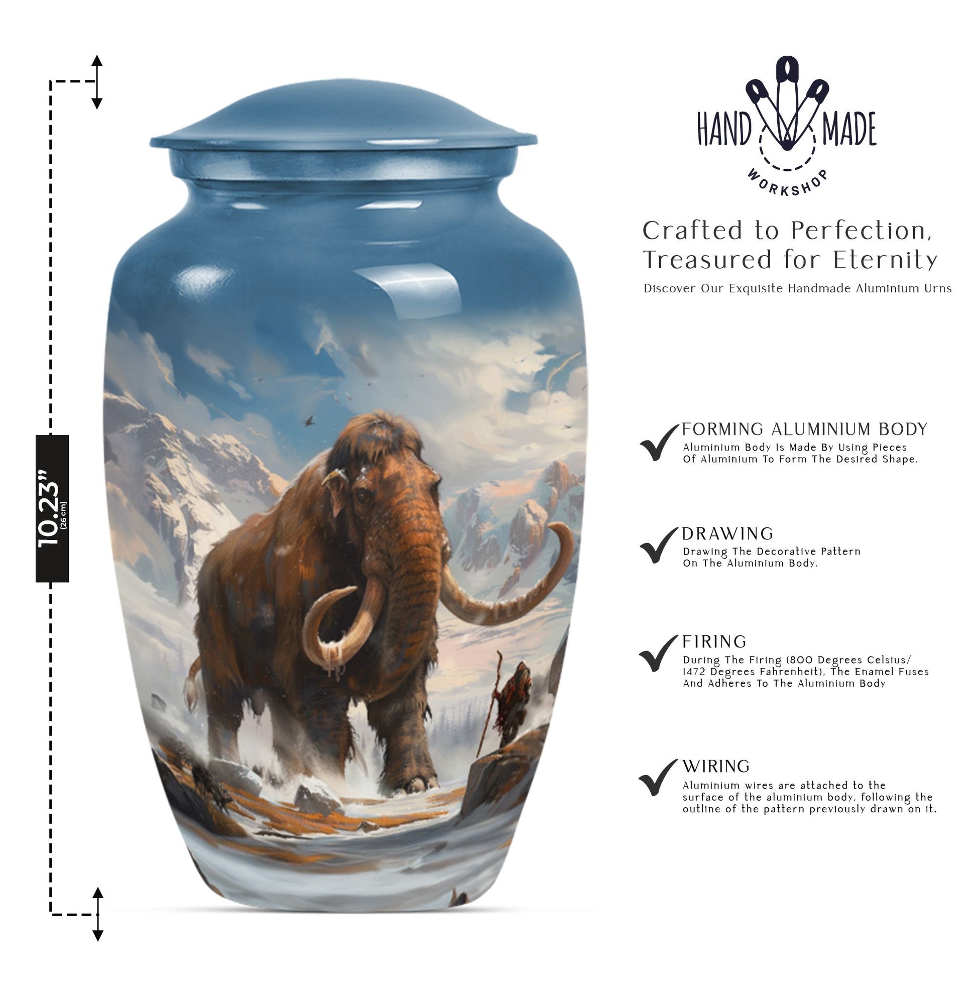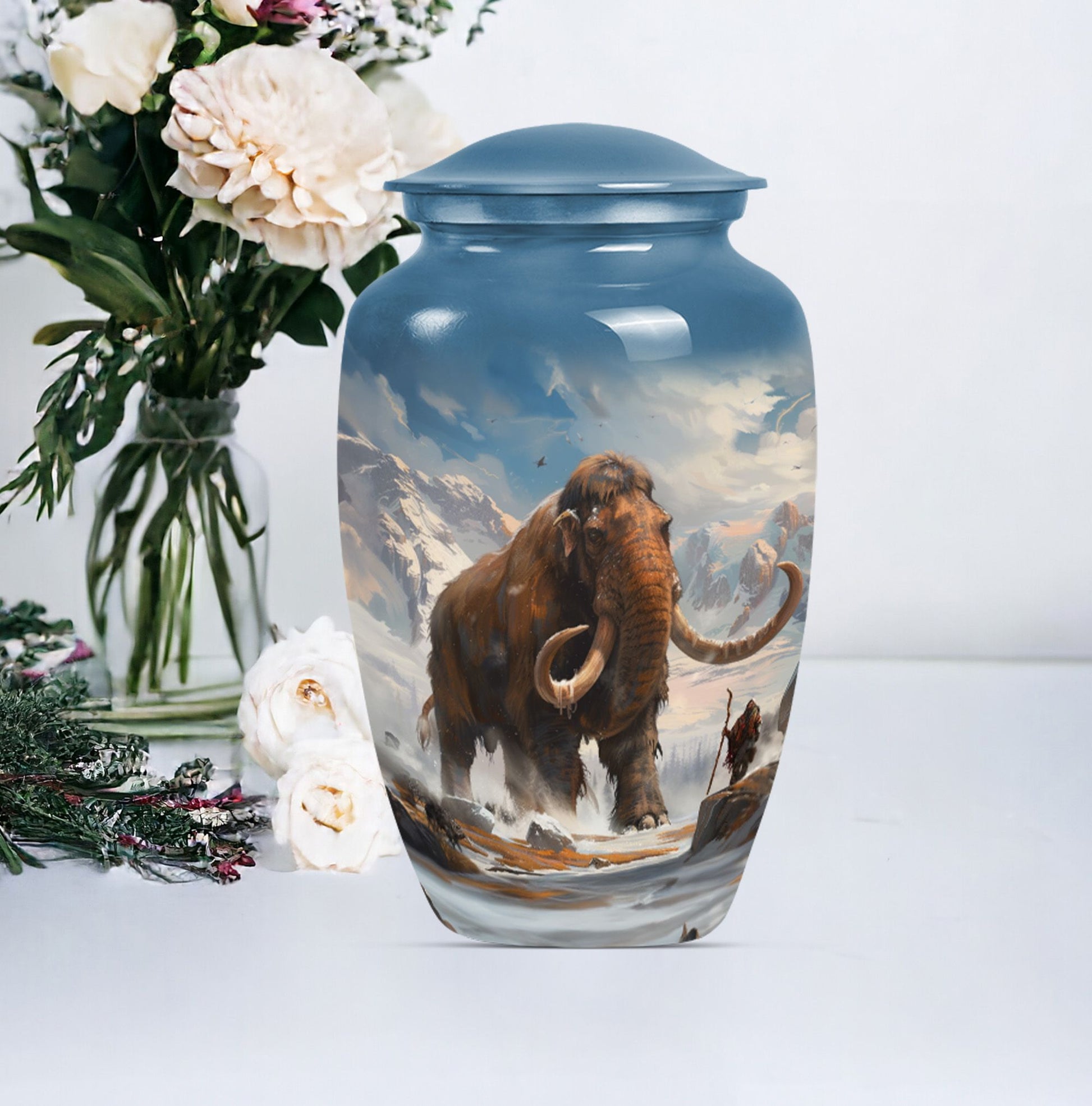 Discover a timeless way to honor your loved one with this exquisite mammoth urn. This large urn, measuring 10 inches in height, is delicately crafted from sturdy, high-quality aluminium, giving it a substantial weight of 3.3 pounds. Thanks to its capacity of 200 cubic inches, this cremation urn can respectfully contain a substantial amount of ashes. The package includes a velvet pouch, providing a soft, dignified containment for the ashes. Further adding to its uniqueness, this urn offers the option to personalize, with space for engraved names. Its theme features delicate flowers, stirring a sense of calm serenity, an invocation of the eternal cycle of life. Often sought after in the burial funeral cremation urns sphere, this cremation urn is an excellent choice for human ashes, be it adult male or female. Laden with elegance and solemn beauty, it can also serve as a decorative piece in your home. Experience a unique blend of reverence and art with this cherished keepsake.