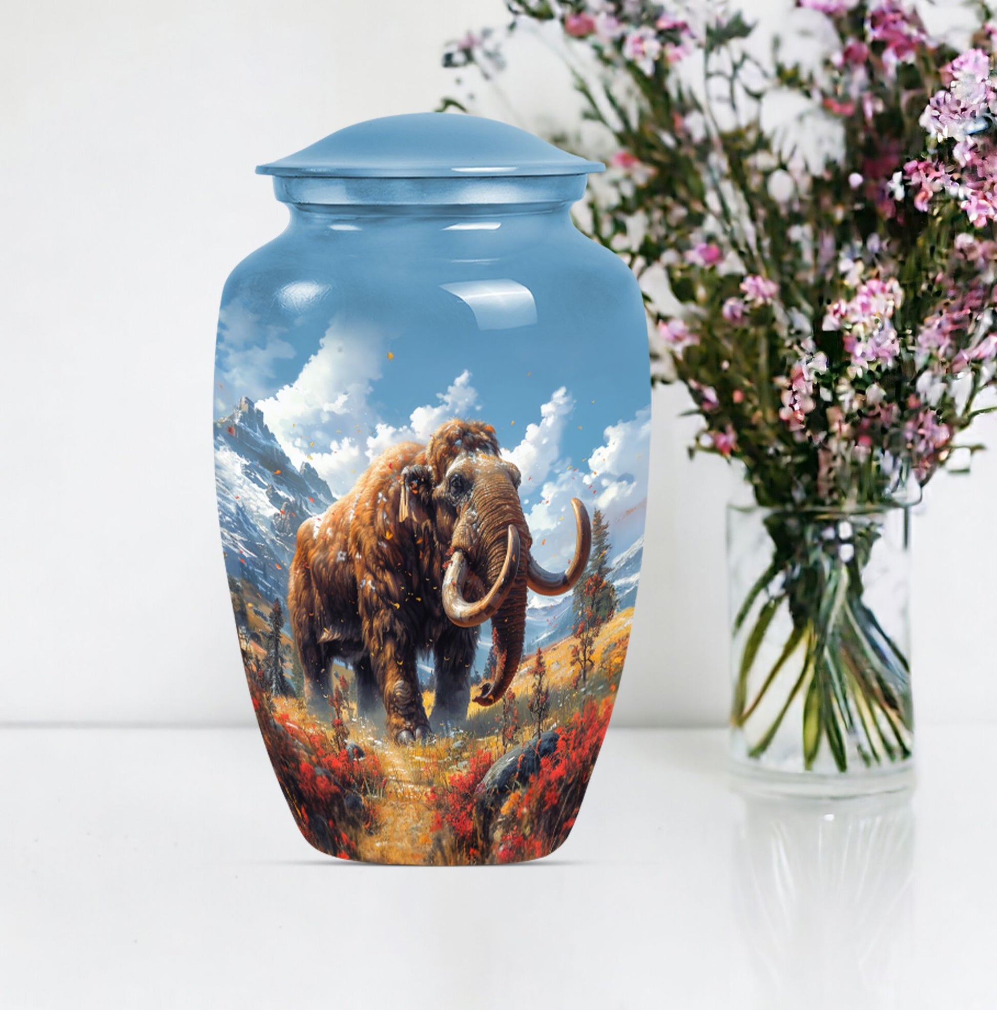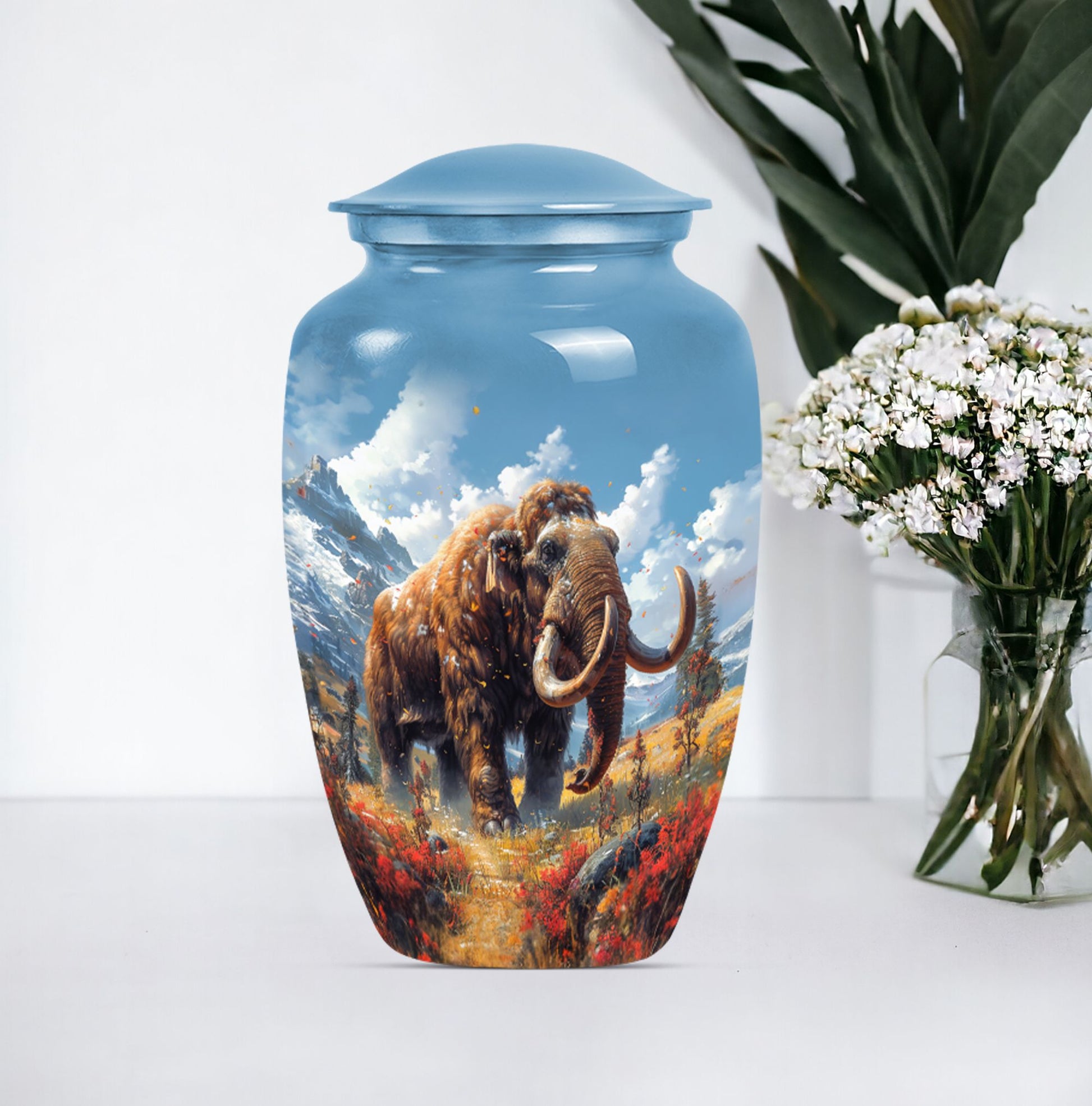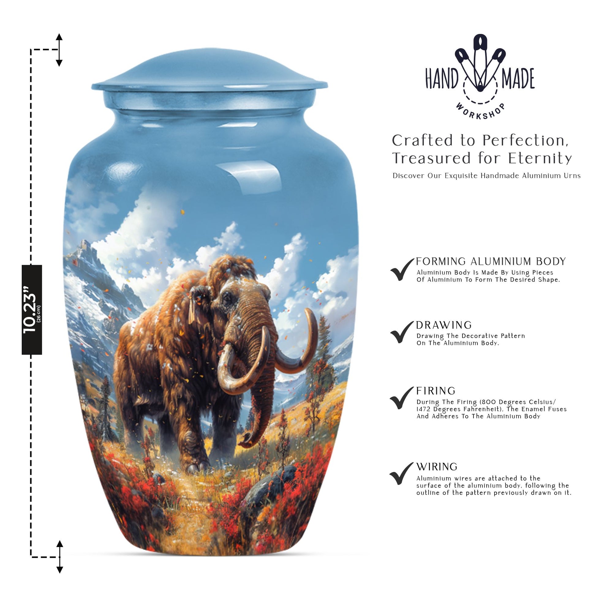 Presenting the Mammoth Memorial Funeral Urn, a sizeable masterpiece, standing 10 inches tall. Not only is this large urn a touching tribute to your loved ones, but it also serves as a prominent accent for your decor. This urn captures the solemnity and importance of memorial ceremonies, particularly for senior citizens. Fashioned from resilient Aluminium, this mammoth urn weighs 3.3 pounds and can accommodate 200 cubic inches of contents. It comes with a soft velvet pouch, providing a secured containment for your precious ashes. To create a truly personal touch, the urn offers a customization option where you can engrave the names of your loved ones. With a buttery theme, this urn emanates a symbolic representation of transformation, hope, and life. And with keywords like 'memorial urns,' 'funeral urns for burial,' 'human ash urn,' and 'urns for human ashes,' locating it online will be as easy as placing it on your mantel. Your search for a 'mom cremation urn' ends here with this classic token of remembrance.
