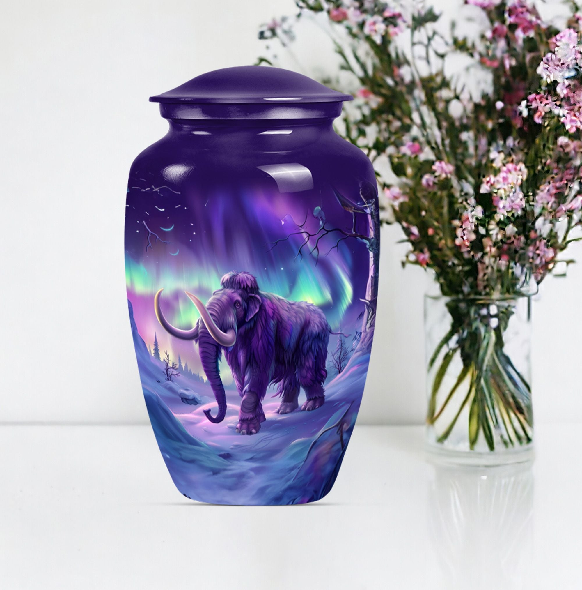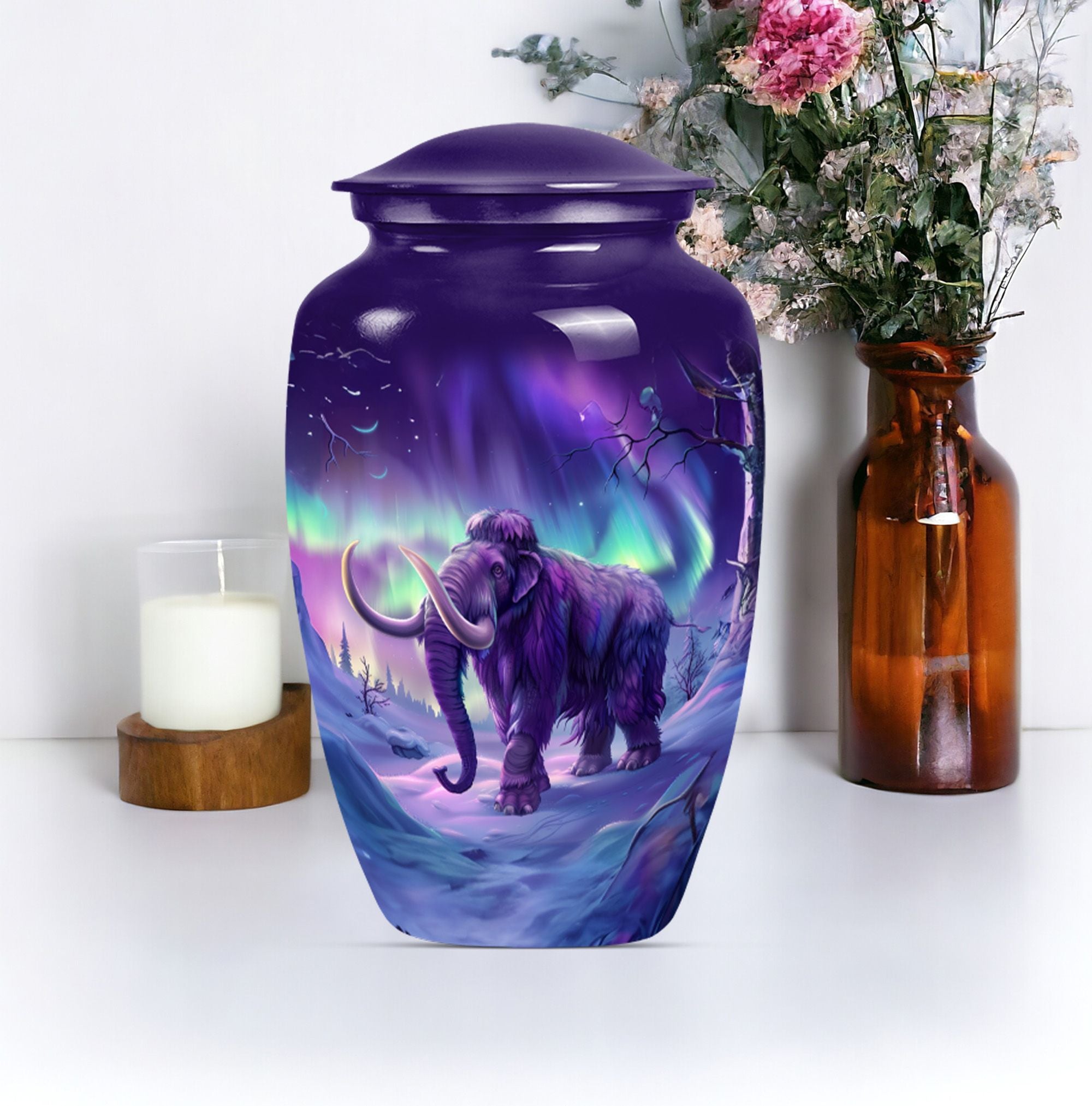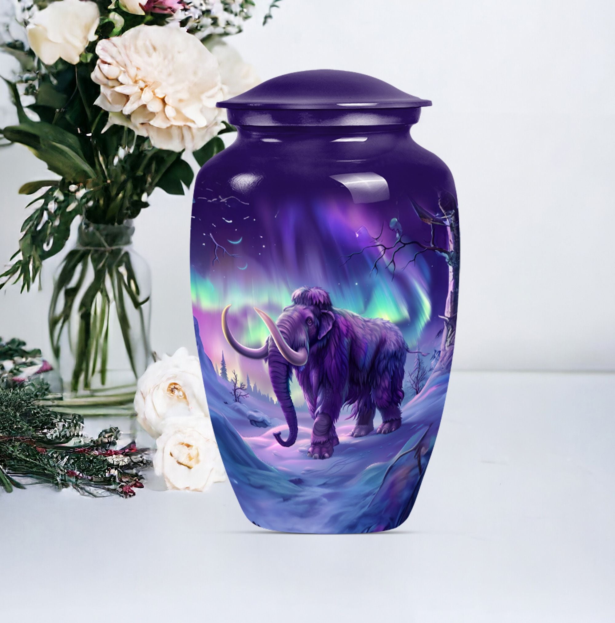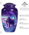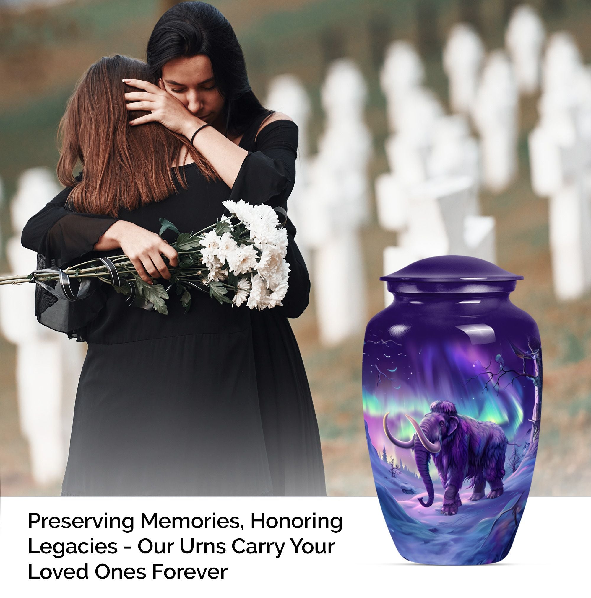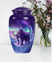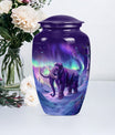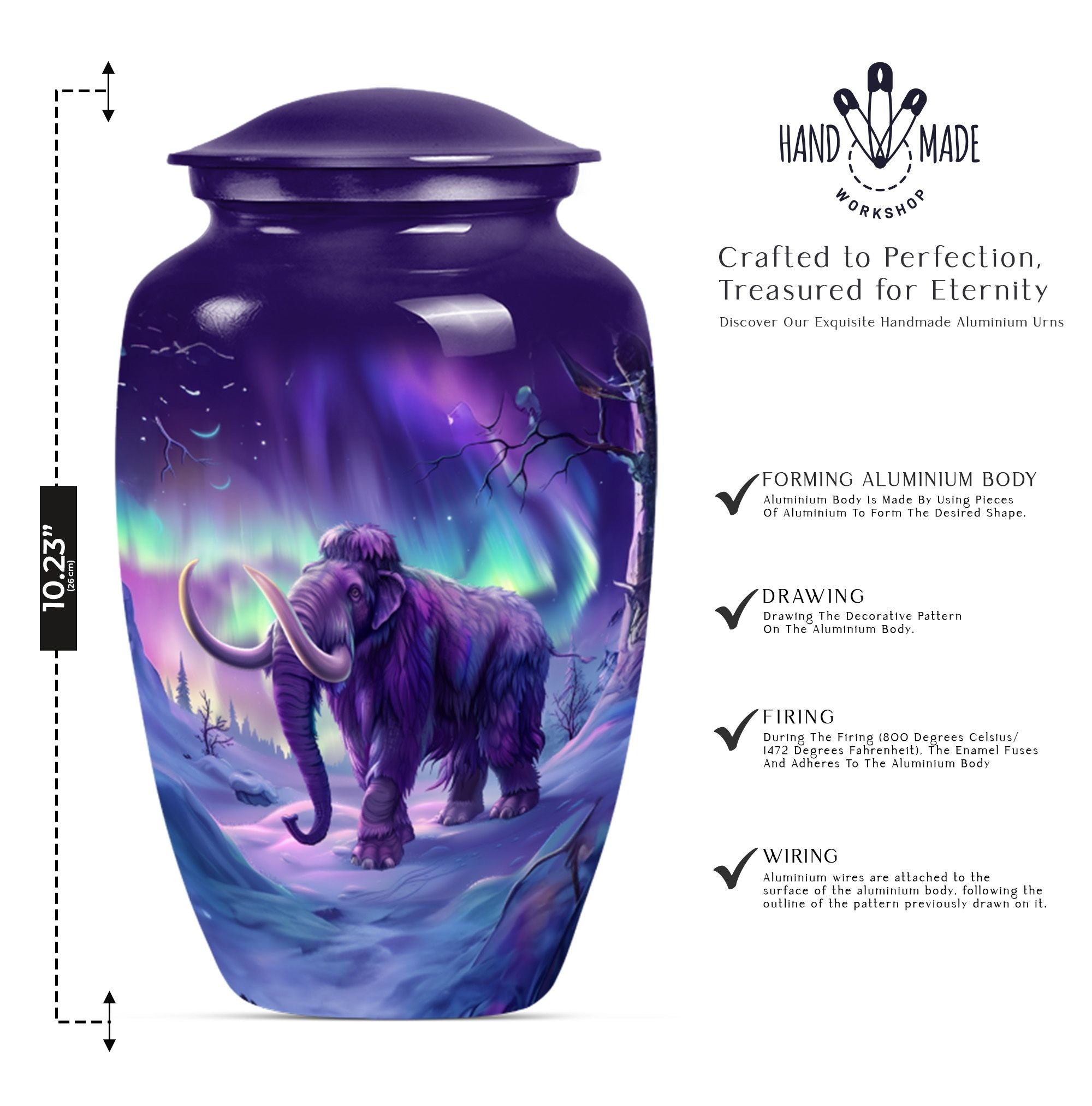 Achieve a lasting tribute to your lost loved one with our mesmerizing 10-inch Mammoth Cremation Urn. Beautifully orchestrated in aluminium, it carries a capacity of 200 cubic inches and delivers an enduring facade that weighs a reasonable 3.3 pounds. The urn features a captivating 'Wolf Howling' theme, adding a distinctive touch to our large-sized urn category. With our personalization option, you can engrave names to make the memorial symbolic and more heartfelt. The urn package also includes a velvet pouch for discreet containment and respectful disposal of ashes. Ideal for burial ceremonies, it also serves as a modern and substantial addition to your home. Bypass the trite urns; choose our Mammoth urn which is a remarkable and unique choice for memorial urns. For those searching for 'urn human humans', 'Aluminium urns', 'adult female ashes urn', and 'modern urns', this resonates perfectly with your needs. Please note, the design is based on the 'Classic Urn', omitting nothing short of elegance and mastery.