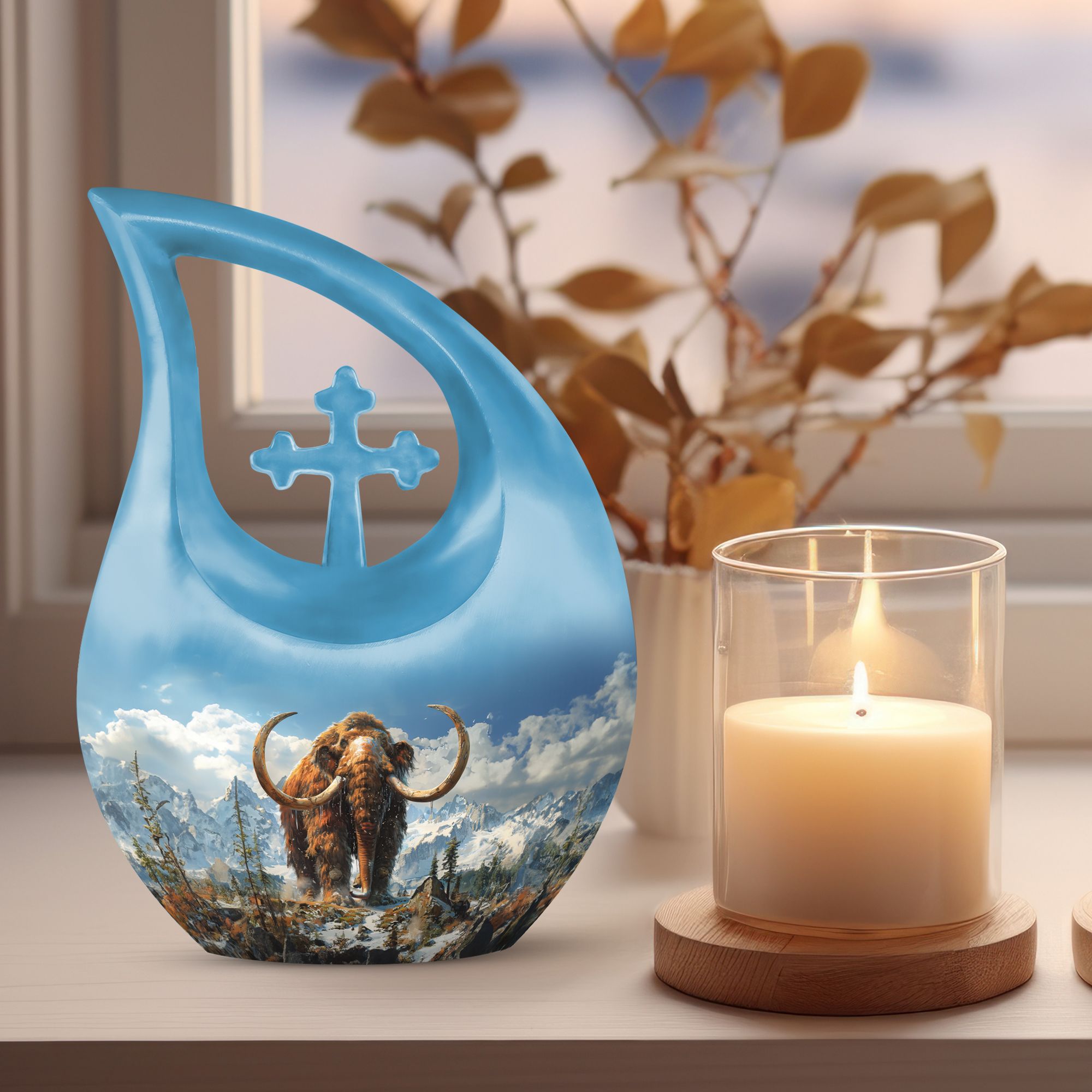 Honoring your beloved mom has never been as deeply heartfelt and special as with our beautiful Mamoth Urn. This 10-inch large urn, notably weighted at 3.3 pounds, is meticulously crafted from high-quality, enduring aluminium. It offers enough space, with a generous capacity of 200 cubic inches. Our tasteful, Mamoth-themed urn can be treasured in your chosen sacred spot or proudly displayed in any room, with its eye-catching Cross Drop design. It comes with a velvet pouch for keeping the ashes safe and consecrated. Furthermore, to make the memorial uniquely touching, we offer customization options allowing the addition of engraved names. This memorable urn delicately balances aesthetic appeal and symbolic significance for a lasting representation of your love and loss. Preferred also under terms like 'Double Urn,' 'Butterfly Urns For Ashes,' 'Decorative Urns For Ashes,' and 'Ashes Into Keepsakes', this urn is a significant addition to the repository of memorial urns.