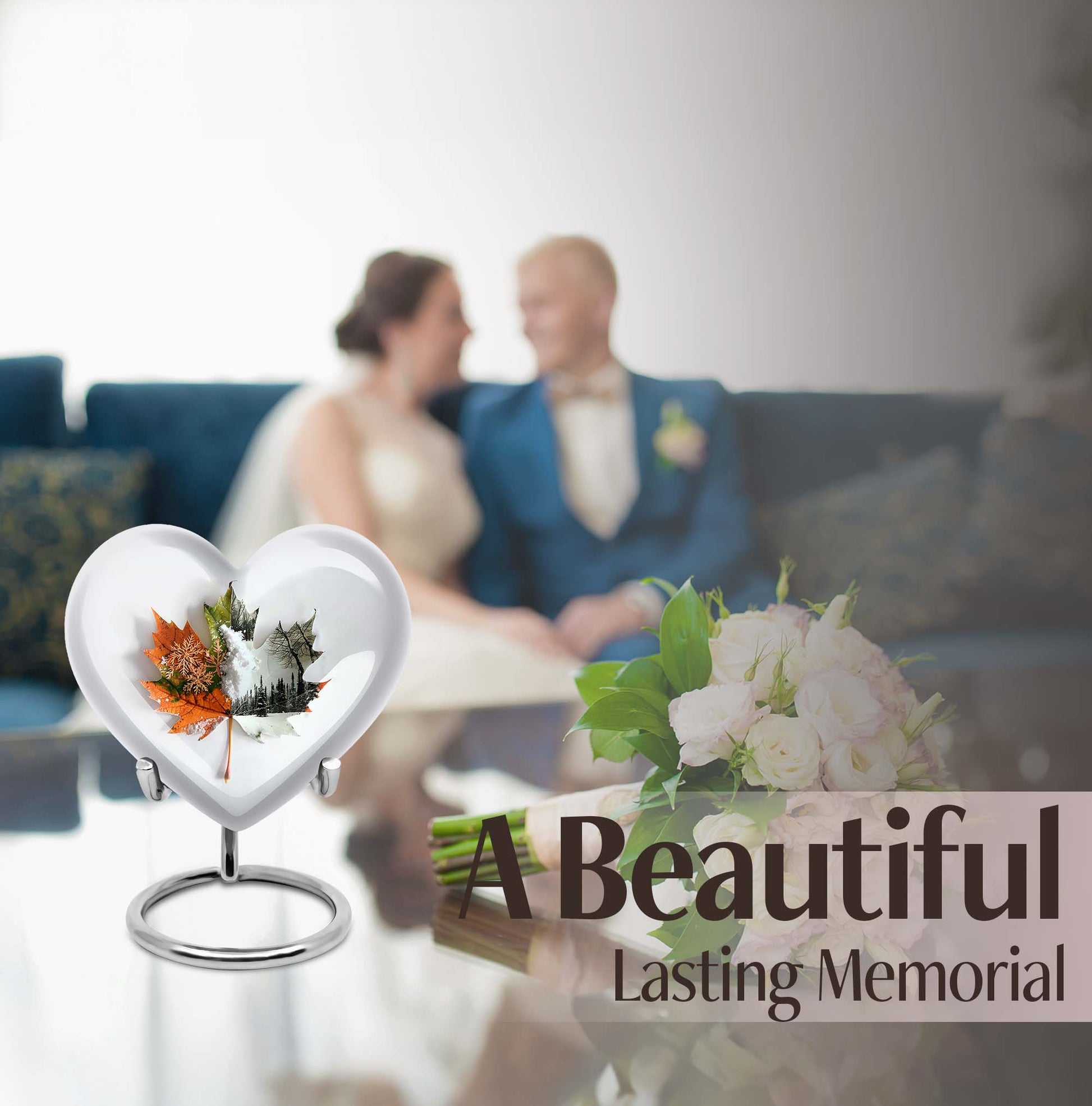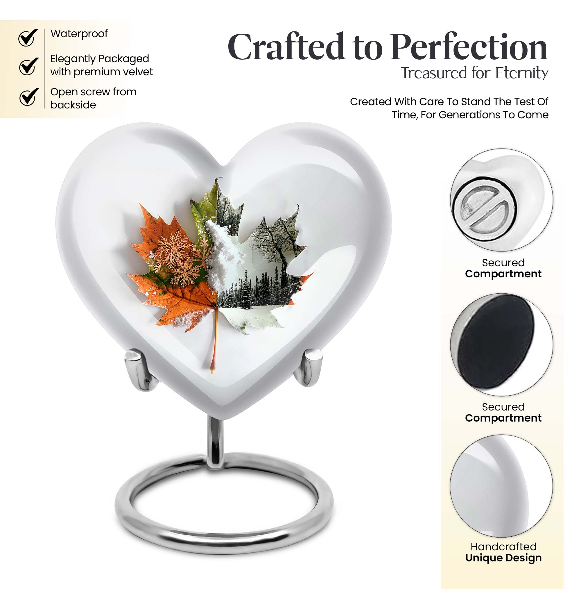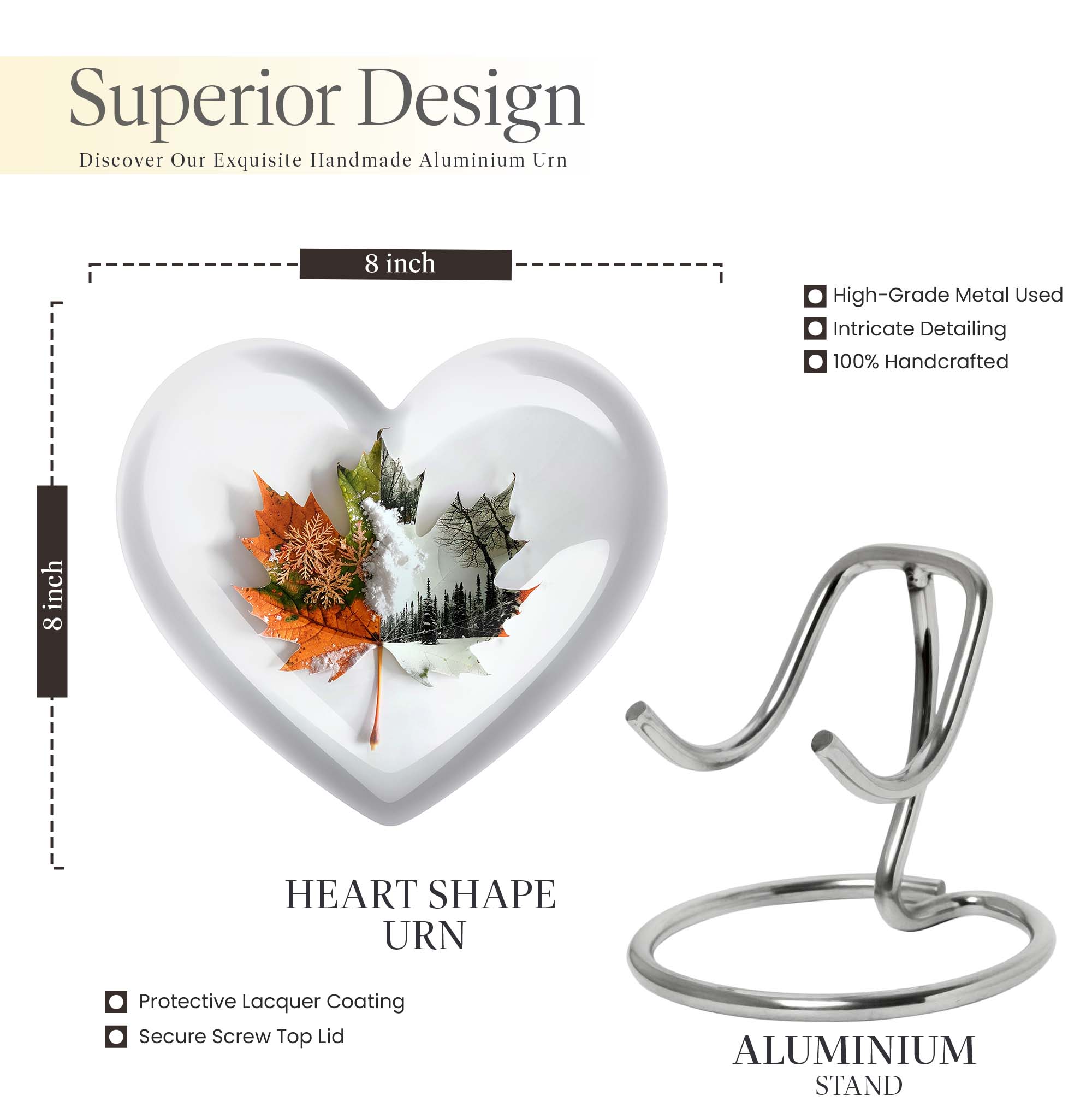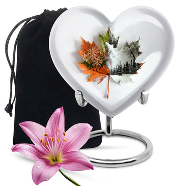 Commemorate your departed loved ones with this elegant mapple leaf urn fashioned from premium, durable aluminium. Measuring at 10 inches in height and weighing 3.3 pounds, this large burial urn promises the utmost dignity in memorial ceremonies. Its capacity of 200 cubic inches ensures enough space to honor the ashes of an adult. Taken a step further, this cremation urn comes with a personalization feature that allows engraving of the names of the departed. To match its sentimental value is its florid theme, beautifully rendered to pay the best tribute. Its distinct Heart Urn design sets it apart while offering a comforting visualization of love and remembrance. Your purchase also includes a velvet pouch for the containment of ashes, ensuring that the final resting place of your loved one echoes warmth, respect, and lifetime recollection. This urn can also be viewed under alternate terms like 'Cremation dad urn', 'urn for human ash women', 'urns for humans', and 'funeral urns for human ashes adult'. Make this heart urn a special memorial for your cherished loved one.