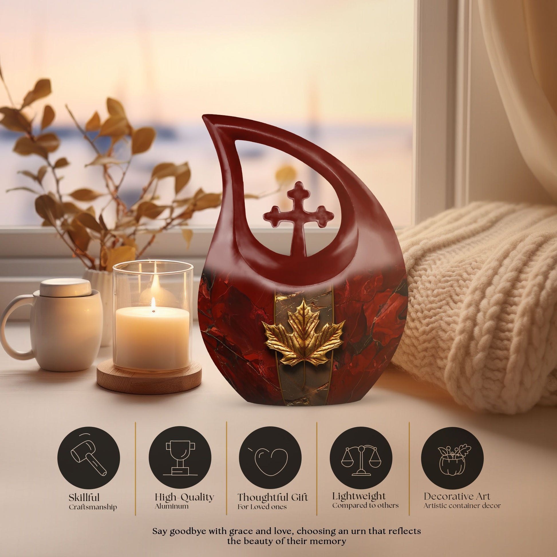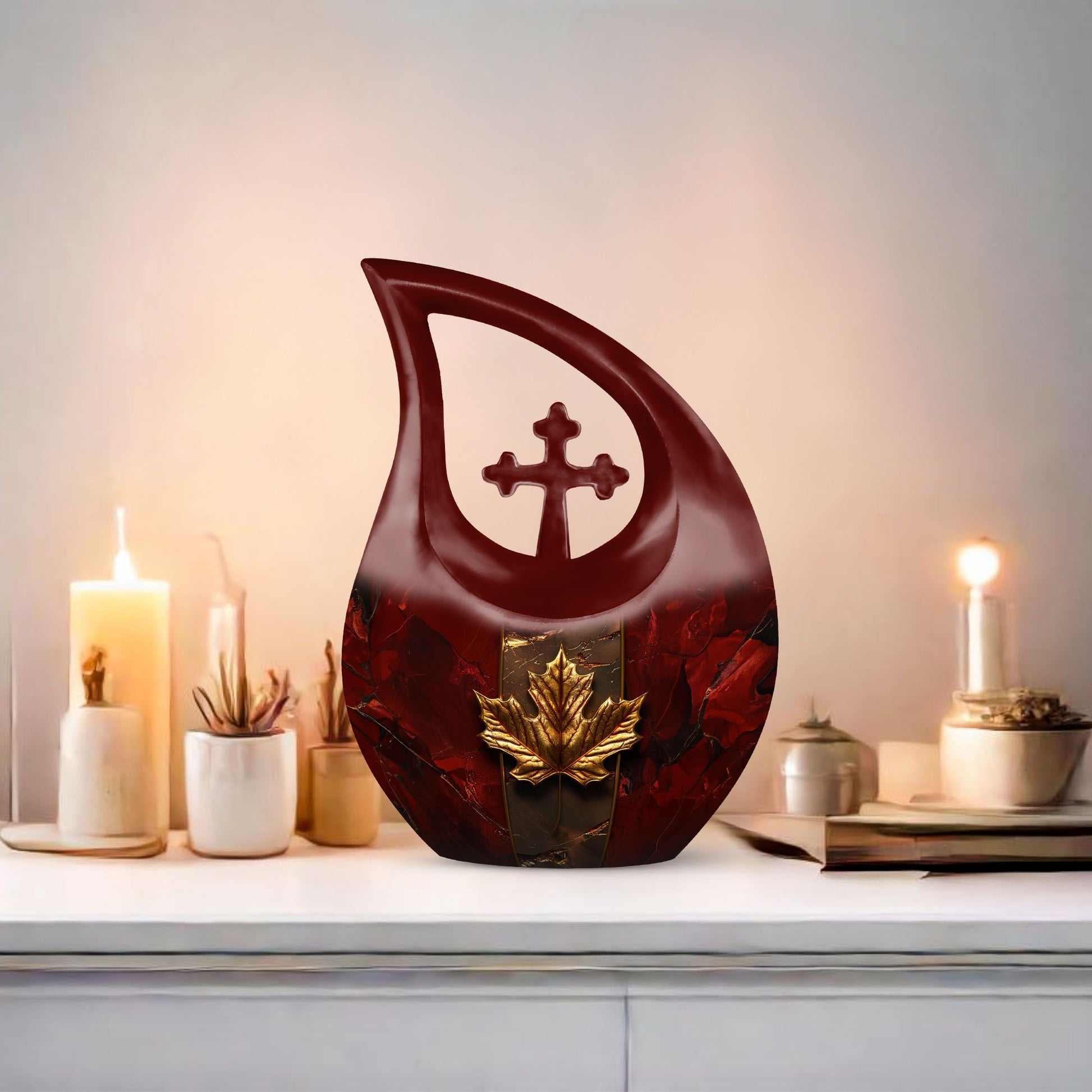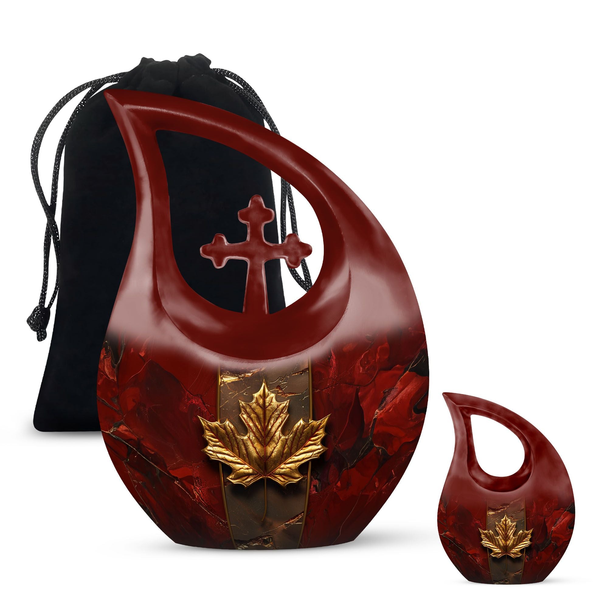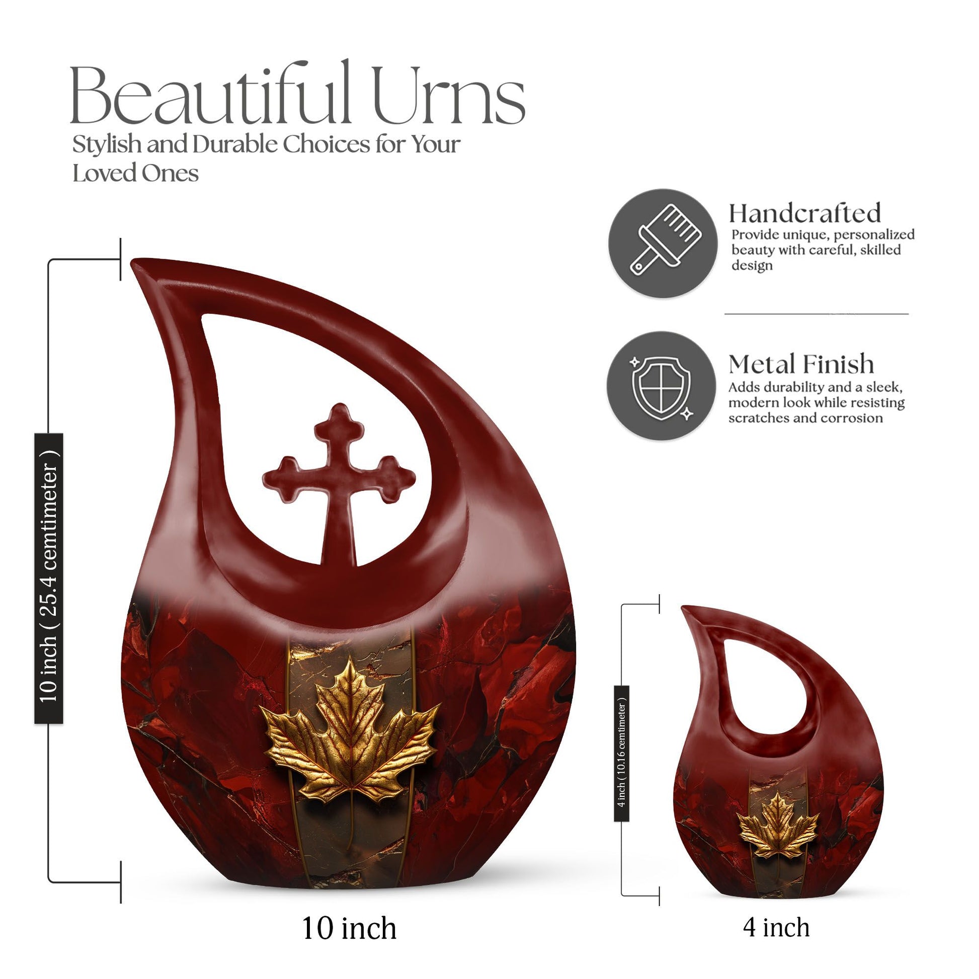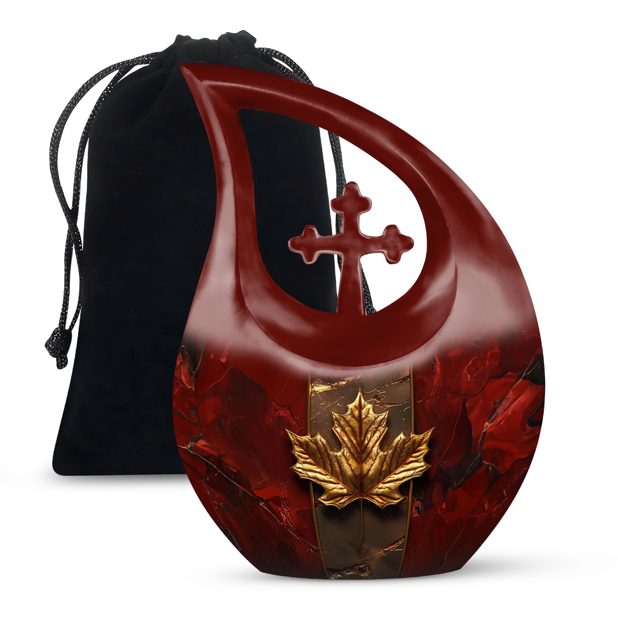 Comfort, strength, and hope embody this magnificent Mapple Leaf Urn. Standing stately at 10 inches and weighing 3.3 pounds, this large urn provides a serene resting place for your loved one's remains. Coinsuring an impressive capacity of 200 cubic inches, it is meticulously crafted from robust aluminium that ensures longevity. The cross drop urn design embodies the solidity of faith, portraying a timeless, spiritual touch. With the package, you will receive a gentle velvet pouch, providing a dignified containment for ashes. Adding a personal sentiment, this memorial urn accommodates customization; now, you can engrave names to memorialize your precious loved one. Whether looking for memorial urns, or exploring keywords like 'garden urn', 'keepsake cremation urns', or 'personalized urns for human ashes', this Mapple Leaf Urn stands out as a unique blend of divine significance and earthy resonance. Cast in the tranquility of memory and the warmth of the Mapple Leaf theme, curated for your remembrance.