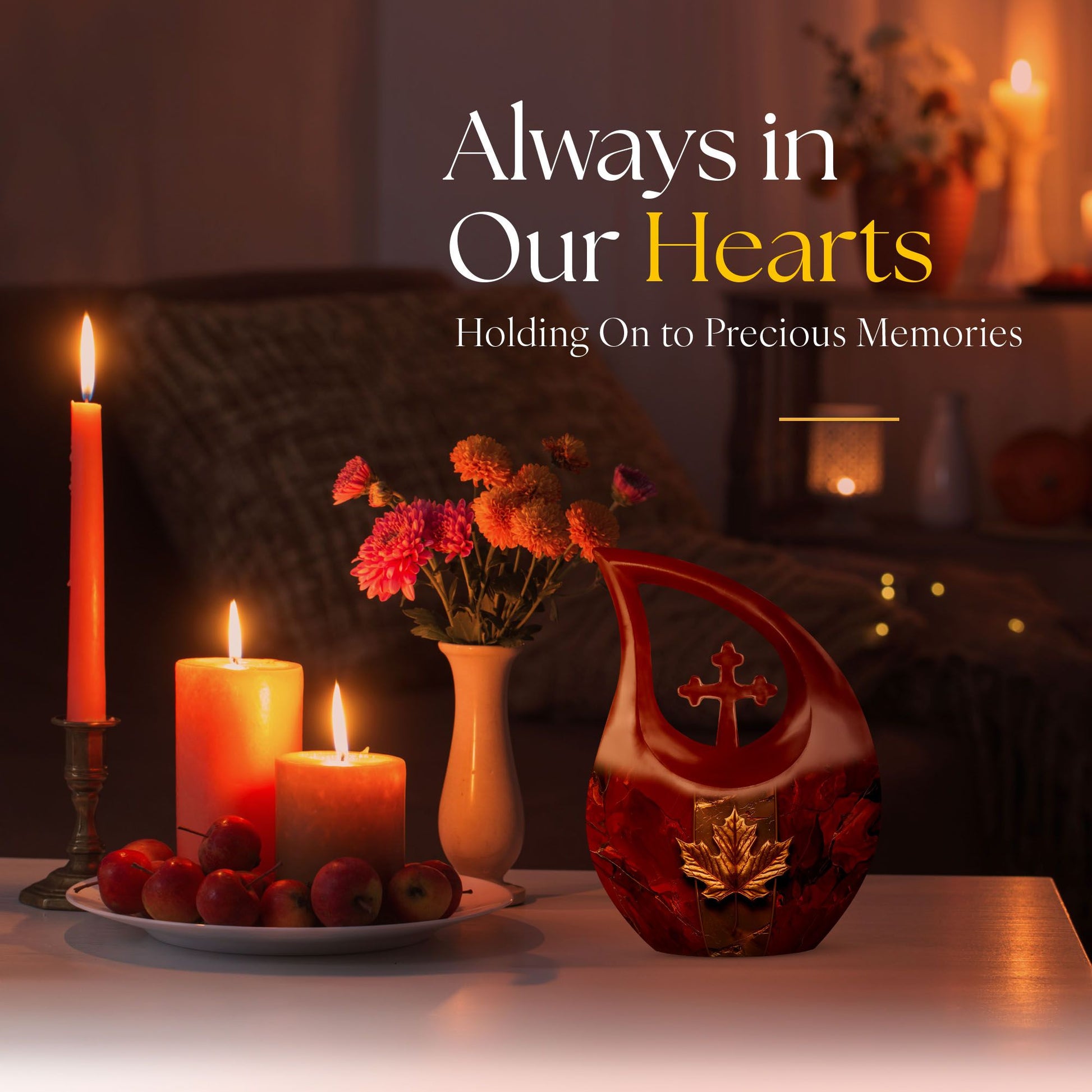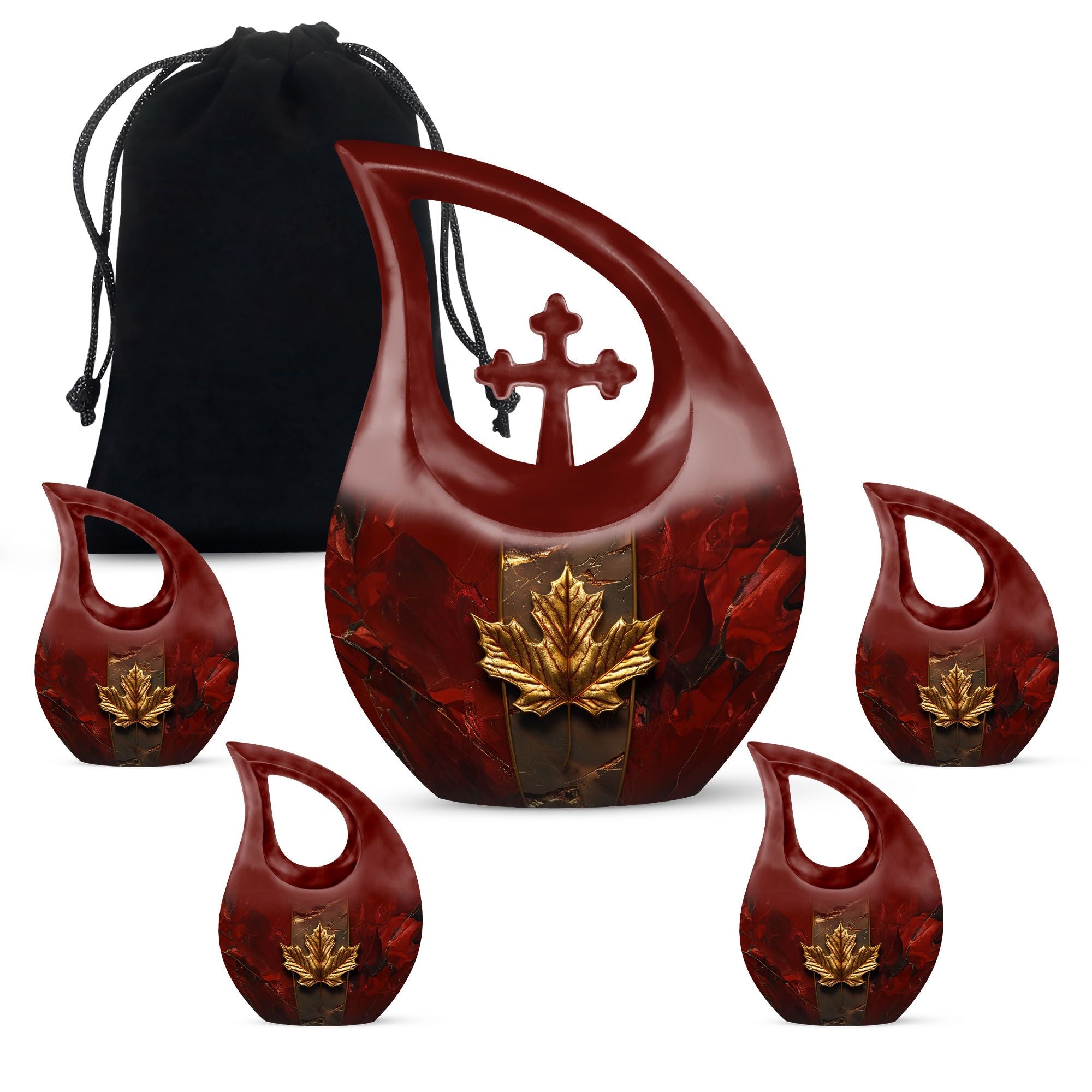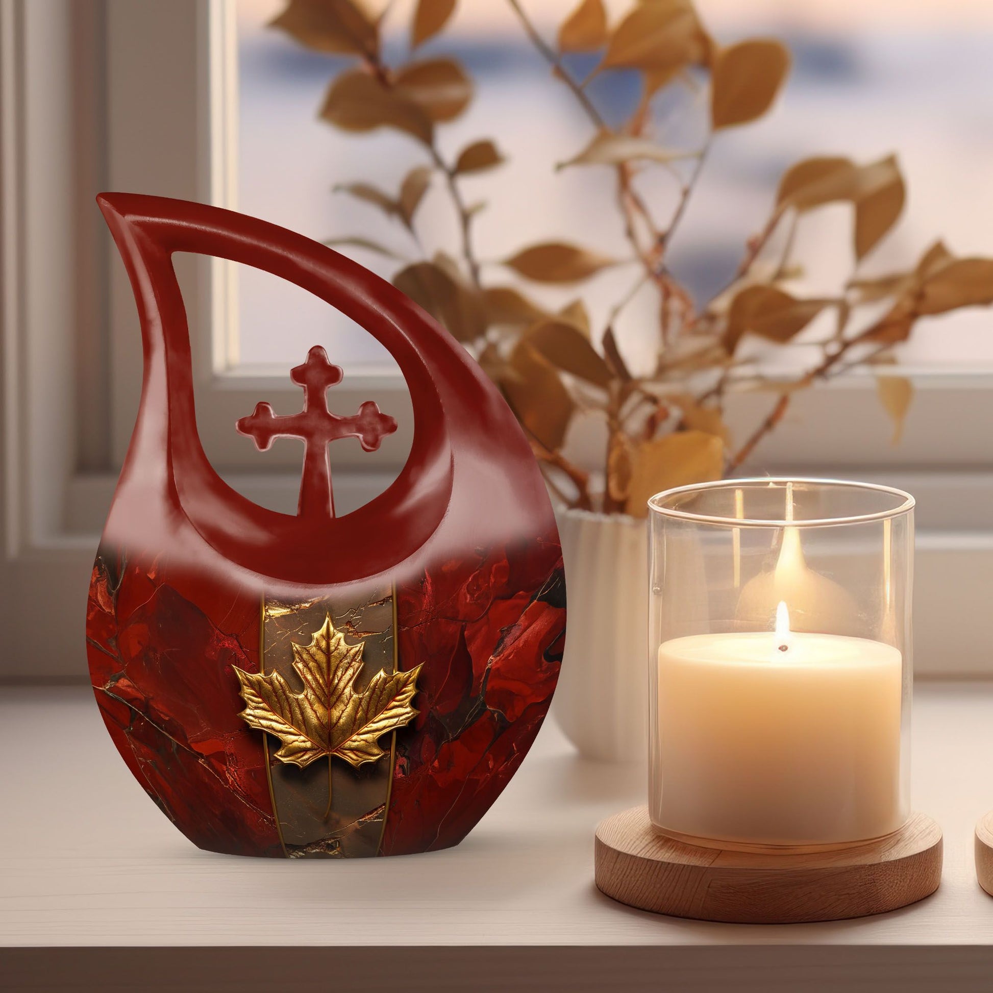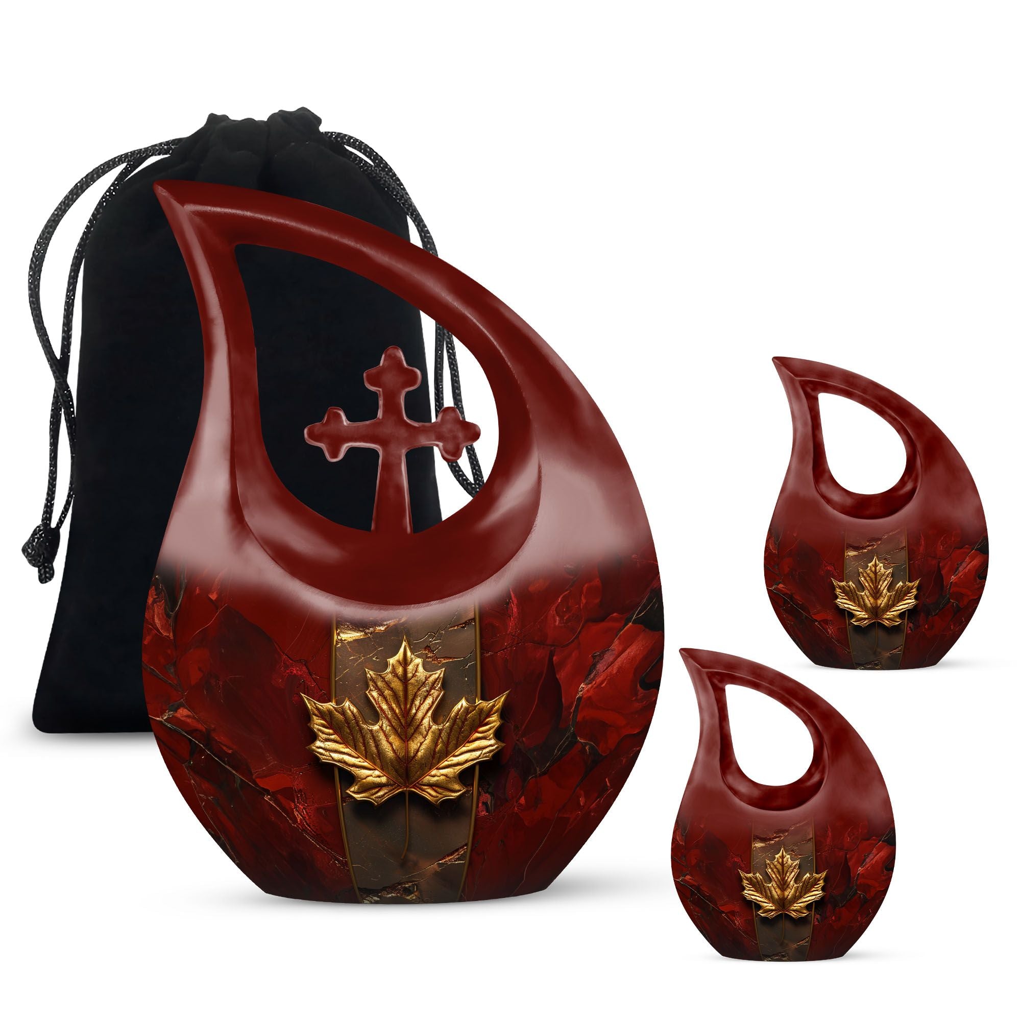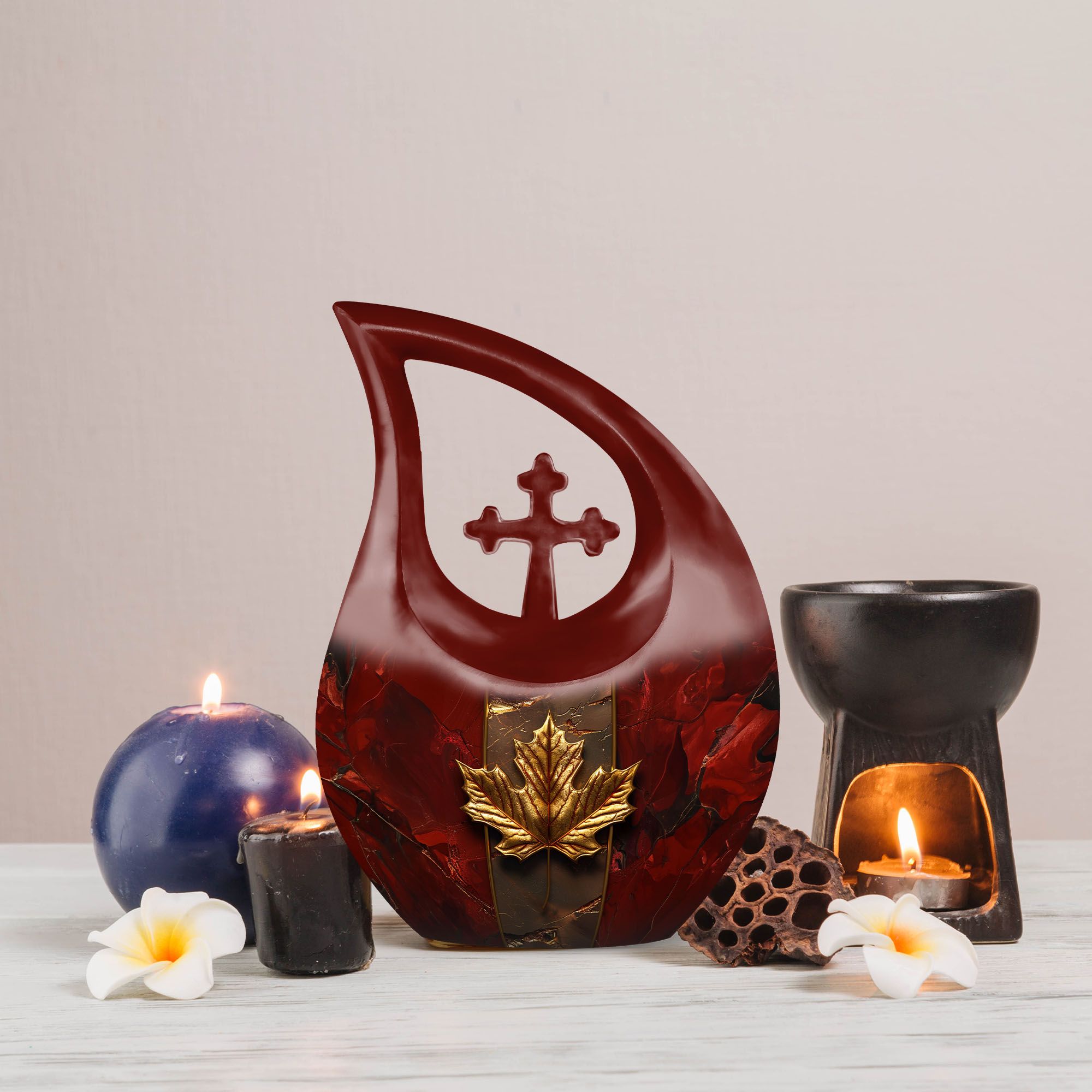 Comfort, strength, and hope embody this magnificent Mapple Leaf Urn. Standing stately at 10 inches and weighing 3.3 pounds, this large urn provides a serene resting place for your loved one's remains. Coinsuring an impressive capacity of 200 cubic inches, it is meticulously crafted from robust aluminium that ensures longevity. The cross drop urn design embodies the solidity of faith, portraying a timeless, spiritual touch. With the package, you will receive a gentle velvet pouch, providing a dignified containment for ashes. Adding a personal sentiment, this memorial urn accommodates customization; now, you can engrave names to memorialize your precious loved one. Whether looking for memorial urns, or exploring keywords like 'garden urn', 'keepsake cremation urns', or 'personalized urns for human ashes', this Mapple Leaf Urn stands out as a unique blend of divine significance and earthy resonance. Cast in the tranquility of memory and the warmth of the Mapple Leaf theme, curated for your remembrance.