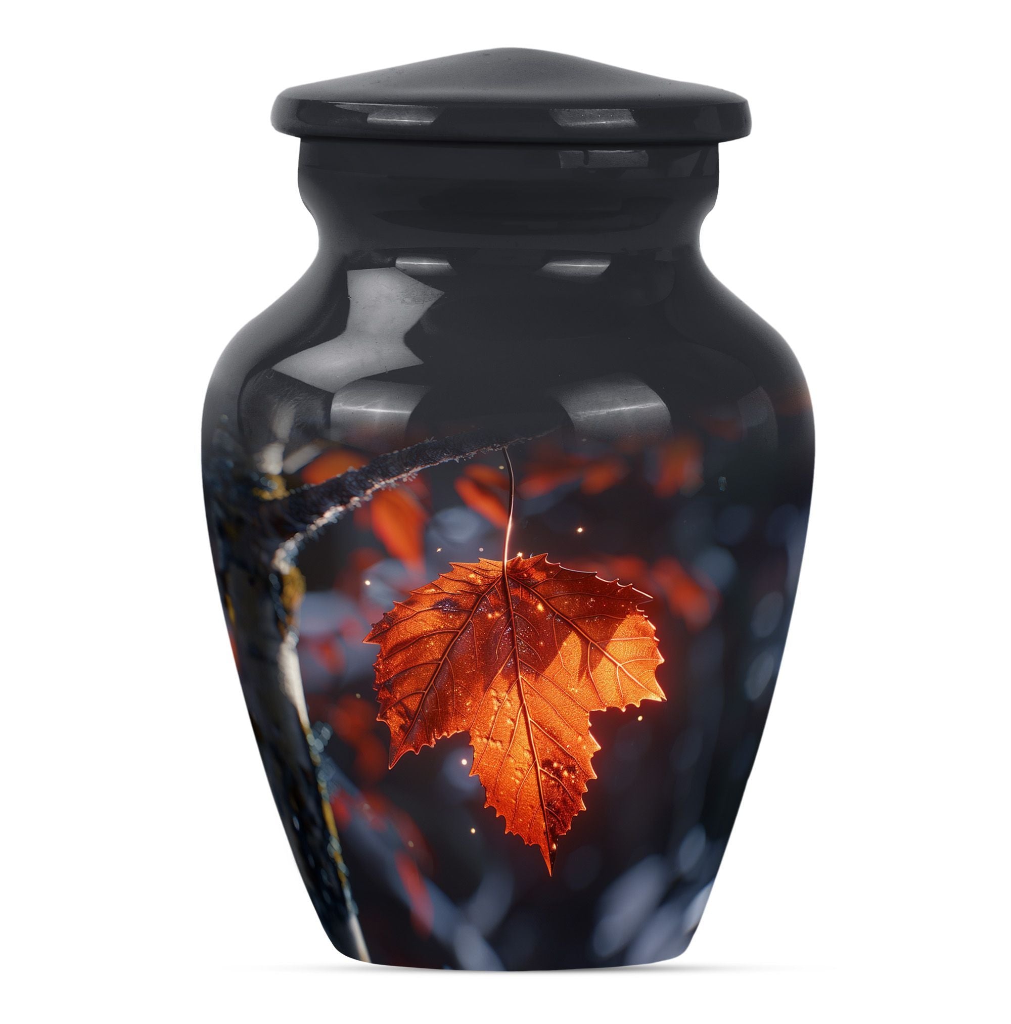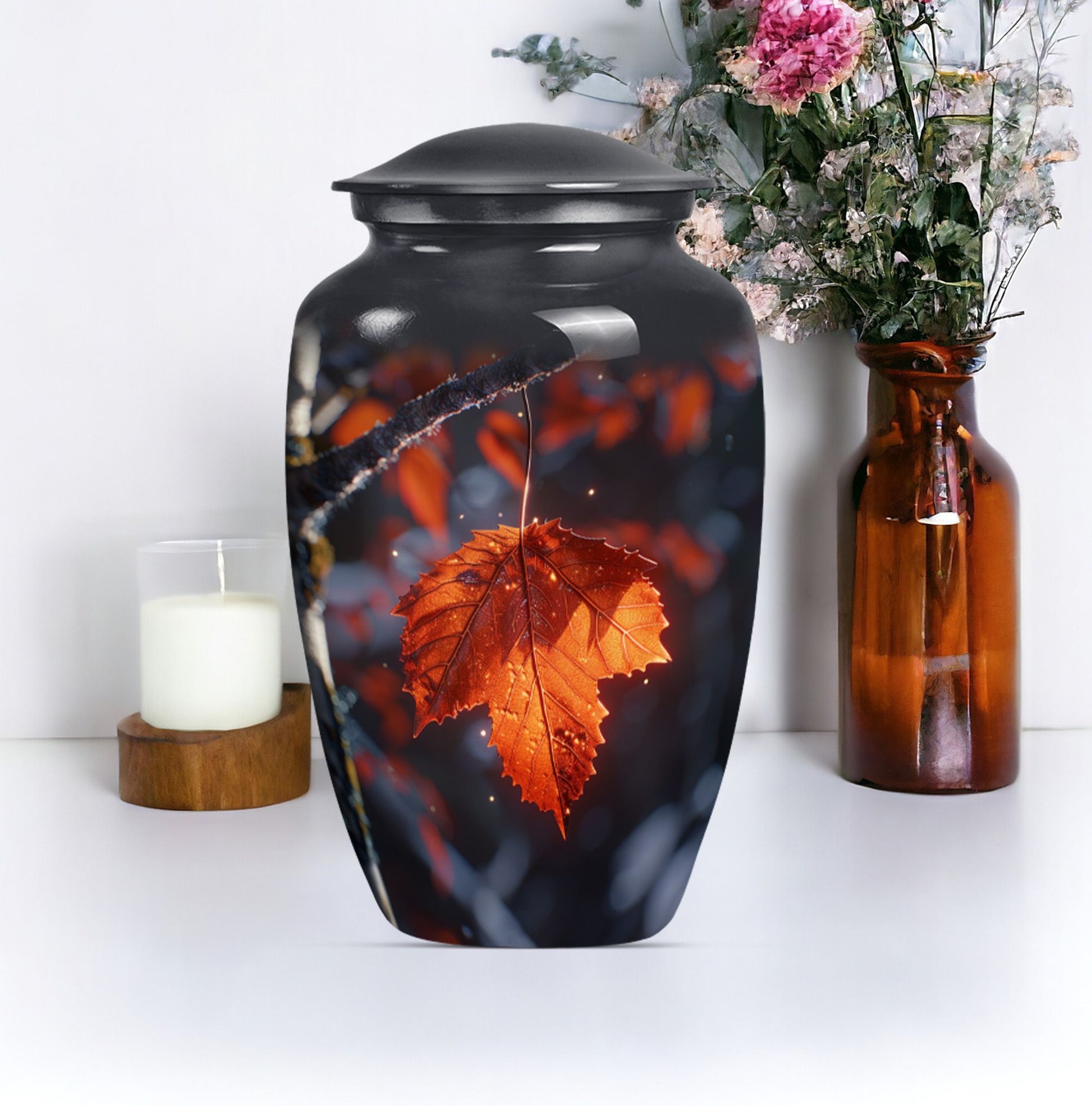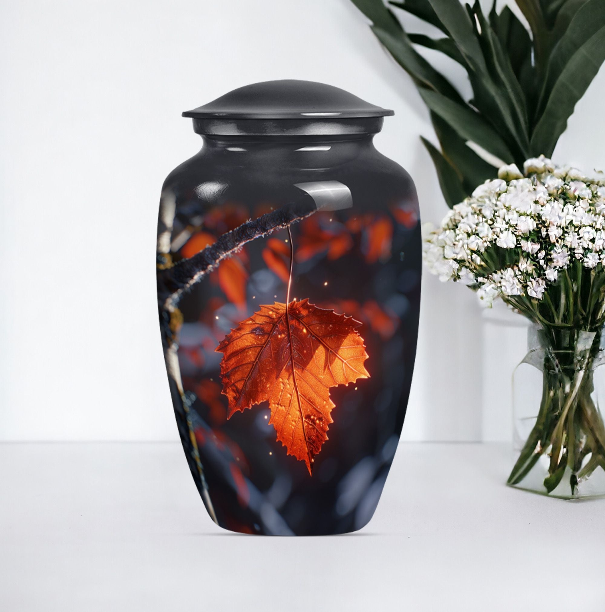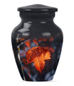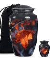 Experience the serene beauty of our 'Mapple Leaf Urn', a wonderful homage to your loved ones. This substantial, large urn, standing at 10 inches and weighing 3.3 pounds, offers a sizable capacity of 200 cubic inches, sufficient to hold funeral ashes securely. The type, explicitly designed as a cremation urn for men, combines the strength of Aluminium with the elegance of a classic urn silhouette and a delicate flower theme. Every urn we send you comes with a velvet pouch, ensuring dignified containment of ashes. To make this tribute truly unique, it also offers customization; you have the option to personalize it with engraved names. Our product reinforces remembrance, effortlessly blending into the category of 'Memorial Urns', making it a suitable pick for those searching for 'Funeral Ashes Urns' or 'Large Cremation Urns for Men'. Note that despite bearing the hallmarks of classic design, the terminology and phrasing used are distinct, making this product description stand out in its category.