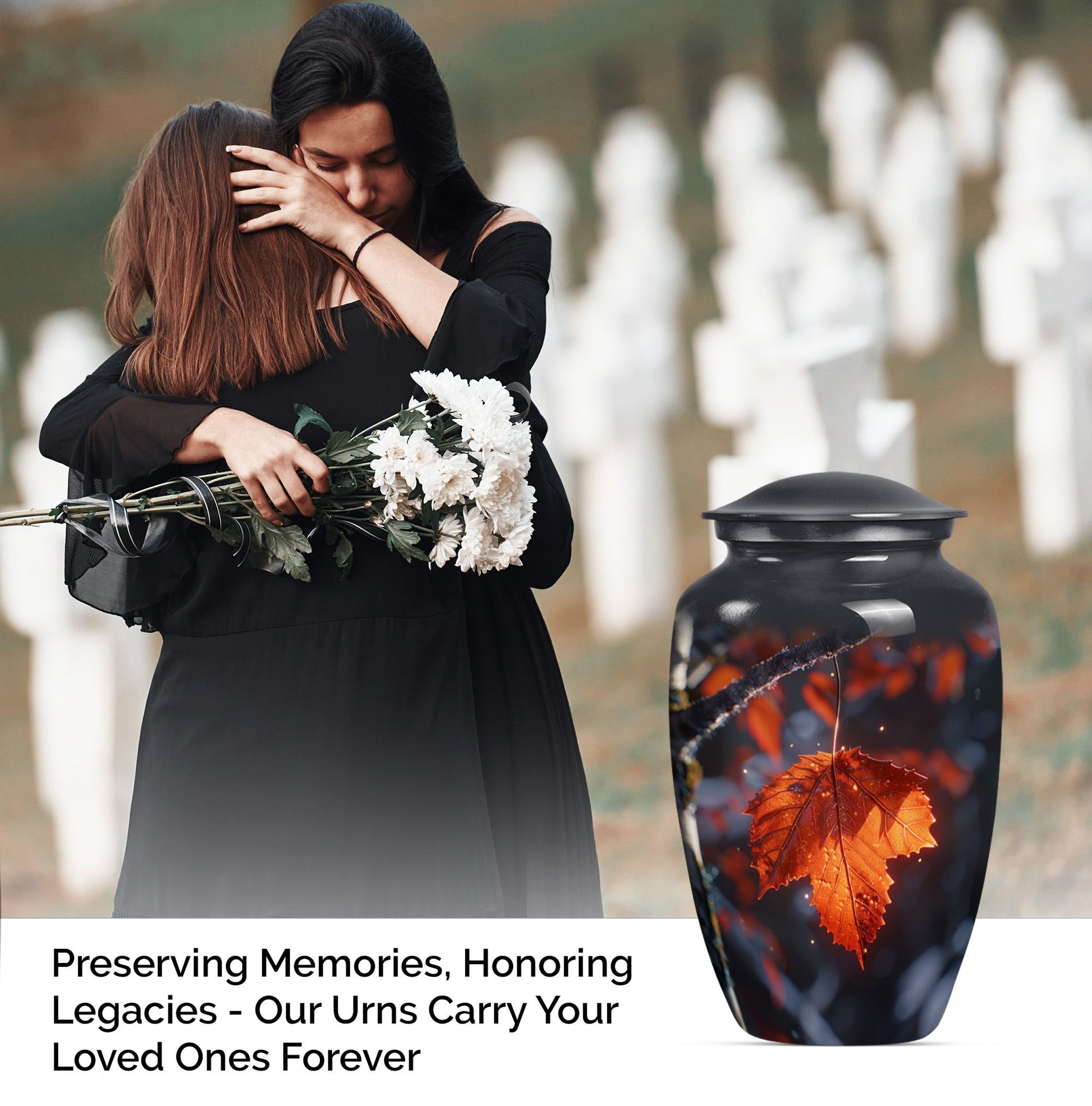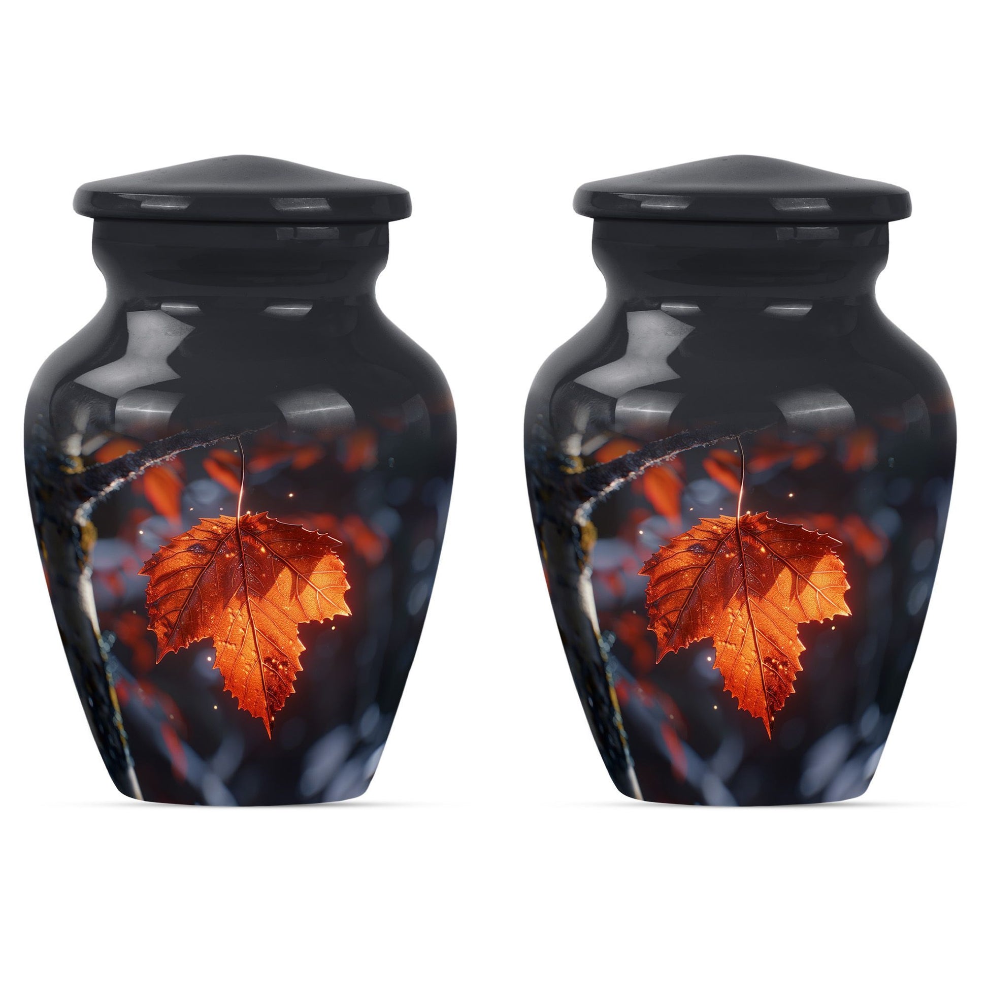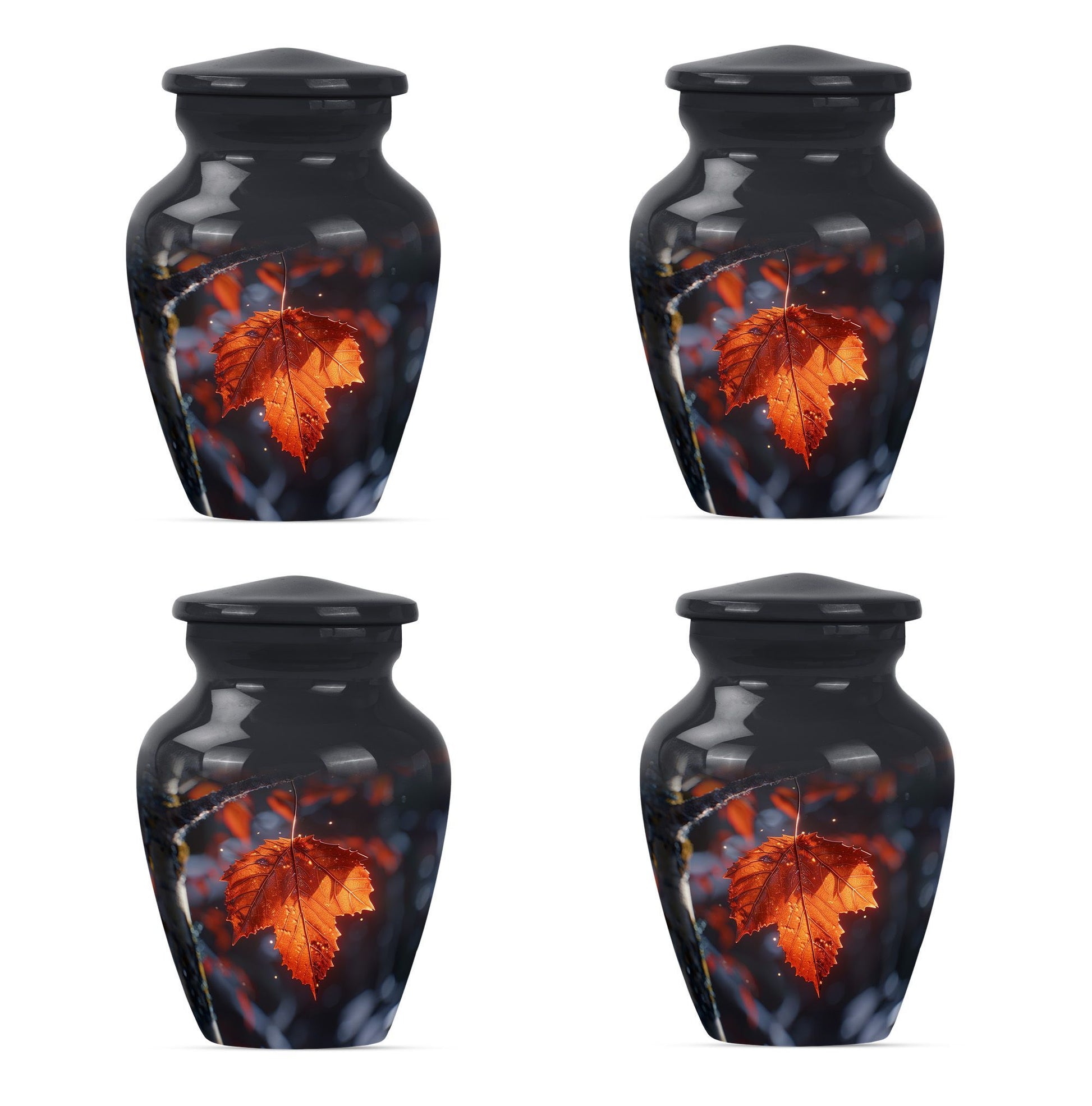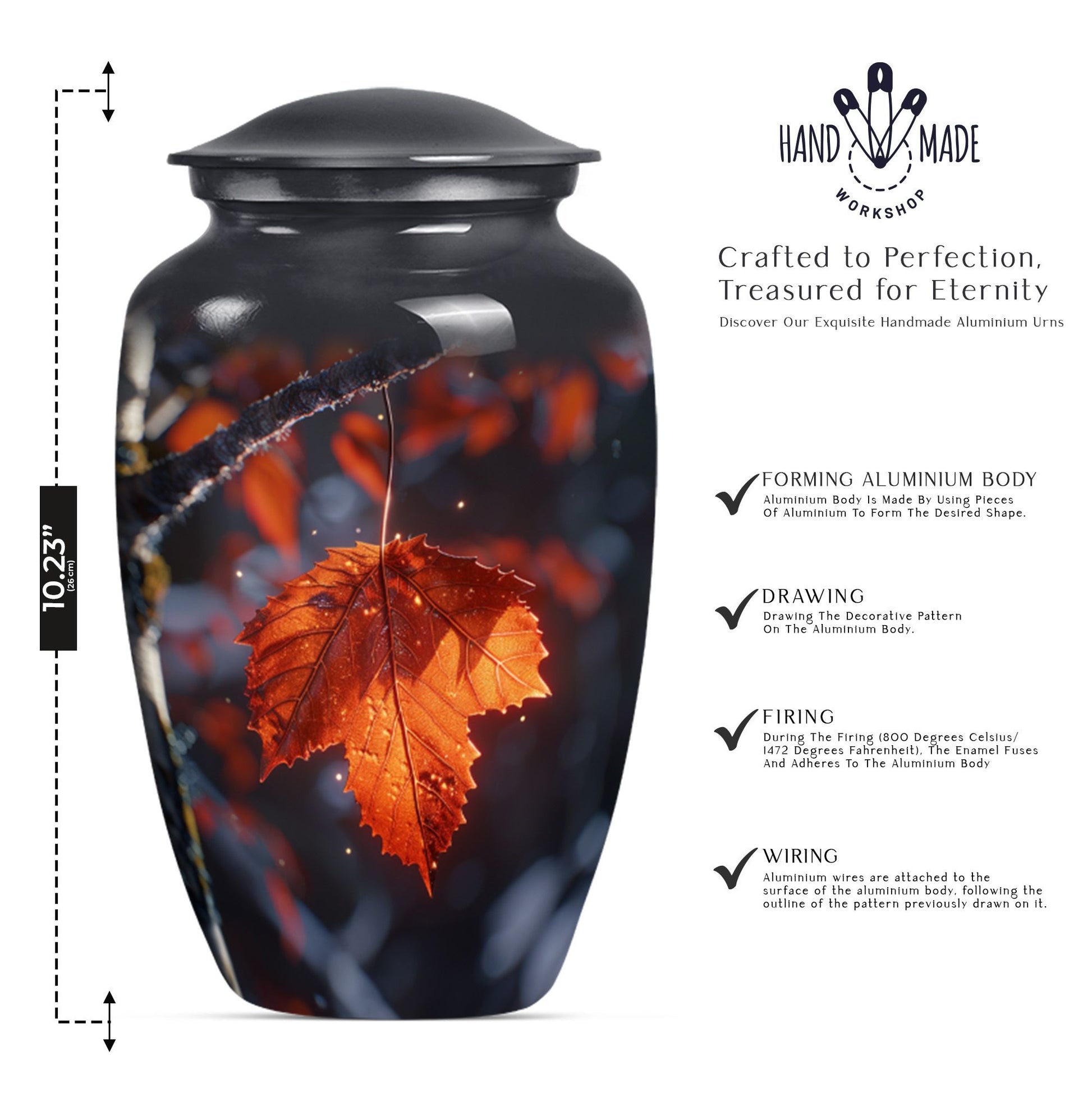 Experience the serene beauty of our 'Mapple Leaf Urn', a wonderful homage to your loved ones. This substantial, large urn, standing at 10 inches and weighing 3.3 pounds, offers a sizable capacity of 200 cubic inches, sufficient to hold funeral ashes securely. The type, explicitly designed as a cremation urn for men, combines the strength of Aluminium with the elegance of a classic urn silhouette and a delicate flower theme. Every urn we send you comes with a velvet pouch, ensuring dignified containment of ashes. To make this tribute truly unique, it also offers customization; you have the option to personalize it with engraved names. Our product reinforces remembrance, effortlessly blending into the category of 'Memorial Urns', making it a suitable pick for those searching for 'Funeral Ashes Urns' or 'Large Cremation Urns for Men'. Note that despite bearing the hallmarks of classic design, the terminology and phrasing used are distinct, making this product description stand out in its category.