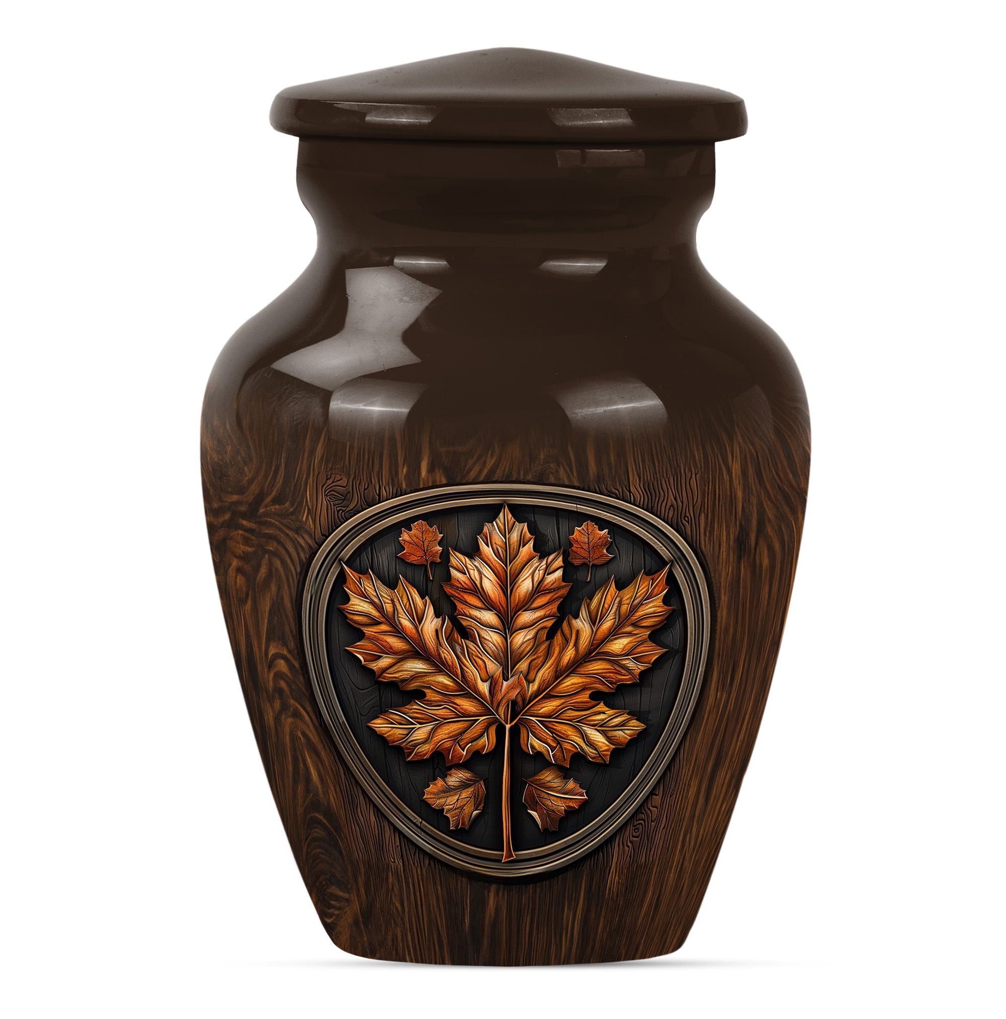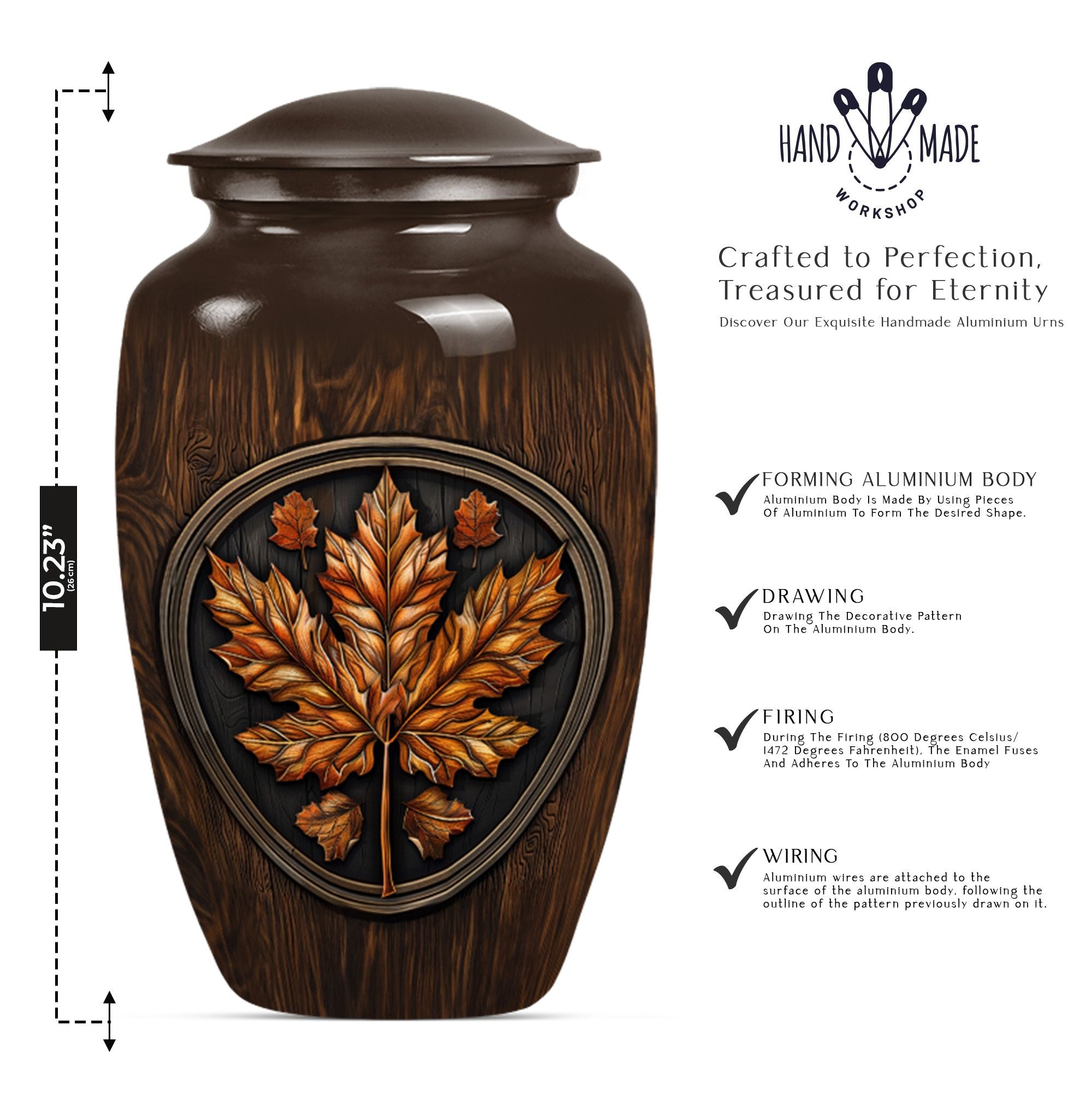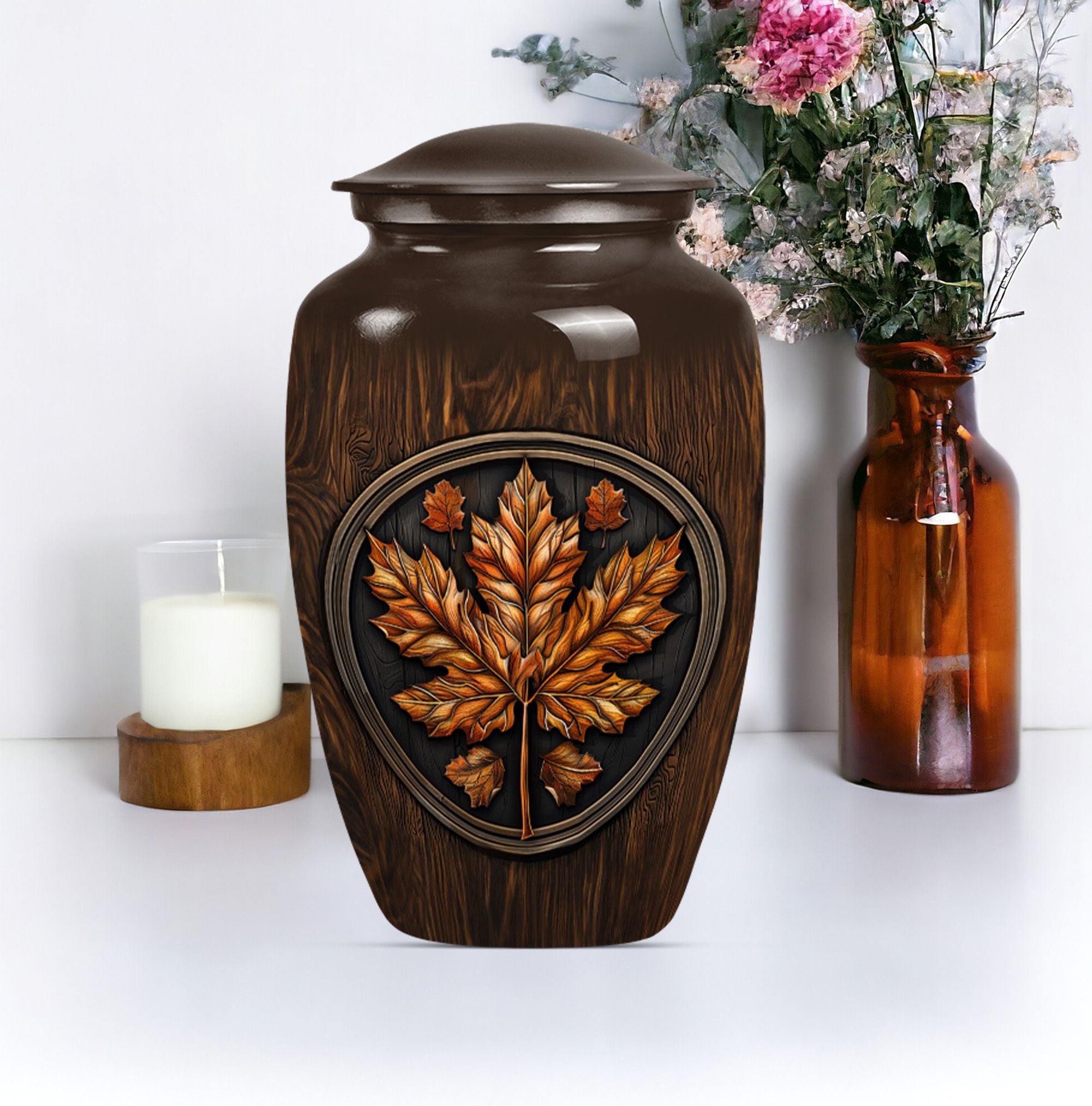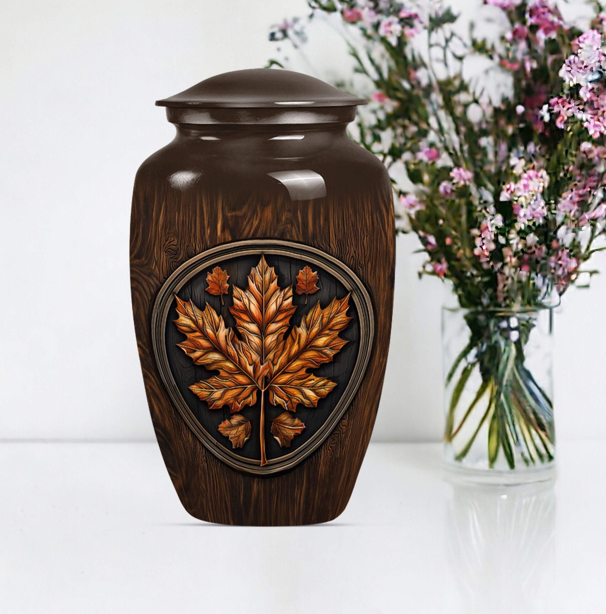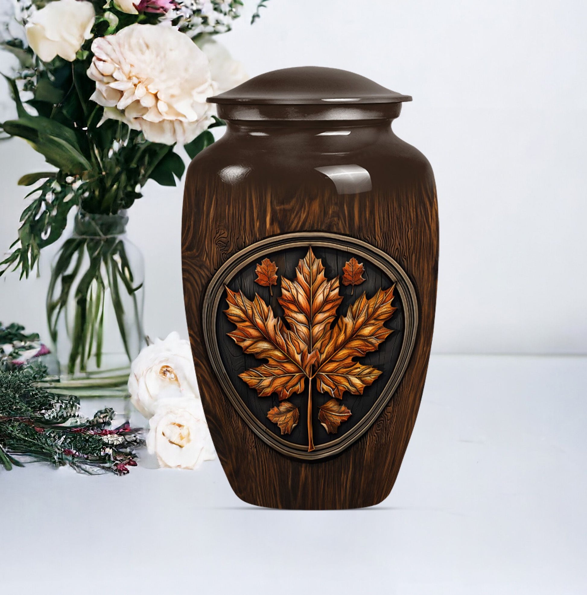 Make an affectionate tribute to your departed loved ones with our 10-inch Classic Urn. Reminiscent of the majestic mapple leaf, this funeral urn for men ashes is thoughtfully designed from high-quality aluminium, ensuring long-lasting durability. This large urn carries a weight of 3.3 pounds with a hold capacity of 200 cubic inches, suitable for preserving the ashes of your dear departed. This urn embodies the floral theme in an elegant manner, subtly reflecting the echoes of life's beauty. In addition, this funeral urn comes with a velvet pouch, providing a graceful vessel for containing the precious memories of your loved ones. What sets this urn apart, is the opportunity for customization - a personalized touch with engraved names, providing a unique memorization. Our memorial urns not only serve as adult urns for ashes but also elevate as decorative human ashes urns, adding a meaningful aesthetic to your interiors. In your time of grief, find solace in our urns, a tribute reflecting eternal respect and love for your departed.