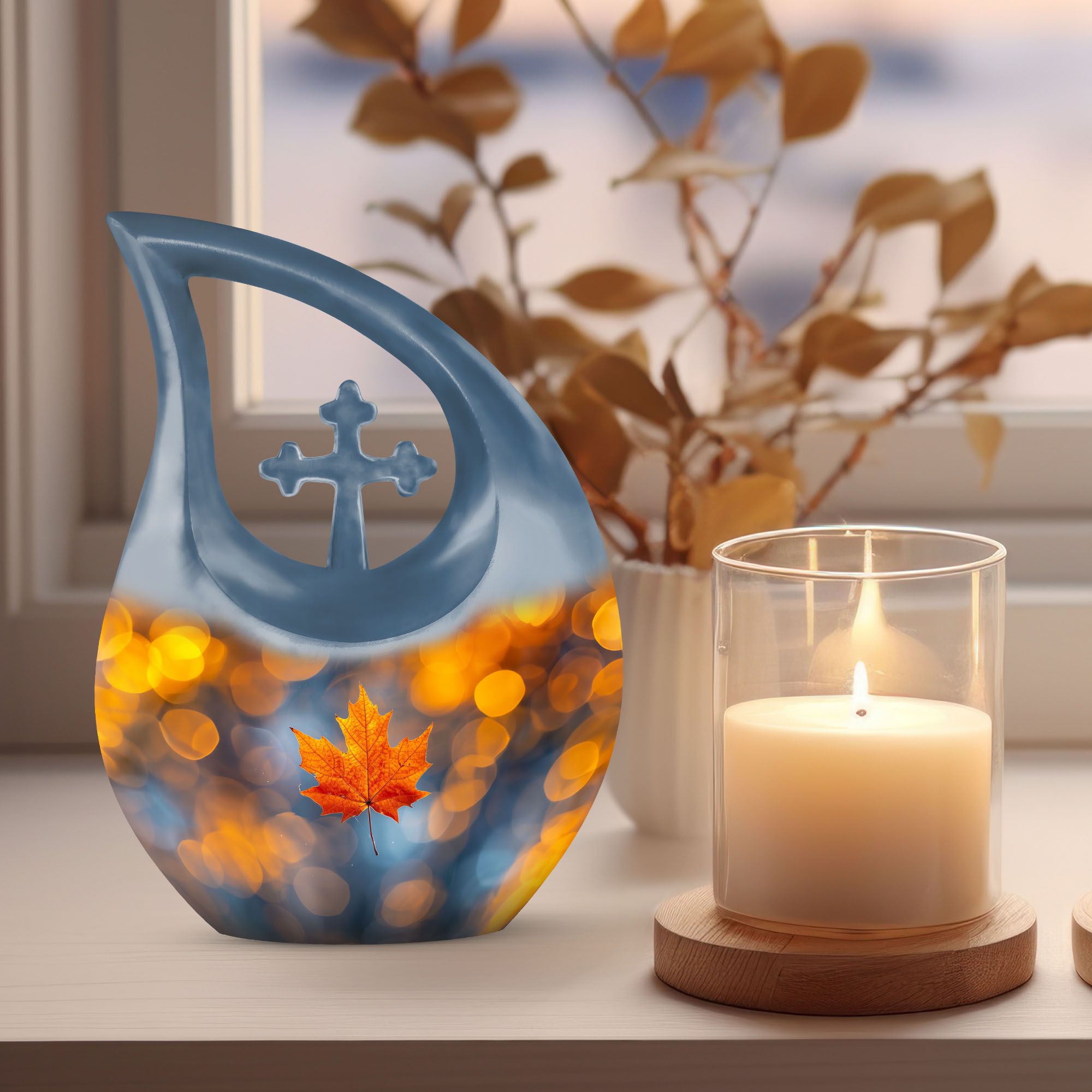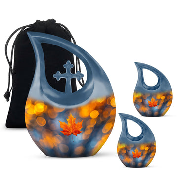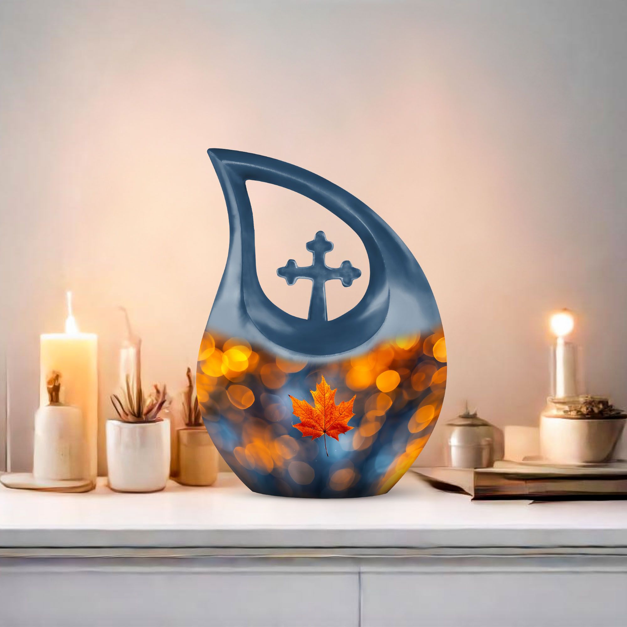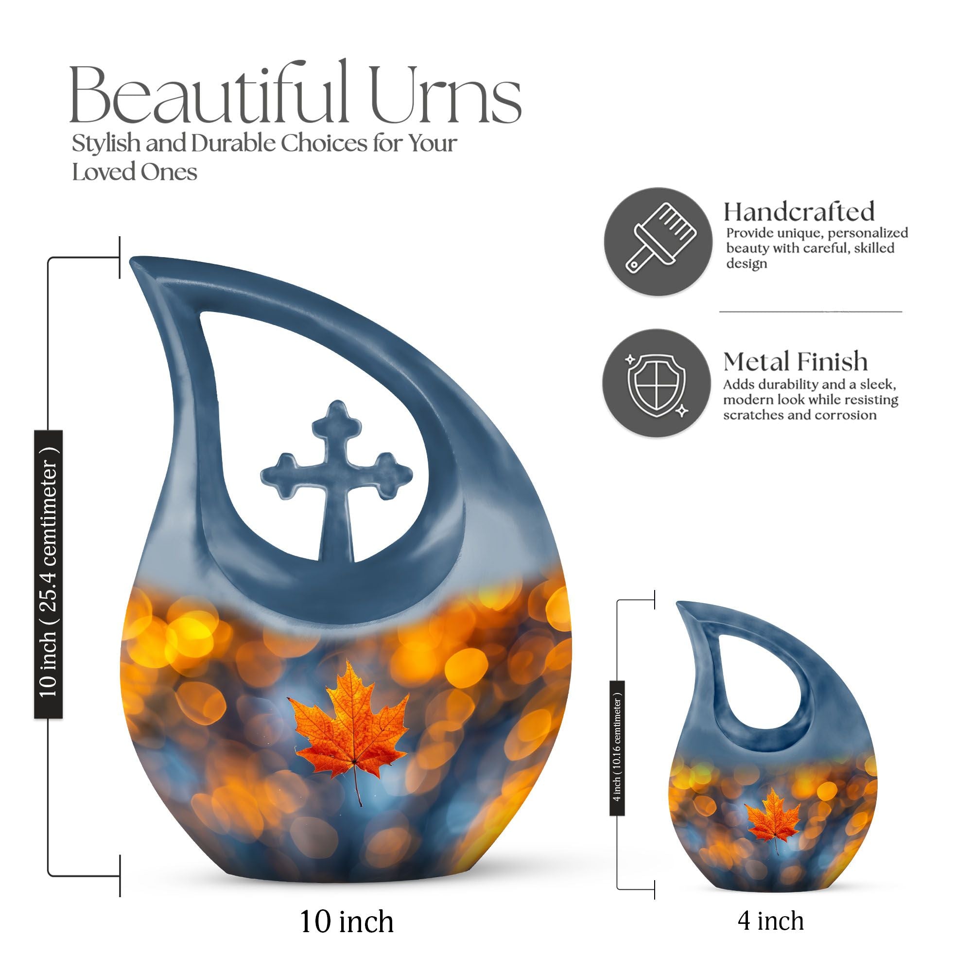 Elevate your memorial tribute with our uniquely crafted 'Mapple Leaf Urn'; a special emblem of eternal rest. Shaped from durable aluminium and standing at a substantial 10 inches in height, this large urn effortlessly combines functionality with aesthetic beauty. Weighing only 3.3 pounds, it's light enough to be easily moved yet strong enough to store up to 200 cubic inches of ashes securely. The 'Cross Drop' motif adds a heavenly touch to this Modern Urn for Ashes. It comes with a velvet pouch, perfect for the containment and protection of ashes. For a heartfelt and unique memento, customize your urn, engraving names on it to forever immortalize your loved ones. This urn is not only a resting place but a symbol of love and remembrance, ideal for those seeking Memorial Urns or Burial Urns for Human Ashes. It's also a thoughtful gift as an Urn For Mom or Urns For Angels. Enshrine your loved one's memory in this exquisite Mapple Leaf Urn.