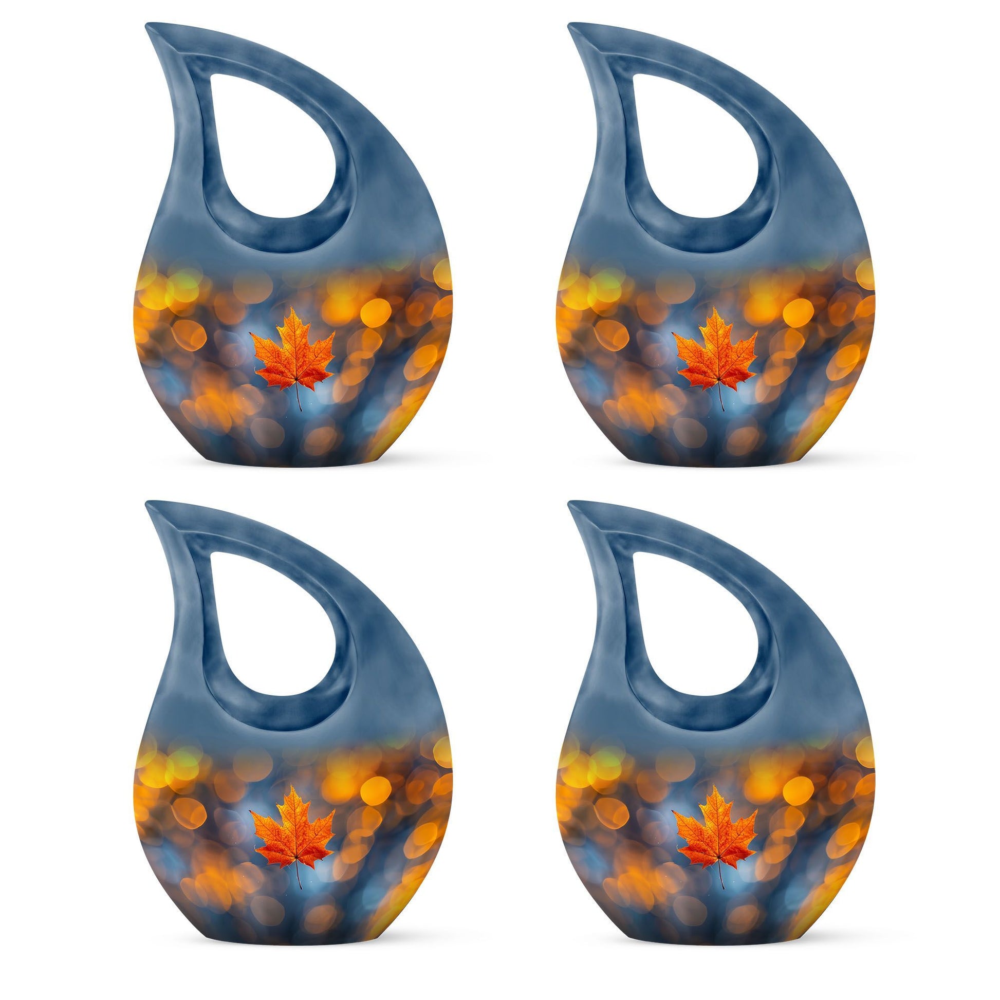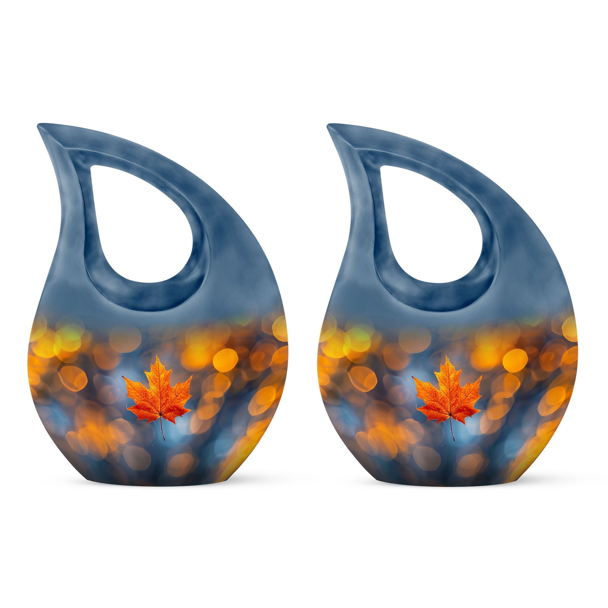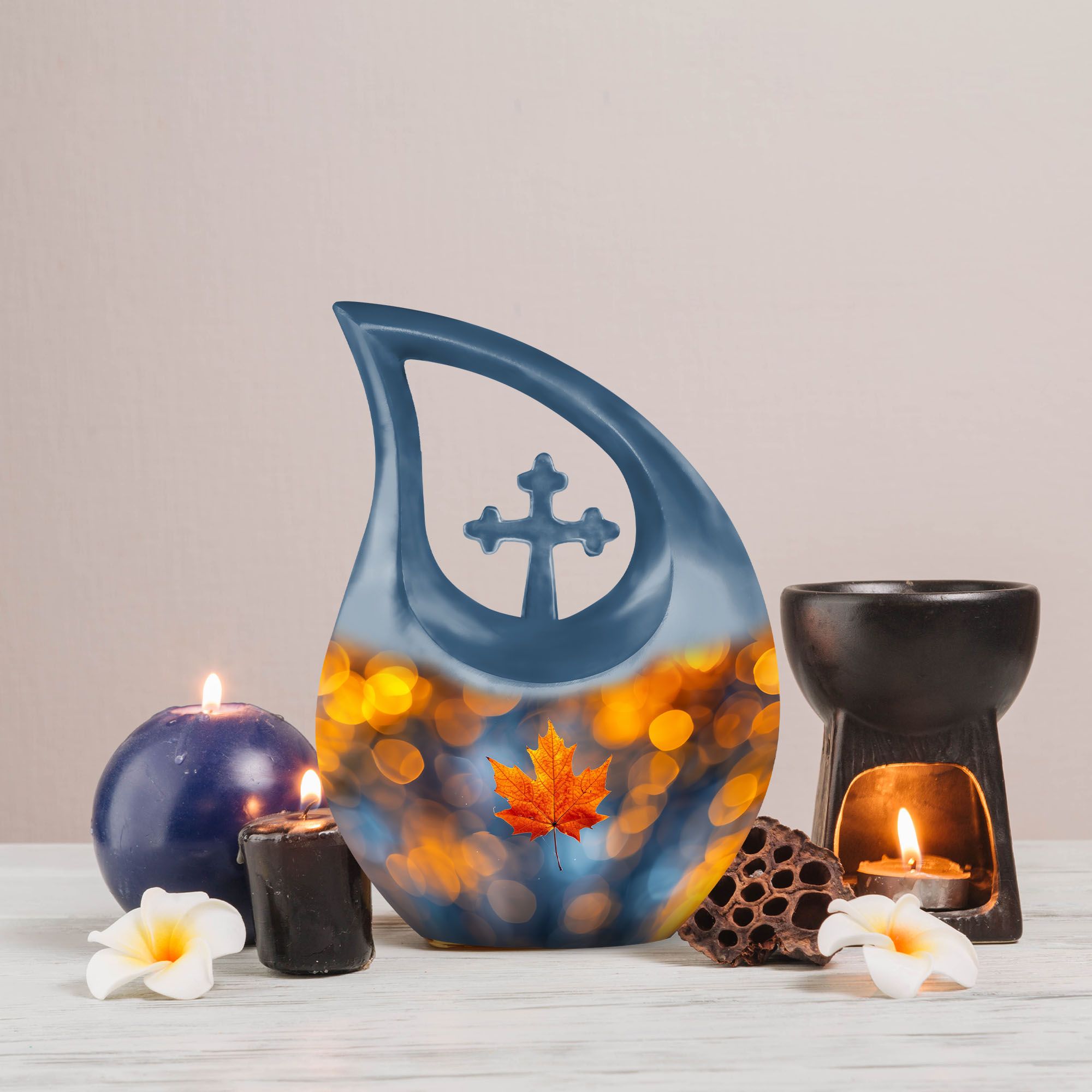 Elevate your memorial tribute with our uniquely crafted 'Mapple Leaf Urn'; a special emblem of eternal rest. Shaped from durable aluminium and standing at a substantial 10 inches in height, this large urn effortlessly combines functionality with aesthetic beauty. Weighing only 3.3 pounds, it's light enough to be easily moved yet strong enough to store up to 200 cubic inches of ashes securely. The 'Cross Drop' motif adds a heavenly touch to this Modern Urn for Ashes. It comes with a velvet pouch, perfect for the containment and protection of ashes. For a heartfelt and unique memento, customize your urn, engraving names on it to forever immortalize your loved ones. This urn is not only a resting place but a symbol of love and remembrance, ideal for those seeking Memorial Urns or Burial Urns for Human Ashes. It's also a thoughtful gift as an Urn For Mom or Urns For Angels. Enshrine your loved one's memory in this exquisite Mapple Leaf Urn.