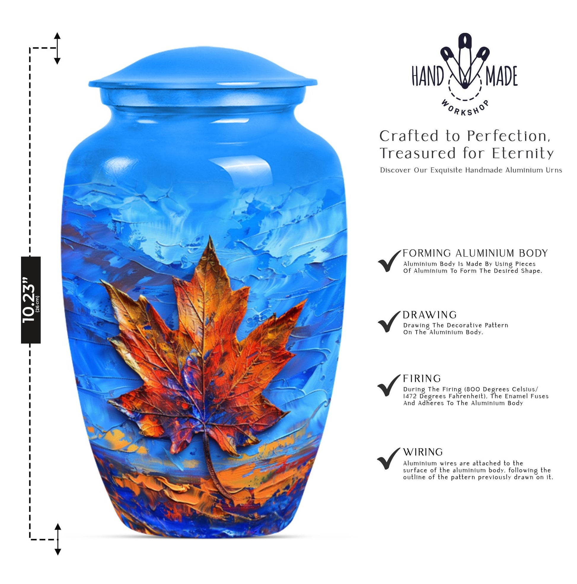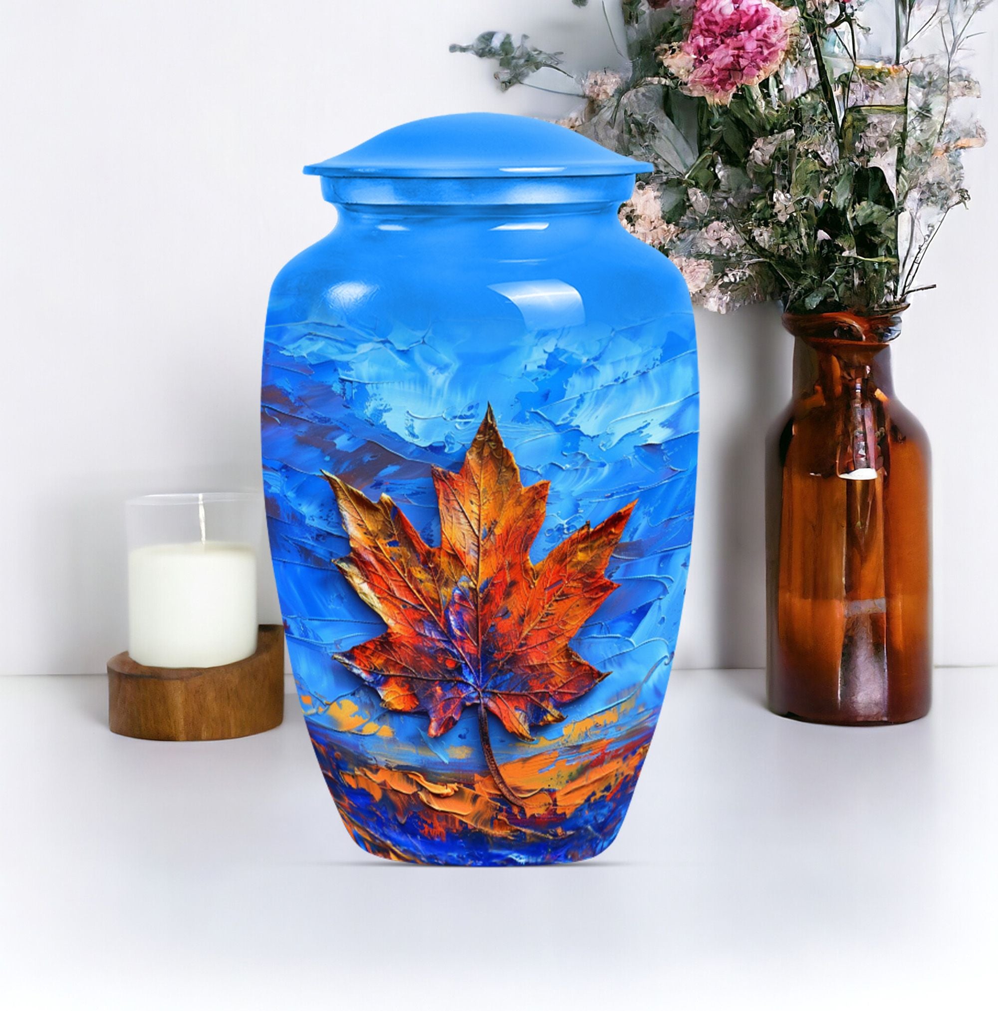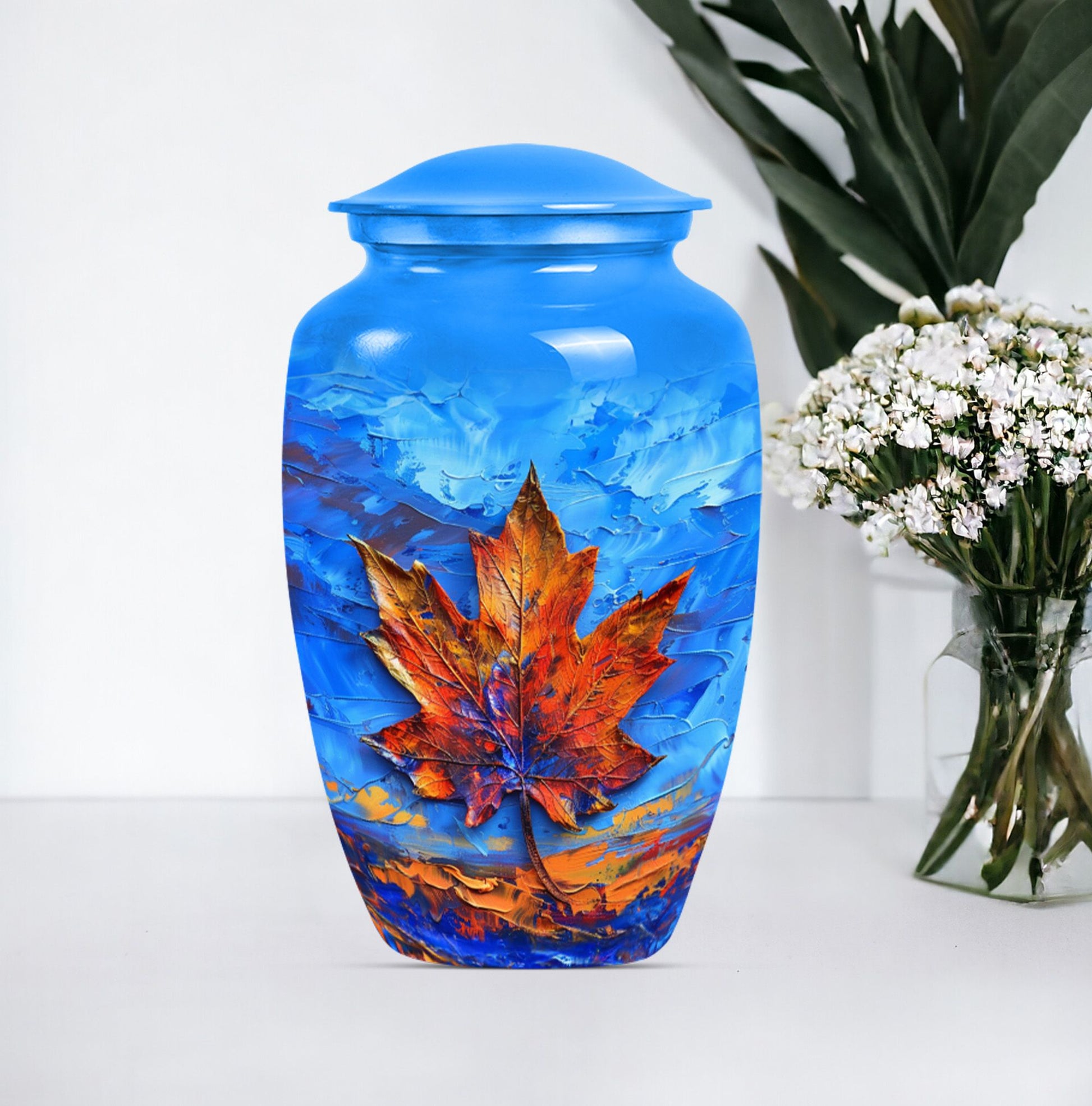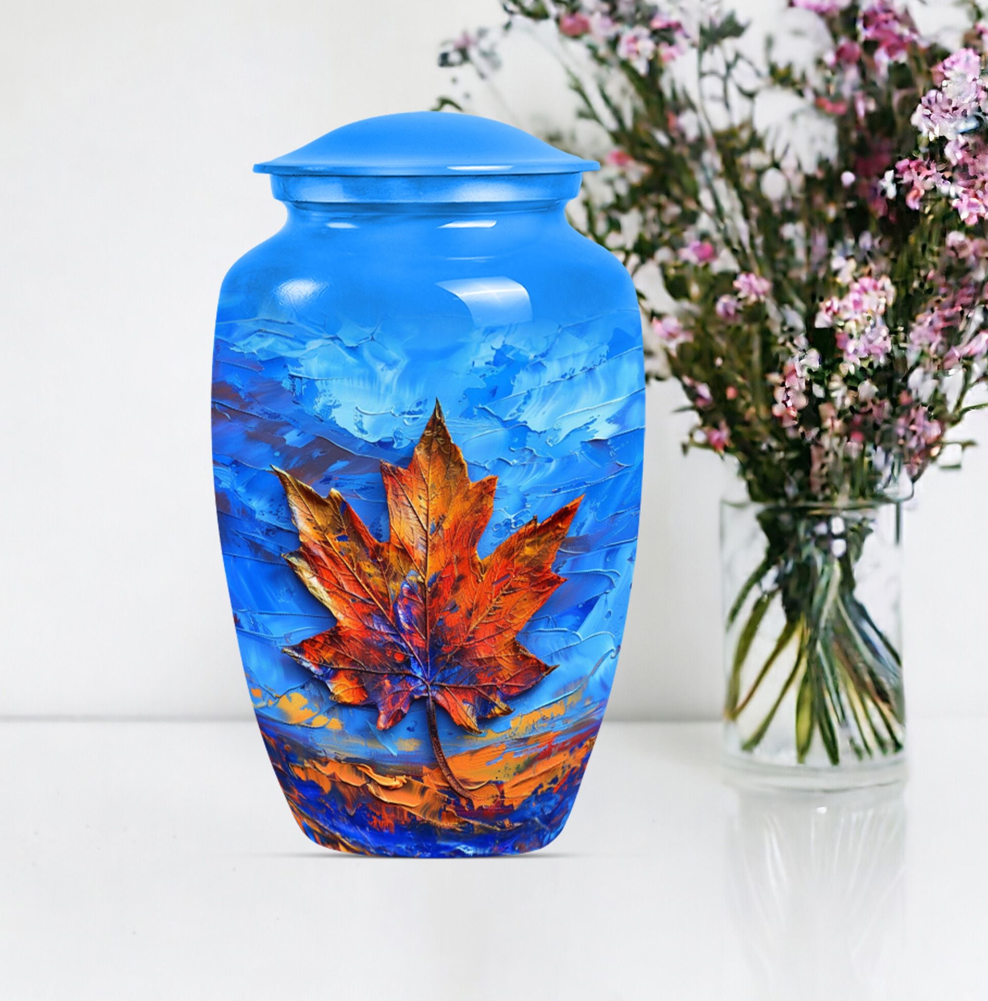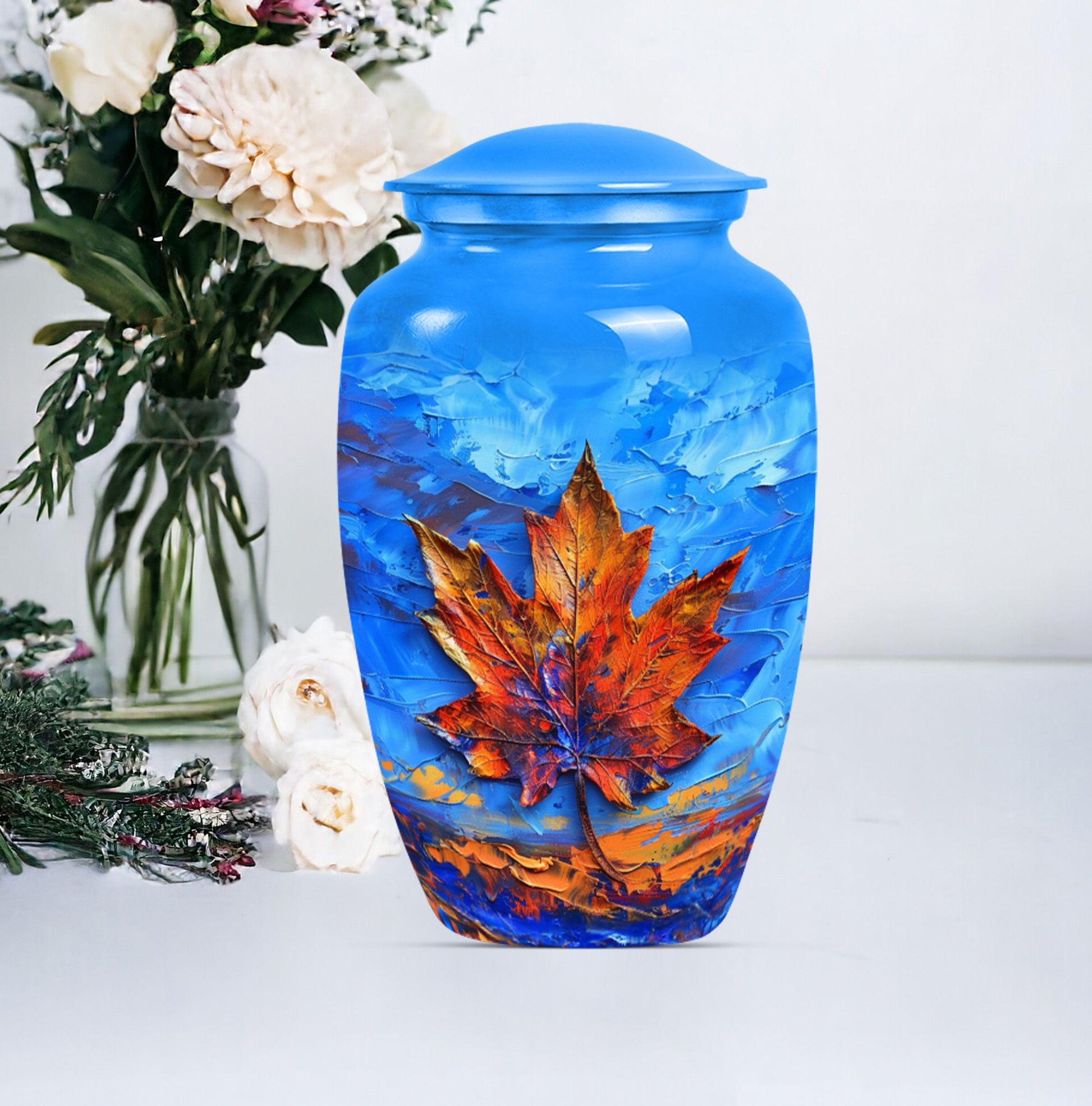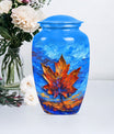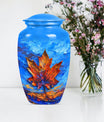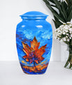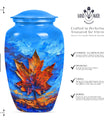 Express your love and memory with our profound 'Maple leaf Urn', a unique choice in memorial urns. This large-sized urn, standing at an imposing 10 inches in height and accommodating an impressive 200 cubic inches, is just the right item for a dignified, lasting remembrance. Crafted meticulously from high-grade aluminium, the urn weighs in at 3.3 pounds, symbolizing the weight and importance of the memories it holds. Functionality meets aesthetics as the urn comes with a theme of exquisitely designed flowers - a linguistic portrayal of eternal purity and the cycle of life. The package includes a velvet pouch, ensuring secure containment of ashes and the possibility to personalize with engraved names, adding an intimate touch to your tribute. Serving as a fitting memorial for women's ashes, this choice works well for ground burial. Furthermore, constructed with premium aluminium, this urn radiates a sense of permanence, just like your deep-seated love and memories. Perfectly suited for your needs, the search for 'metal urns for human ashes adult female' ends here with our classic urn.