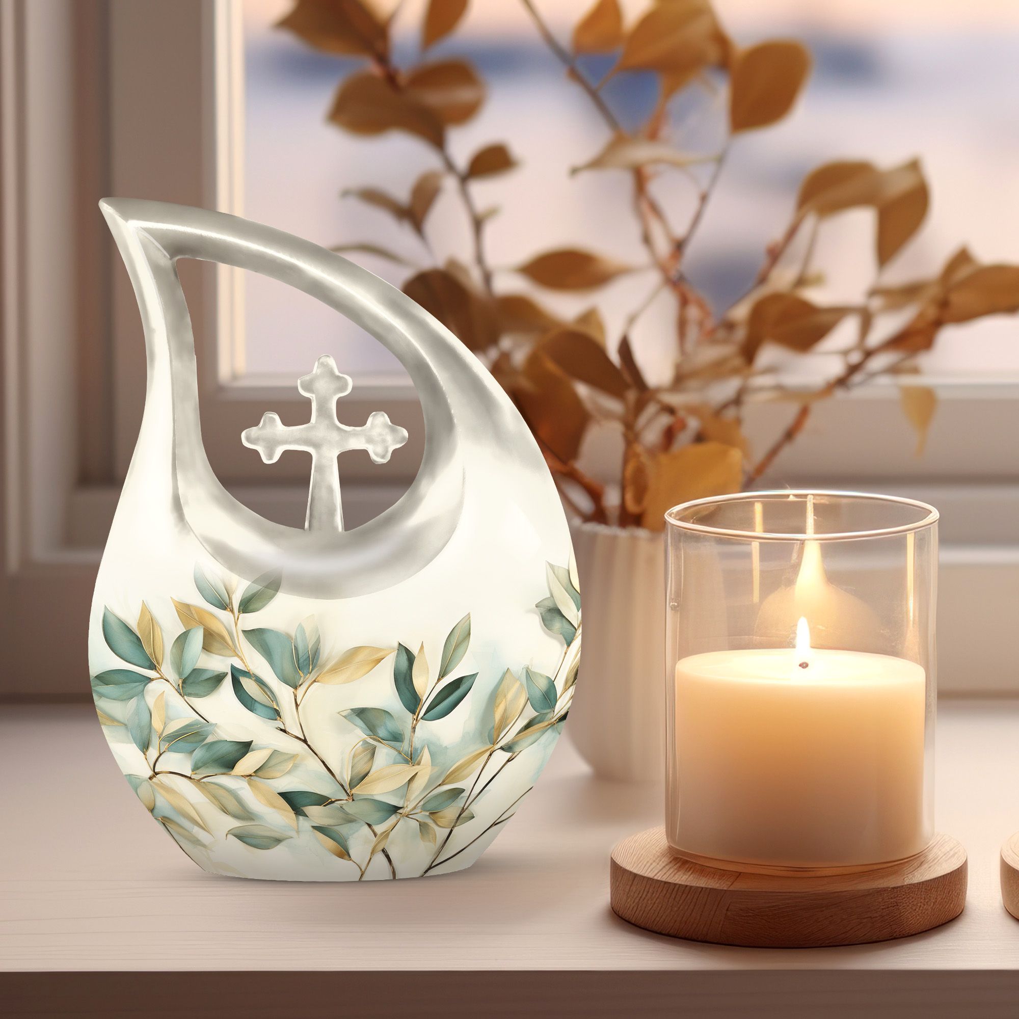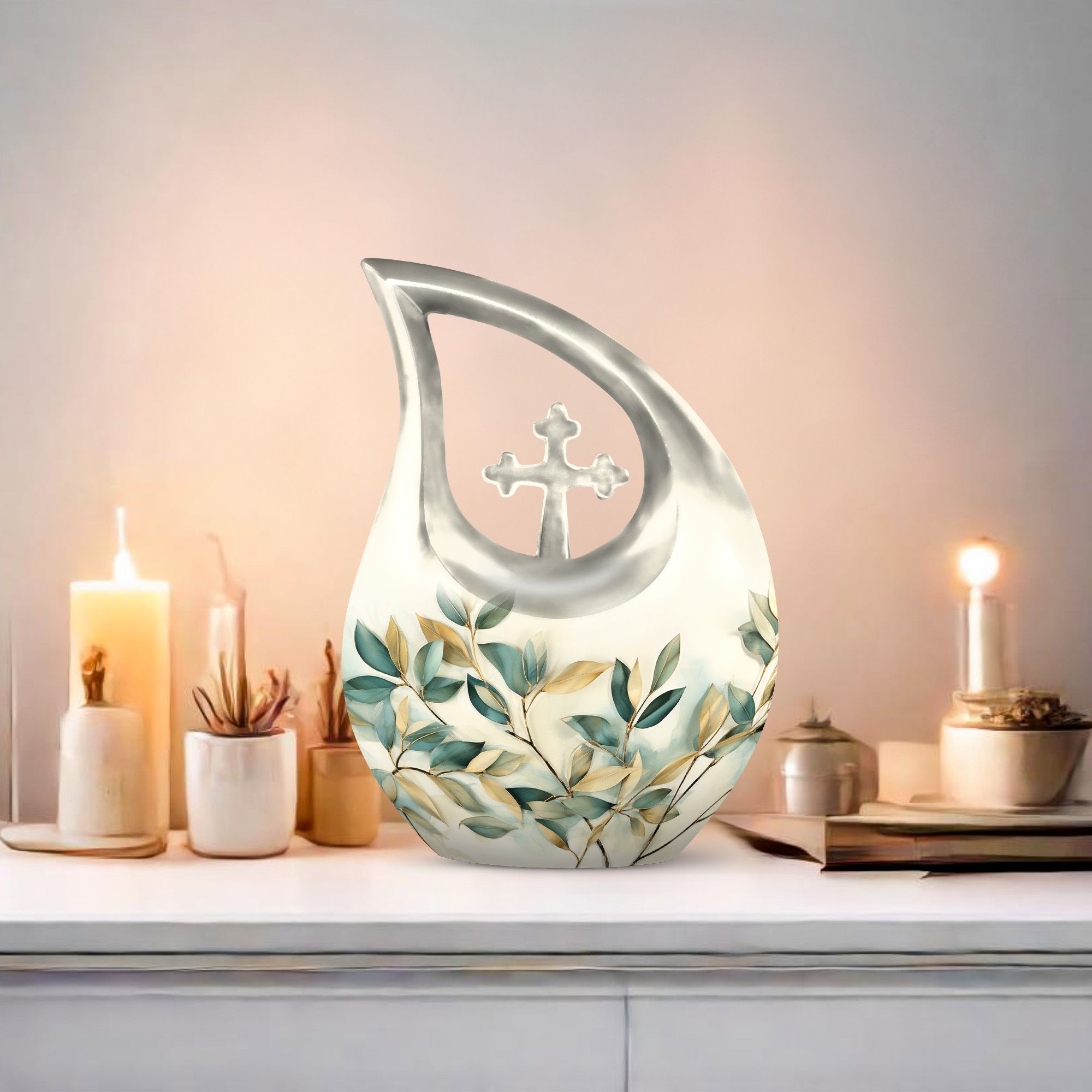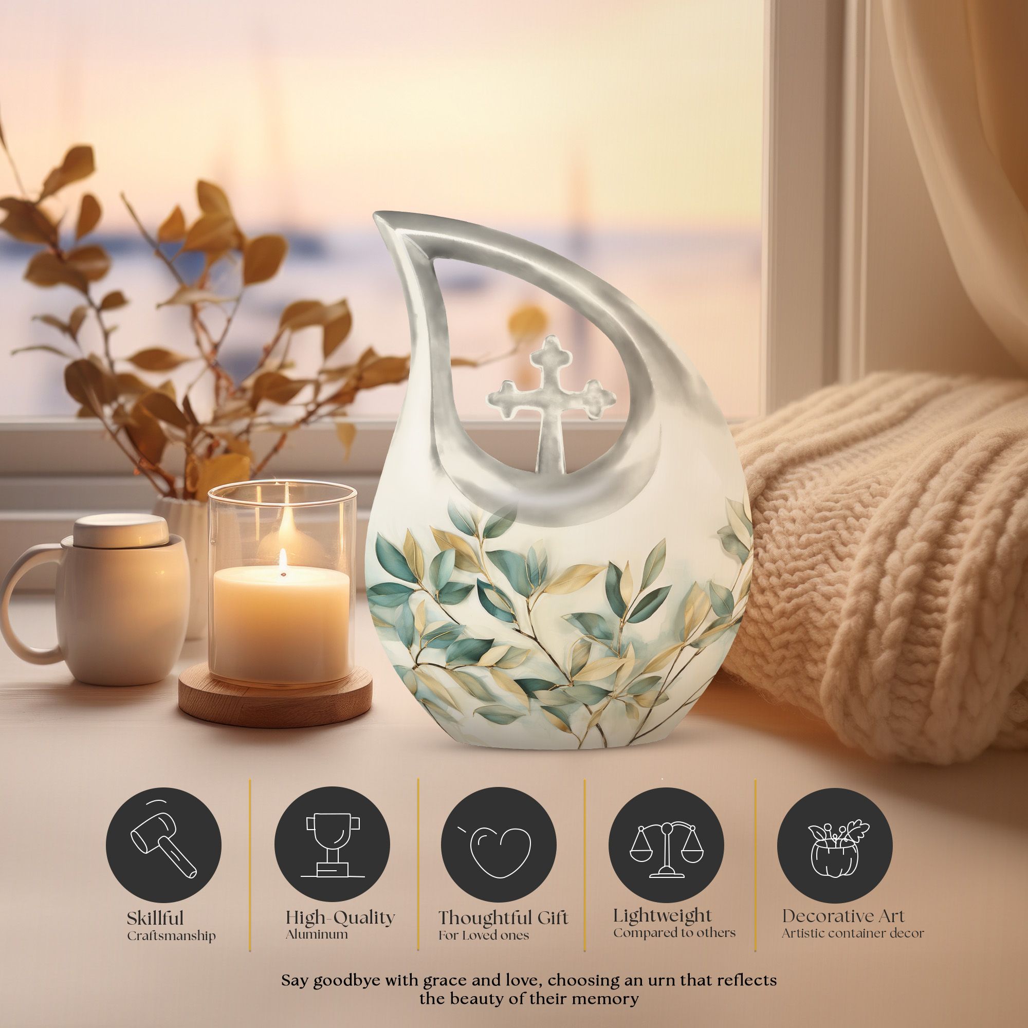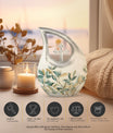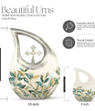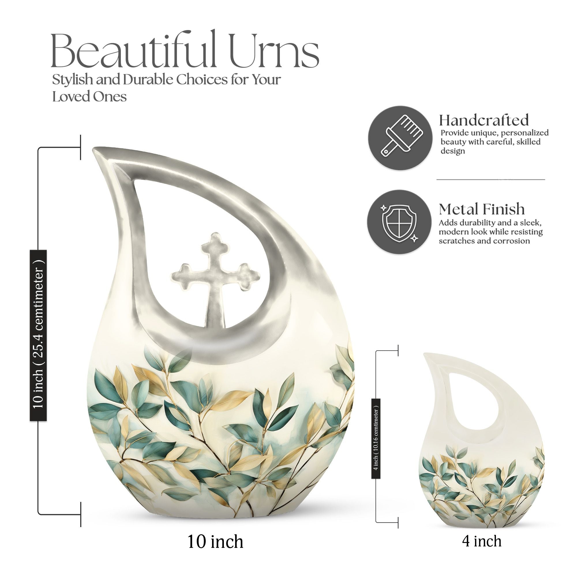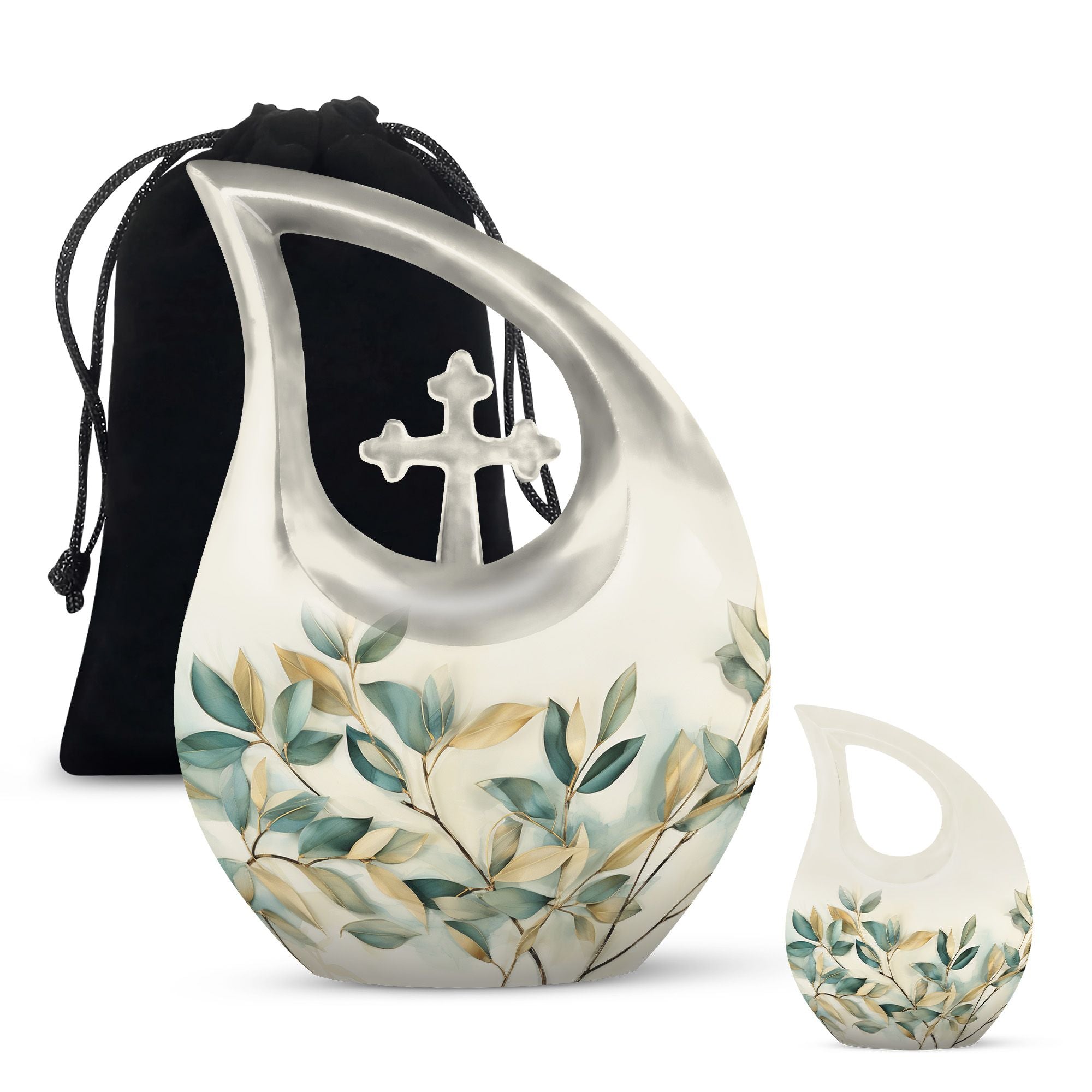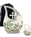 Honor your loved ones and keep their cherished memories alive with our unique Leave Urn. Precisely designed, this dignified 10-inch Medium Urn offers a meaningful way to pay tribute to your beloved. This Large Urn has a distinct Cross Drop illustration that represents serenity and love. Crafted meticulously using high-quality Aluminium, its robust build allows it to last forever as a tribute to your loved one. With a weight of 3.3 pounds and a capacity of 200 cubic inches, it is perfectly sized to safely preserve the ashes. Our Leave Urn arrives with a charming velvet pouch for the containment of ashes, adding a touch of elegance and respect to the preservation. For a more personalized touch, this Medium Urn comes with an option to engrave names. When you think of 'Urns For Ashes Near Me' or 'Best Cremation Urn', remember our unique, dignified and customizable memorial urns.