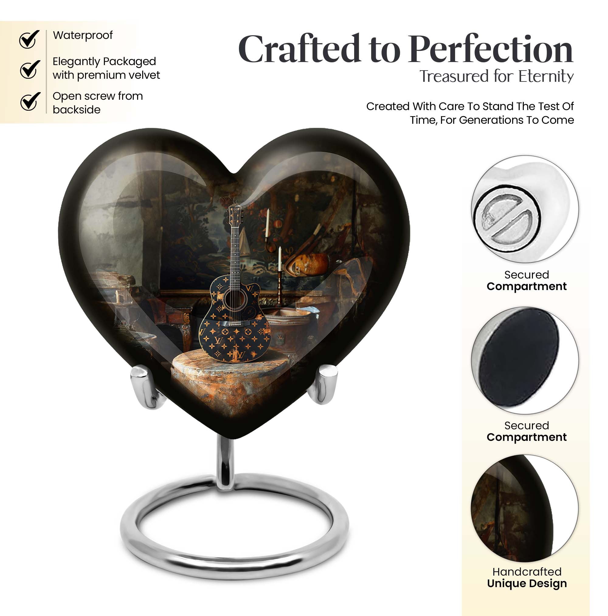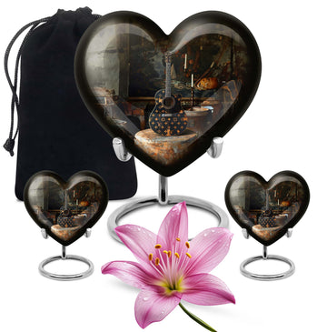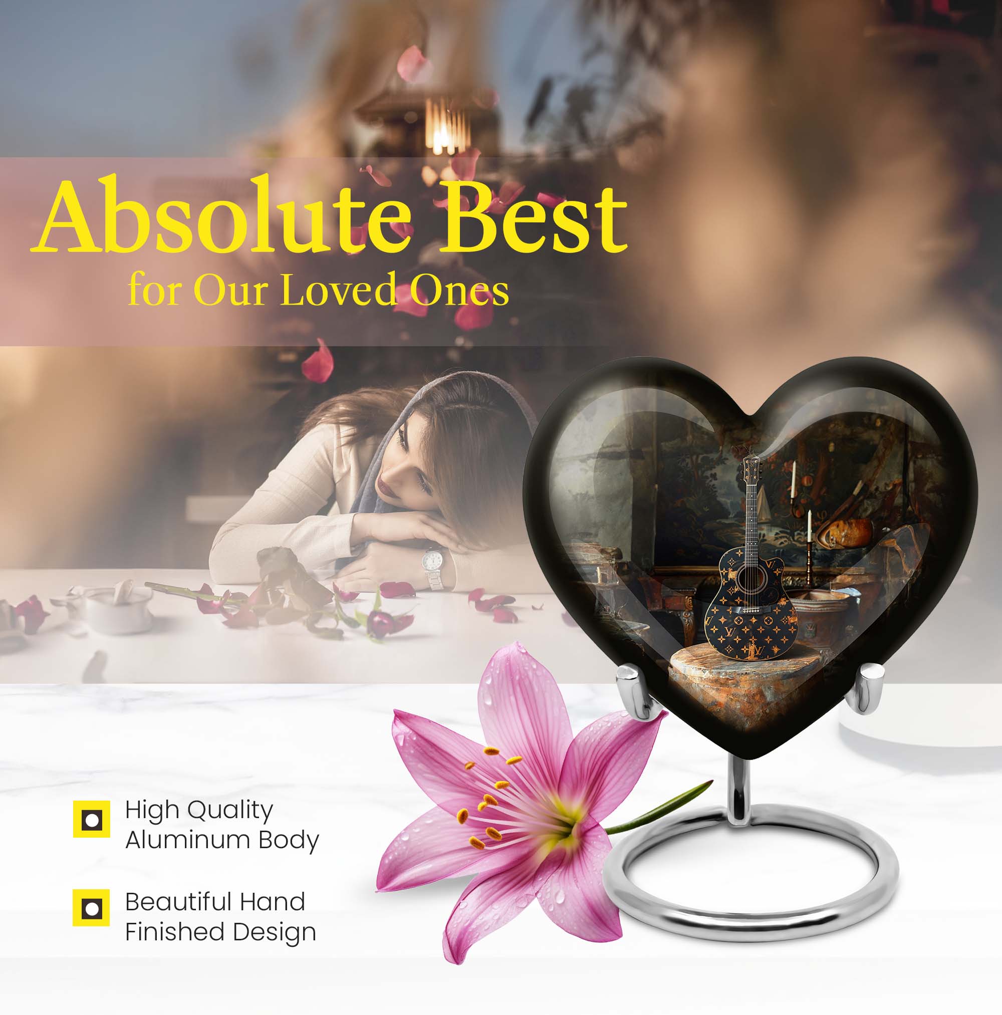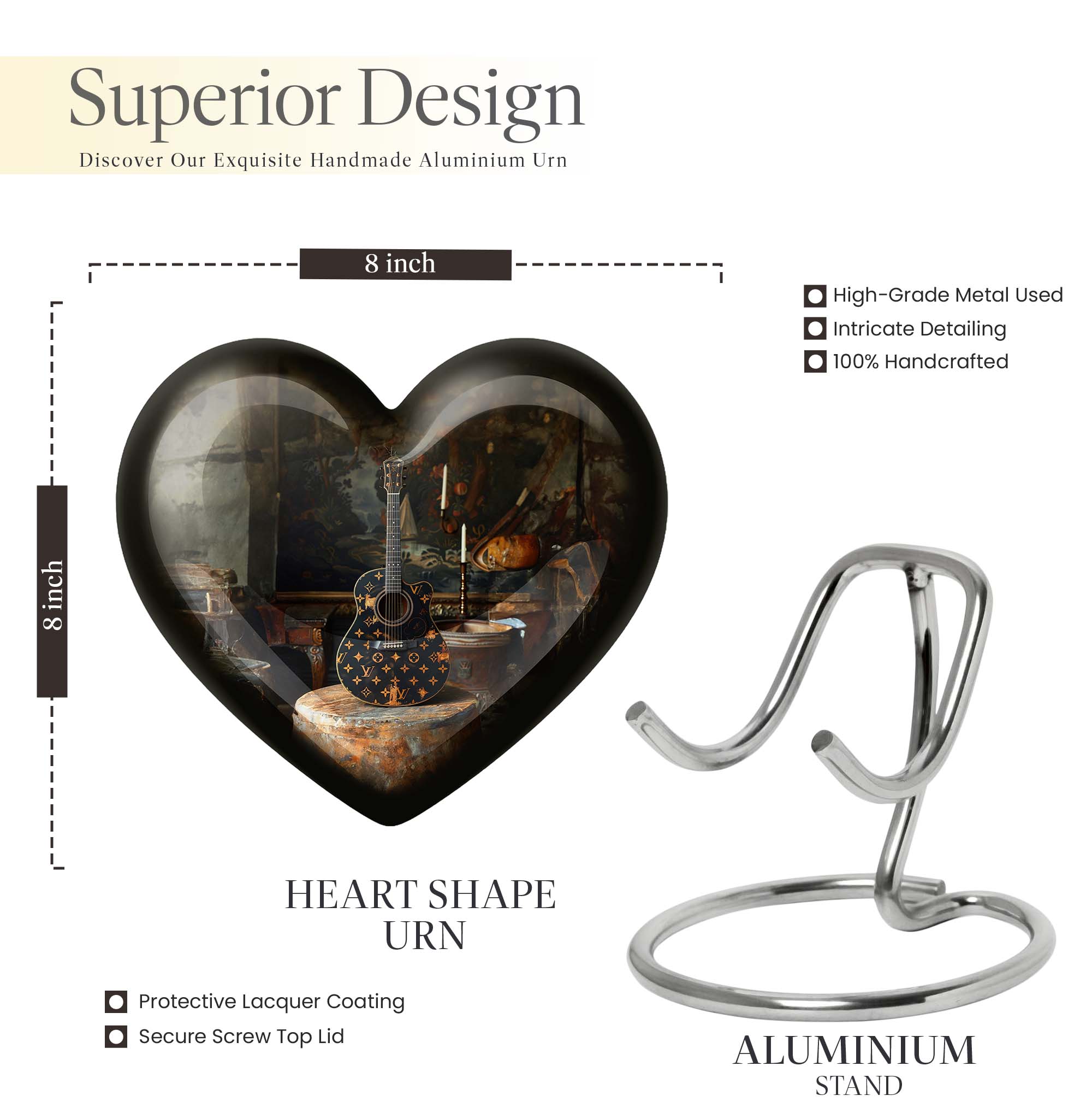 Embodying the ever-present love and reverence we carry for our departed ones, this unique Guitar Urn is an affirming symbol of eternal affection. This 10-inch showpiece is crafted from high-quality Aluminium, making it a lasting and dignifying resting place for your loved one. Its softly abstract theme and soulful heart-shape signify a love that remains undying. This funeral urn, with its featherlike weight of 3.3 pounds, comes with an elegantly conceived velvet pouch, offering a mild and soft shelter for the cherished ashes. Its capacity reaches 200 cubic inches, encapsulating the essence of the departed. Personalization can be added, with an option for engraved names, making this cremation urn a deeply intimate memorial. This large urn is ideal for burial in the ground, enhancing its uniqueness. It stands as a notes-worthy tribute to all cherished 'females' and 'moms.' Besides, its unseen allure makes it a fitting addition to the memorial ceremony supplies.