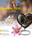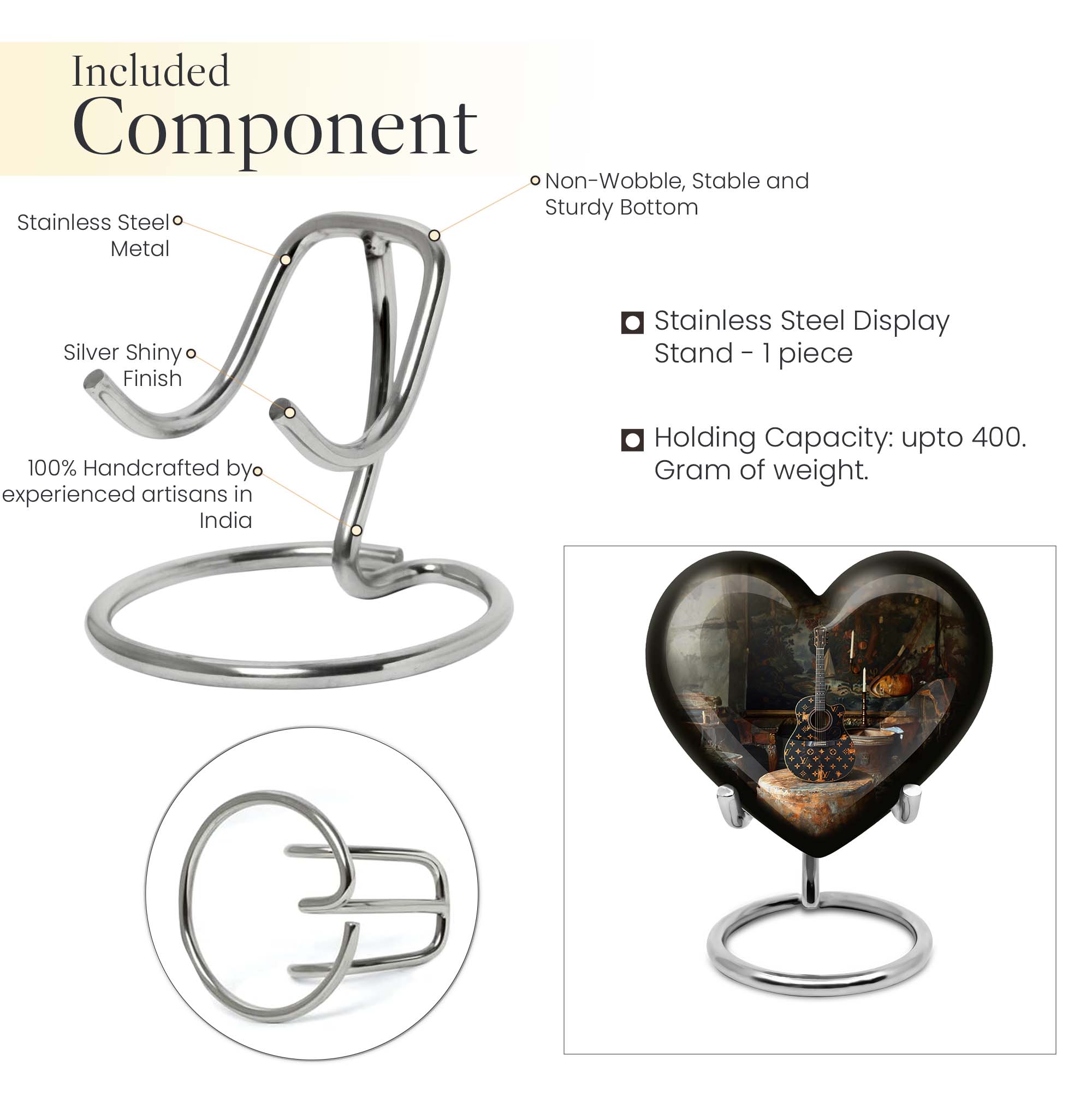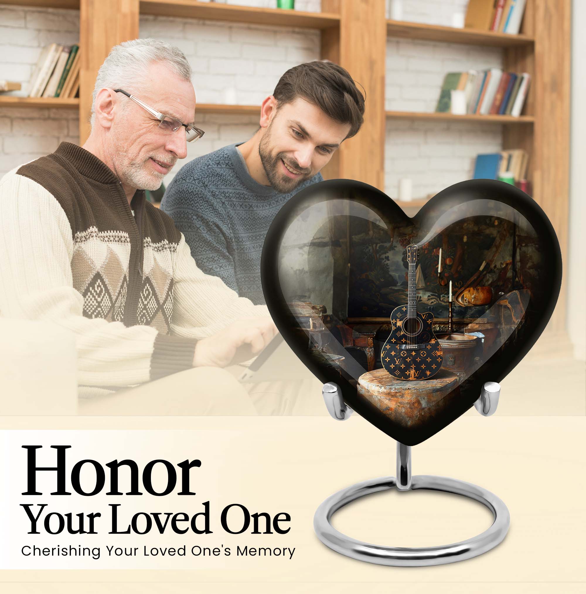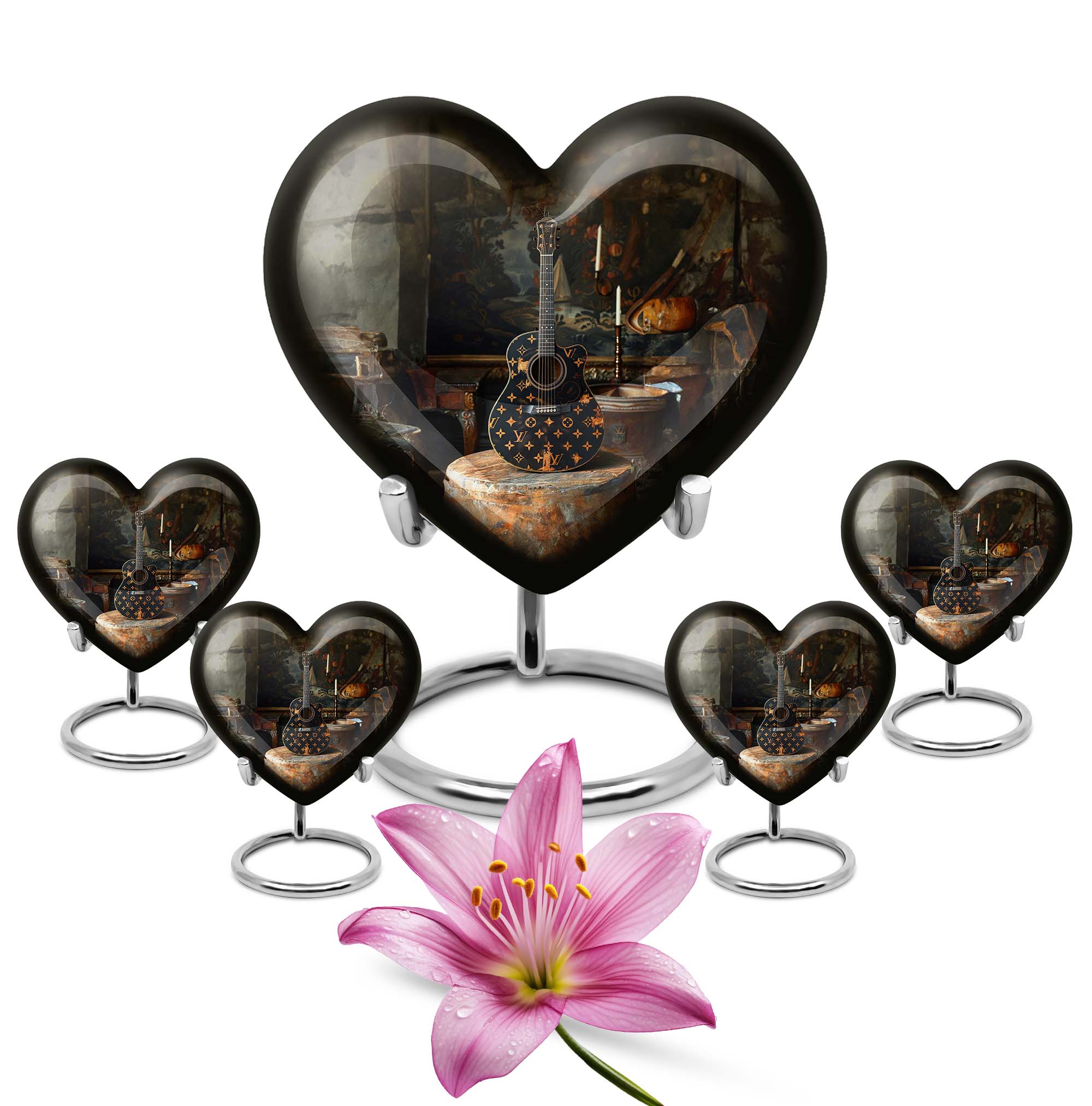 Embodying the ever-present love and reverence we carry for our departed ones, this unique Guitar Urn is an affirming symbol of eternal affection. This 10-inch showpiece is crafted from high-quality Aluminium, making it a lasting and dignifying resting place for your loved one. Its softly abstract theme and soulful heart-shape signify a love that remains undying. This funeral urn, with its featherlike weight of 3.3 pounds, comes with an elegantly conceived velvet pouch, offering a mild and soft shelter for the cherished ashes. Its capacity reaches 200 cubic inches, encapsulating the essence of the departed. Personalization can be added, with an option for engraved names, making this cremation urn a deeply intimate memorial. This large urn is ideal for burial in the ground, enhancing its uniqueness. It stands as a notes-worthy tribute to all cherished 'females' and 'moms.' Besides, its unseen allure makes it a fitting addition to the memorial ceremony supplies.