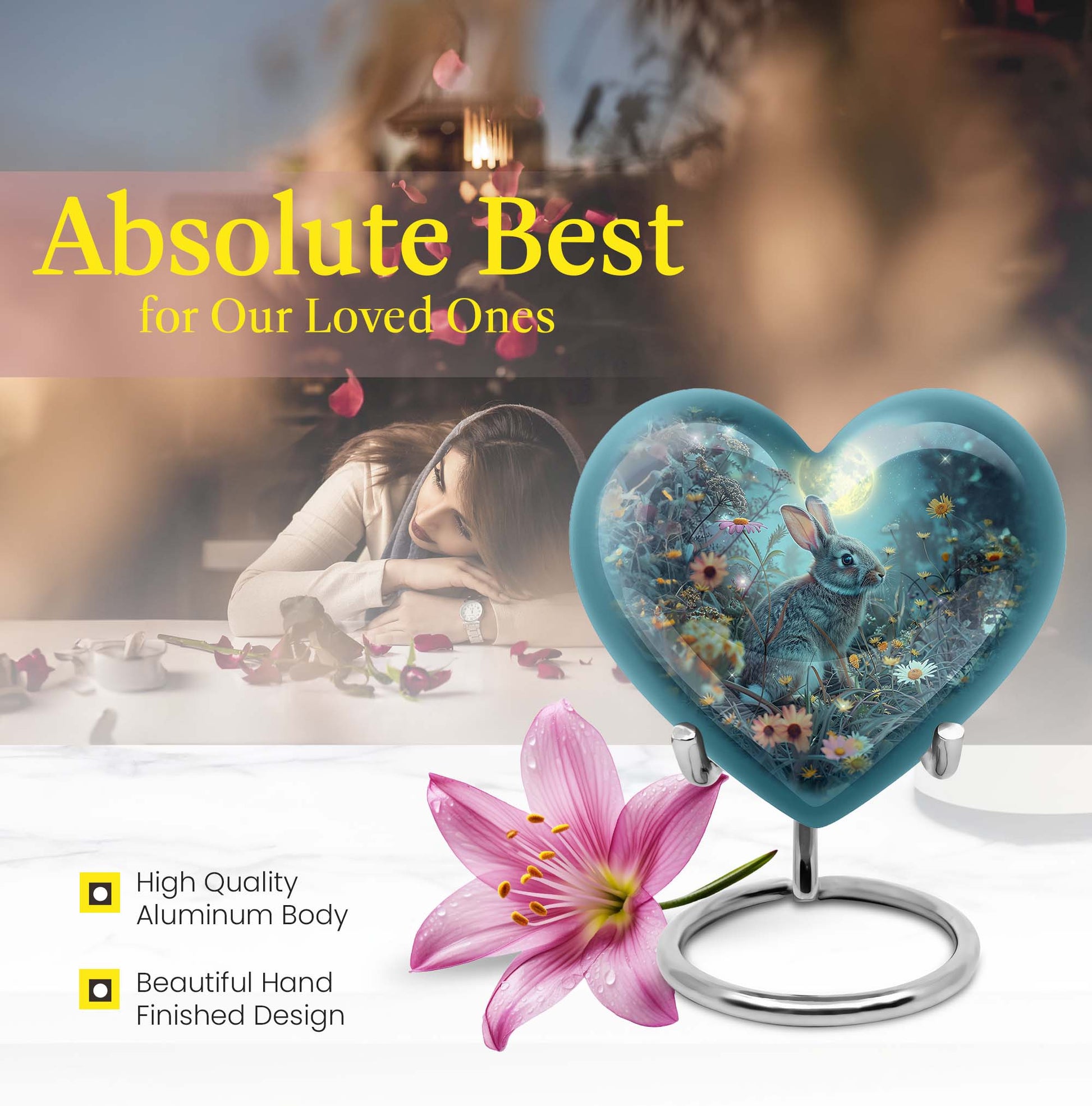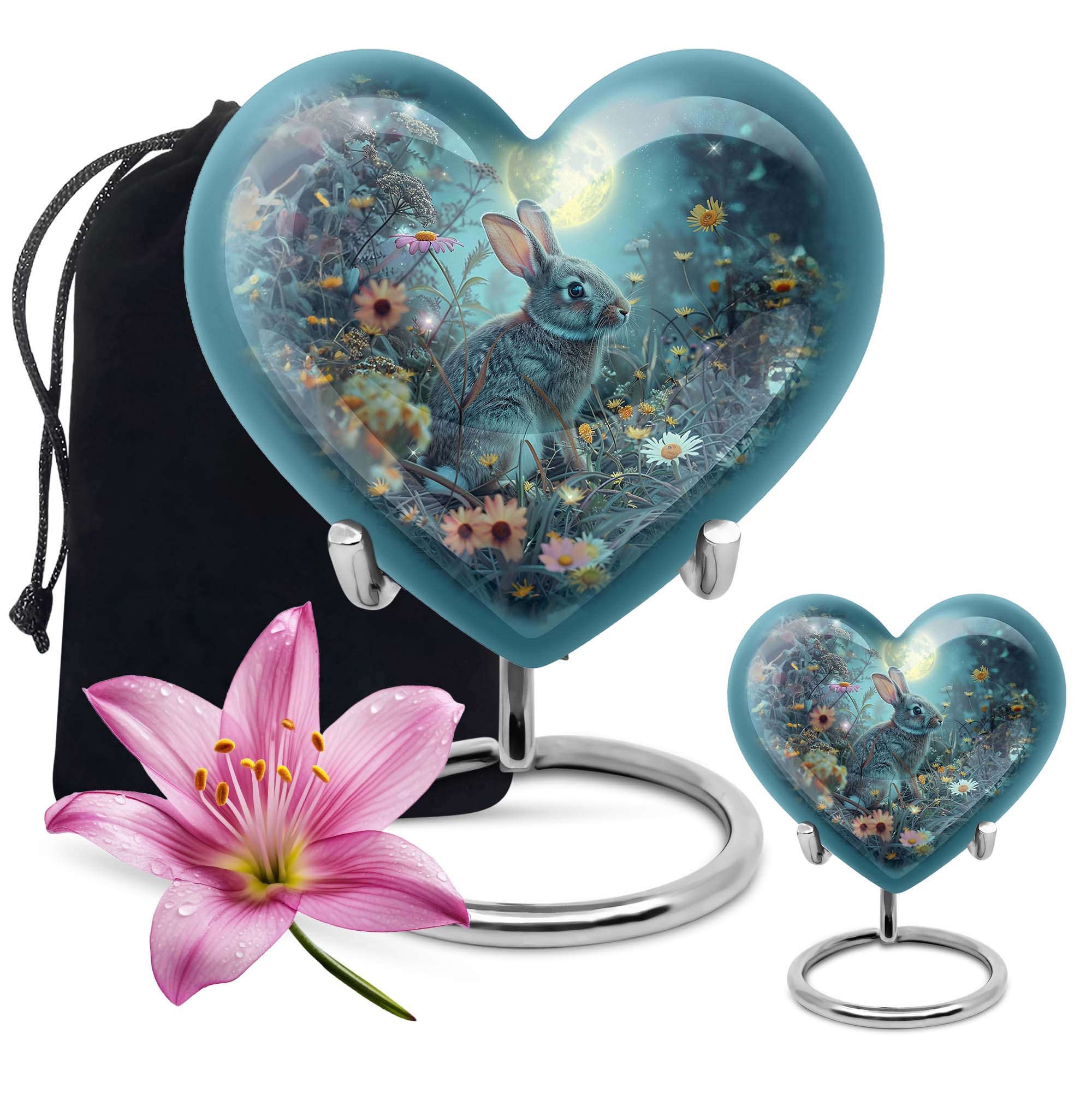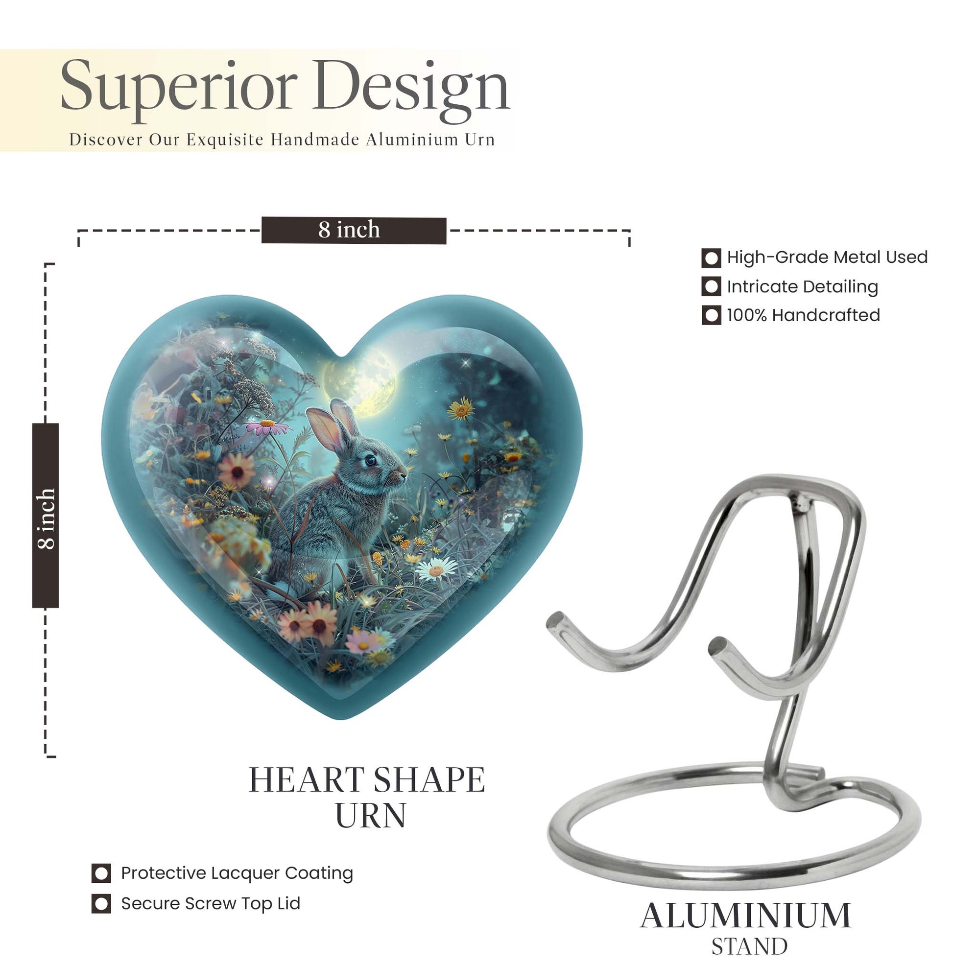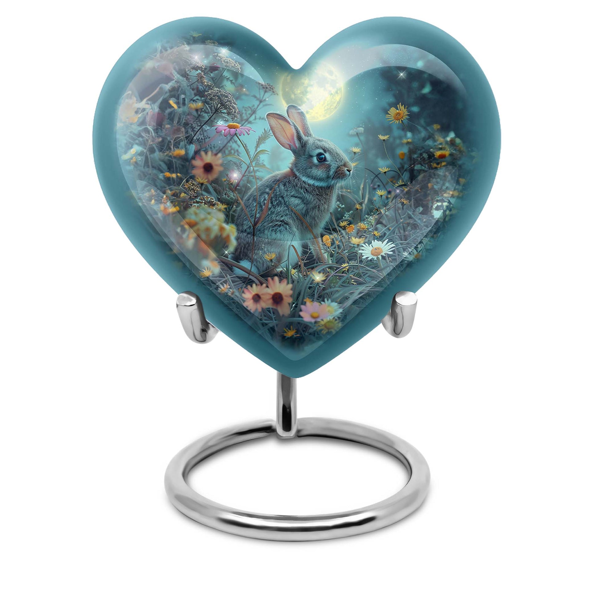Discover the perfect remembrance piece with this White Bunny Moon Urn, an artistic piece from our large urns collection. Made from quality aluminium, this cremation urn stands 10 inches in height and embodies a touch of abstract art that can blend seamlessly with any interior décor. The heart urn design showcases our commitment to creating unique, memorable, and stylish designs. With a capacity of 200 cubic inches, this urn is suitable for holding sizable quantities of ashes, making it an ideal option for burial in the ground. This package comes with a velvet pouch for the containment of ashes, providing an extra layer of privacy and respect for your loved one. The urn weighs 3.3 pounds, a sturdy and substantial tribute to your dearly departed. For a more personalized touch, this urn allows you to engrave names, allowing you to keep your loved one’s memory alive. When searching for 'cremation urns for women', 'ash adult urns for ashes', or 'metal urns for burial in ground large', consider this white bunny moon urn for a thoughtful and heartfelt choice.
