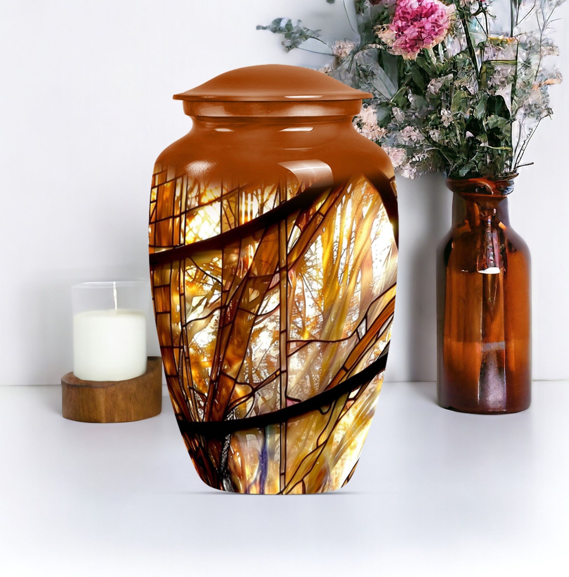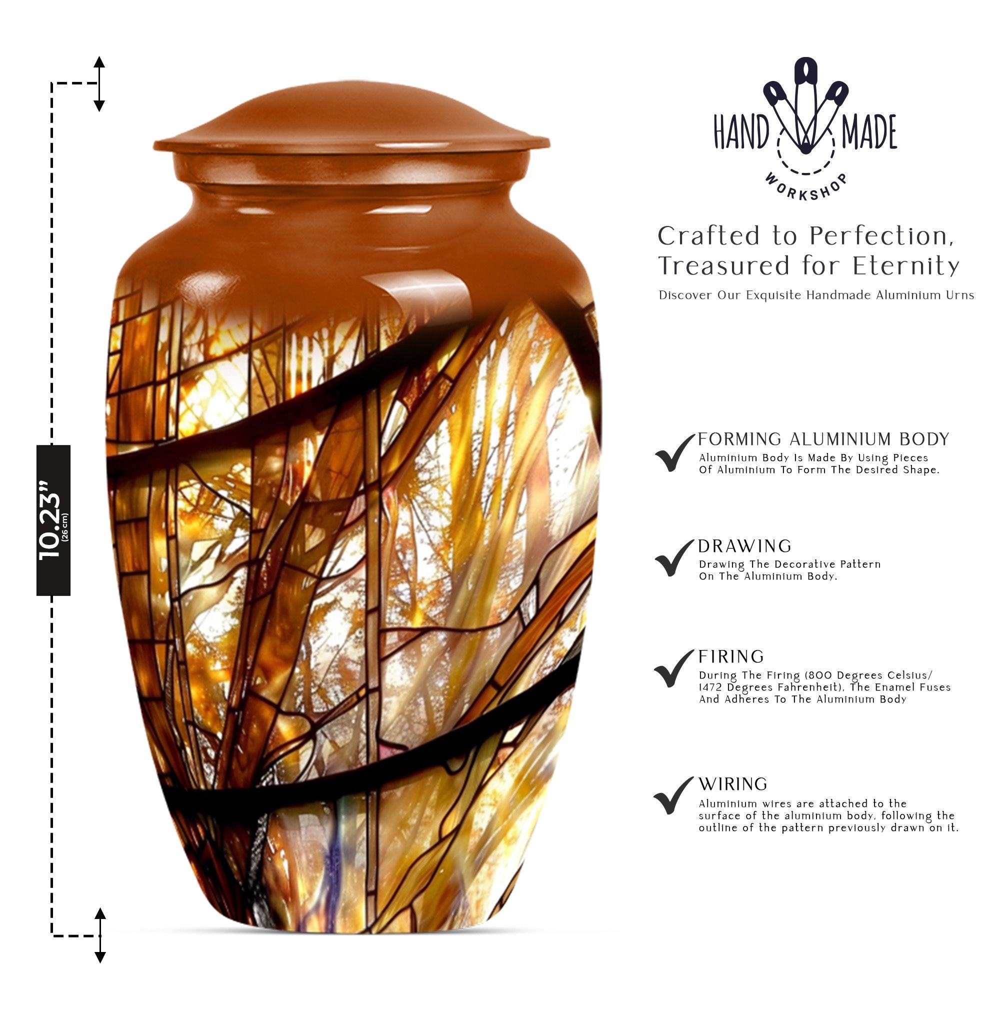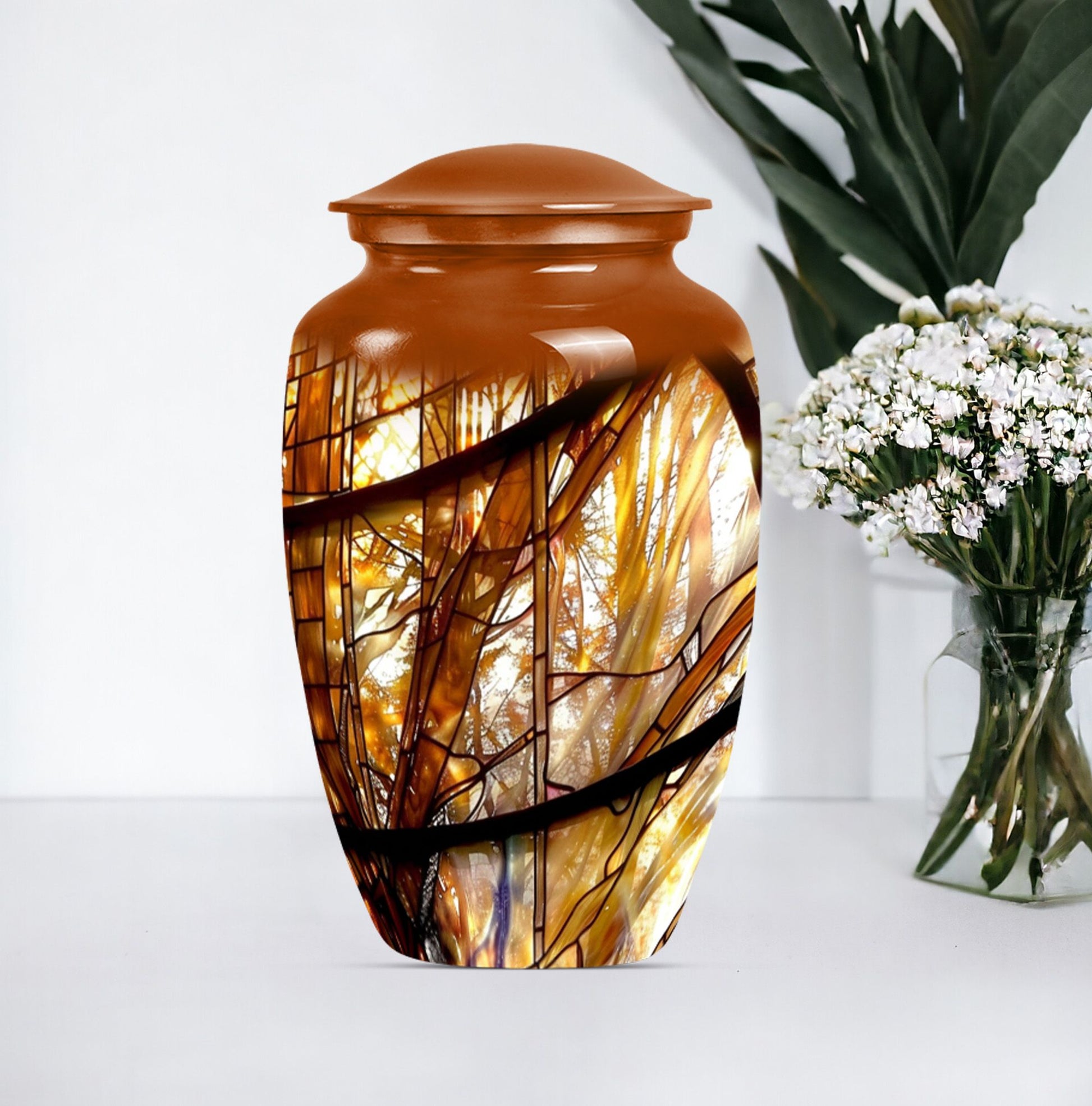 Elegantly safeguard your cherished one's remains with this 10-inch stained glass Urn, a perfect combination of functionality and intricate design. Ideal as a funeral urn for men's ashes, this product in our range of large urns is crafted from robust aluminium, lending it a sense of enduring dignity. The abstract theme provides a poignant, artistic touch, turning this urn into more than just a memorial item - it's also a piece of art. The urn is easy to manage, at a weight of 3.3 pounds, and has a capacity of holding upto 200 cubic inches of ashes. Express your love and devotion with the option to personalize the urn with engraved names, immortalizing your bond. It also comes with a velvet pouch for tasteful and respectful containment of ashes. These memorial urns perfectly serve their purpose, serving as a tangible memory of your loved ones. Ideal for those searching for 'adult urns for ashes,' 'Decorative Human Ashes Urns,' or a simply a 'metal urn.'