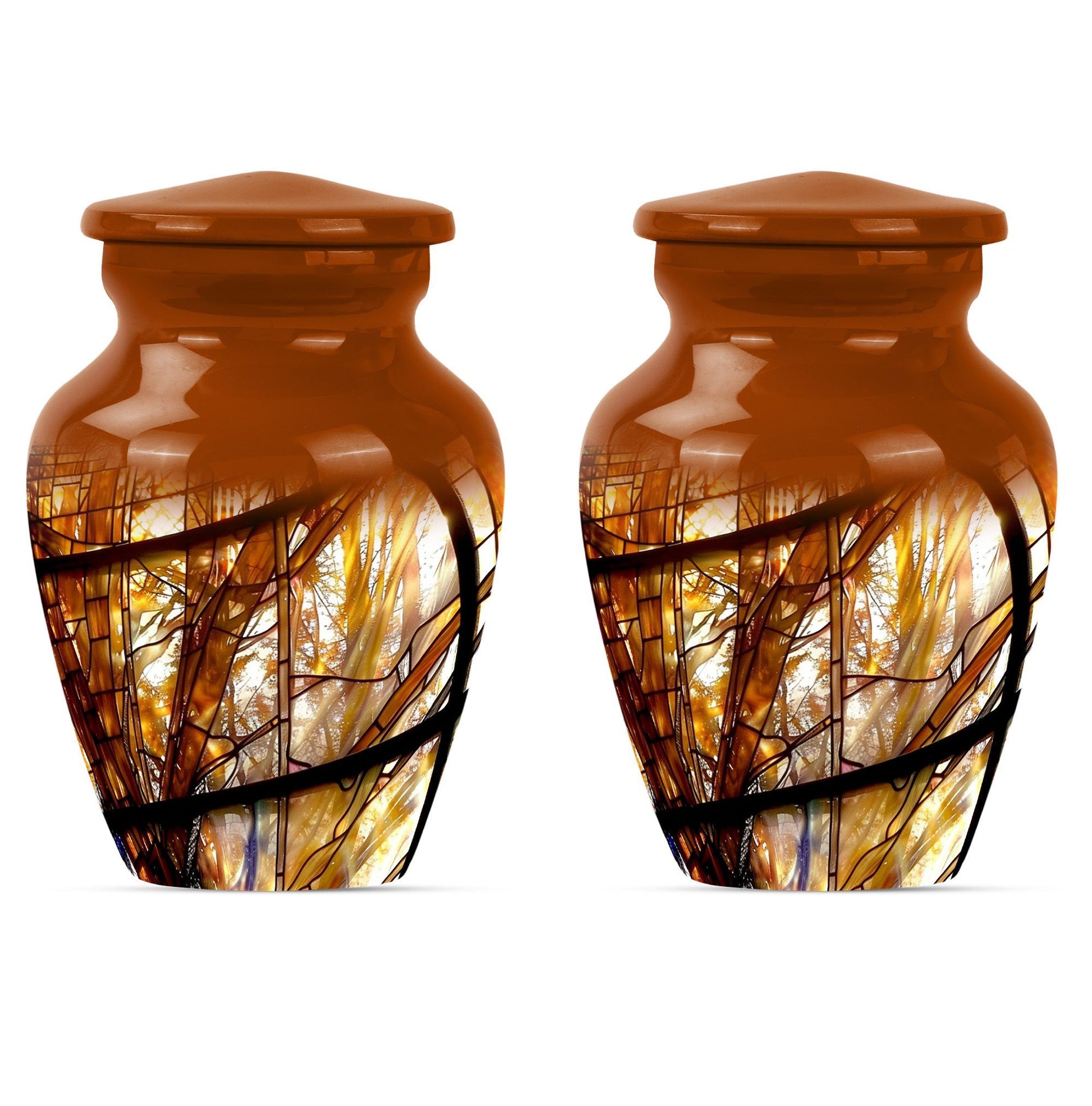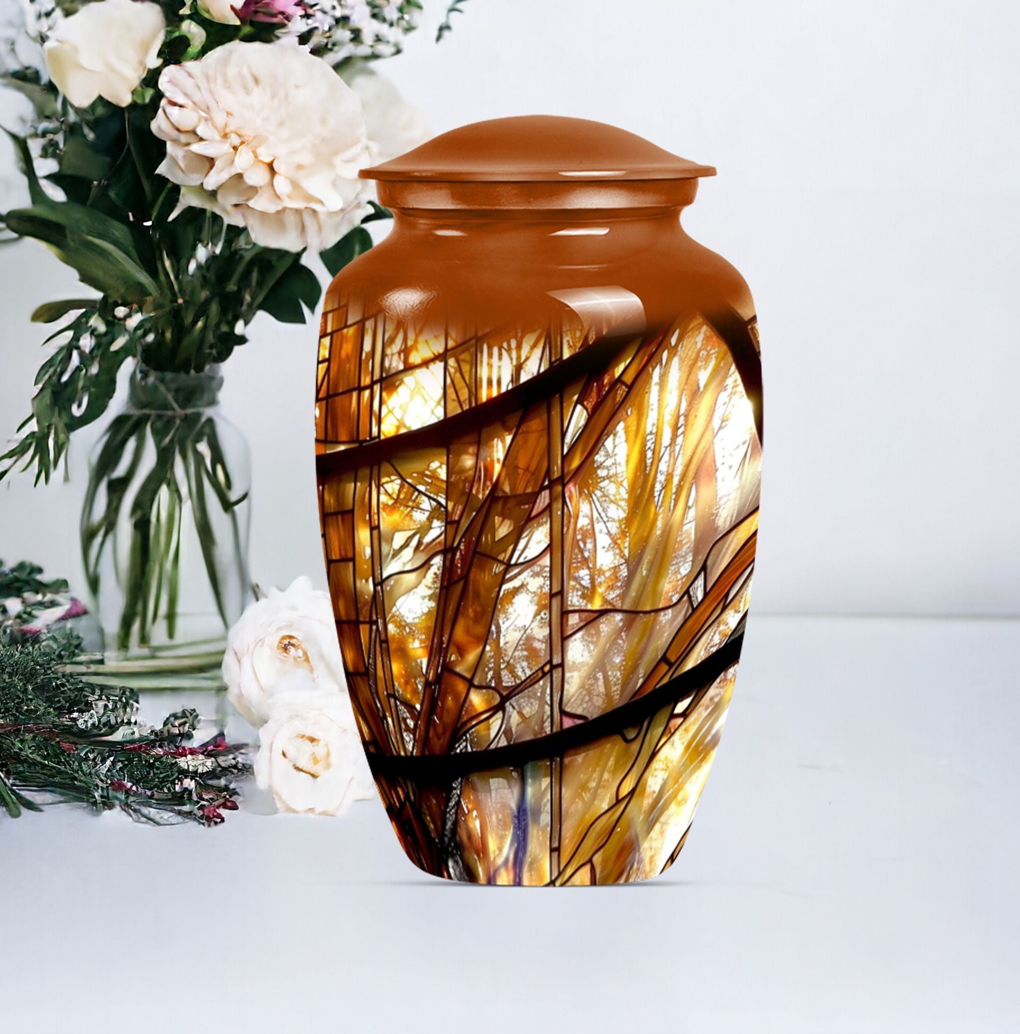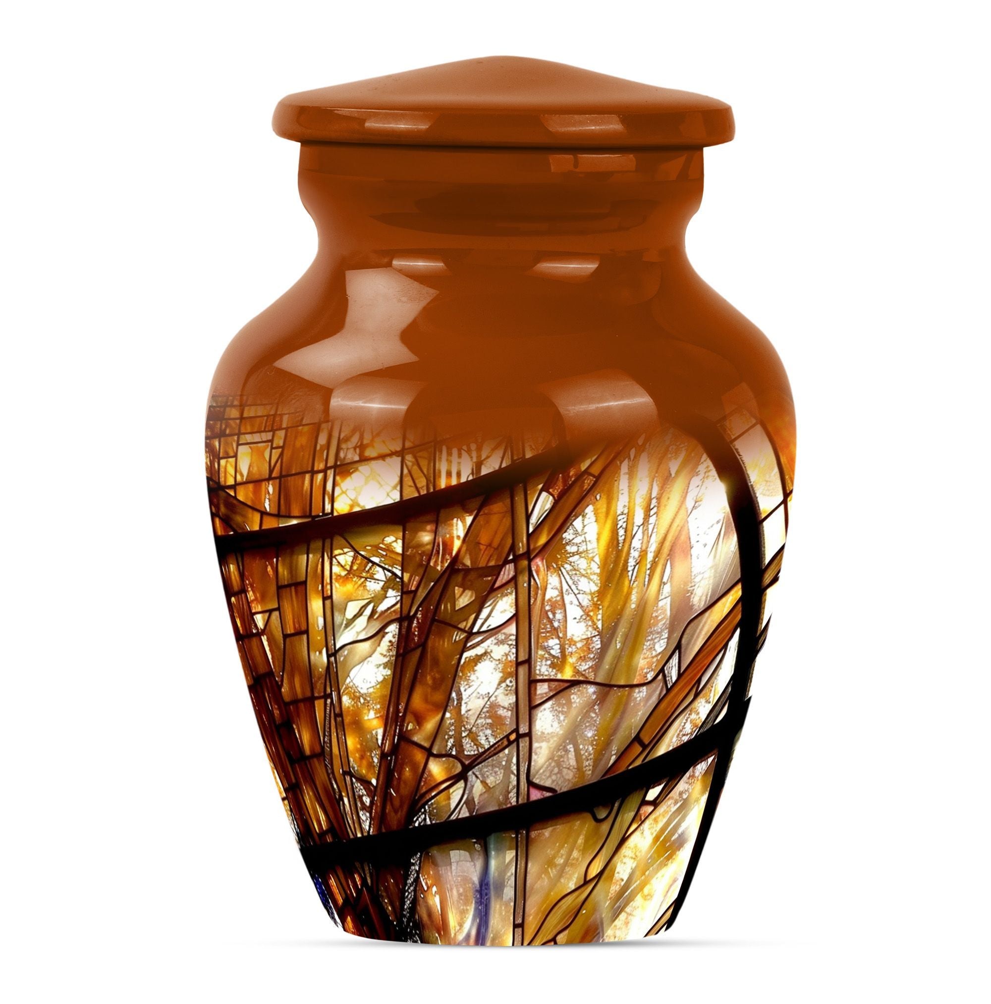 Elegantly safeguard your cherished one's remains with this 10-inch stained glass Urn, a perfect combination of functionality and intricate design. Ideal as a funeral urn for men's ashes, this product in our range of large urns is crafted from robust aluminium, lending it a sense of enduring dignity. The abstract theme provides a poignant, artistic touch, turning this urn into more than just a memorial item - it's also a piece of art. The urn is easy to manage, at a weight of 3.3 pounds, and has a capacity of holding upto 200 cubic inches of ashes. Express your love and devotion with the option to personalize the urn with engraved names, immortalizing your bond. It also comes with a velvet pouch for tasteful and respectful containment of ashes. These memorial urns perfectly serve their purpose, serving as a tangible memory of your loved ones. Ideal for those searching for 'adult urns for ashes,' 'Decorative Human Ashes Urns,' or a simply a 'metal urn.'