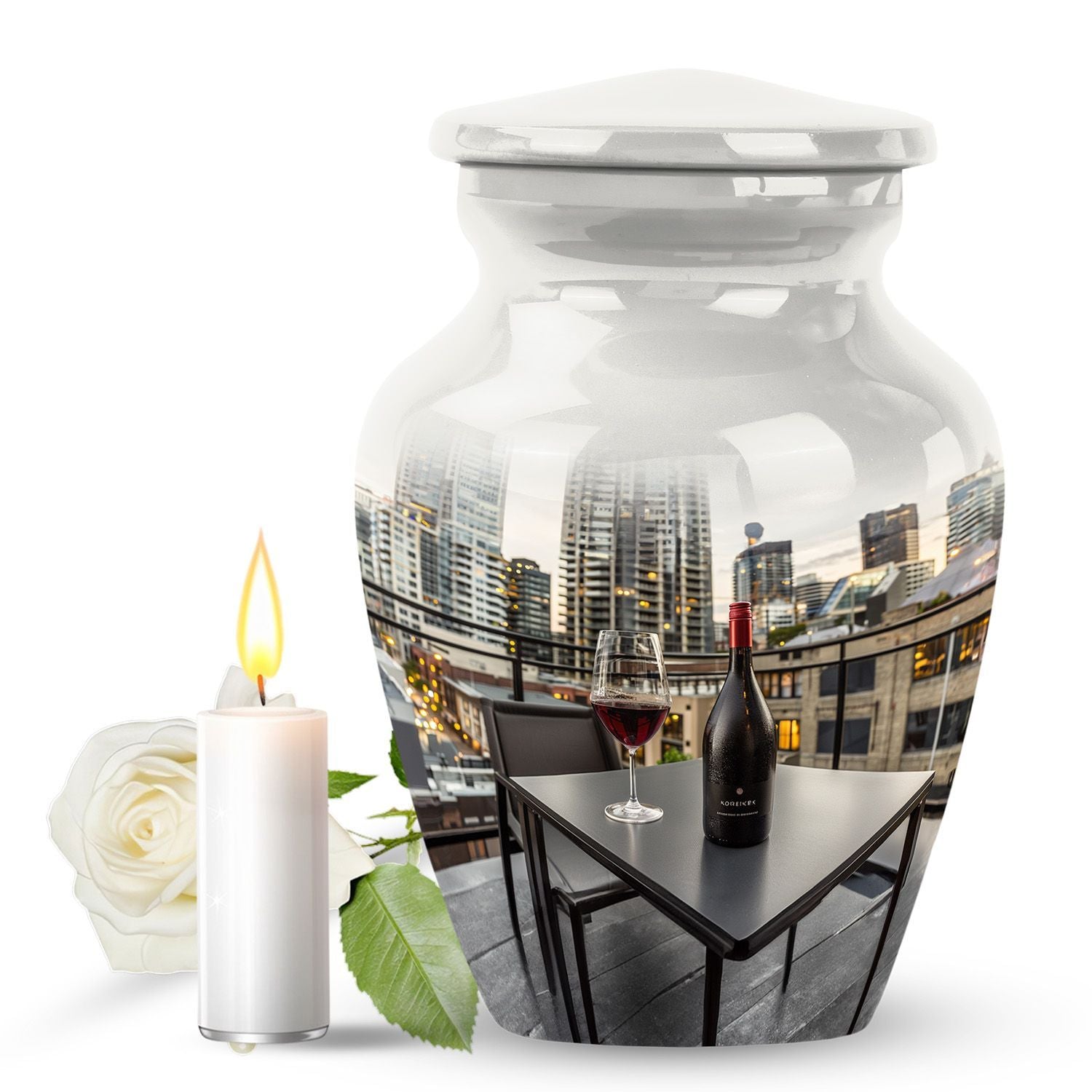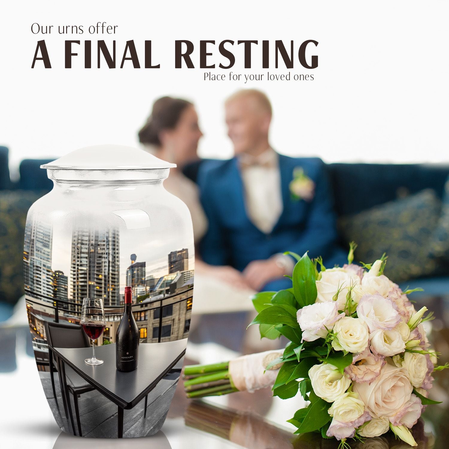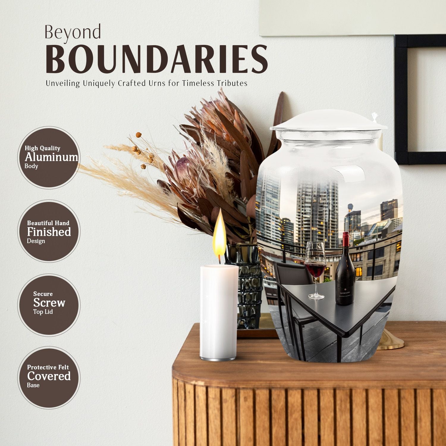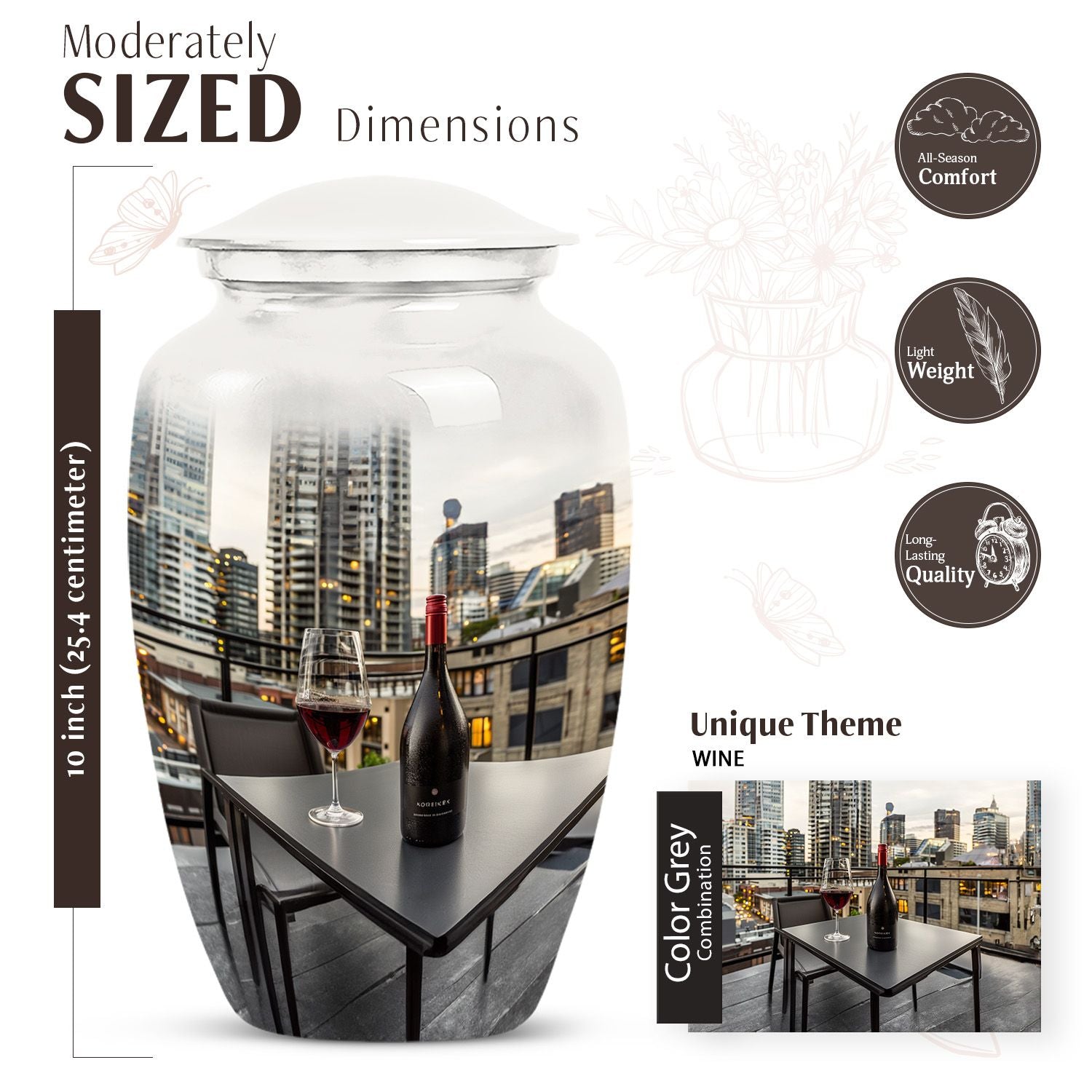 Show love, honor, and respect to the departed with our exquisite 10-inch abstract-themed wine urn made from high-quality aluminium. Weighing only 3.3 pounds, this large urn exemplifies a blend of strength and elegance. Unlike traditional urn designs, this memorial adult urn offers a unique aesthetic appeal with its classic mode that indeed fascinates the eyes. The urn holds up to 200 cubic inches, accommodating the ashes of an average adult human or pet. For easy containment and secure transportation, our package comes with a soft and durable velvet pouch. Adding a personal touch to this memorable piece has been made simple as we provide the option to engrave names on it. This beautiful funeral urn is not merely a container; it serves as an enduring tribute to the deceased. Primary keywords: wine urn, memorial adult urns for human ashes women, funeral large urns for human ashes adult male, ash adult woman, adult urns for cremation ashes, and cremation urn for women.