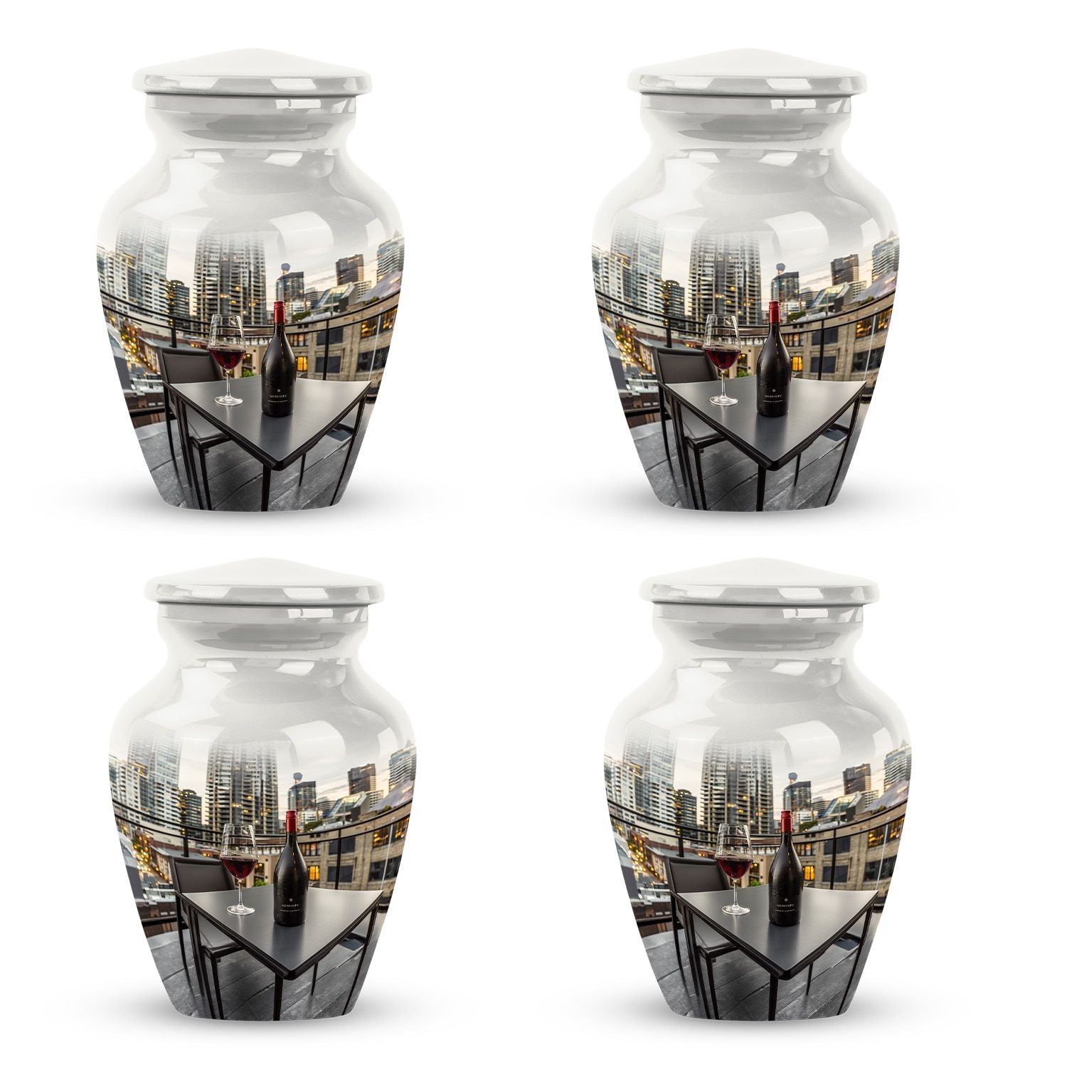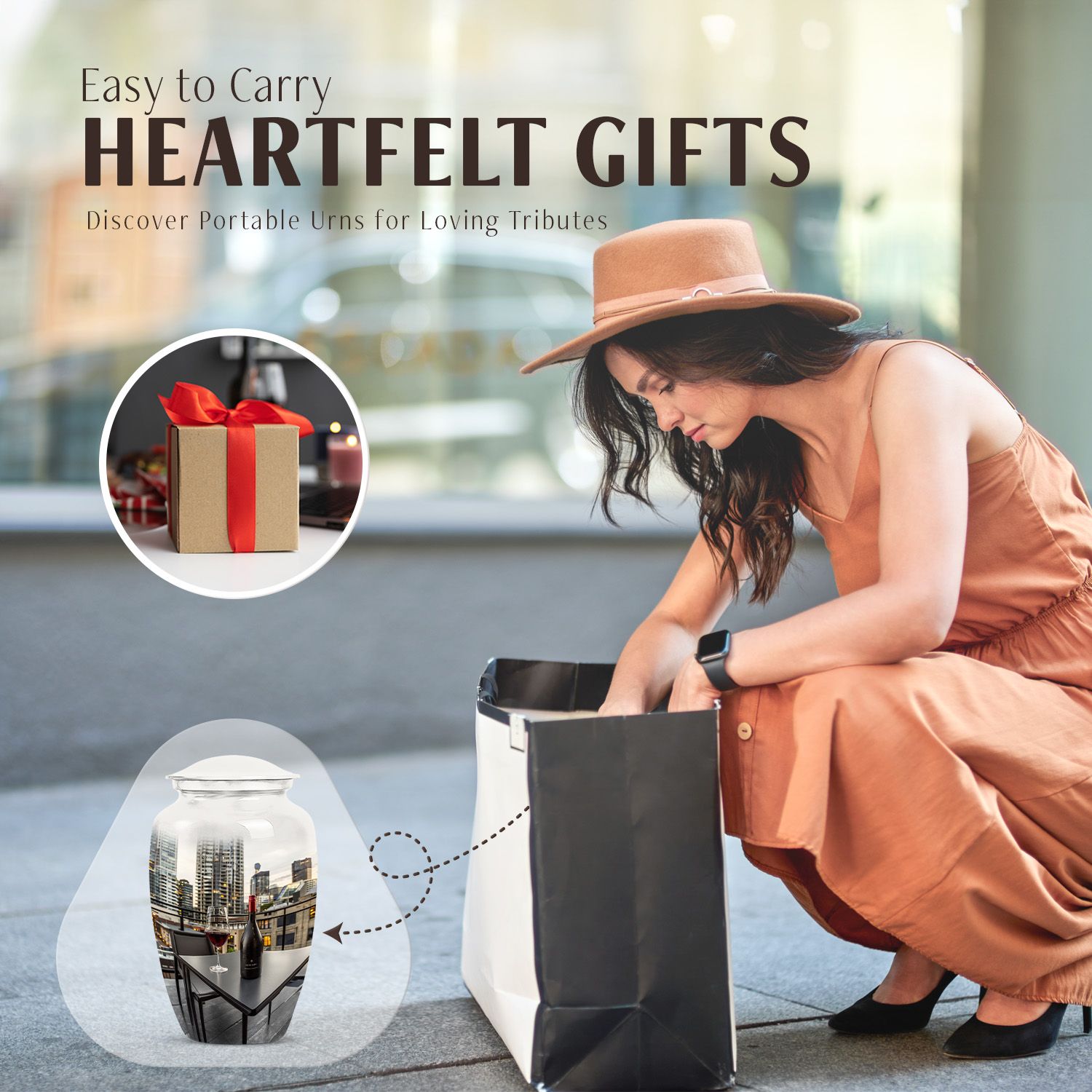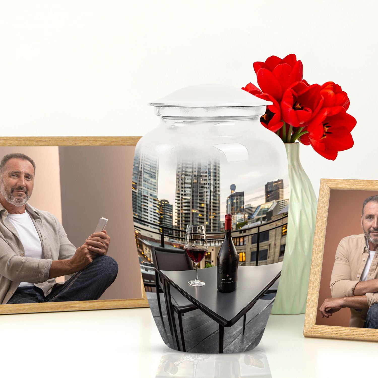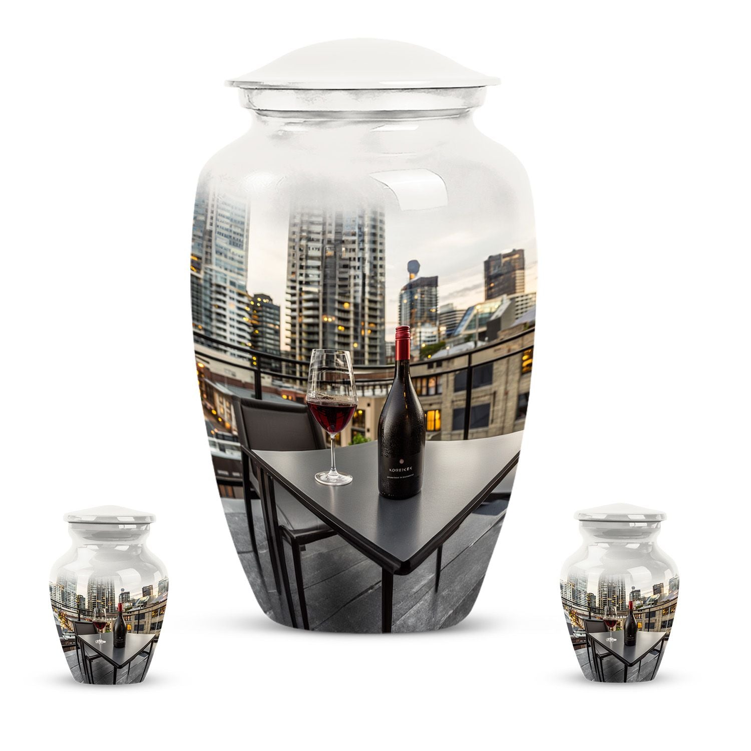 Show love, honor, and respect to the departed with our exquisite 10-inch abstract-themed wine urn made from high-quality aluminium. Weighing only 3.3 pounds, this large urn exemplifies a blend of strength and elegance. Unlike traditional urn designs, this memorial adult urn offers a unique aesthetic appeal with its classic mode that indeed fascinates the eyes. The urn holds up to 200 cubic inches, accommodating the ashes of an average adult human or pet. For easy containment and secure transportation, our package comes with a soft and durable velvet pouch. Adding a personal touch to this memorable piece has been made simple as we provide the option to engrave names on it. This beautiful funeral urn is not merely a container; it serves as an enduring tribute to the deceased. Primary keywords: wine urn, memorial adult urns for human ashes women, funeral large urns for human ashes adult male, ash adult woman, adult urns for cremation ashes, and cremation urn for women.