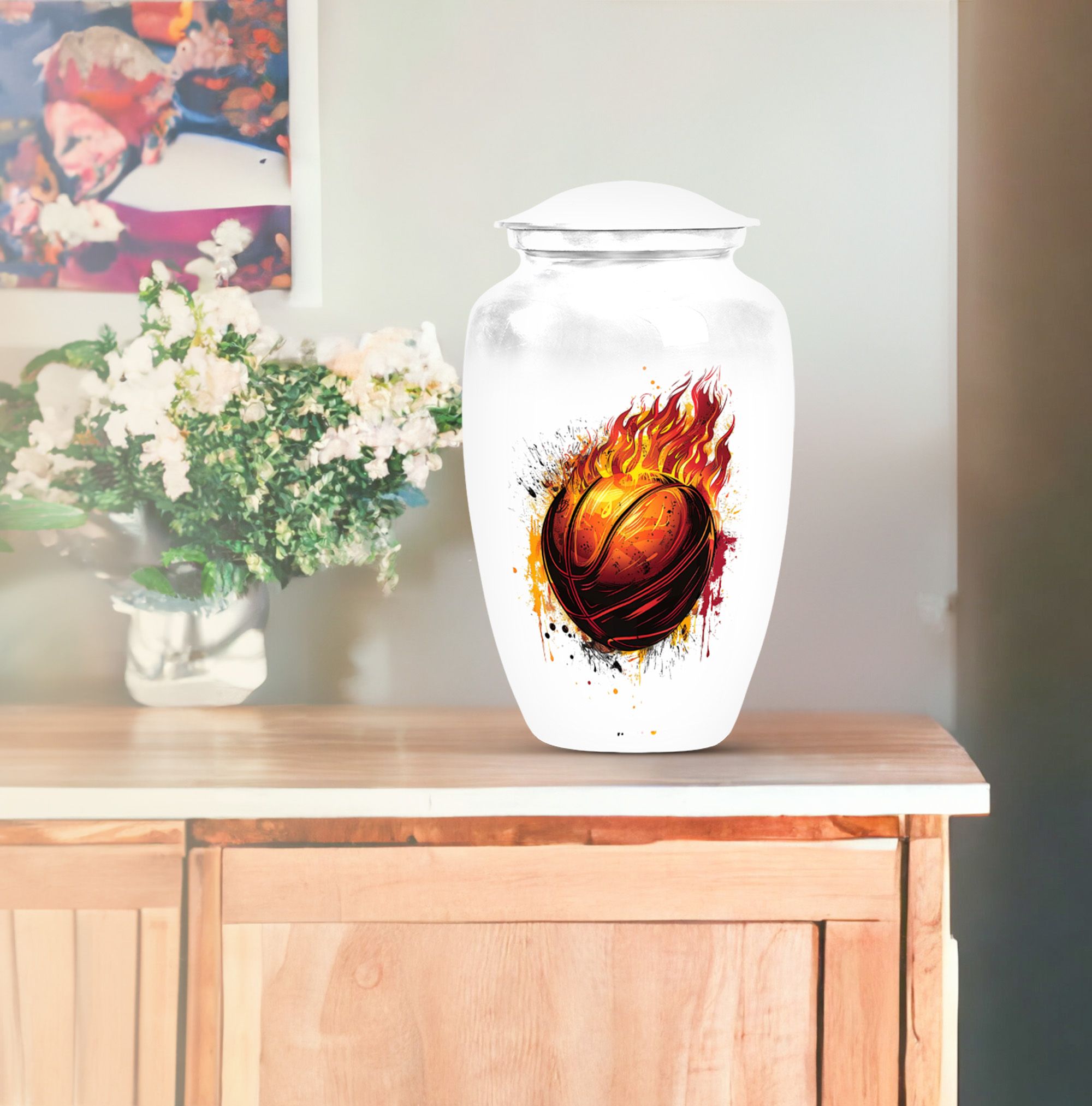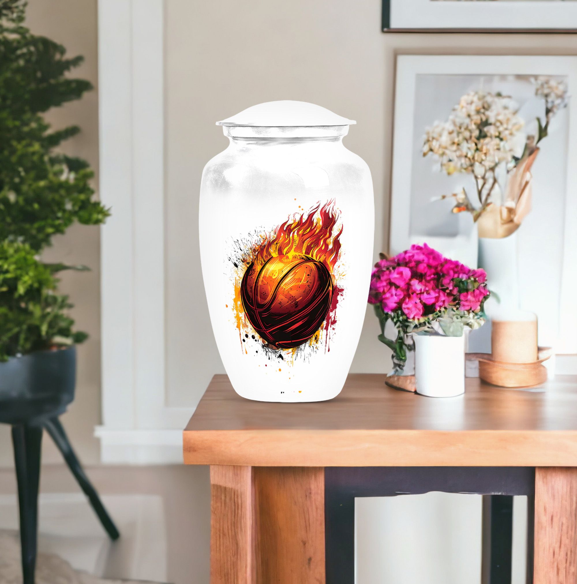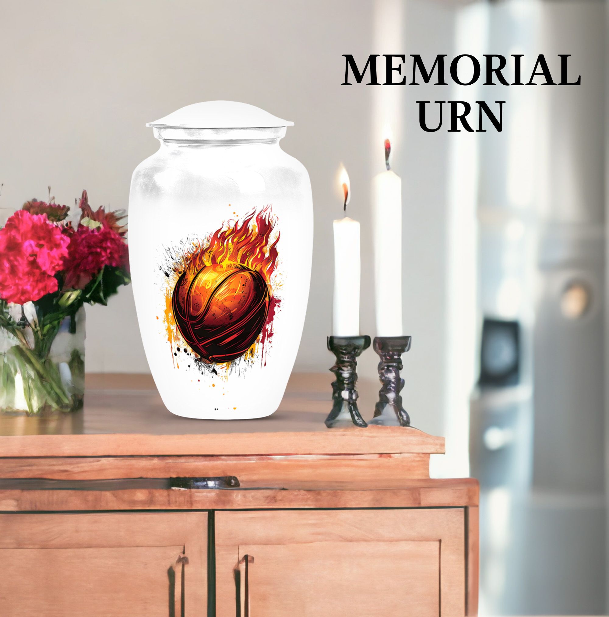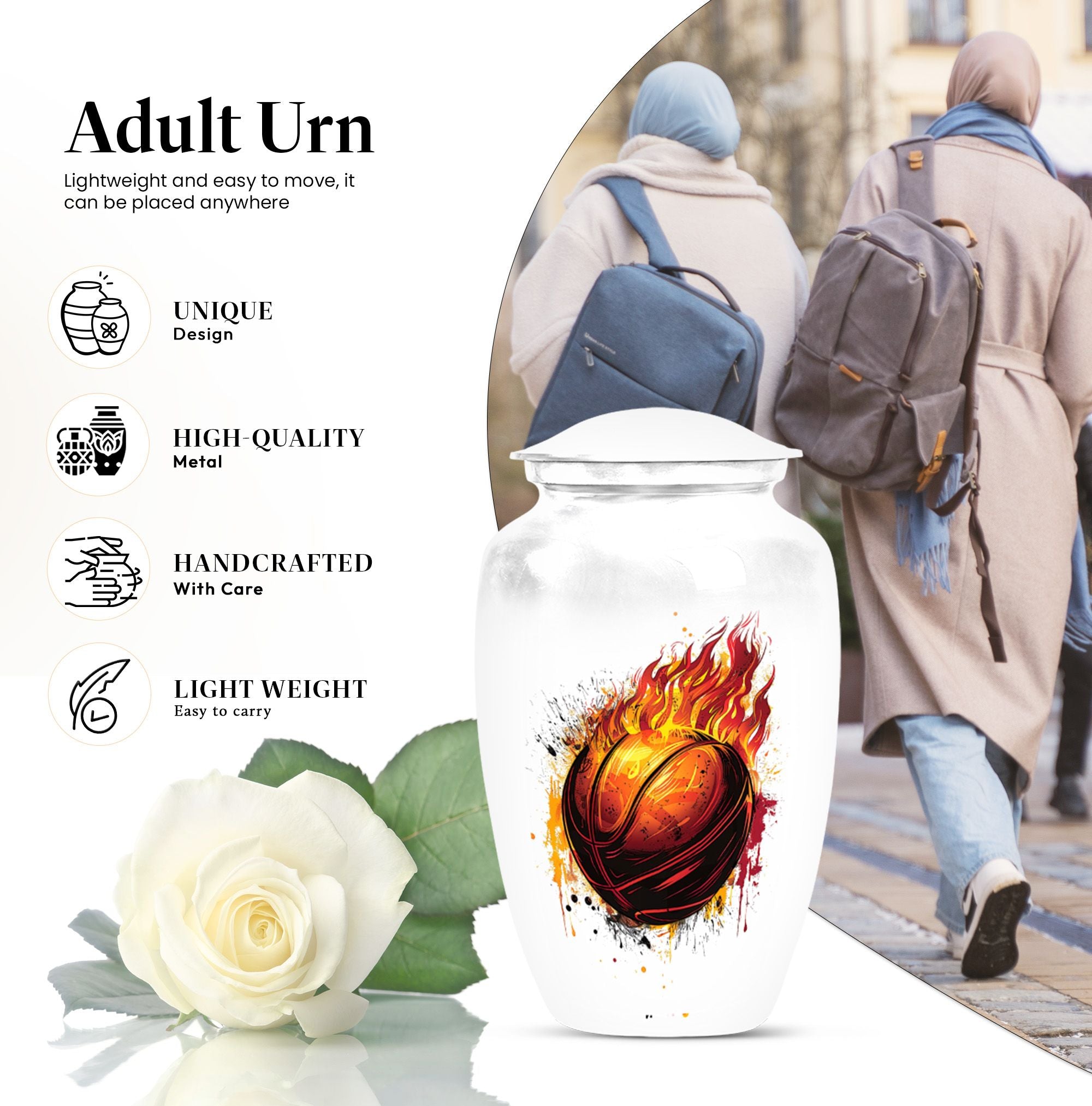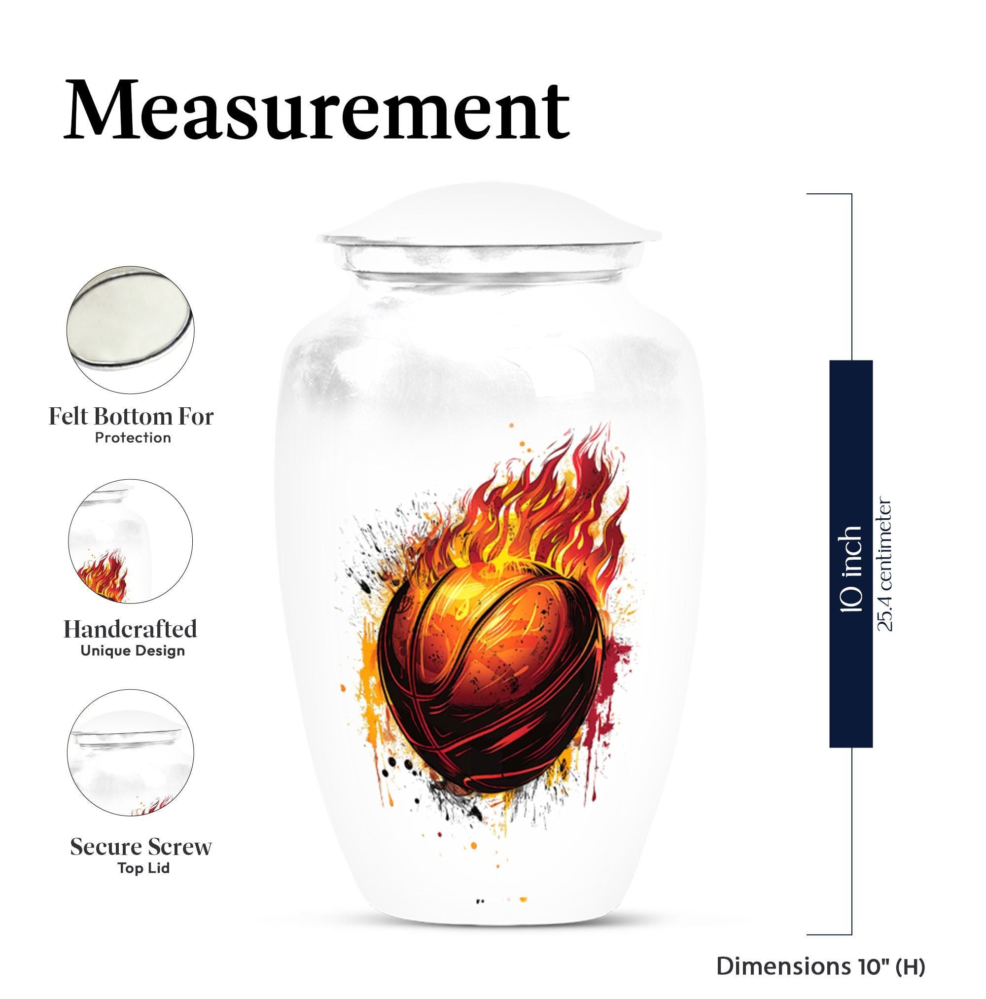 Immortalize your loved one with our meticulously crafted 10-inch basketball urn, specifically designed for adults and seniors looking for dignified memorial ceremony supplies. Composed of high-quality aluminium, these large urns exhibit a classic design that symbolically serves as your undying tribute to your dad. Weighing at 3.3 pounds, this cremation urn securely holds up to 200 cubic inches of ashes. Its elegantly designed gramophone theme brings a unique touch to this resting place of remembrance. Our package also includes a velvet pouch for the dignified containment of ashes, adding an extra layer of reverence. Personalize this urn with engraved names, aiding the process of healing by leaving a lasting mark in their honor. Our basketball urn is an affordable choice for burial urns that straddle premium quality and sentimental value. Keywords: memorial urns, basketball urn, cremation dad urn, burial urns for adult men ashes, human urns, affordable urns, and large urn iridescent metal.