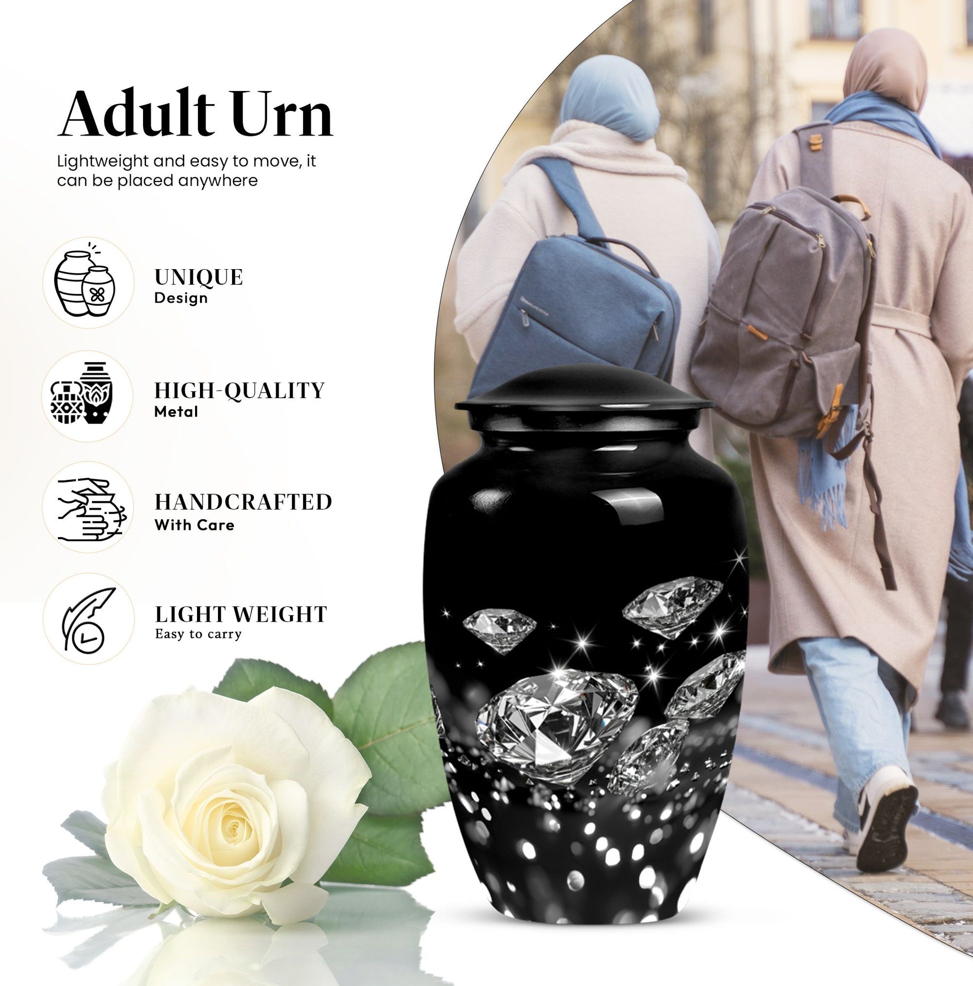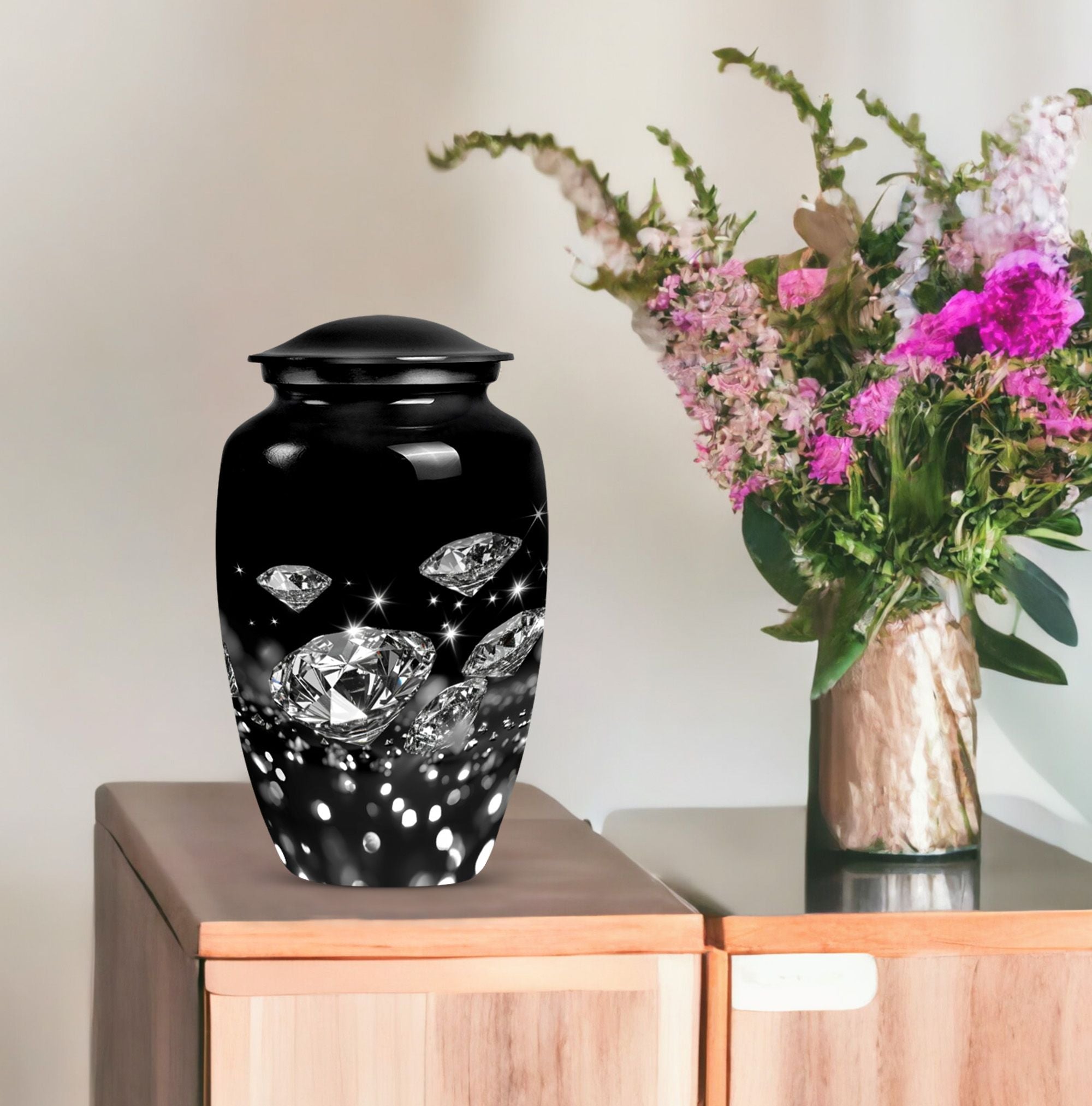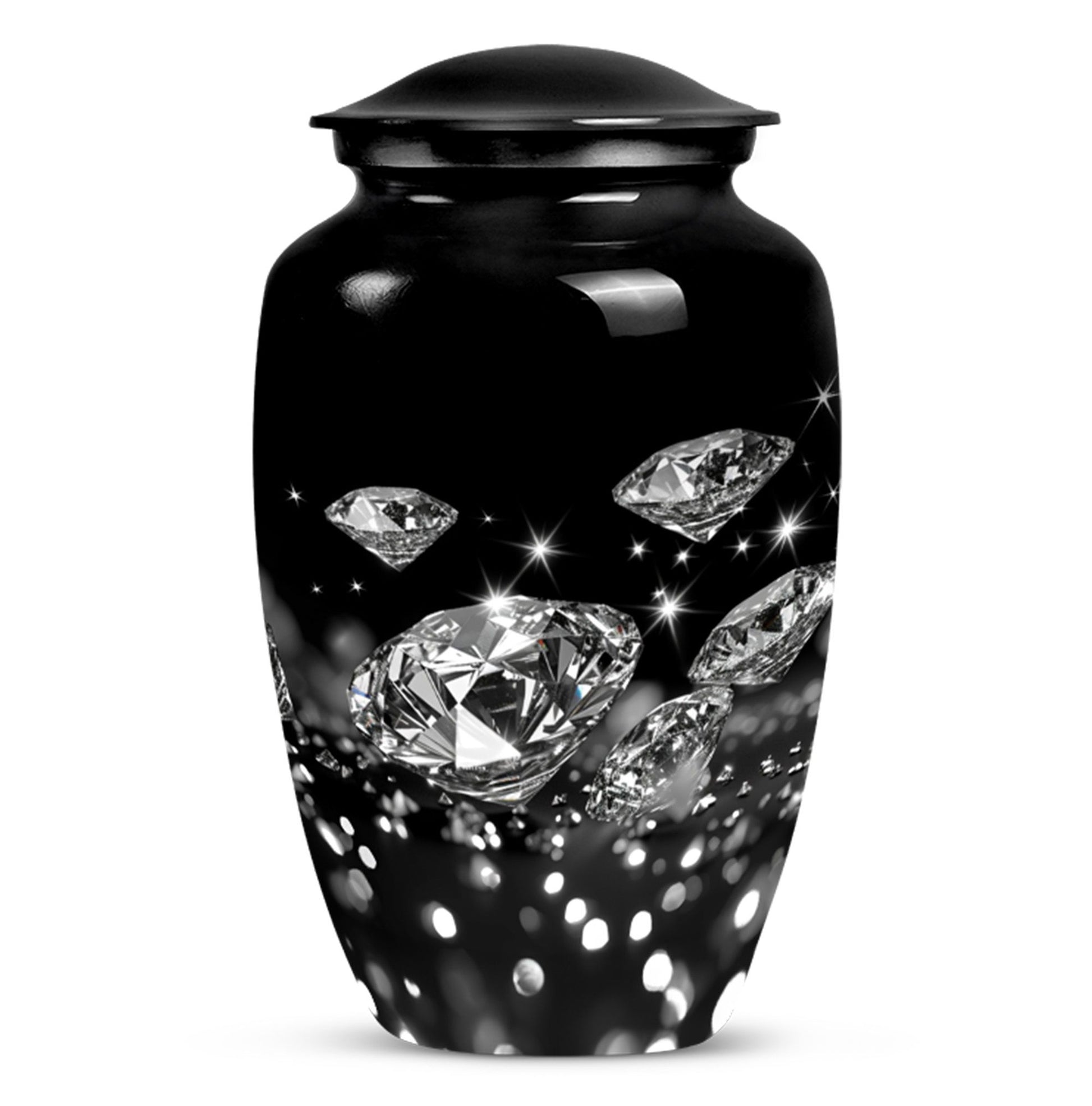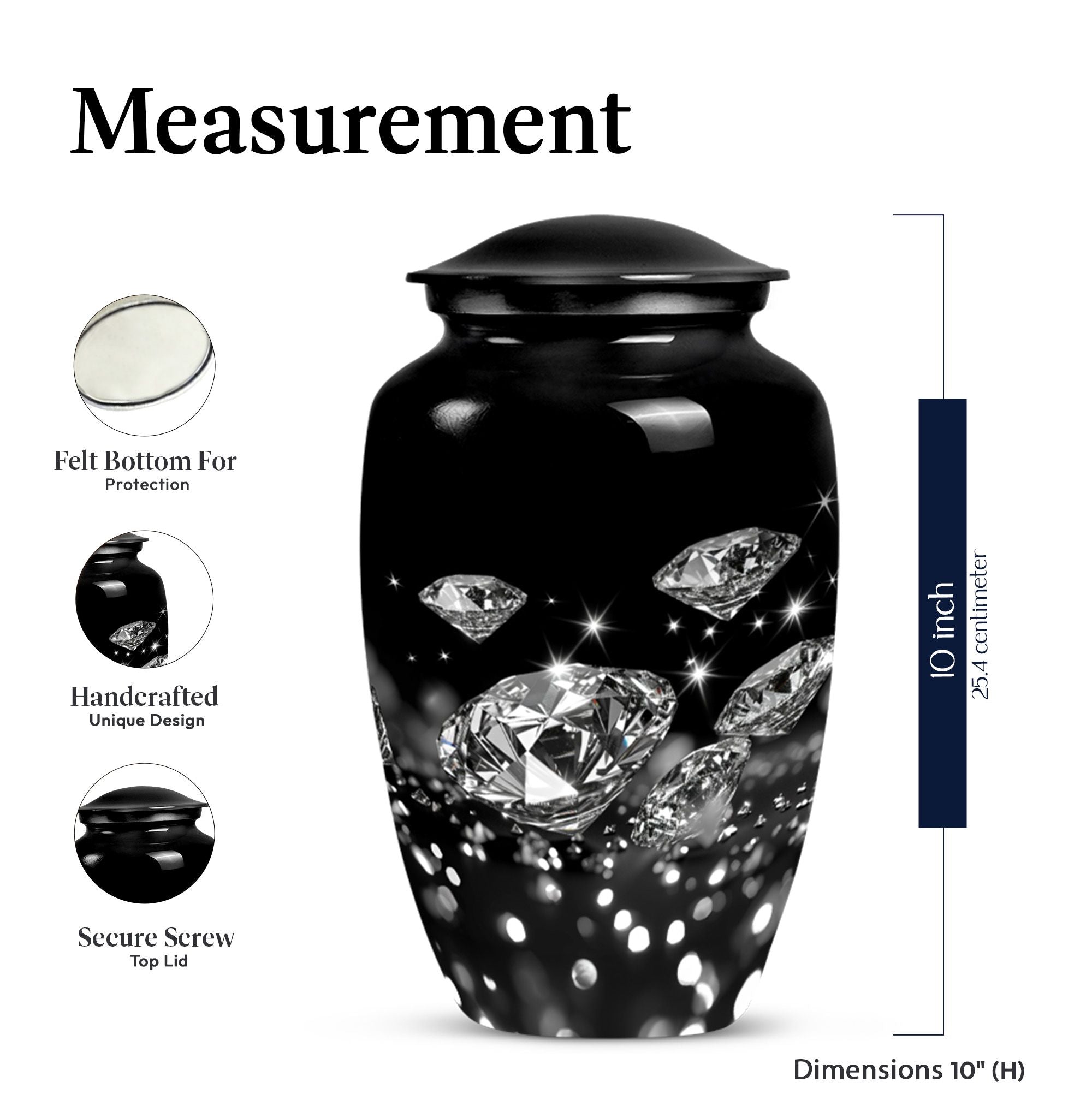 Embrace a tribute of love and honor with this captivating, large burial urn, explicitly designed for your cherished ones as a worthy resting place. This 10-inch, abstract-themed classic urn showcases a refined combination of beauty, durability, and functionality. The urn is crafted from high-quality aluminium, promising longevity and resistance to wear, thus making it an ideal choice for memorial urns. The urn features an ample capacity of 200 cubic inches, suitable to hold the ashes of an adult. Weighing just 3.3 pounds, it is ergonomically designed for easy management. This diamond urn package is completed by a complementary velvet pouch for safe containment of the ashes. You can also personalize this urn with engraved names, adding a bespoke touch to your memorial. Whether you're seeking a cremation urn, an urn for cremation ashes mother, or funeral cremation urn, this product is sure to meet your needs. Note: Product design may vary.