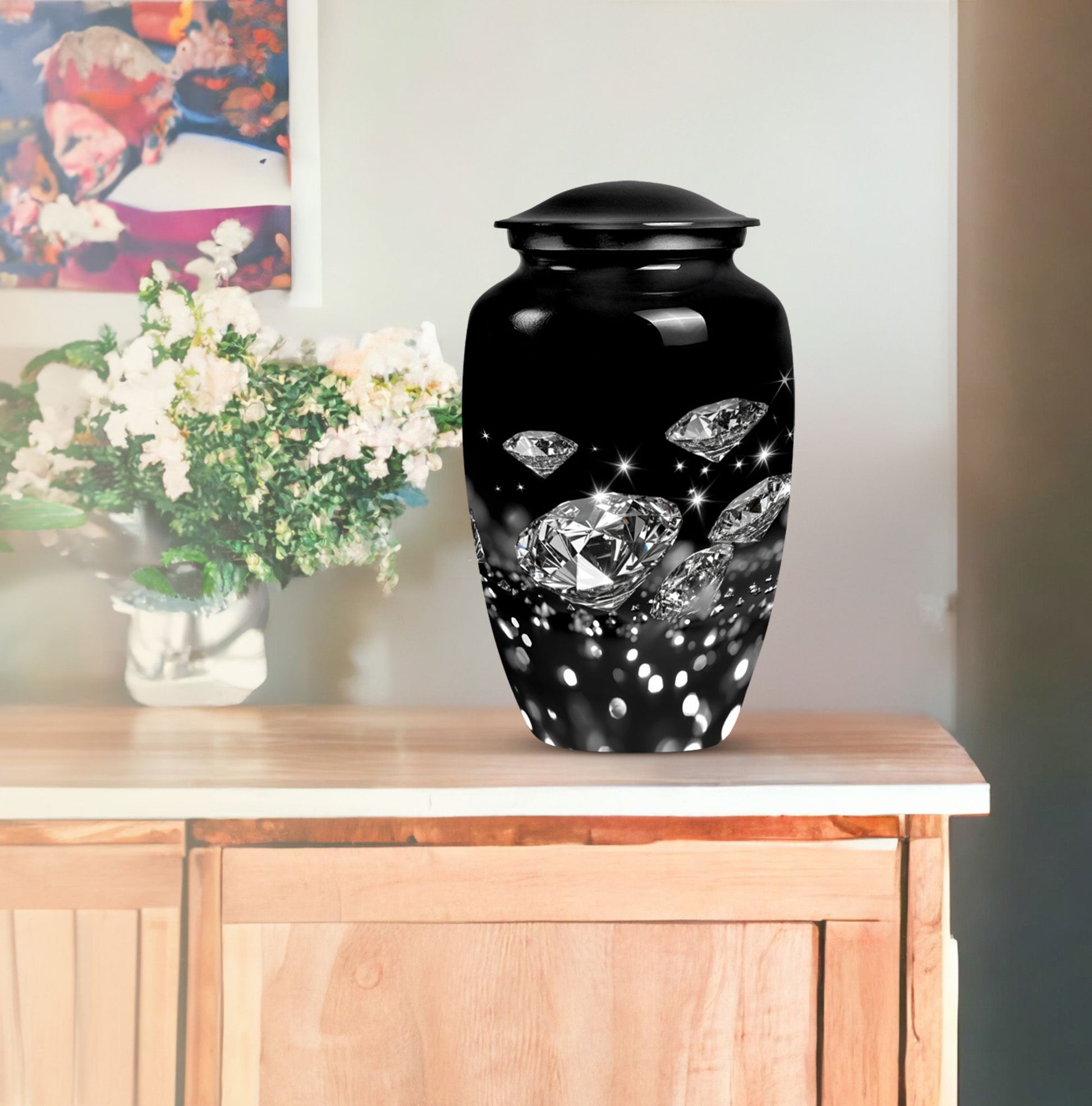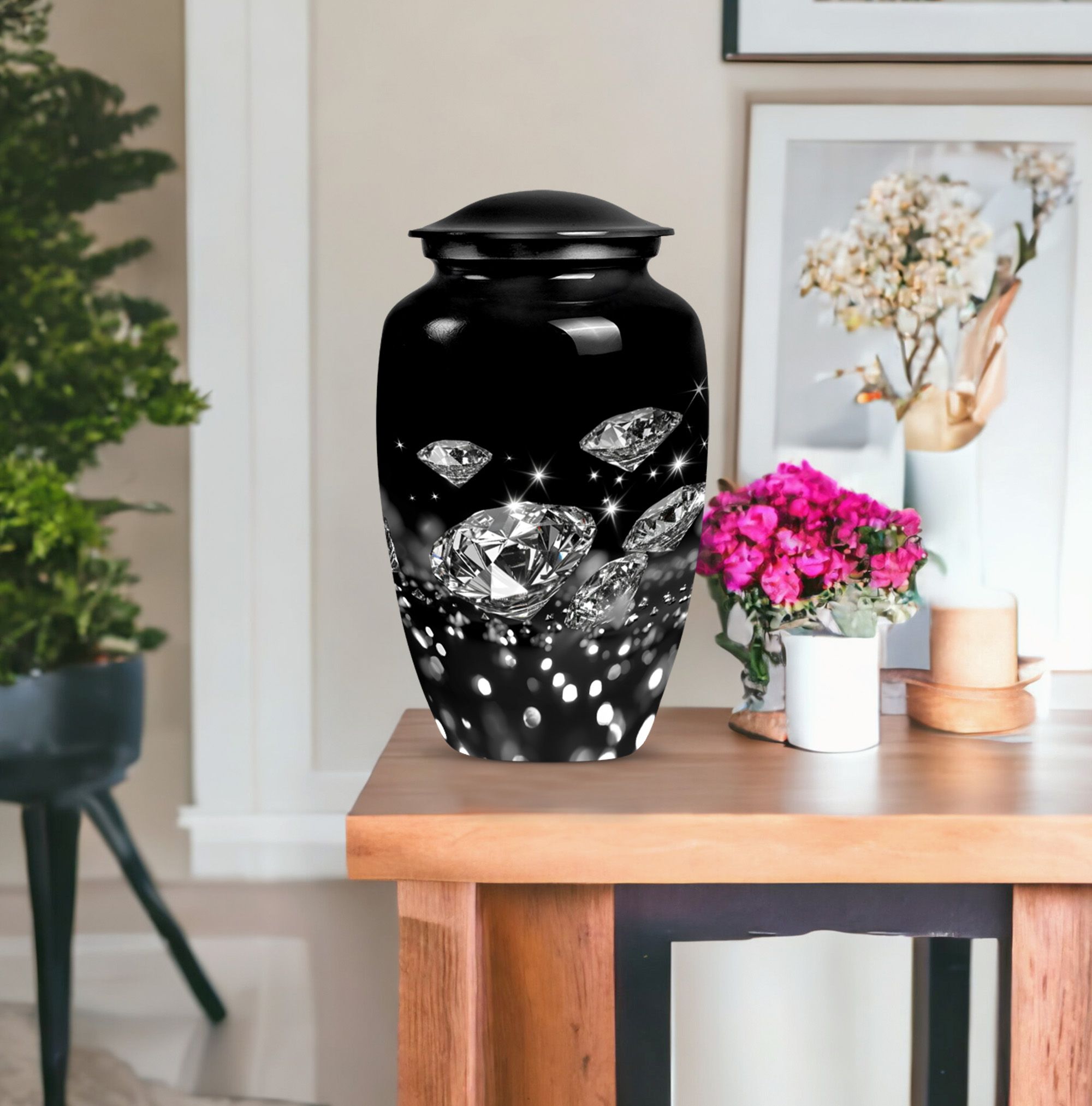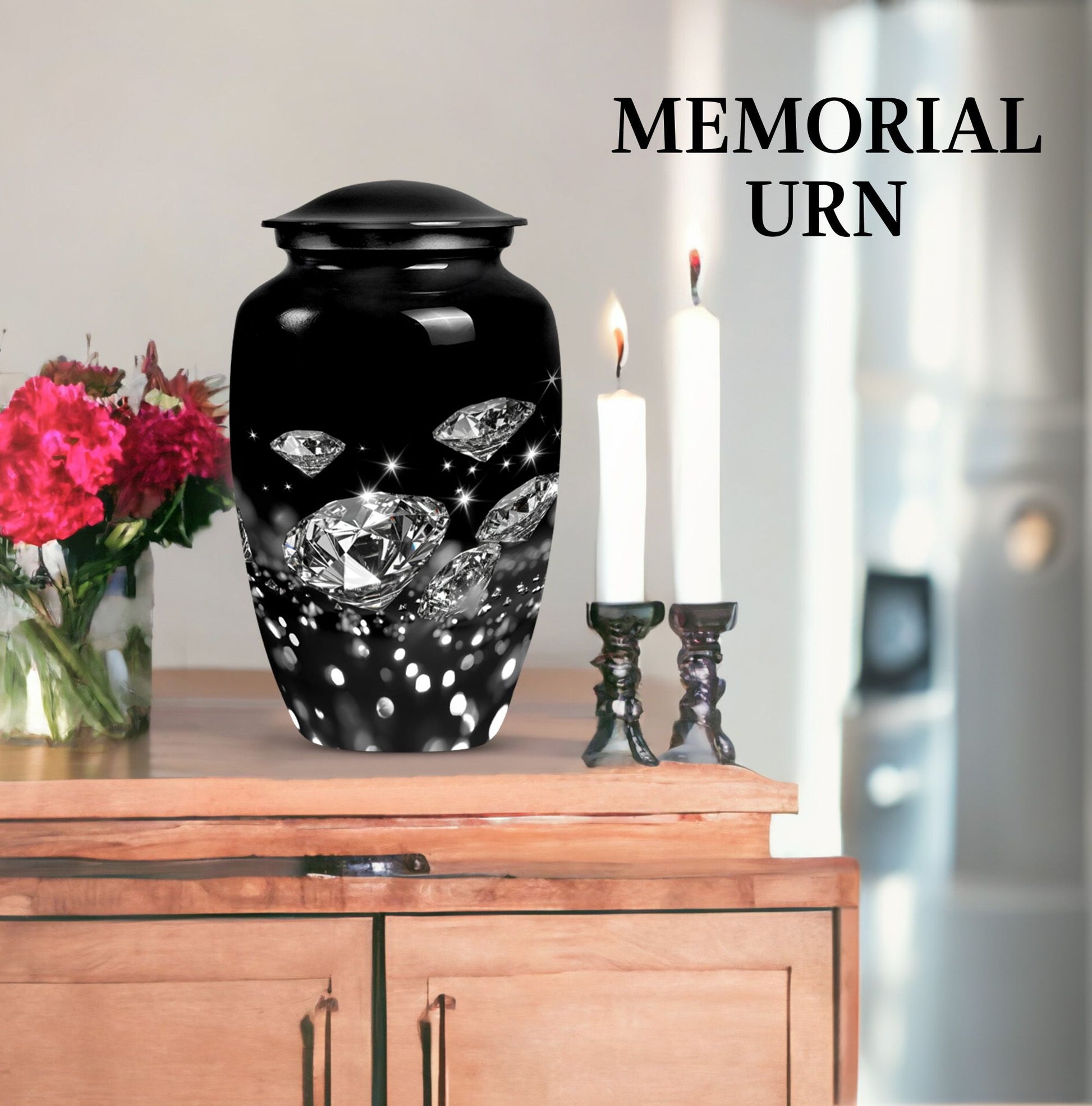 Embrace a tribute of love and honor with this captivating, large burial urn, explicitly designed for your cherished ones as a worthy resting place. This 10-inch, abstract-themed classic urn showcases a refined combination of beauty, durability, and functionality. The urn is crafted from high-quality aluminium, promising longevity and resistance to wear, thus making it an ideal choice for memorial urns. The urn features an ample capacity of 200 cubic inches, suitable to hold the ashes of an adult. Weighing just 3.3 pounds, it is ergonomically designed for easy management. This diamond urn package is completed by a complementary velvet pouch for safe containment of the ashes. You can also personalize this urn with engraved names, adding a bespoke touch to your memorial. Whether you're seeking a cremation urn, an urn for cremation ashes mother, or funeral cremation urn, this product is sure to meet your needs. Note: Product design may vary.