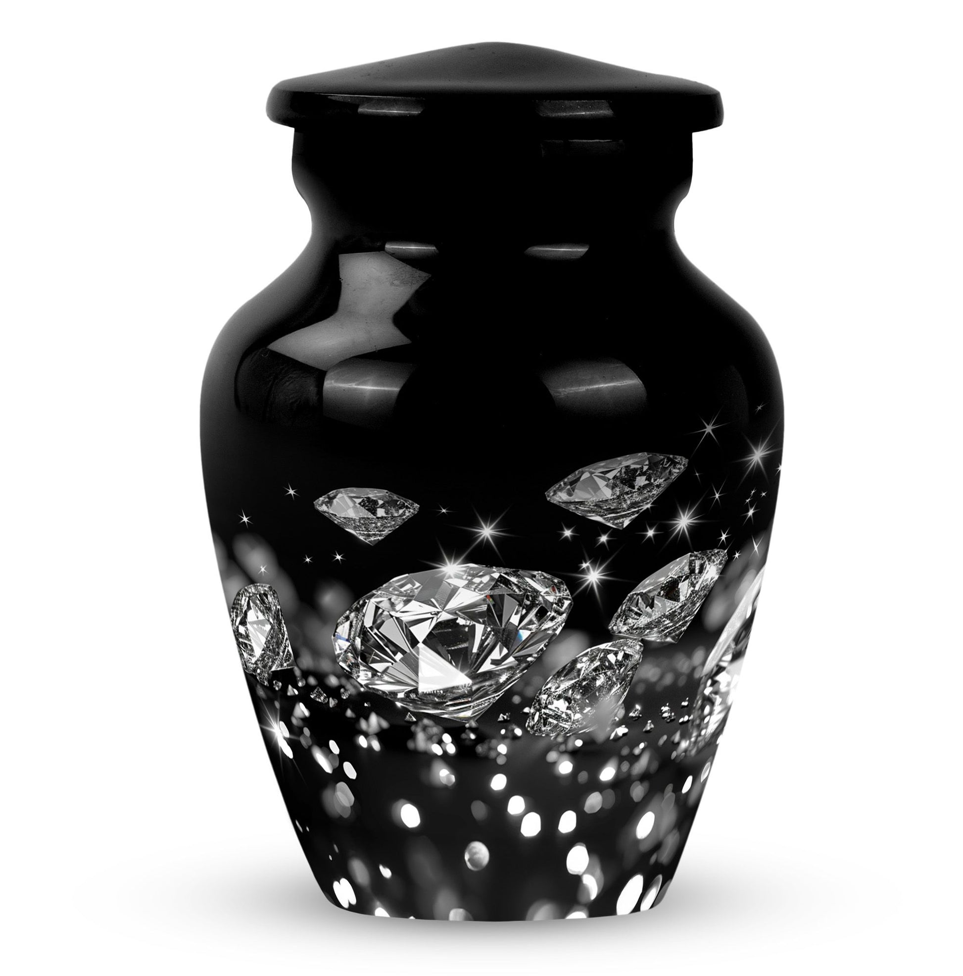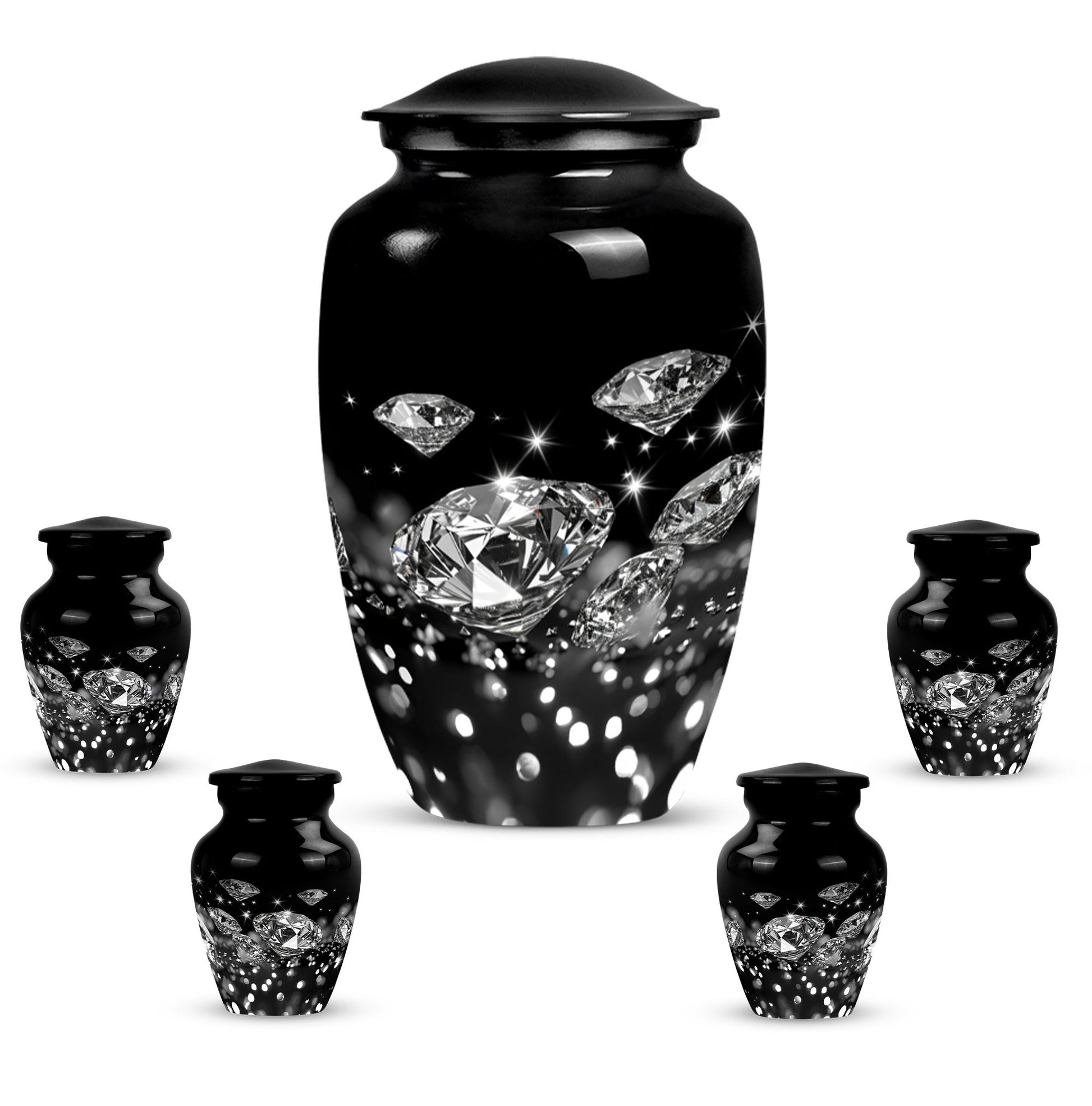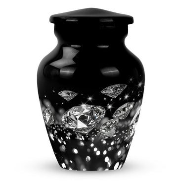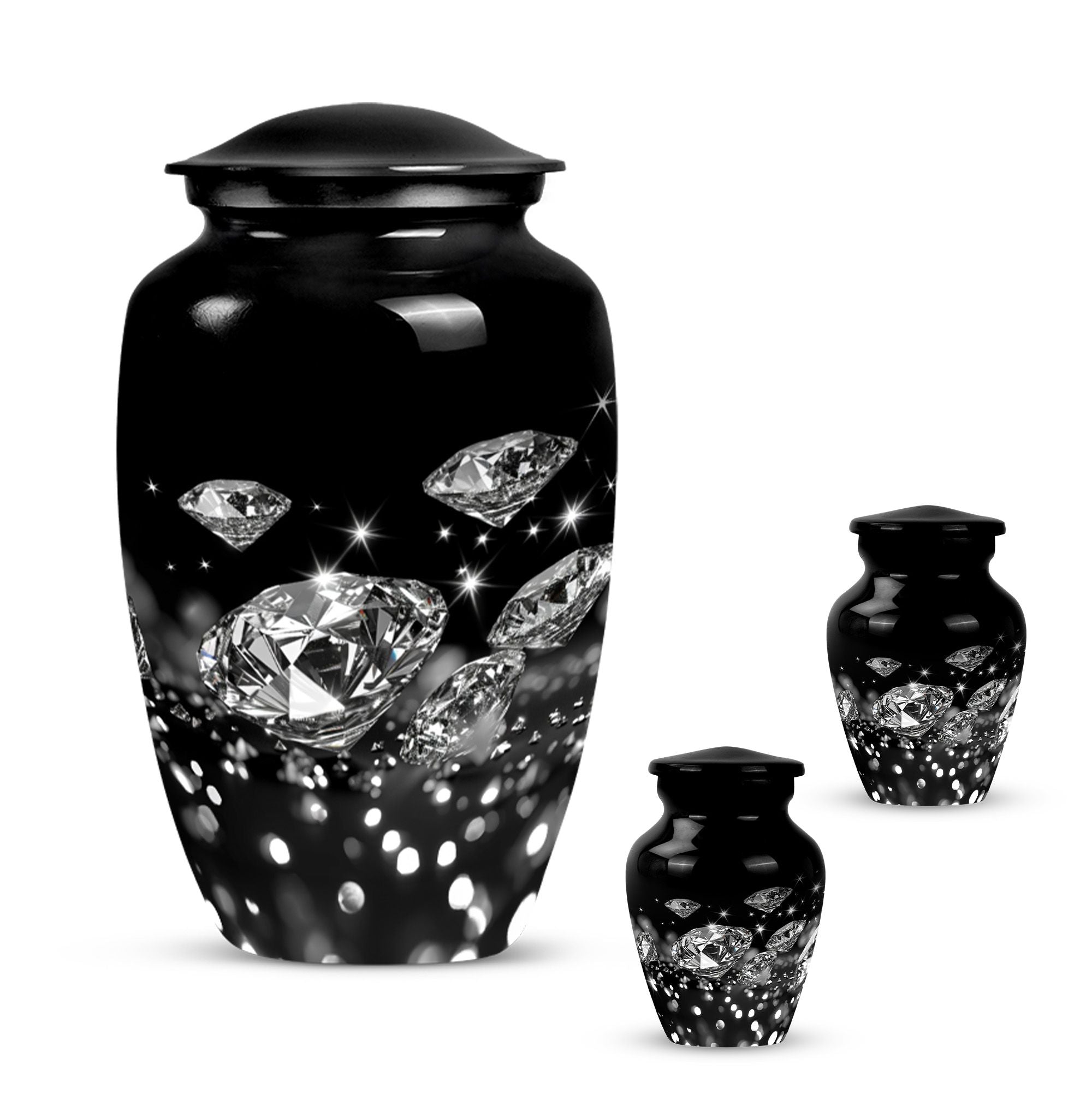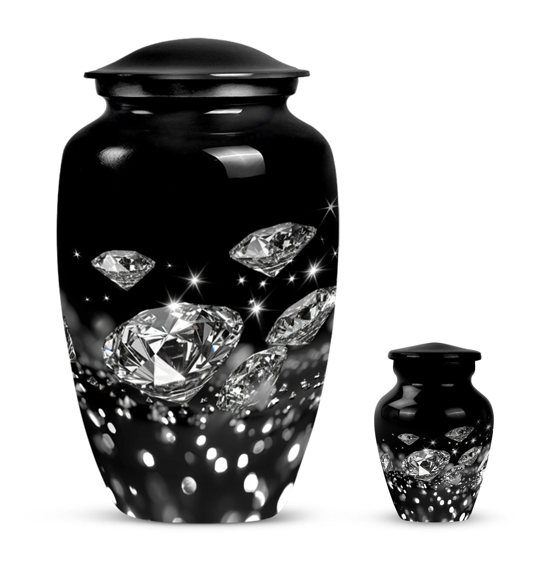 Embrace a tribute of love and honor with this captivating, large burial urn, explicitly designed for your cherished ones as a worthy resting place. This 10-inch, abstract-themed classic urn showcases a refined combination of beauty, durability, and functionality. The urn is crafted from high-quality aluminium, promising longevity and resistance to wear, thus making it an ideal choice for memorial urns. The urn features an ample capacity of 200 cubic inches, suitable to hold the ashes of an adult. Weighing just 3.3 pounds, it is ergonomically designed for easy management. This diamond urn package is completed by a complementary velvet pouch for safe containment of the ashes. You can also personalize this urn with engraved names, adding a bespoke touch to your memorial. Whether you're seeking a cremation urn, an urn for cremation ashes mother, or funeral cremation urn, this product is sure to meet your needs. Note: Product design may vary.