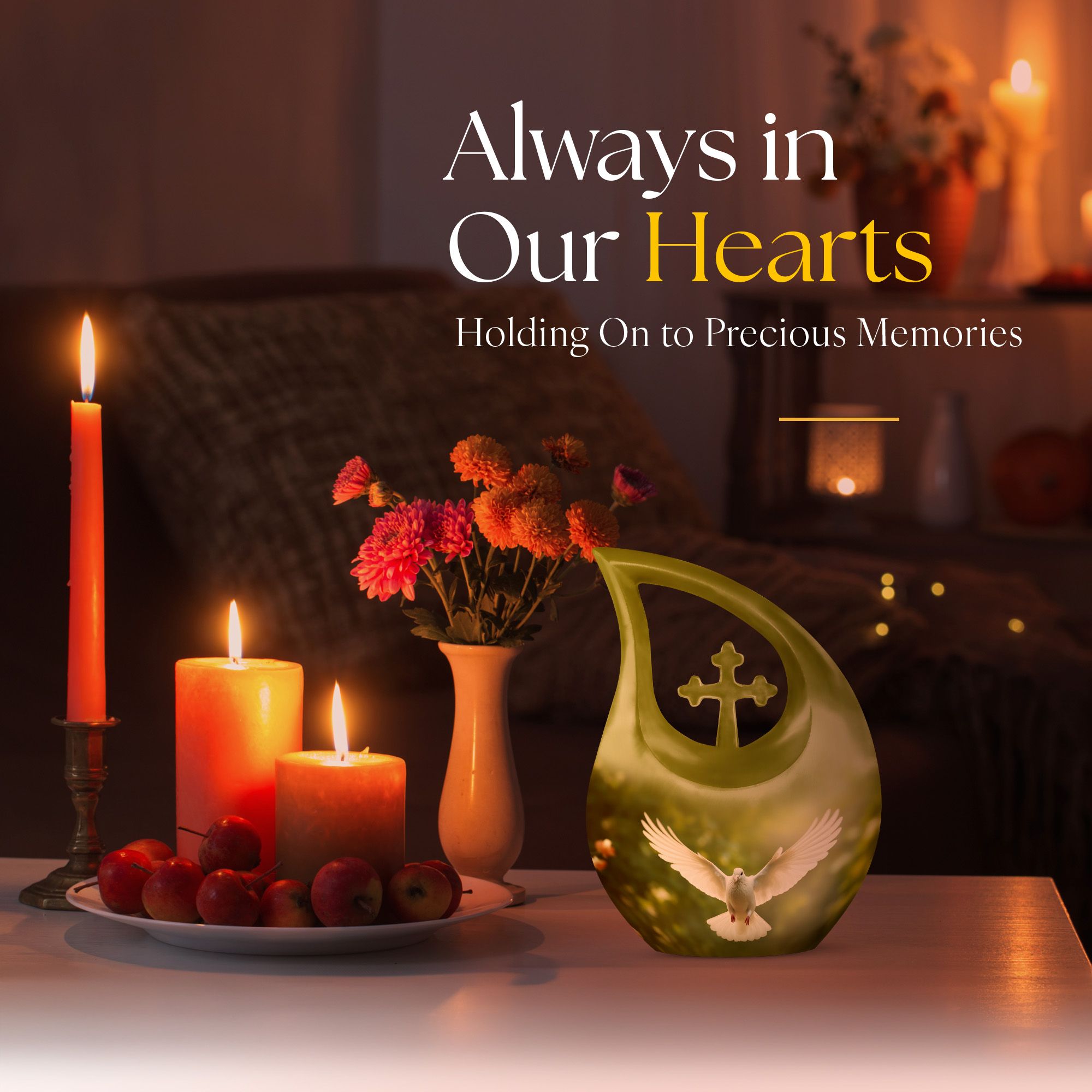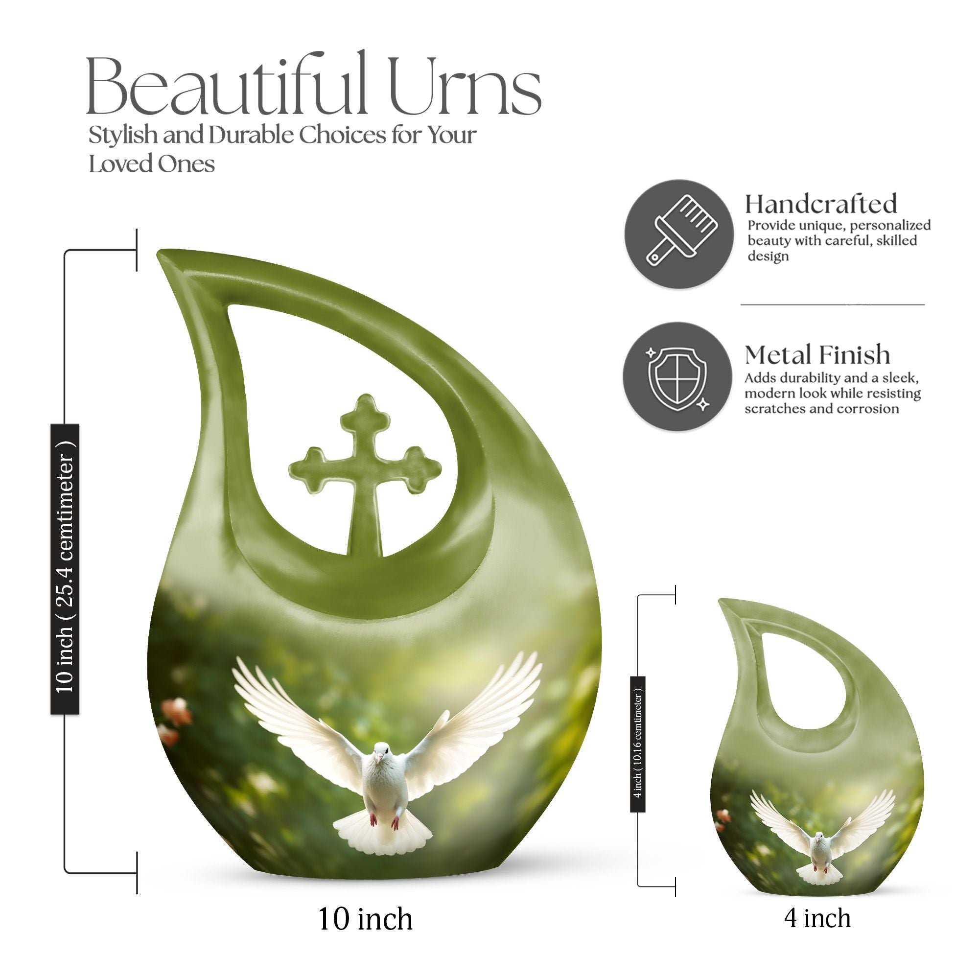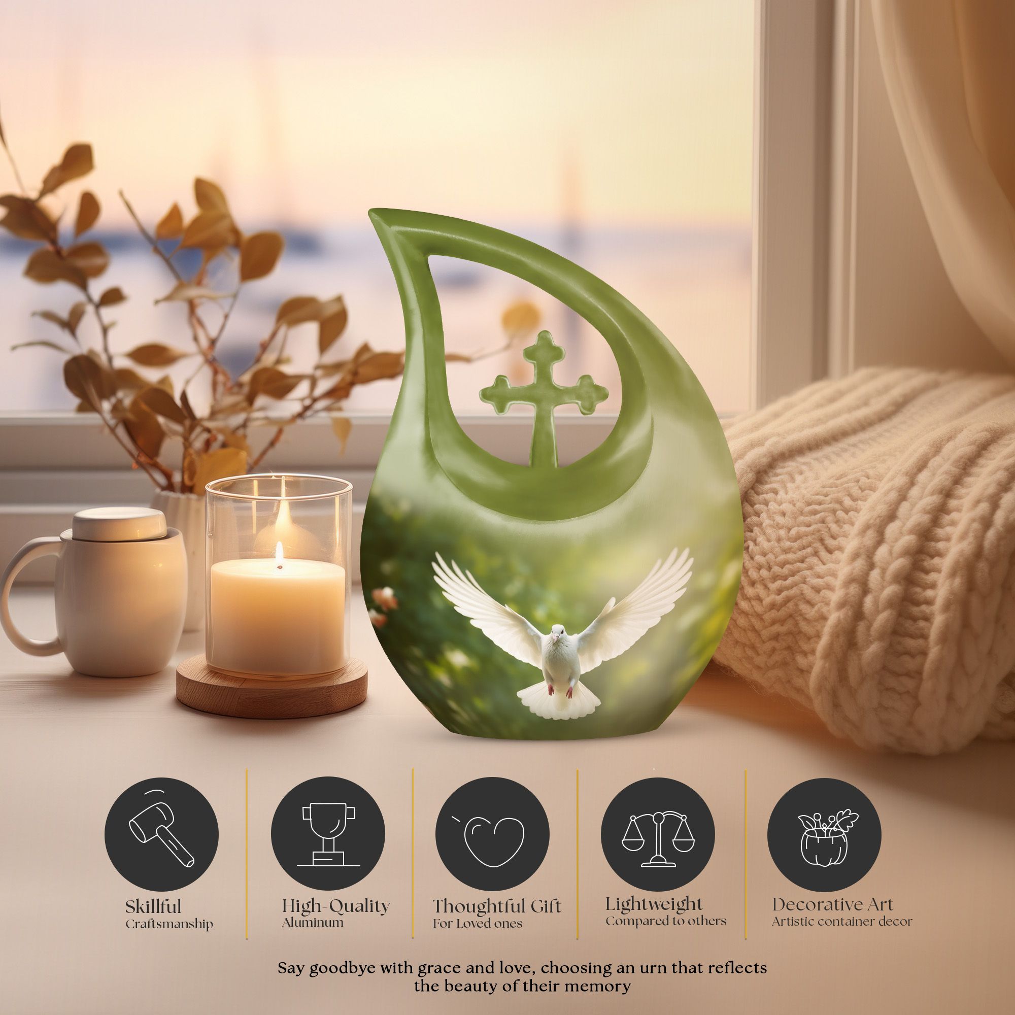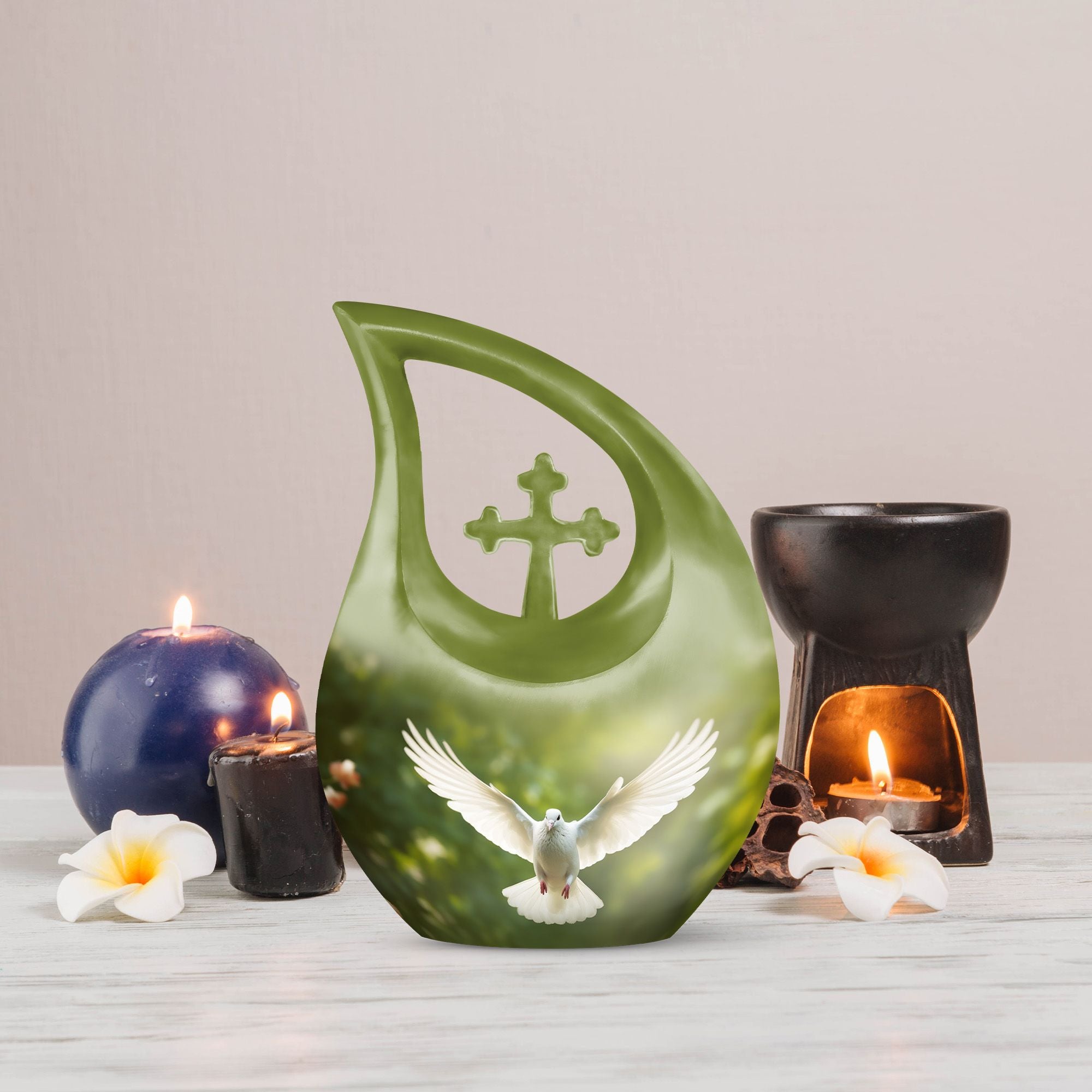 Celebrate a life of love and kindness with this Dove Cremation Urn for Ashes, a touching symbol of peace and eternal rest. The soft sage green hue and elegant dove motif reflect renewal and hope, making it a comforting choice for honoring a beloved parent or family member. This urn serves as a meaningful tribute among large adult urns for human ashes and large human urns collections, offering both beauty and comfort to those who remember.