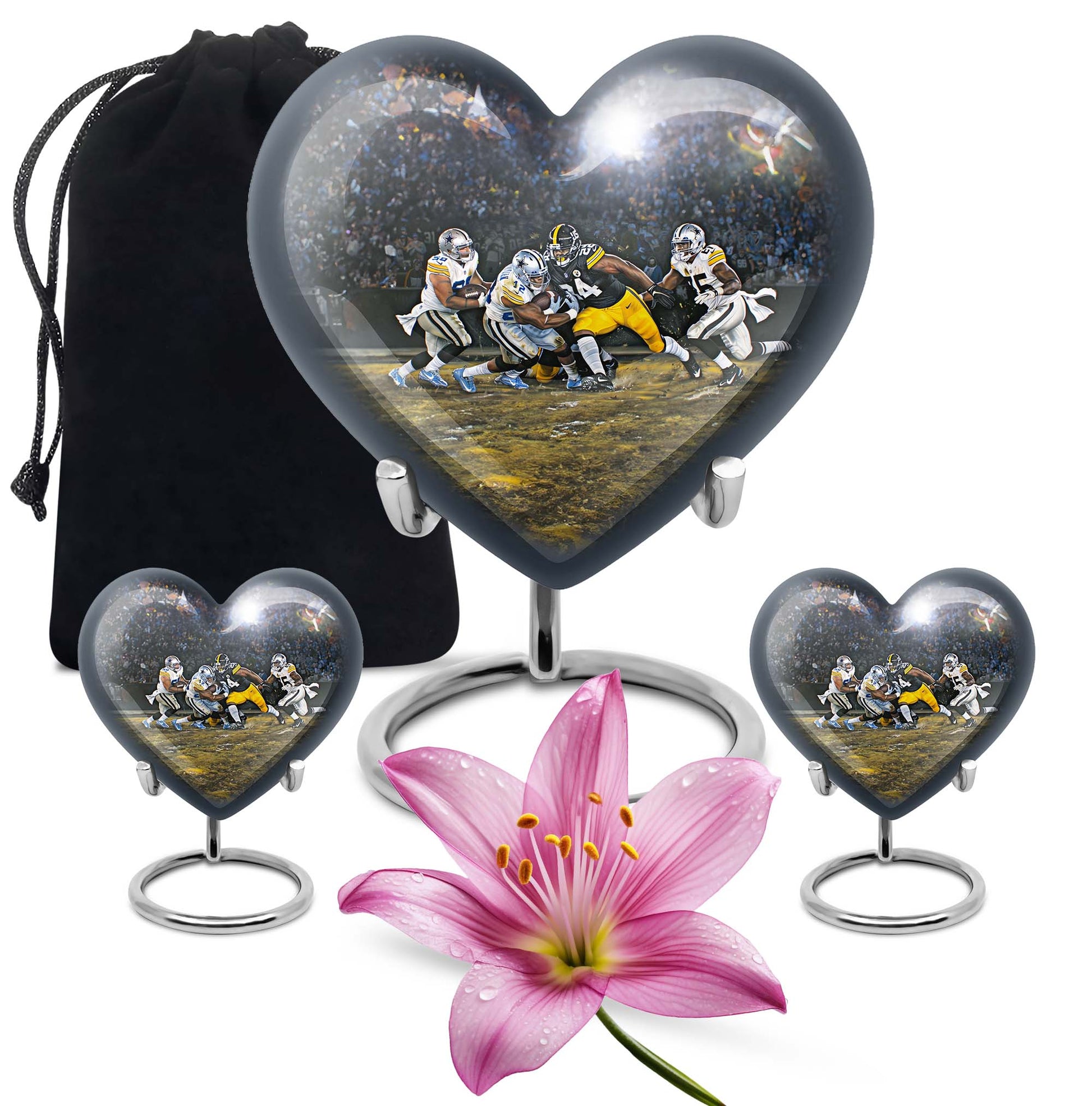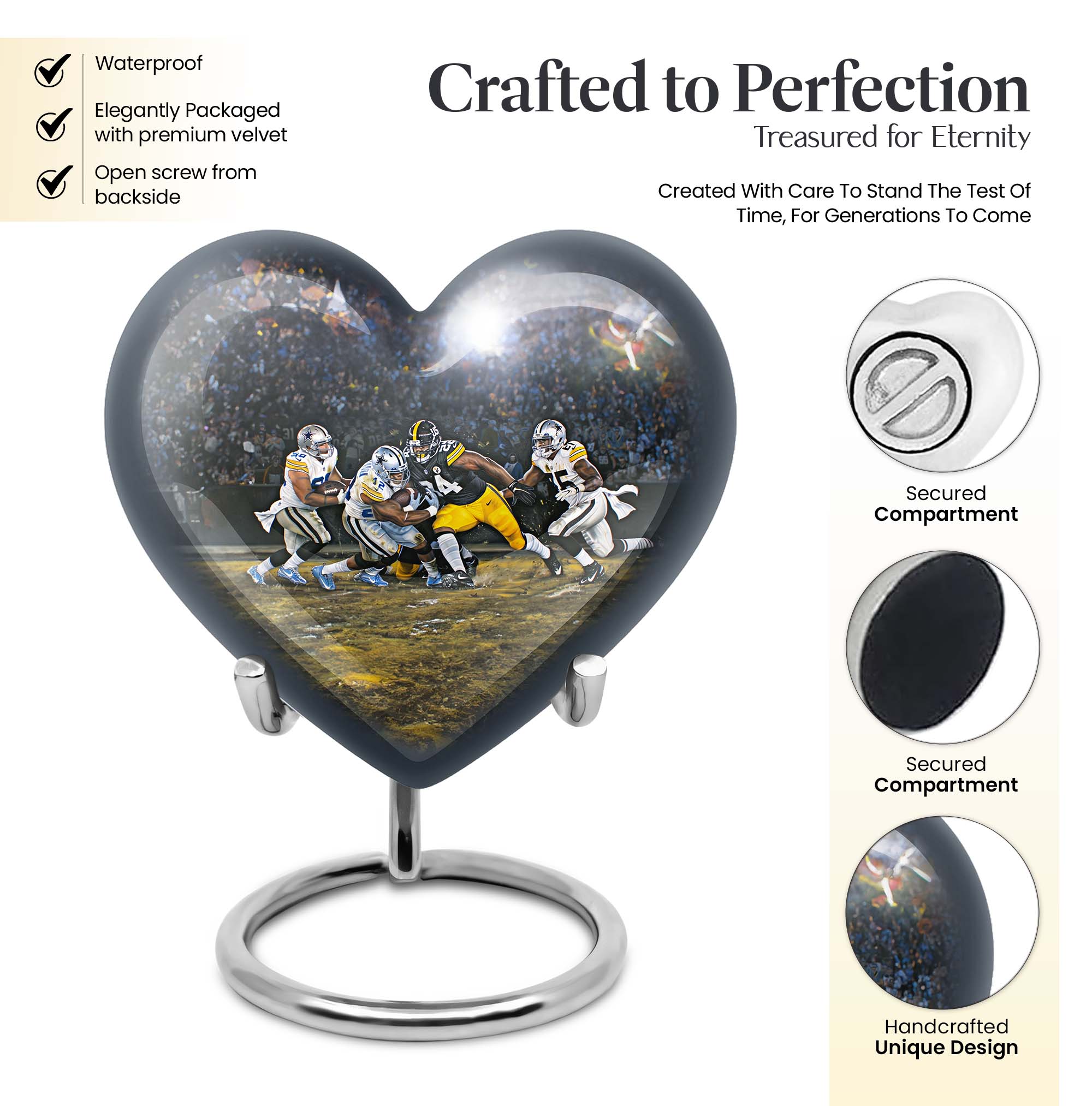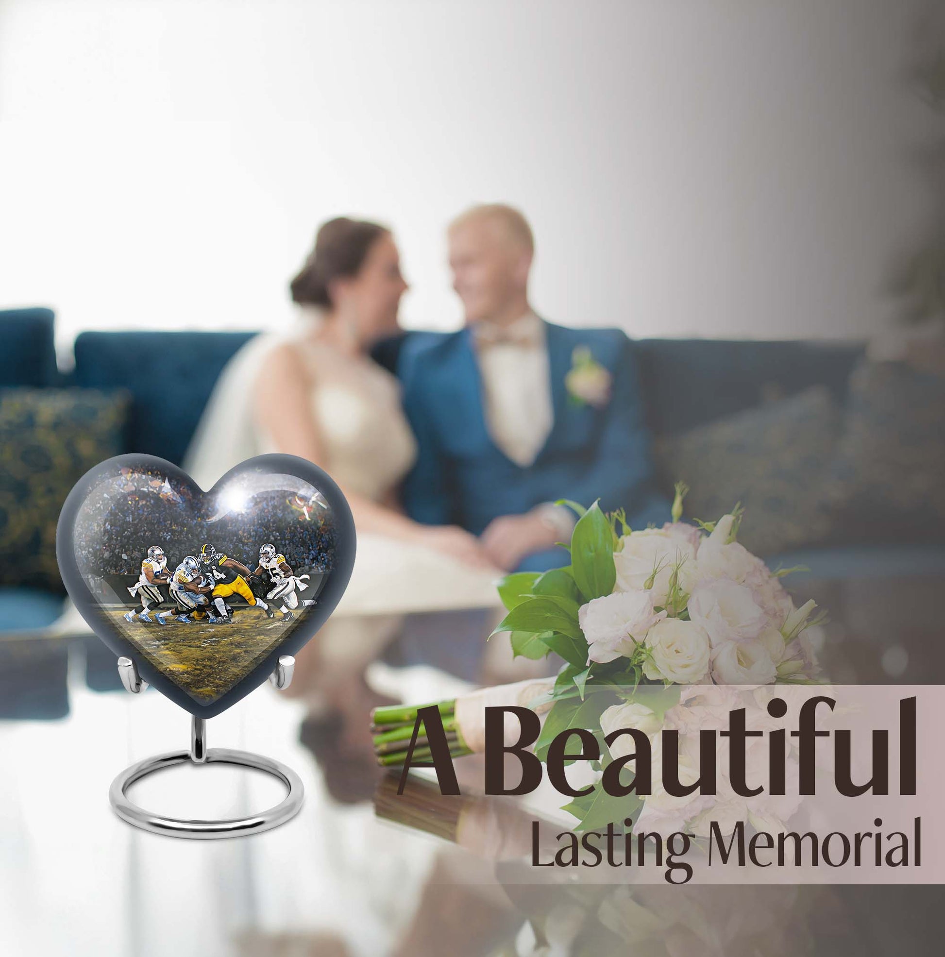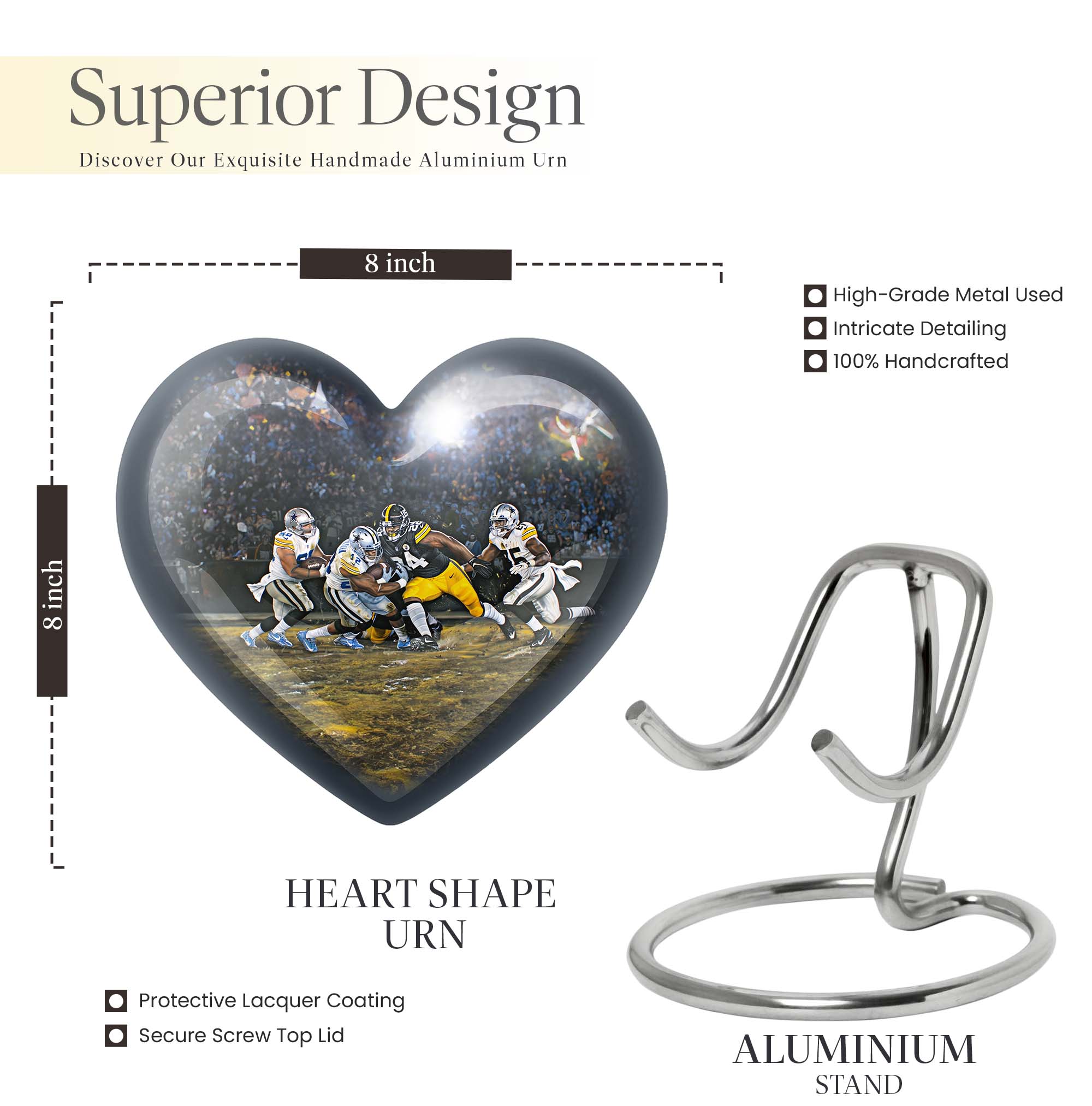 Discover a uniquely crafted memorial urn that combines both beauty and tribute to your loved ones. Our stunning heart urn measures 10 inches in size, shaped abstractly capturing your affection in an everlasting form. This large urn presents not only a significant capacity of 200 cubic inches but also the substance weighing 3.3 pounds - a testament to its durability and substantiality. Constructed from high-quality aluminium, it meticulously stores your burial ashes with undeniable security. This memorial urn arrives with a soft velvet pouch, especially suitable for ensuring the containment of ashes. A poignant feature of our urns for cremation ashes is the personalization option - engrave names according to your preferences to create a forever memorial. Amidst the football urns and cremation funeral urns for adult ashes, our heart urn stands out, honoring your dearly departed with style and sophistication.