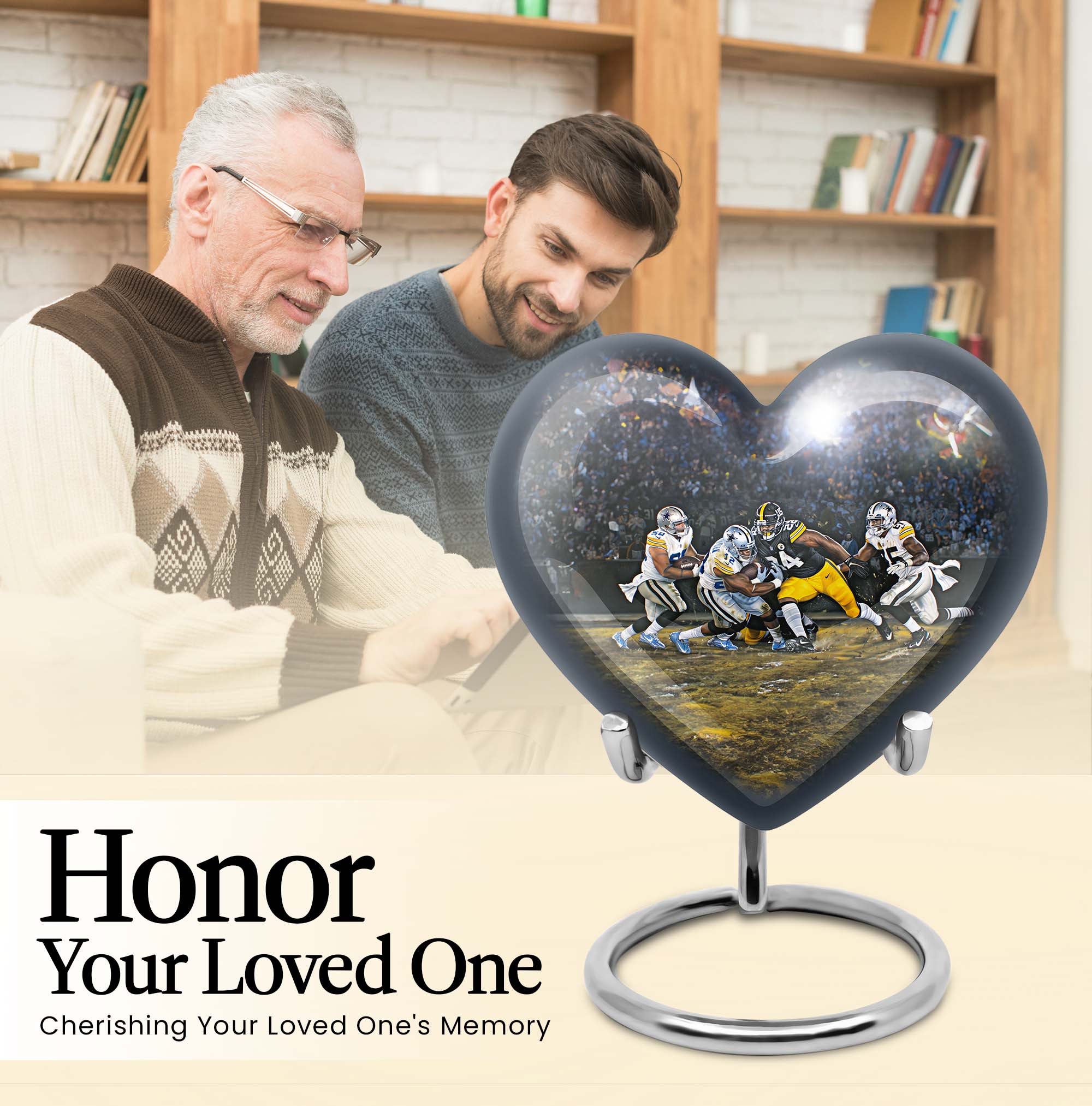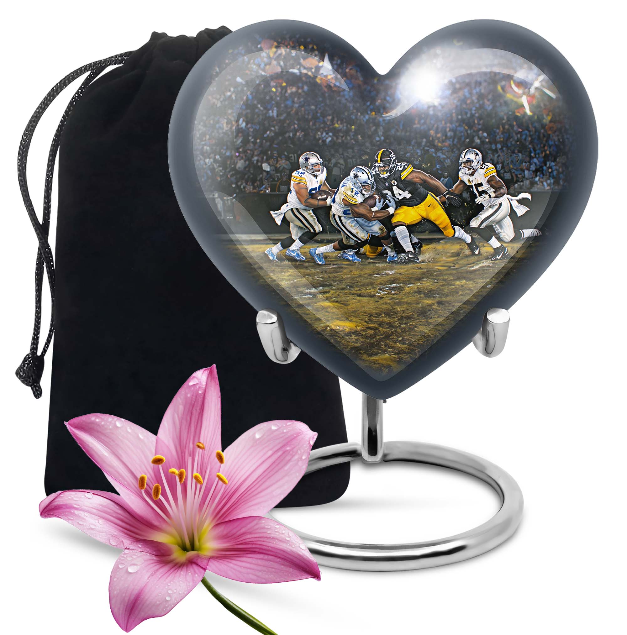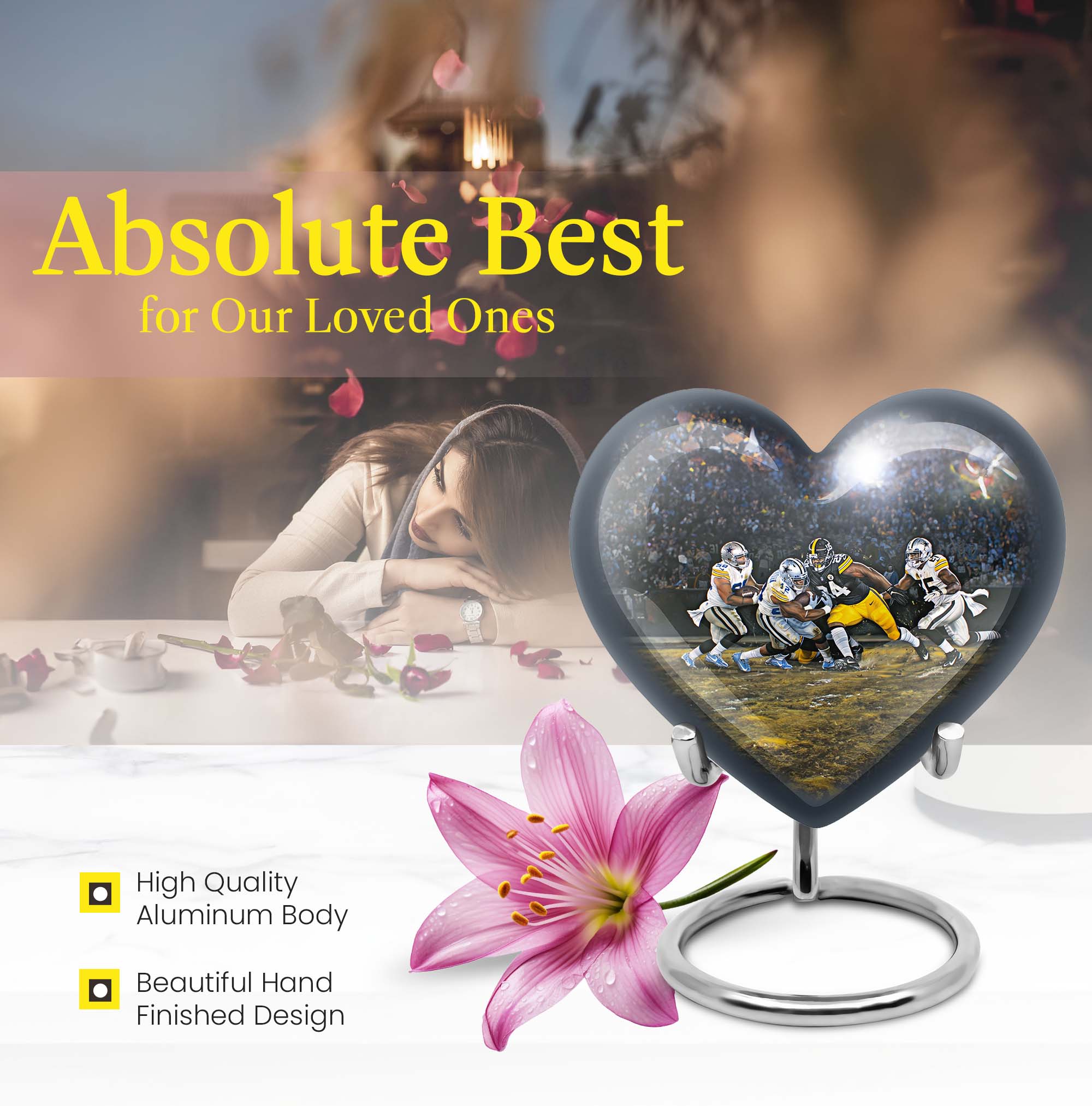 Discover a uniquely crafted memorial urn that combines both beauty and tribute to your loved ones. Our stunning heart urn measures 10 inches in size, shaped abstractly capturing your affection in an everlasting form. This large urn presents not only a significant capacity of 200 cubic inches but also the substance weighing 3.3 pounds - a testament to its durability and substantiality. Constructed from high-quality aluminium, it meticulously stores your burial ashes with undeniable security. This memorial urn arrives with a soft velvet pouch, especially suitable for ensuring the containment of ashes. A poignant feature of our urns for cremation ashes is the personalization option - engrave names according to your preferences to create a forever memorial. Amidst the football urns and cremation funeral urns for adult ashes, our heart urn stands out, honoring your dearly departed with style and sophistication.