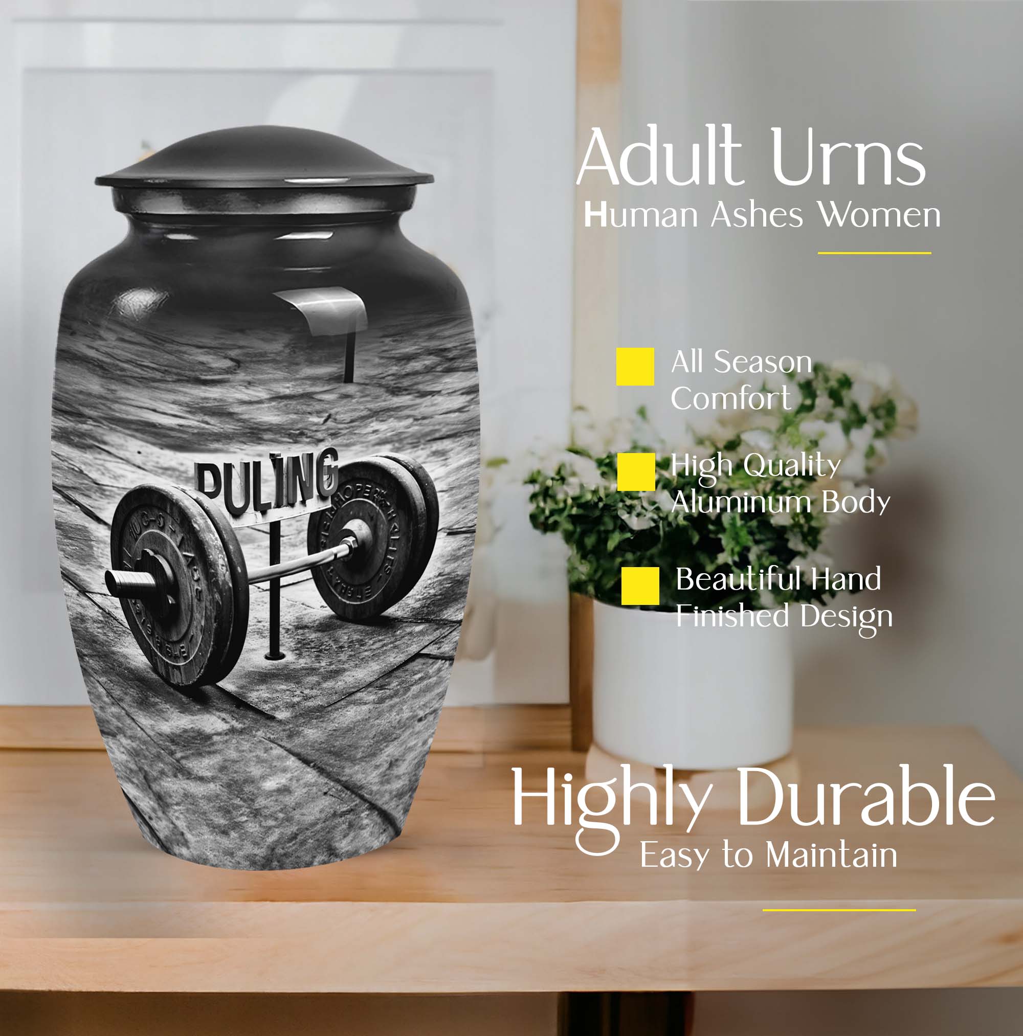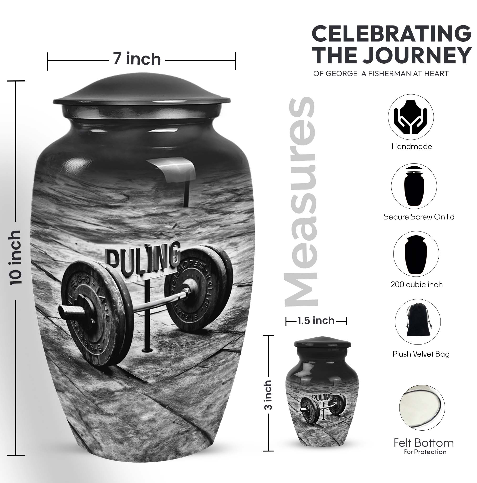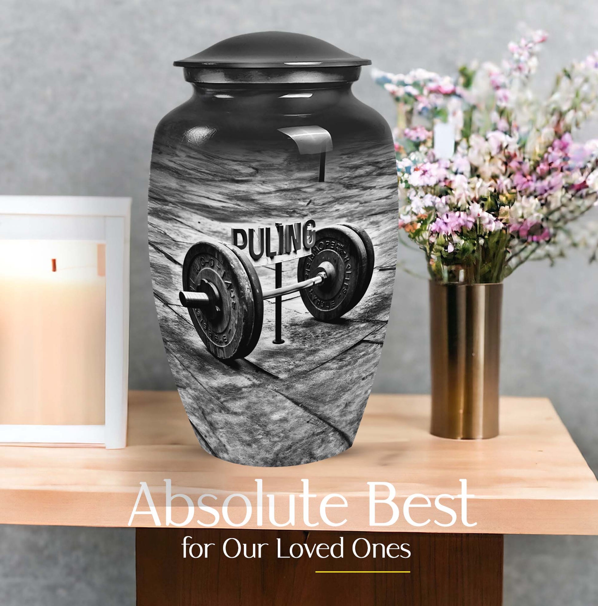 Celebrate the memory of a departed loved one in a dignified manner with our exquisite Dumbles Urn. This visually appealing urn, measuring 10 inches in height, is robust and spacious, having a capacity of 200 cubic inches, making it suitable for holding ashes of adults. Weighing in at 3.3 pounds, it is constructed from high-quality Aluminium, ensuring endurance and easy maintainability. Our product speaks volumes about your affection towards the departed, acting as a meaningful sentimental memento. It also comes with a charming velvet pouch for secure containment of ashes. Further adding a personal touch, customize this memorial funeral urn with engraved names. The abstract theme complements its classic design and serves to present a serene tribute. This product, which belongs to our collection of large urns, is more than just a utilitarian object; it is a token of treasured memories. Among memorial urns, this is perfectly suited for those seeking profound symbolism and pragmatic use. Note: Terms like 'funeral urns for burial,' 'human ash urns,' 'urns for human ashes,' and 'mom cremation urn' are relevant for users interested in this category.