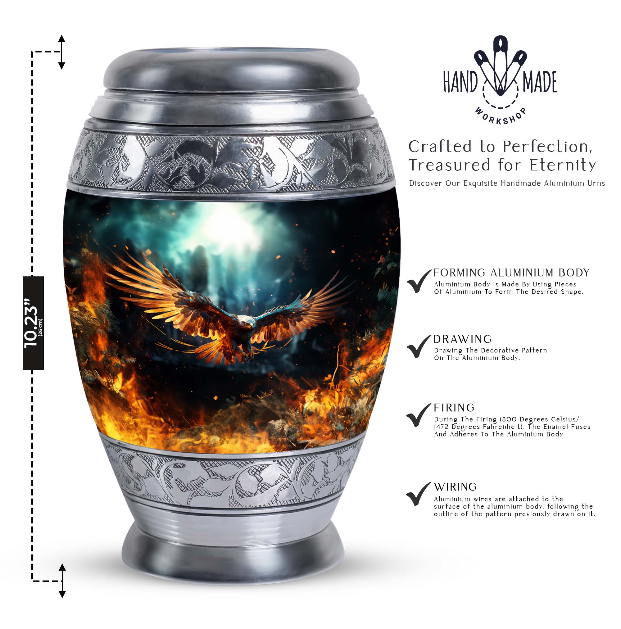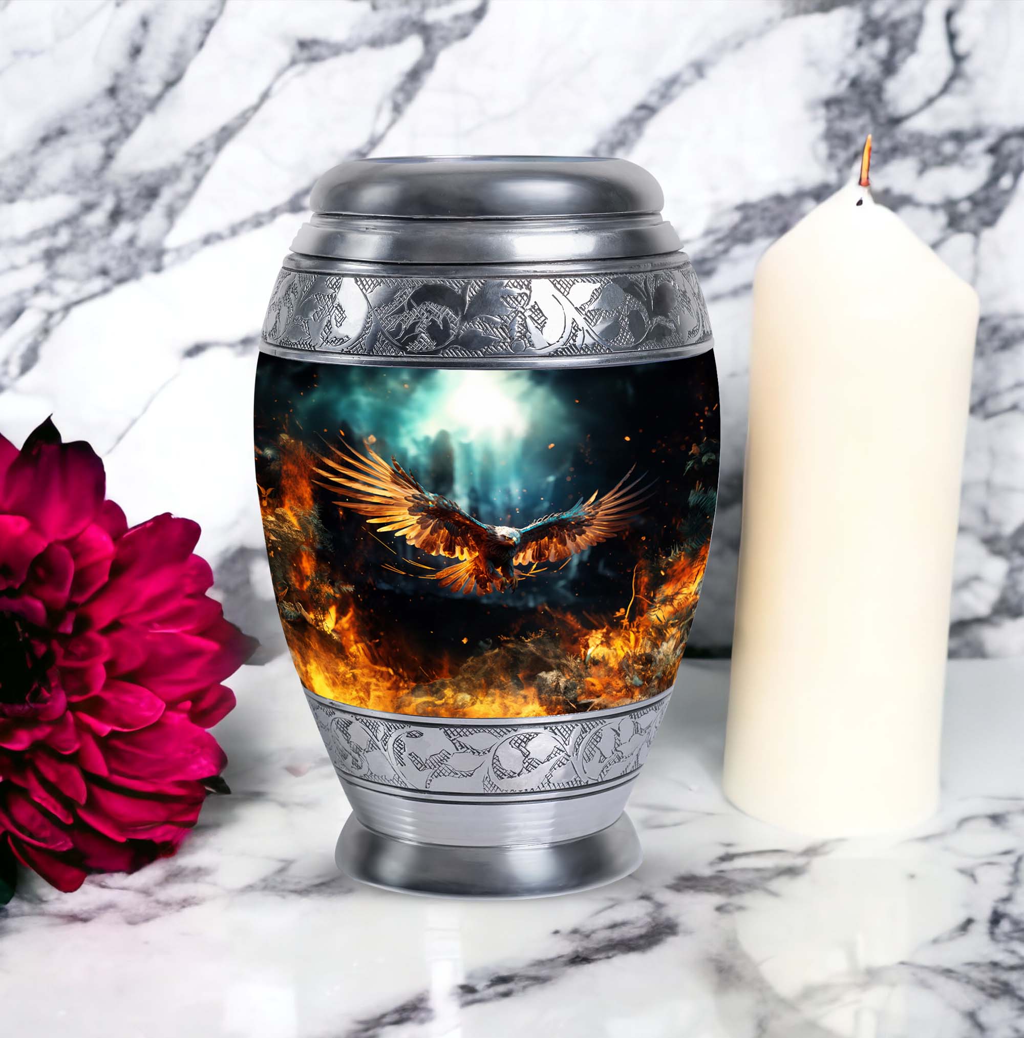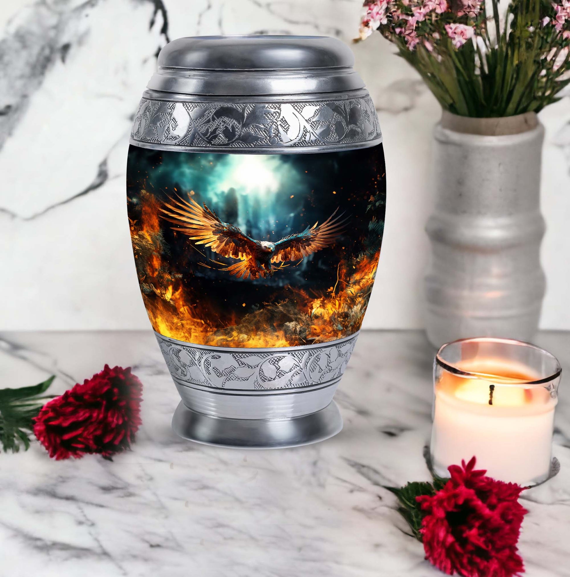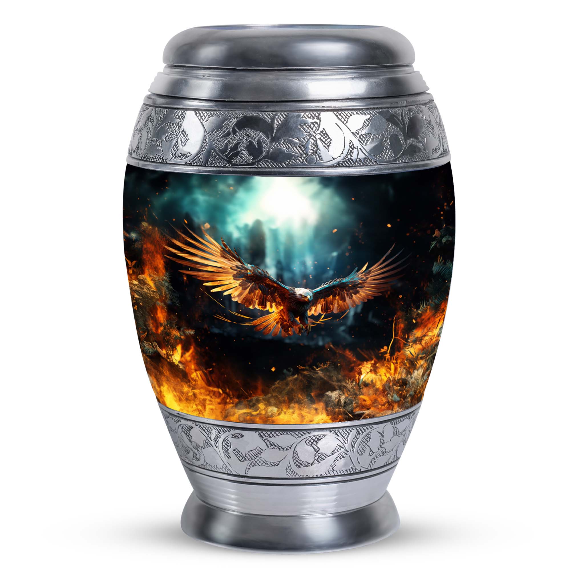 Preserve the memory of your departed loved ones with our bespoke Eagle Urns for Human Ashes. This large urn, beautifully crafted from durable aluminium, stands at 10 inches in height and carries a substantial weight of 3.3 pounds. Its intricate, classic urn design is a testament to the outstanding craftsmanship, and its spacious interior boasts a capacity of 200 cubic inches to securely hold the cremation ashes. The urn also comes with a complementary velvet pouch, providing an elegant and respectful containment for the ashes. Furthermore, we offer customization options allowing you to personalize this cremation urn with engraved names, adding a heartfelt touch. This urn, although small in size at only 3 inches, is incredibly big in meaning. It serves as a timeless memorial, embodying love and respect. Whether you're looking for modern urns for ashes or personalized urns, this versatile metal urn meets your specific needs. Our goal is to provide a respectful and noble final resting place for those who have passed on.