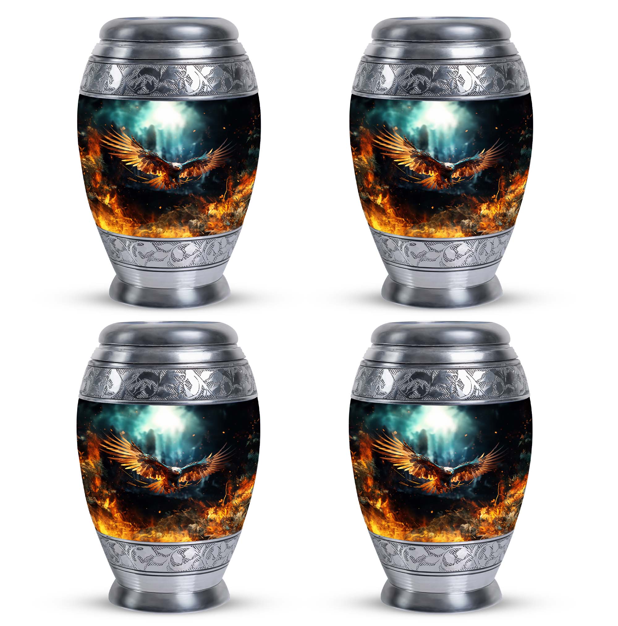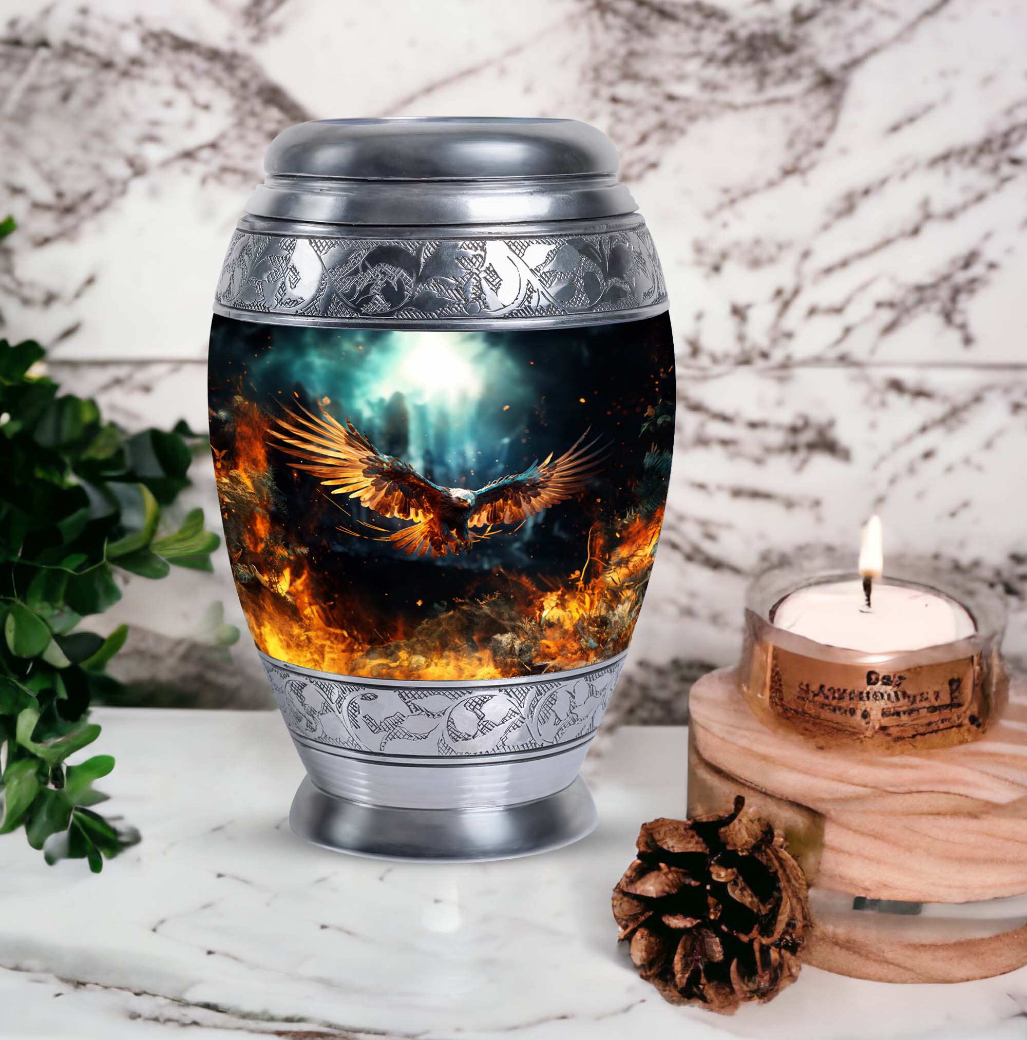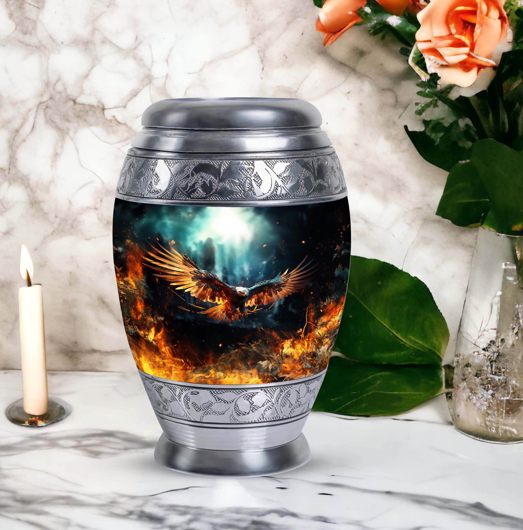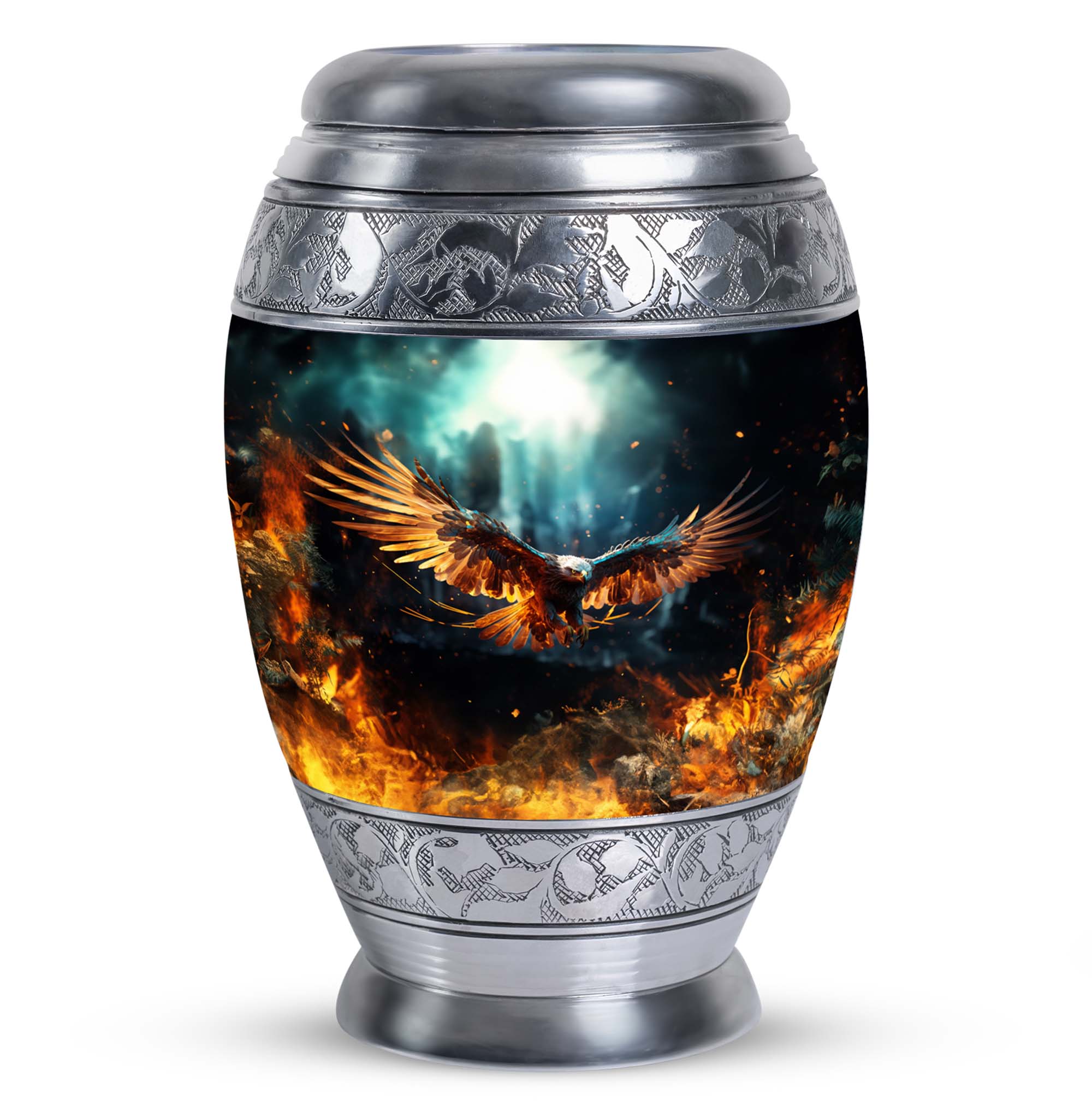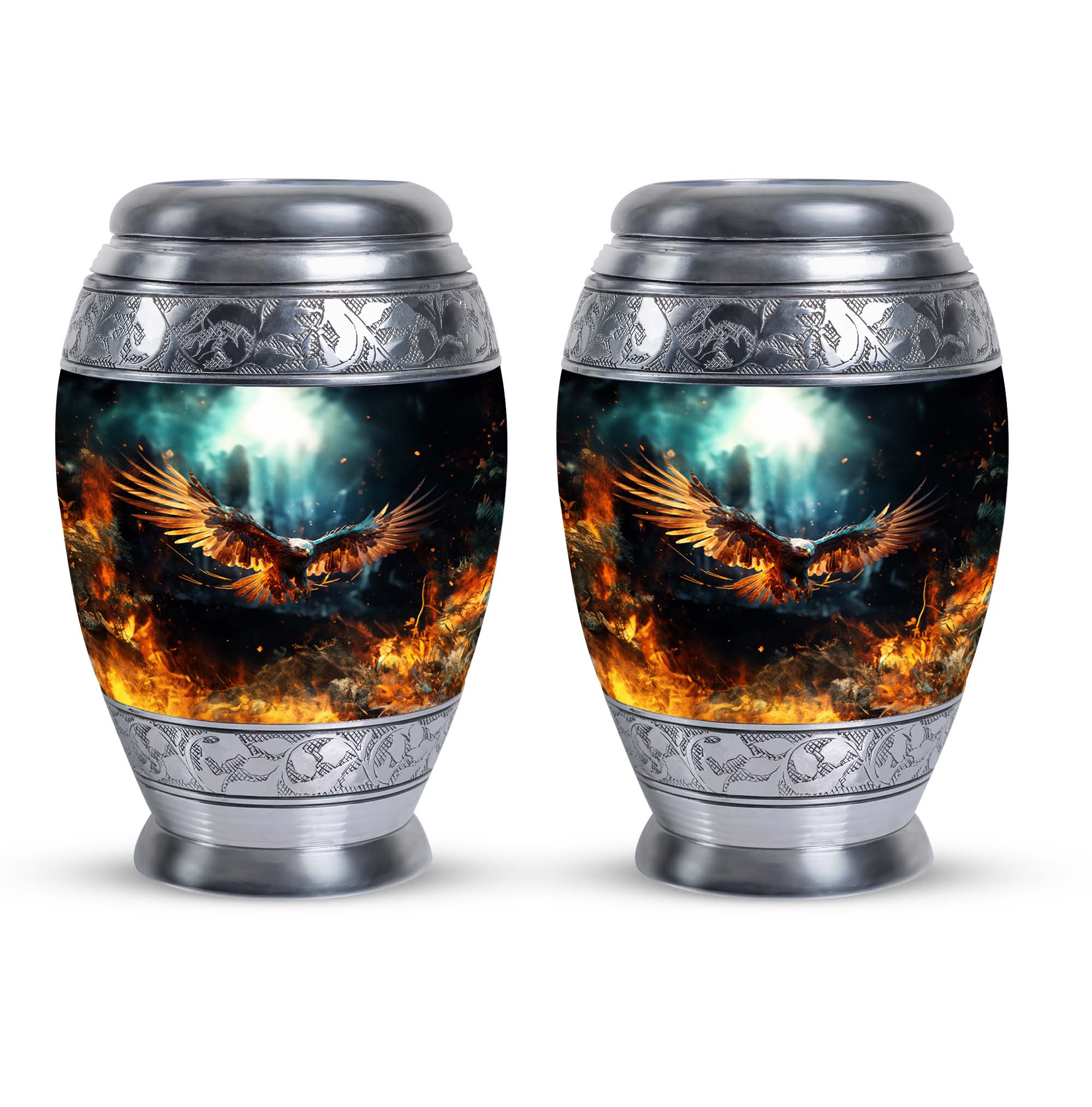 Preserve the memory of your departed loved ones with our bespoke Eagle Urns for Human Ashes. This large urn, beautifully crafted from durable aluminium, stands at 10 inches in height and carries a substantial weight of 3.3 pounds. Its intricate, classic urn design is a testament to the outstanding craftsmanship, and its spacious interior boasts a capacity of 200 cubic inches to securely hold the cremation ashes. The urn also comes with a complementary velvet pouch, providing an elegant and respectful containment for the ashes. Furthermore, we offer customization options allowing you to personalize this cremation urn with engraved names, adding a heartfelt touch. This urn, although small in size at only 3 inches, is incredibly big in meaning. It serves as a timeless memorial, embodying love and respect. Whether you're looking for modern urns for ashes or personalized urns, this versatile metal urn meets your specific needs. Our goal is to provide a respectful and noble final resting place for those who have passed on.