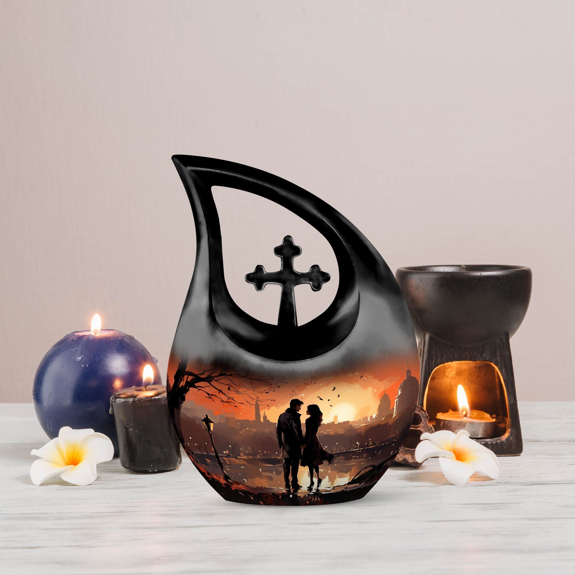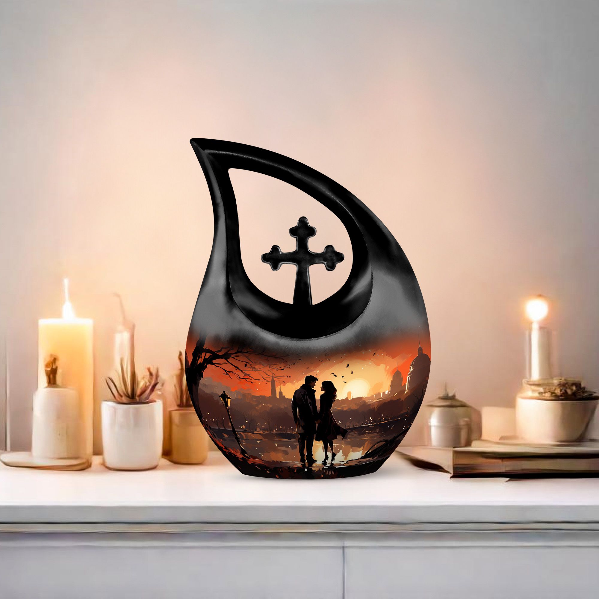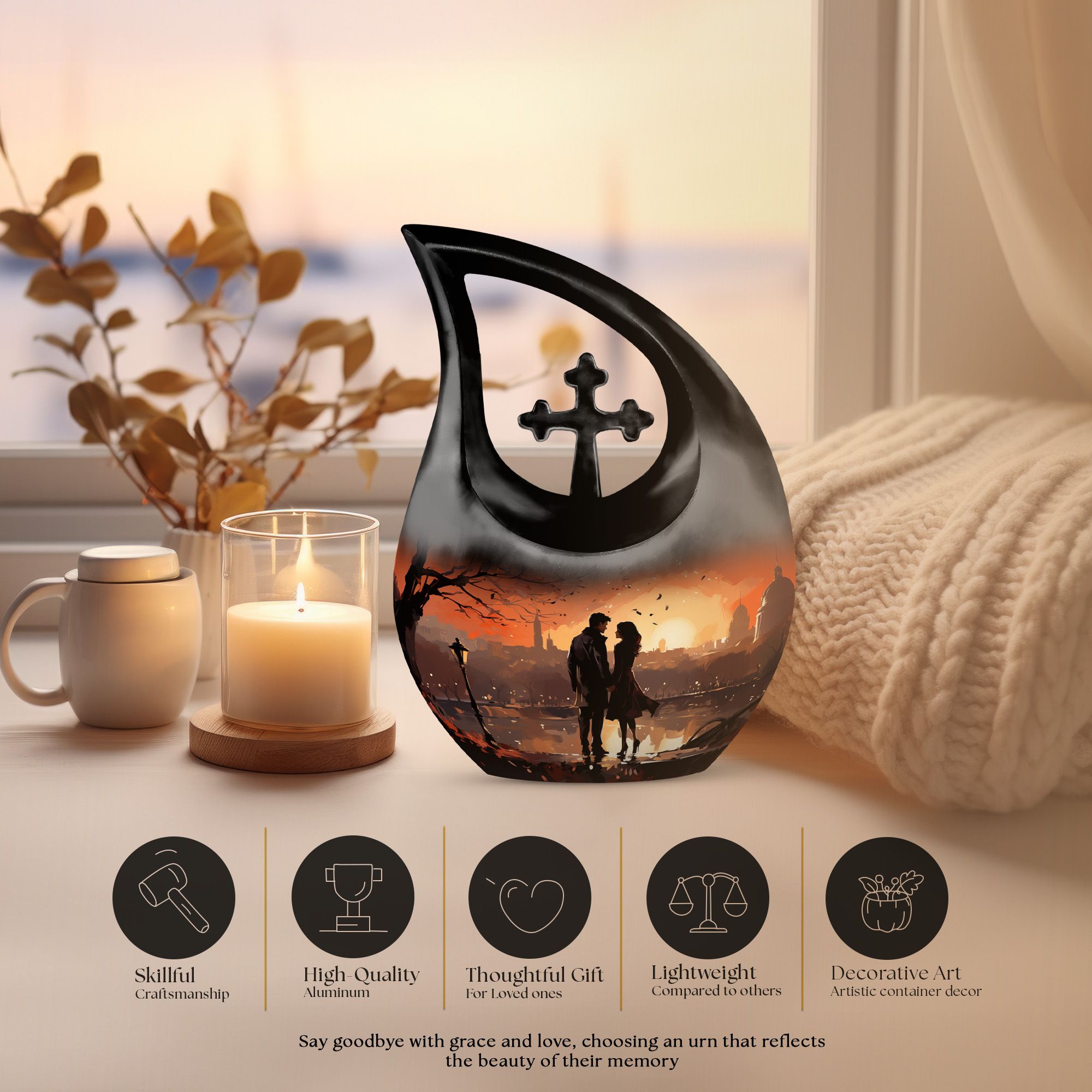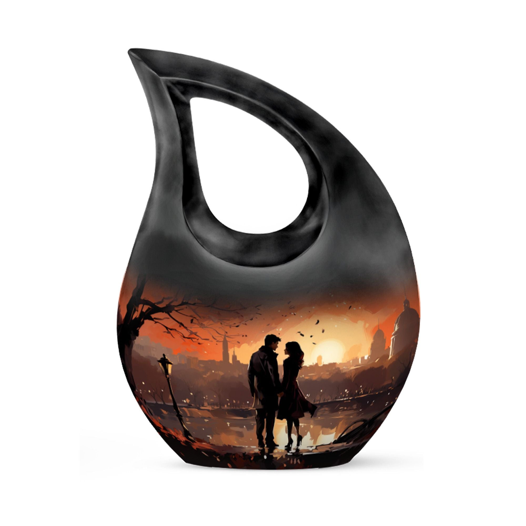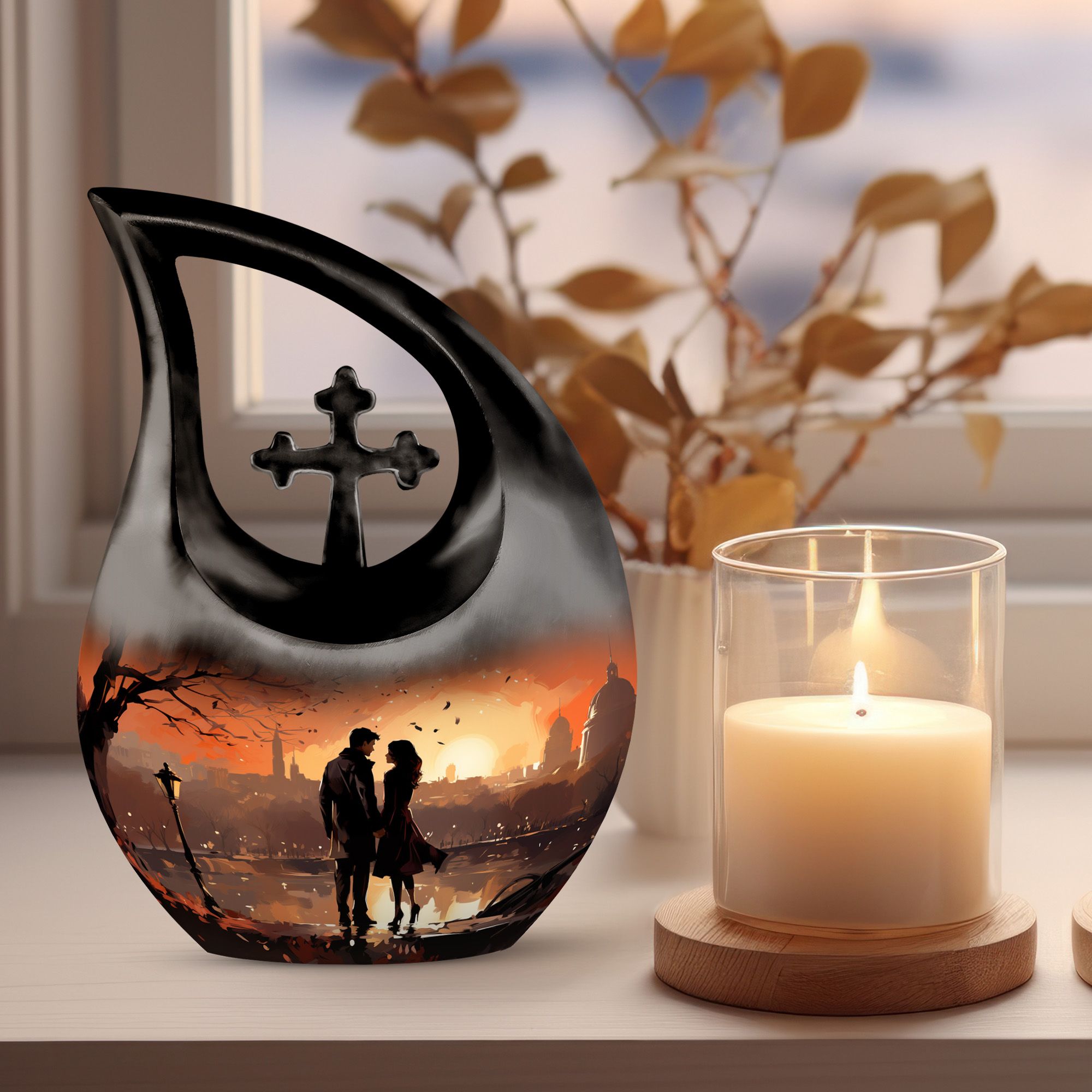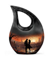 Celebrate a journey shared in love with the Couple Motif Urn for Lovers – Sunset Memorial Ashes Urn. This peaceful and romantic design captures two figures walking together beneath a radiant sunset sky, making it a meaningful choice for families seeking an urn female adult, urn adult male, or heartfelt urn female ashes tribute. The warm colors symbolize devotion, unity, and cherished memories that endure.