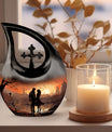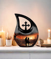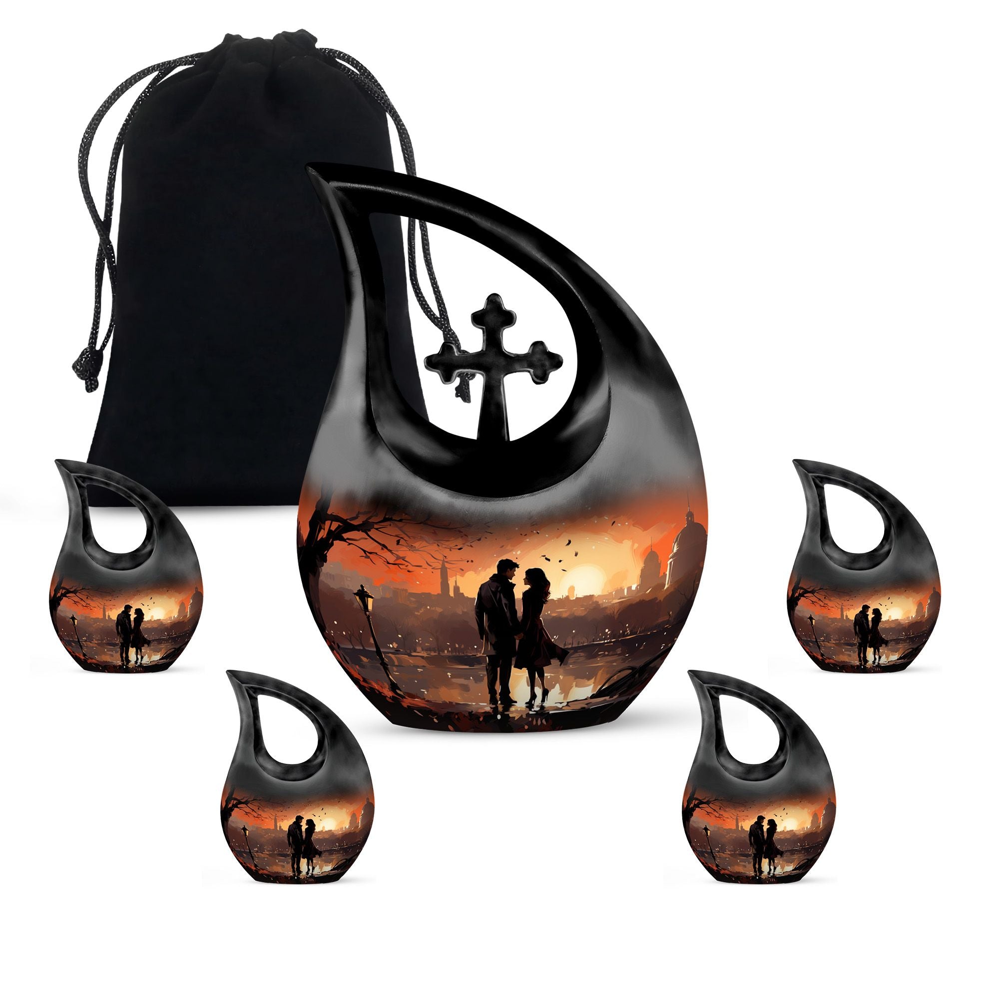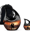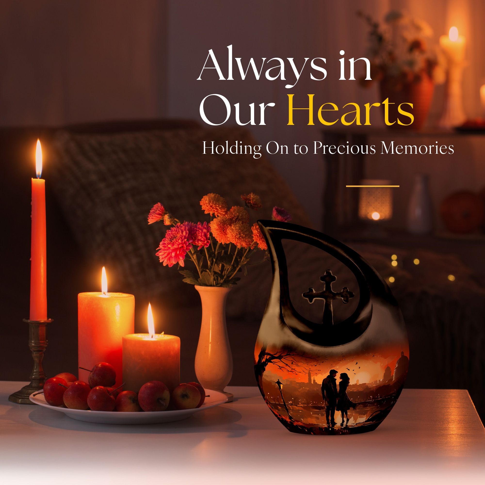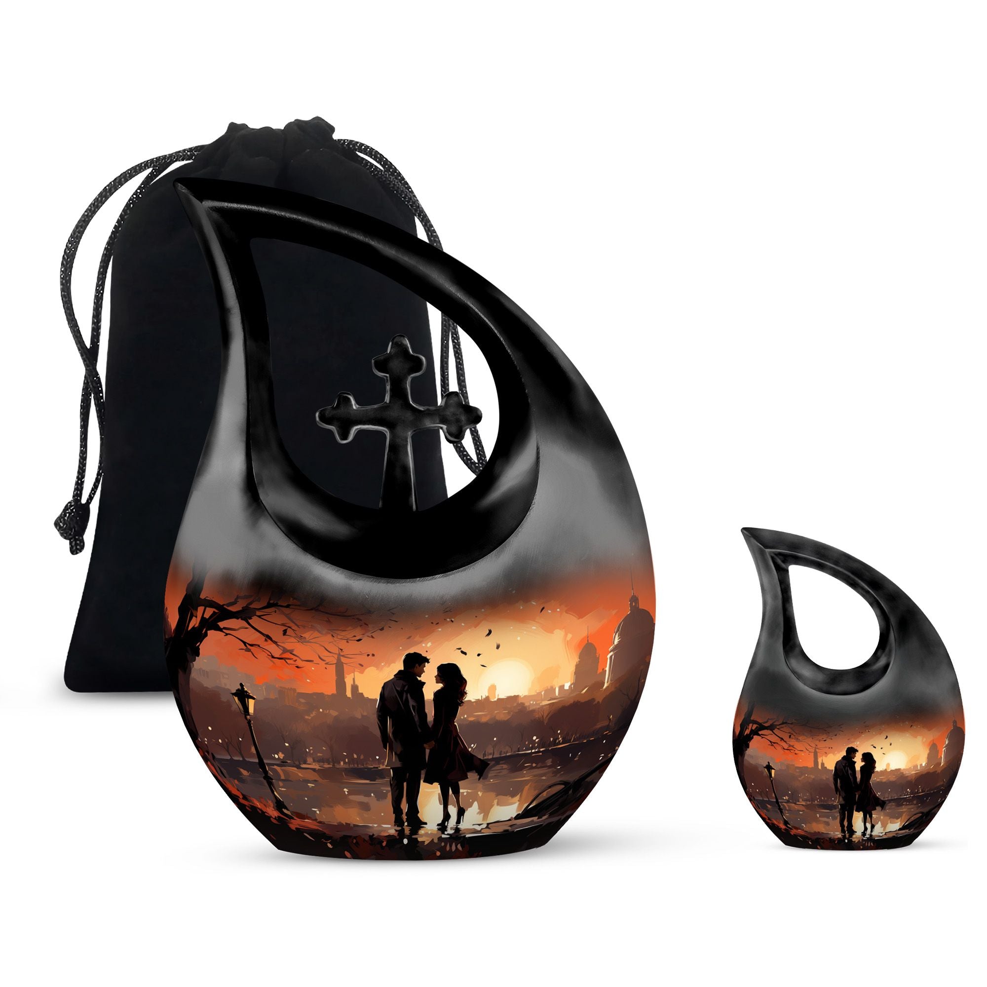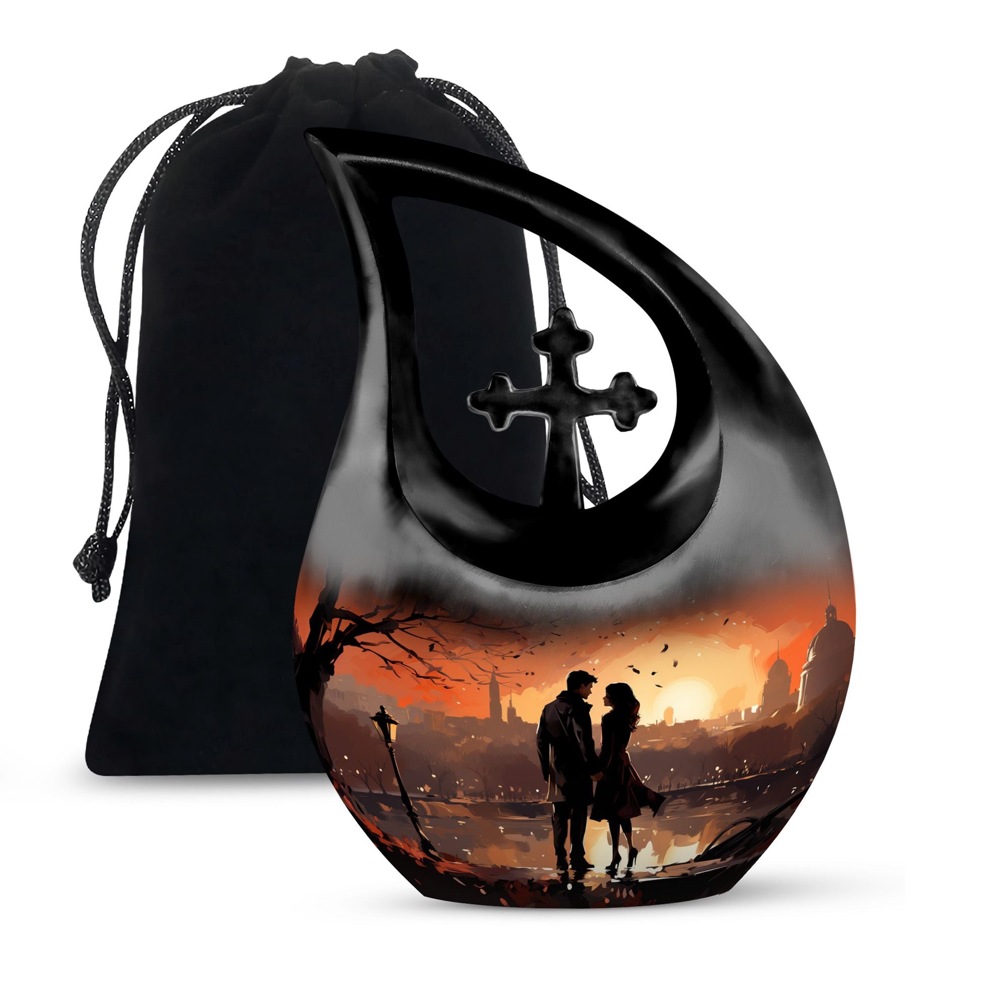 Celebrate a journey shared in love with the Couple Motif Urn for Lovers – Sunset Memorial Ashes Urn. This peaceful and romantic design captures two figures walking together beneath a radiant sunset sky, making it a meaningful choice for families seeking an urn female adult, urn adult male, or heartfelt urn female ashes tribute. The warm colors symbolize devotion, unity, and cherished memories that endure.