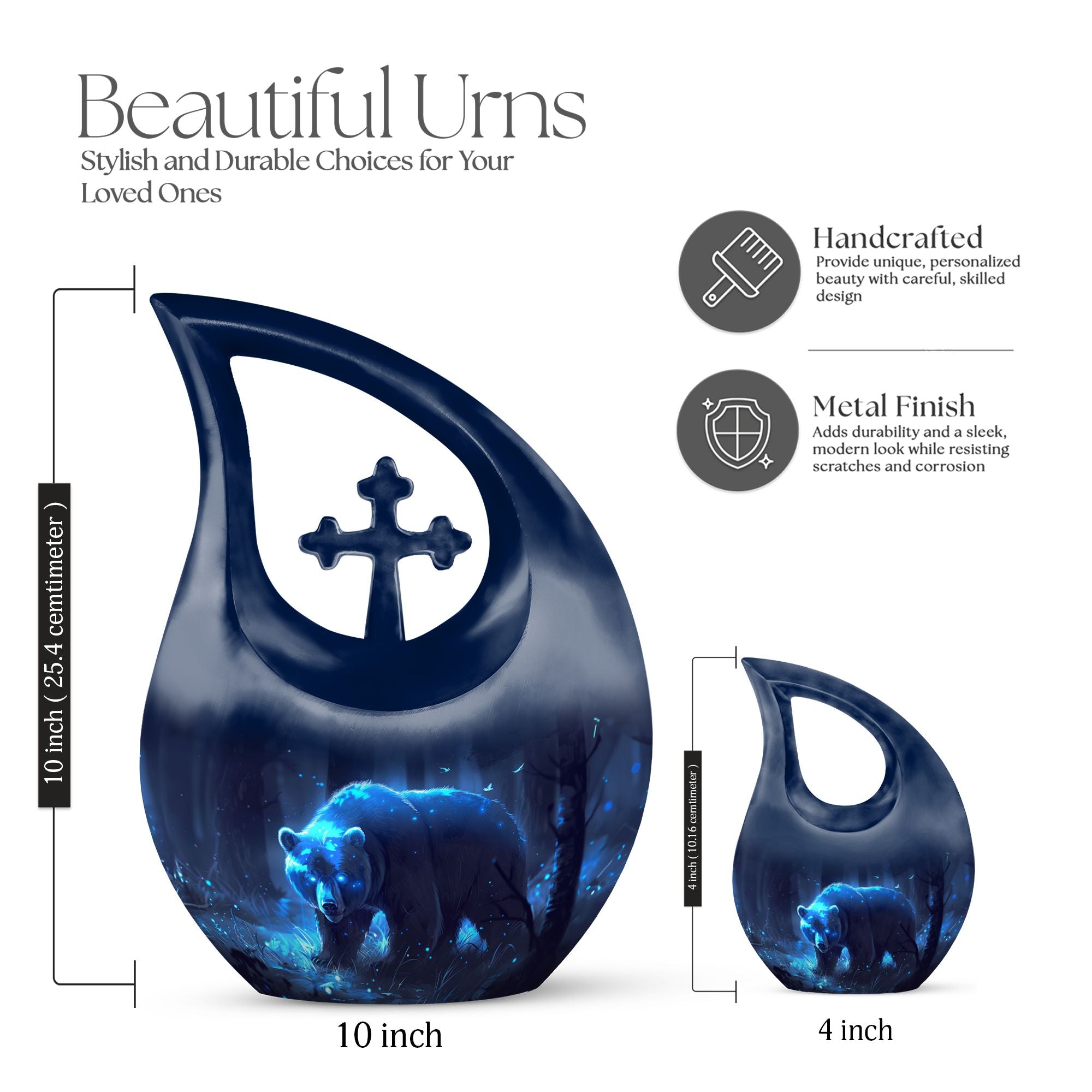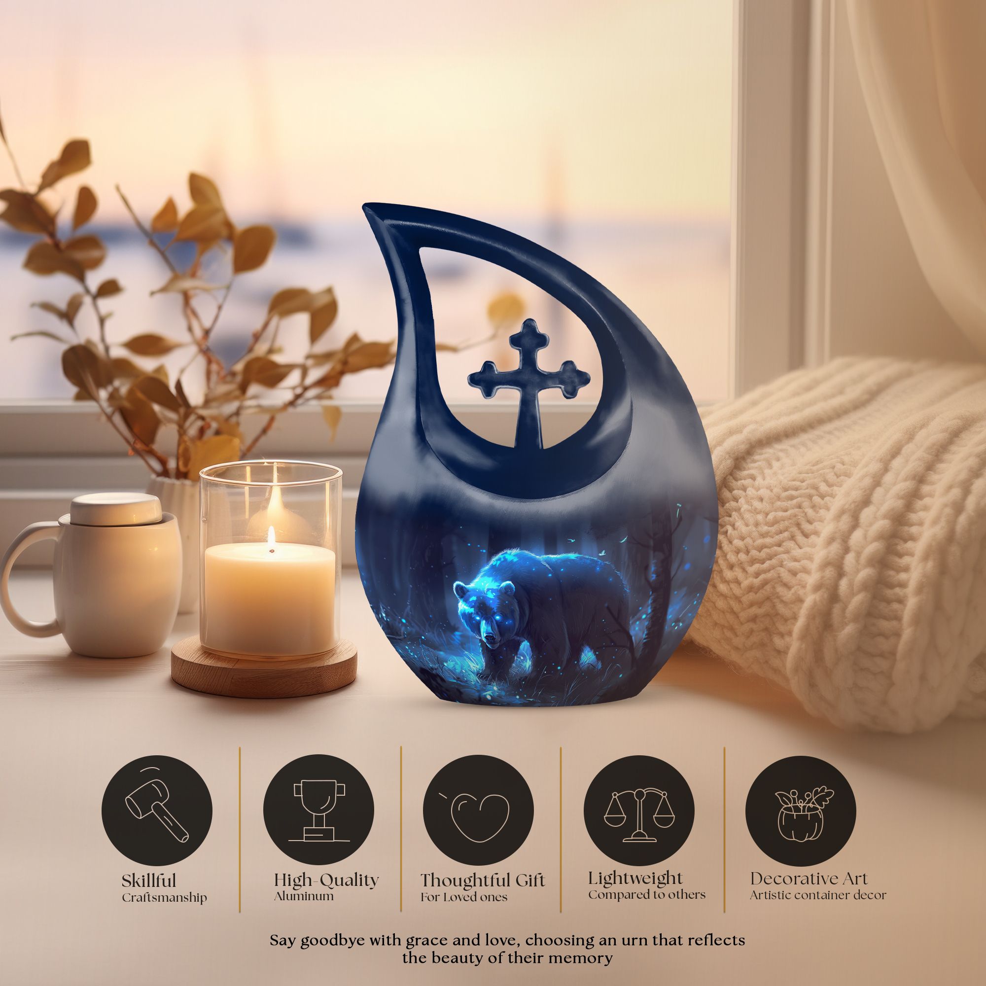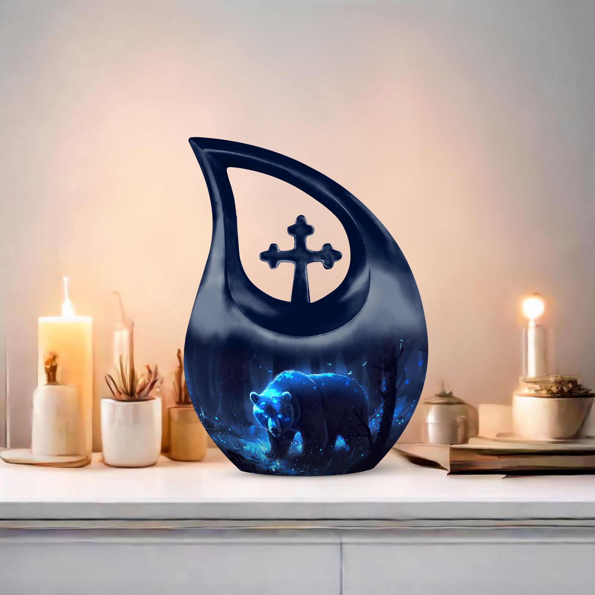 Cherish and honor the memory of a loved one with our beautiful 'Bear Cross Drop' cremation urn. Rendered in high-quality Aluminum, this gracefully constructed Bear Urn offers a unique homage to those who are deeply missed. A tastefully sizable urn designed to measure up to 10 Inches in height and weighs 3.3 pounds, it has a spacious capacity of 200 cubic inches, providing ample room to contain the ashes discretely. It is accompanied by a soft velvet pouch accentuating its unique 'Cross Drop' theme. As a special touch, we offer the ability to personalize this large urn by engraving names on it, making it a truly unique memento of your loved one. Our mission is to provide you with quality urns online, for adults, that will endure the test of time, keeping cherished memories alive while providing comfort and a sense of tranquility. Each of our cremation boxes for adults, allows you the opportunity to remember your loved one in a truly personal way. Trending as 'unique urns for dad', this elegantly themed 'Bear' urn seamlessly blends in with any décor. The 'memorial urns' you choose today become the meaningful heirlooms of tomorrow.