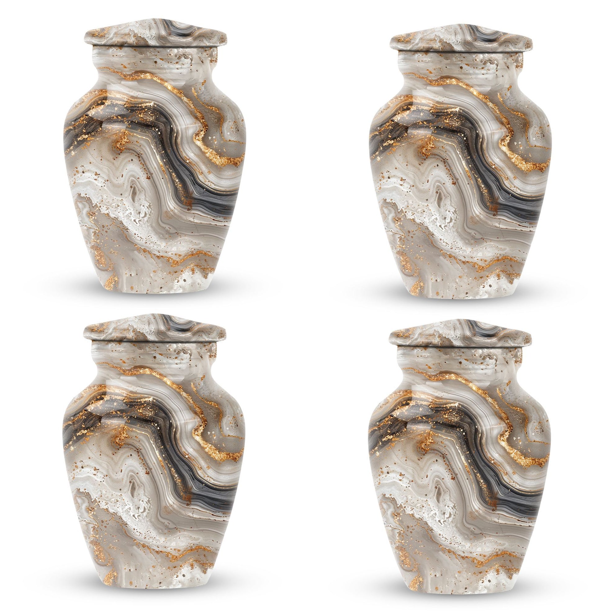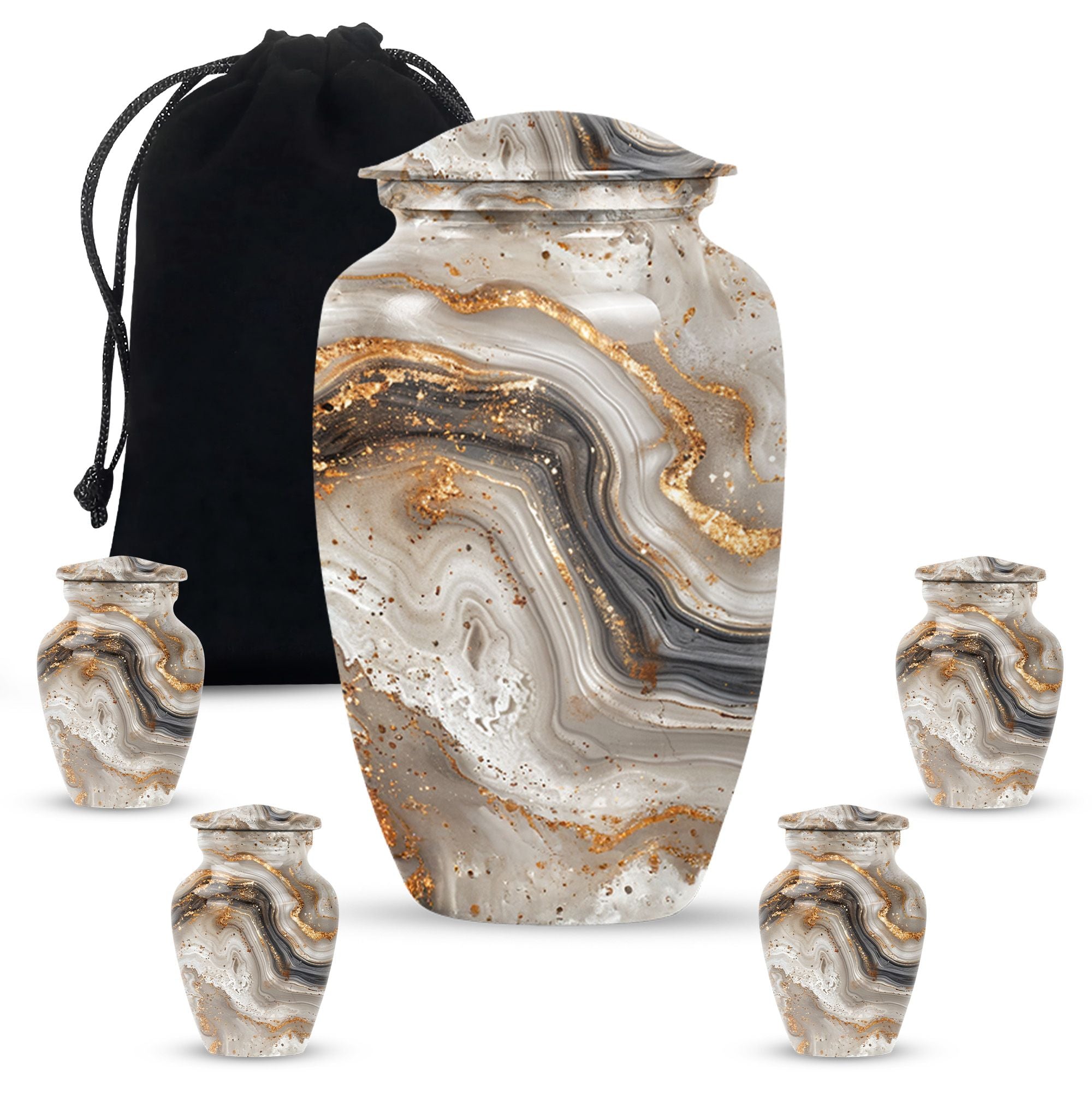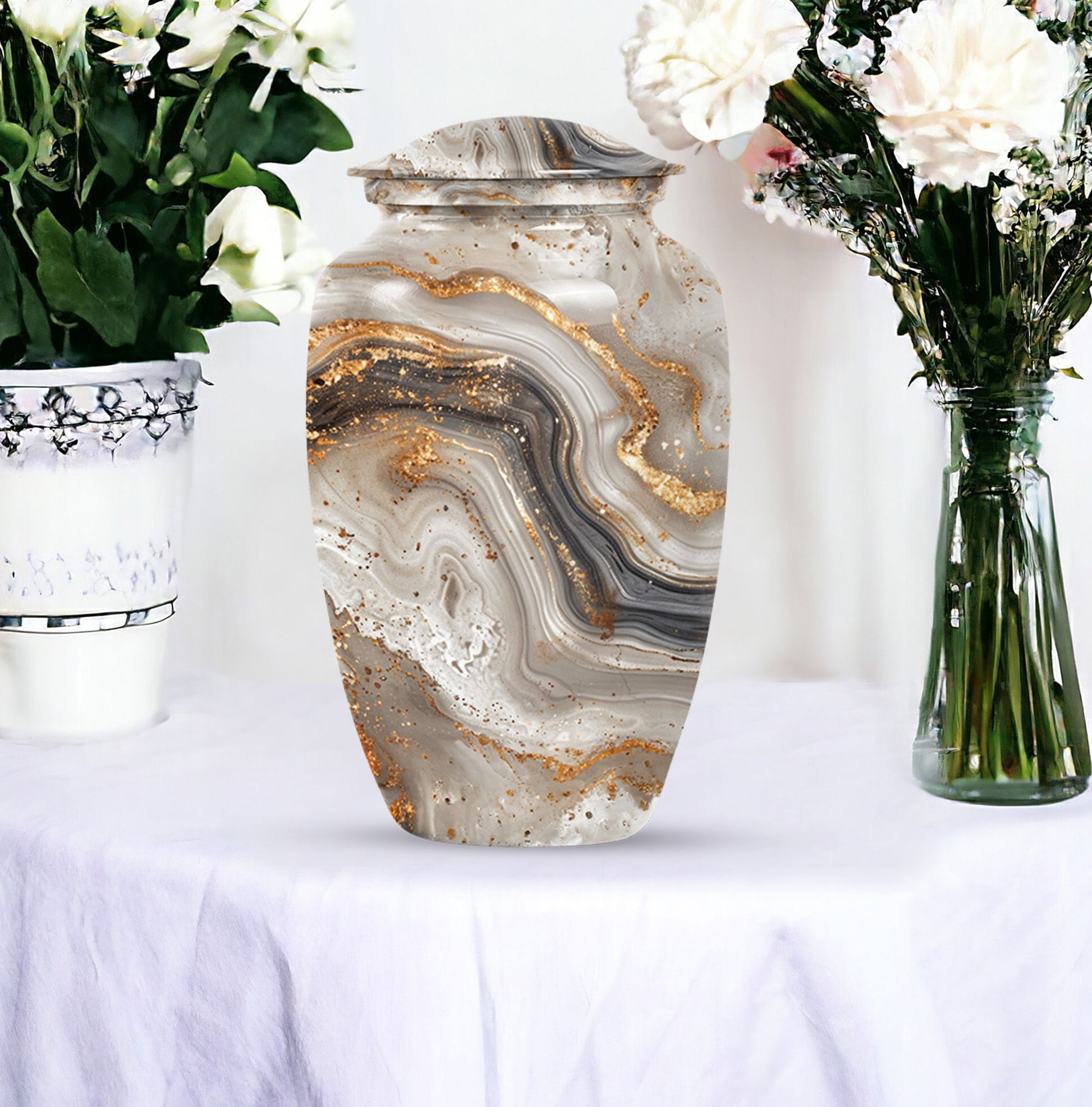 Unveiling the Vibrant Swirl Urn, a grand tribute to your beloved departed. Measuring 10 inches in height and weighing 3.3 pounds, this large urn fills its role as an ideal memorial perfectly. Its classic urn design is an embodiment of eternal peace, an abstract tribute reflecting the infinite spirit of a loved one. Constructed from aluminium, its durability ensures long-lasting preservation of memories. With a remarkable 200 cubic inches capacity, the urn can hold ashes of an adult male and adult female comfortably. Moreover, its customization feature allows you to personalize it with engraved names, making it a unique token of remembrance. Furthermore, a velvet pouch for containment of ashes is included, adding an elevated touch. Ideal for funeral scenarios and memorial ceremonies, it serves as an exquisite resting place. Highlighted by keywords like 'funeral large urns for human ashes adult male', 'memorial urns', 'cremation companion urns', and 'cremation urns', it's the perfect tribute to your beloved departed. Embrace the memory of your loved one with our Vibrant Swirl Urn, a symbol of everlasting love.