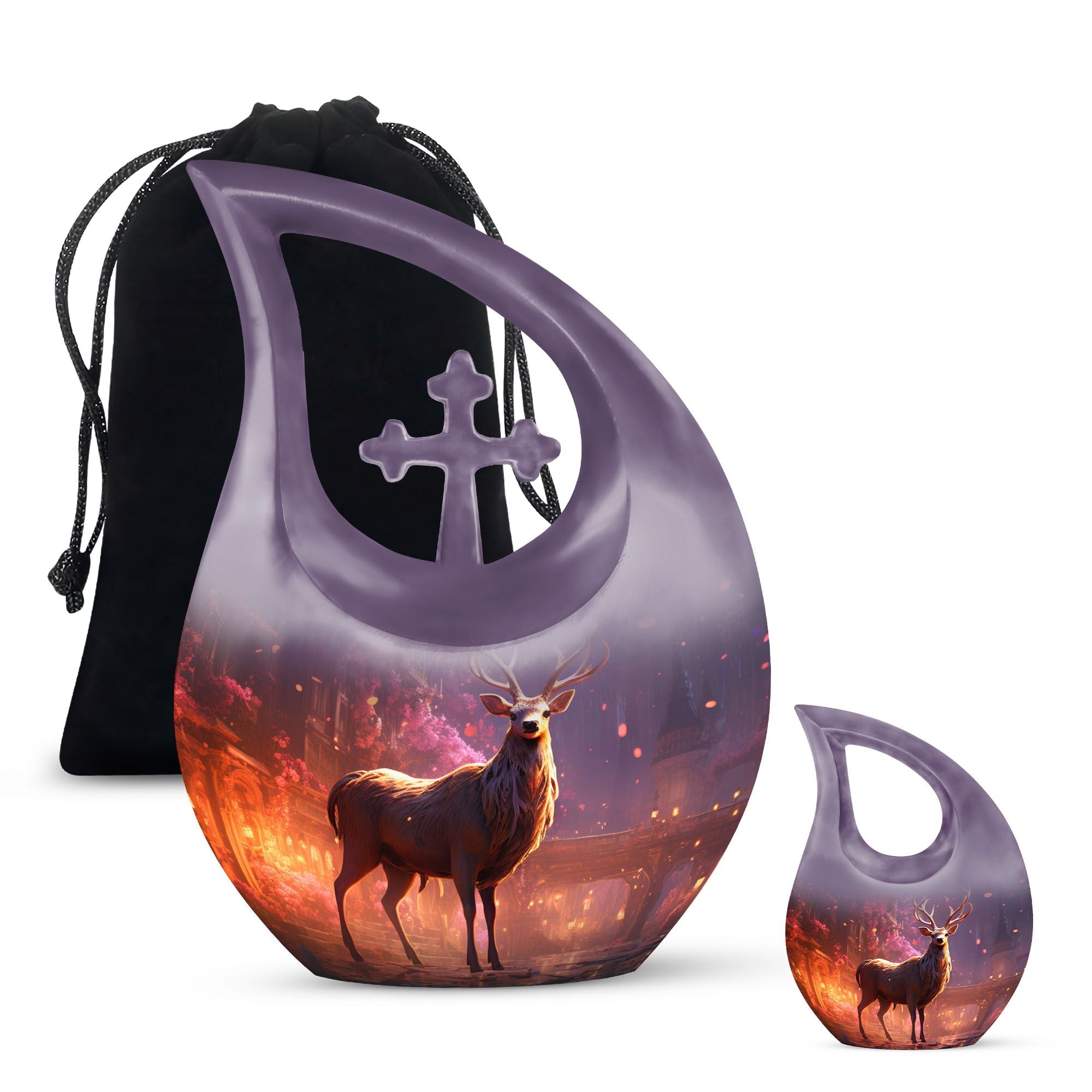 Embrace a captivating tribute to your loved one with our Cross Drop Deer Urn - an eye-catching homage and serene resting place for human ashes. This large urn, strikingly realized in aluminium, stands 10 inches in height, weighs 3.3 pounds and boasts a generous capacity of 200 cubic inches. Its notable 'deer' theme radiates comforting remembrances of nature's beauty, subtly reminding us of the circle of life. Each urn is gifted with a soft velvet pouch, adding an extra layer of protectiveness while handling the ashes. As we understand the profound significance of such purchases, we offer the opportunity for personalization. Preserving the unique memory of your loved one, you can engrave their names, making this not just an urn, but a personalized haven for cherished memories. Looking for dignified memorial urns or custom cremation urns for human ashes? Explore a diverse range of our sensitively crafted, and high-quality large urns for sale.
