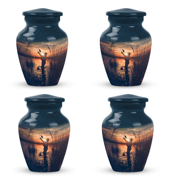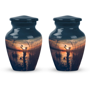 Experience the heartwarming connection and serenity with the beautifully crafted 'Father Son Fishing Urn'. This individual 'cremation personalized urn for human ashes adult' is designed for those who hold their loved ones close to heart. Landmarked as a 'Classic Urn' design, it comes with a size of 10 inches tailored for large urn requirements. This 'cremation urn' is fabricated with premium quality Aluminium, ensuring durability and sturdiness. With an impressive capacity of 200 cubic inches, it’s thoughtfully structured ensuring adequate containment for ashes. This urn has a distinctive 'Purple Meadow' theme, captivated to reflect the tranquility and peace. Another prime aspect is the customization; you can personalize it with engraved names making it more intimate and unique. The urn also comes with a well-crafted velvet pouch for dignified containment of ashes. This piece carries a weight of 3.3 pounds and has dimensions of 10 inches in height. A perfect way to remember and cherish your beloved who had an unshakeable love for fishing or nature. This urn stands as epitome of love, memories and respect for the departed soul.