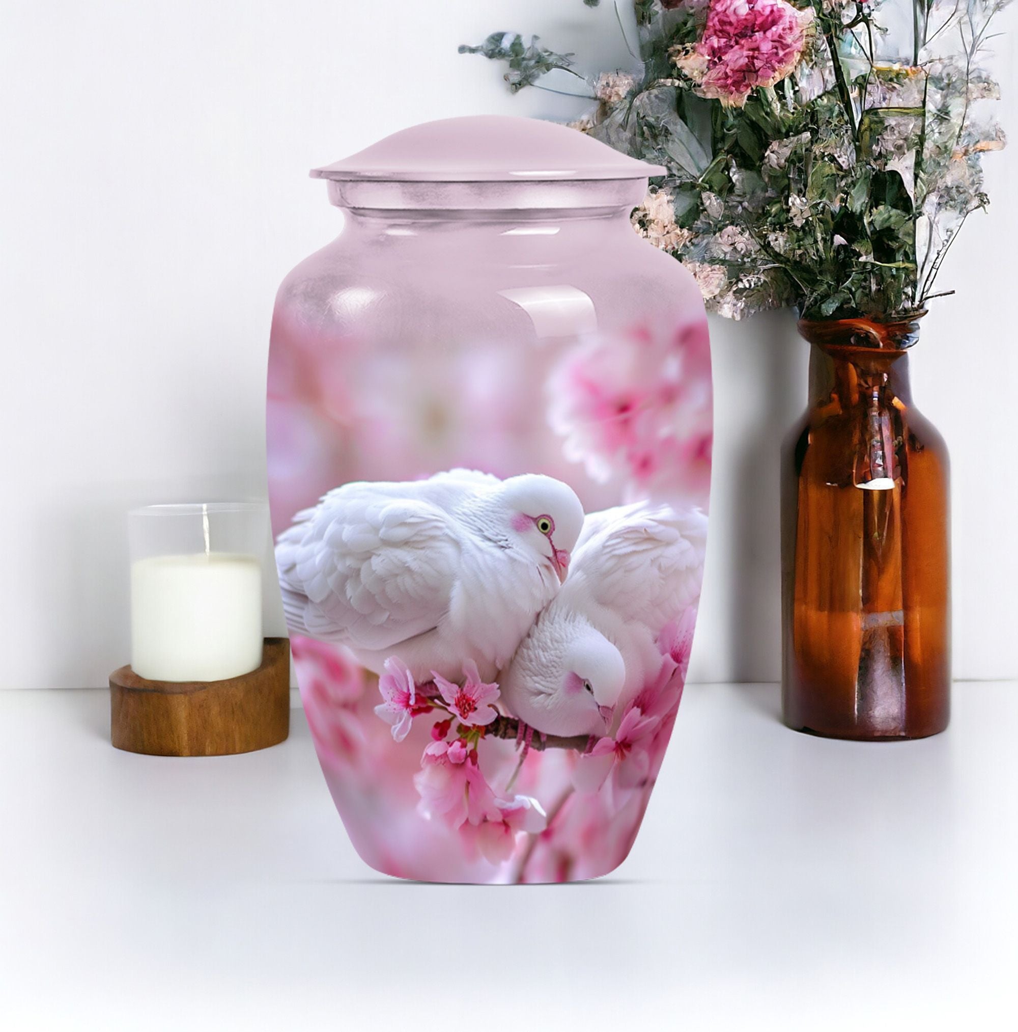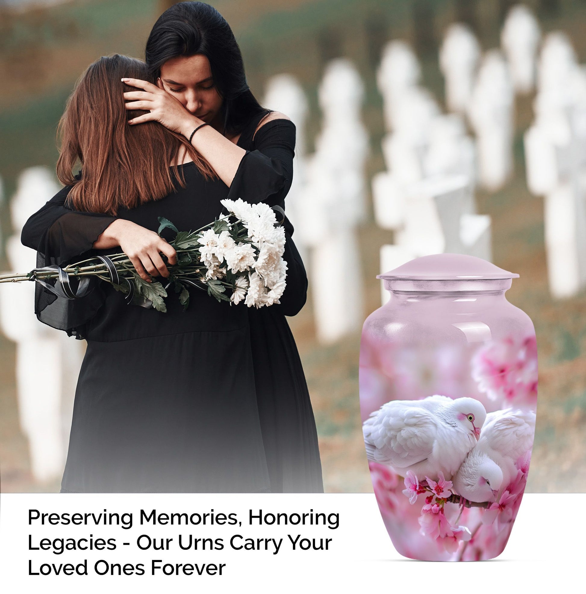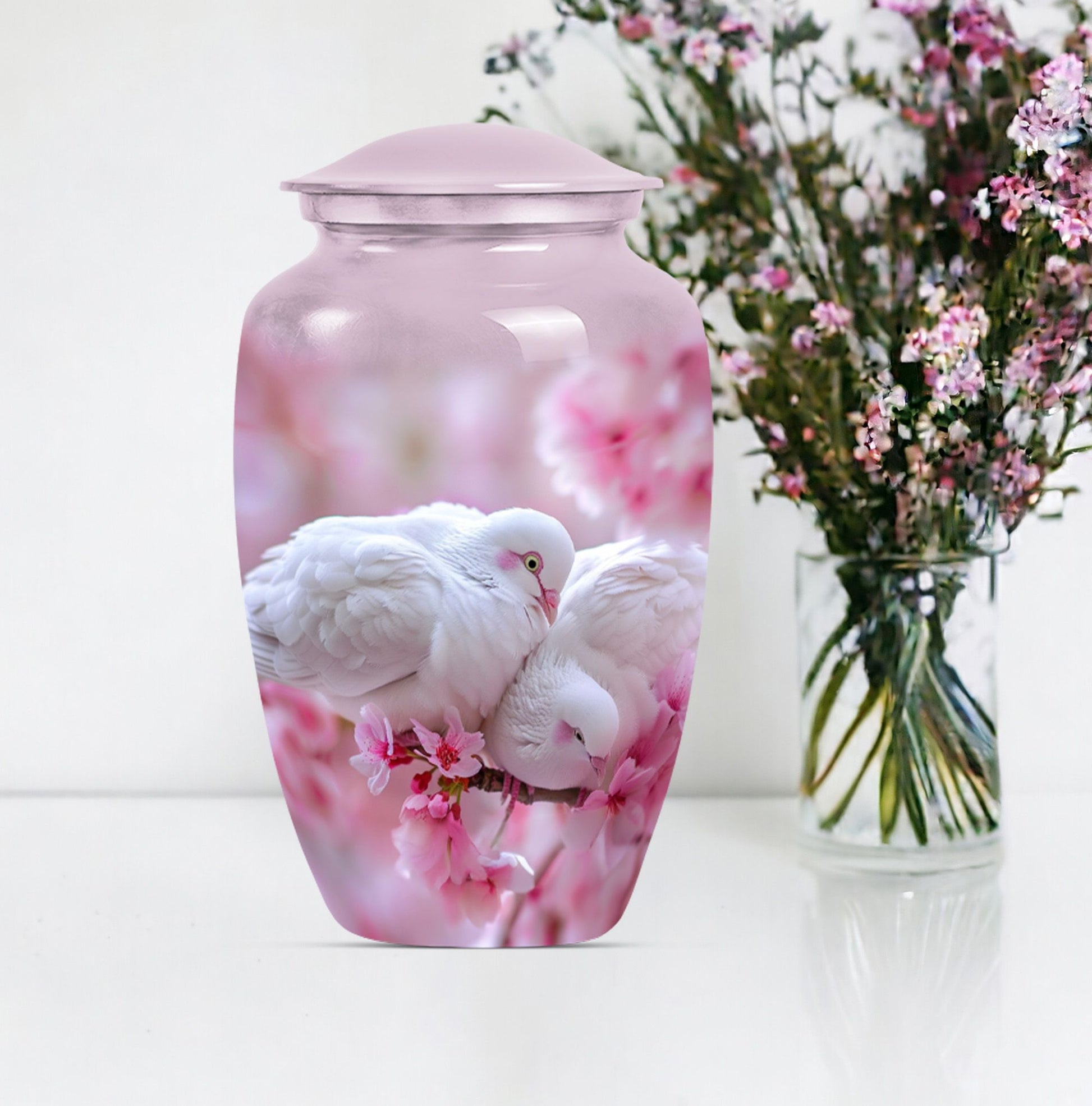 Dignified and touching, this meticulously crafted 10-inch 'Purple Meadow' Dove Urn serves as a graceful tribute for a departed loved one. Designed intentionally for adults, it's spacious with a capacity of 200 cubic inches and accommodating up to 3.3 pounds of ashes comfortably. Each Dove Urn, constructed from resilient aluminium, is a delectably sturdy and heartfelt reminder of those we hold cherished. The package includes a plush velvet pouch for safe containment of ashes. The large urn allows for personalization; add engraved names to intuitively make it your own. Moreover, the Dove Urn's exceptional 'Purple Meadow' theme caters to both men and women, making it an appealing choice among memorial urns, funeral urns, or burial urns. Stay away from overused phrases and let this product description provide comfort in those moments of remembrance.